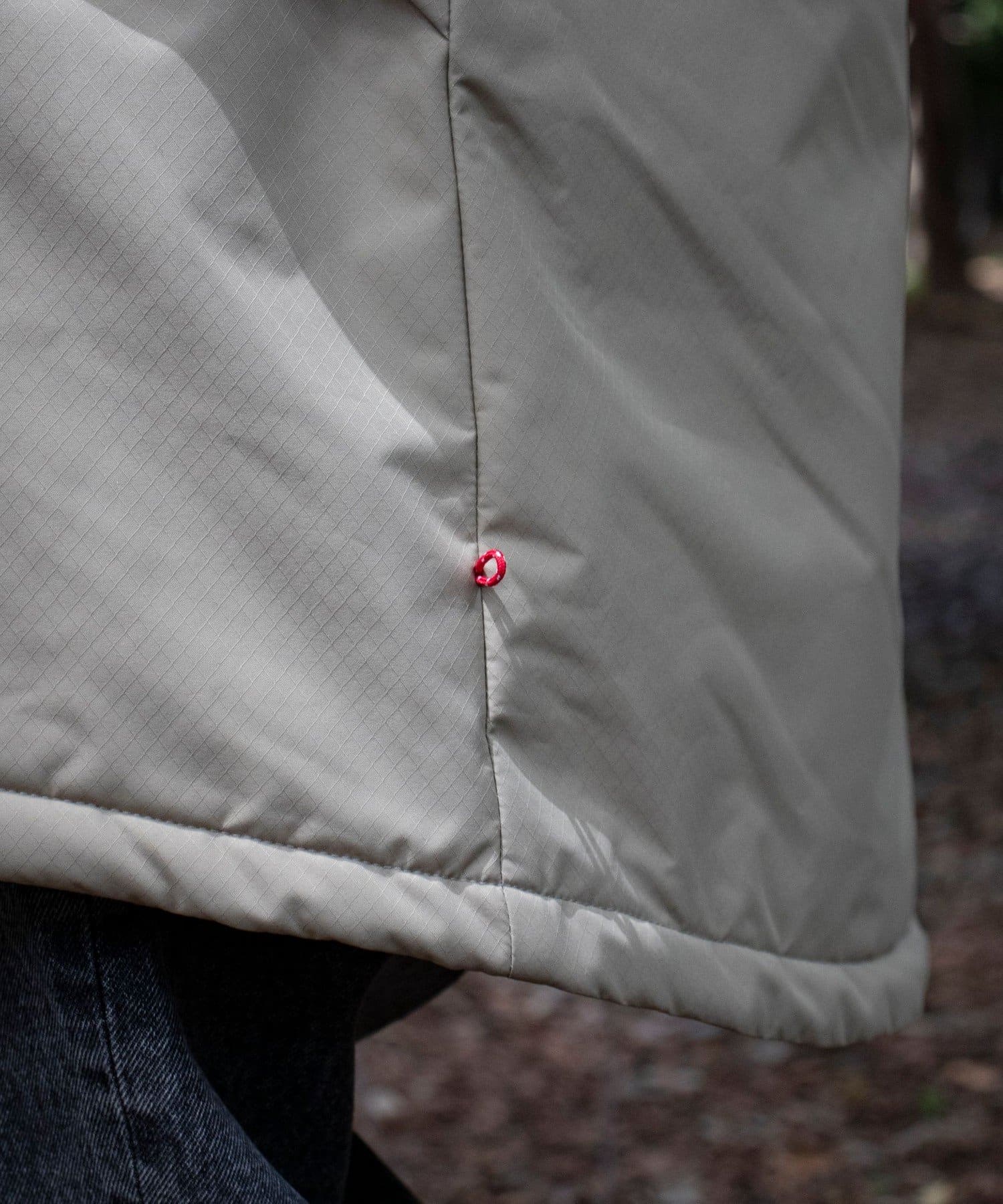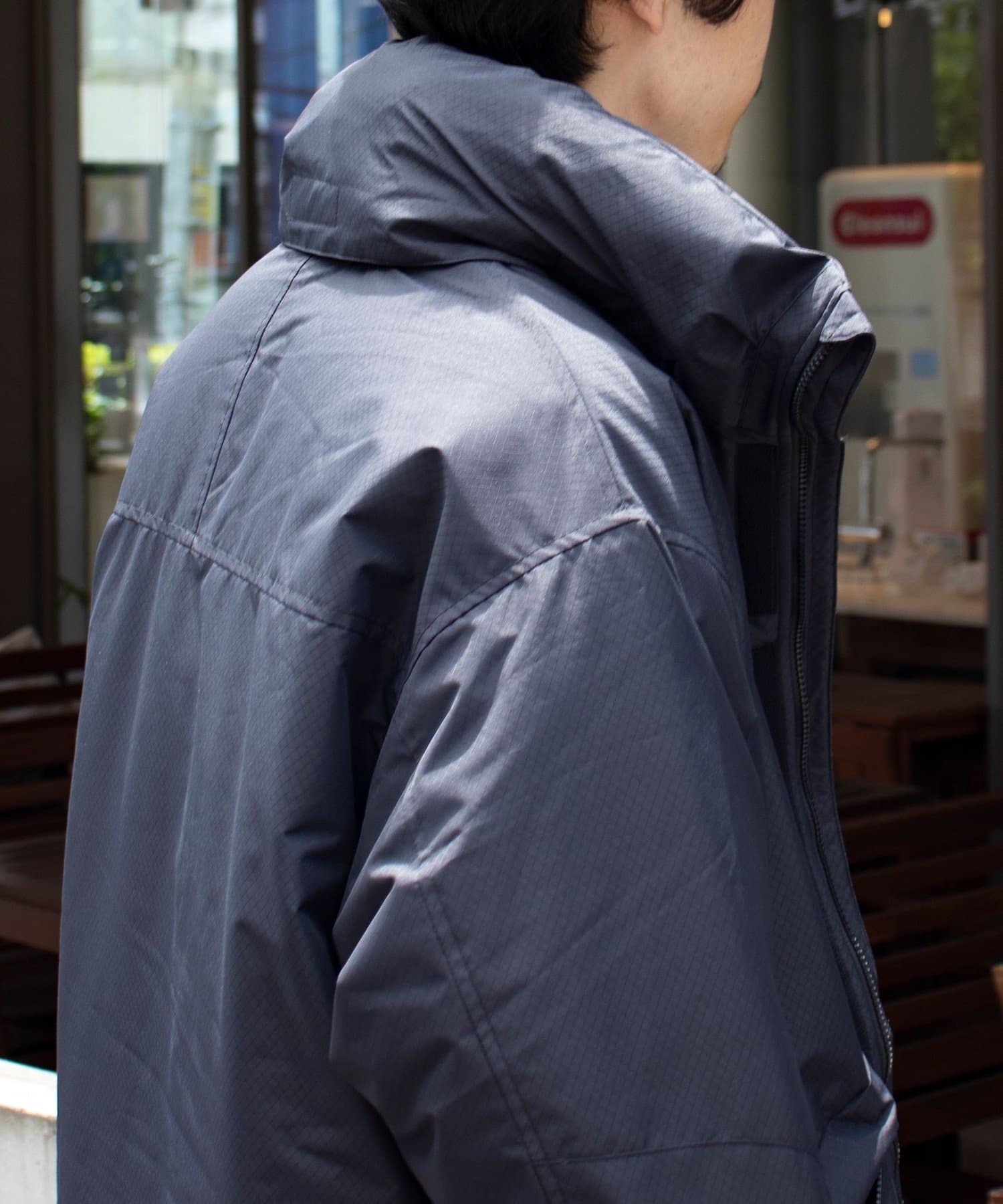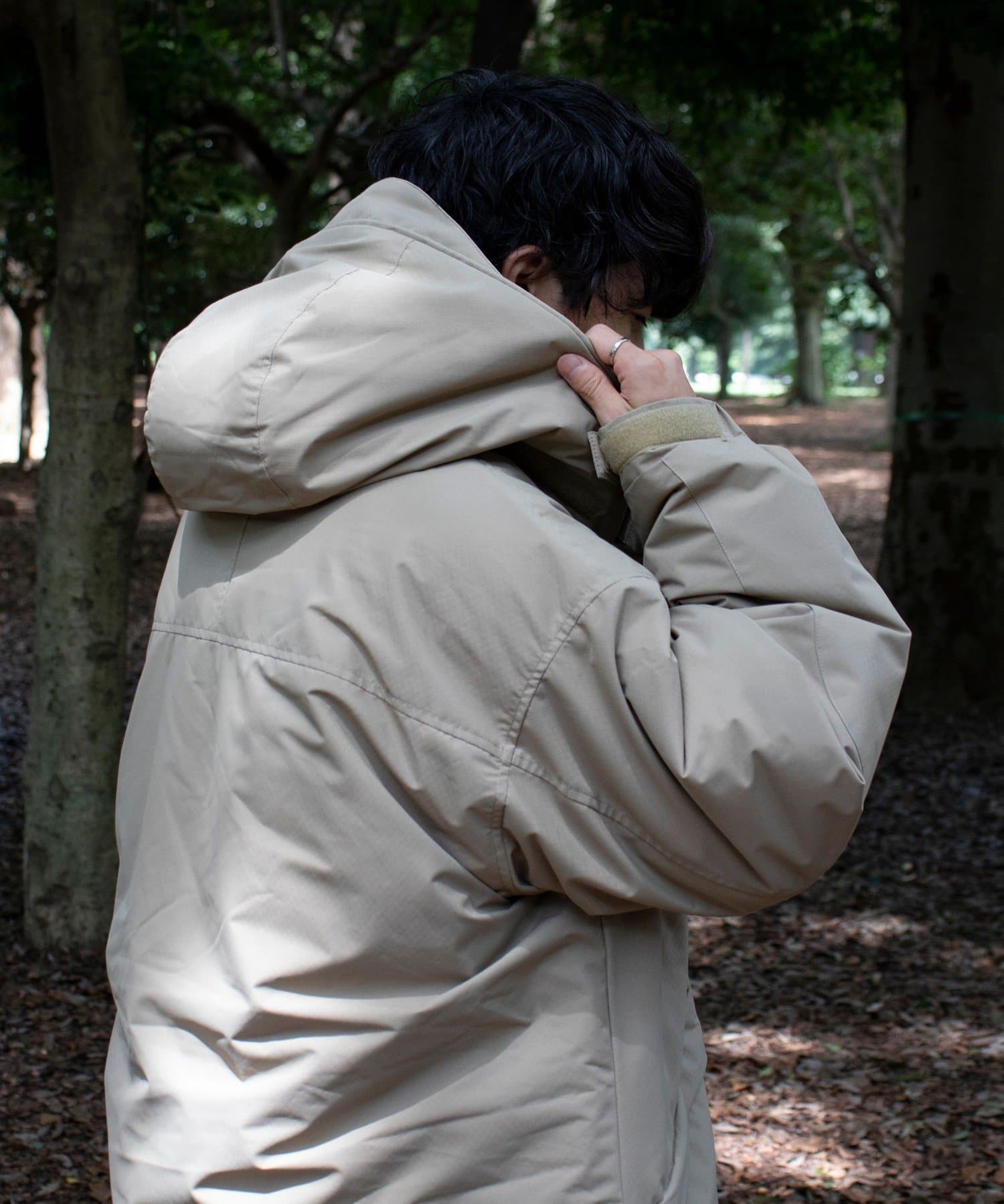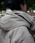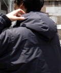 ネック部分にはフードが収納されており、天候やスタイリングに合わせてお使いいただけます。