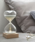白い砂がさらさらと静かに落ちていく様子を、のんびり眺めたり、ふとした瞬間に癒される砂時計。