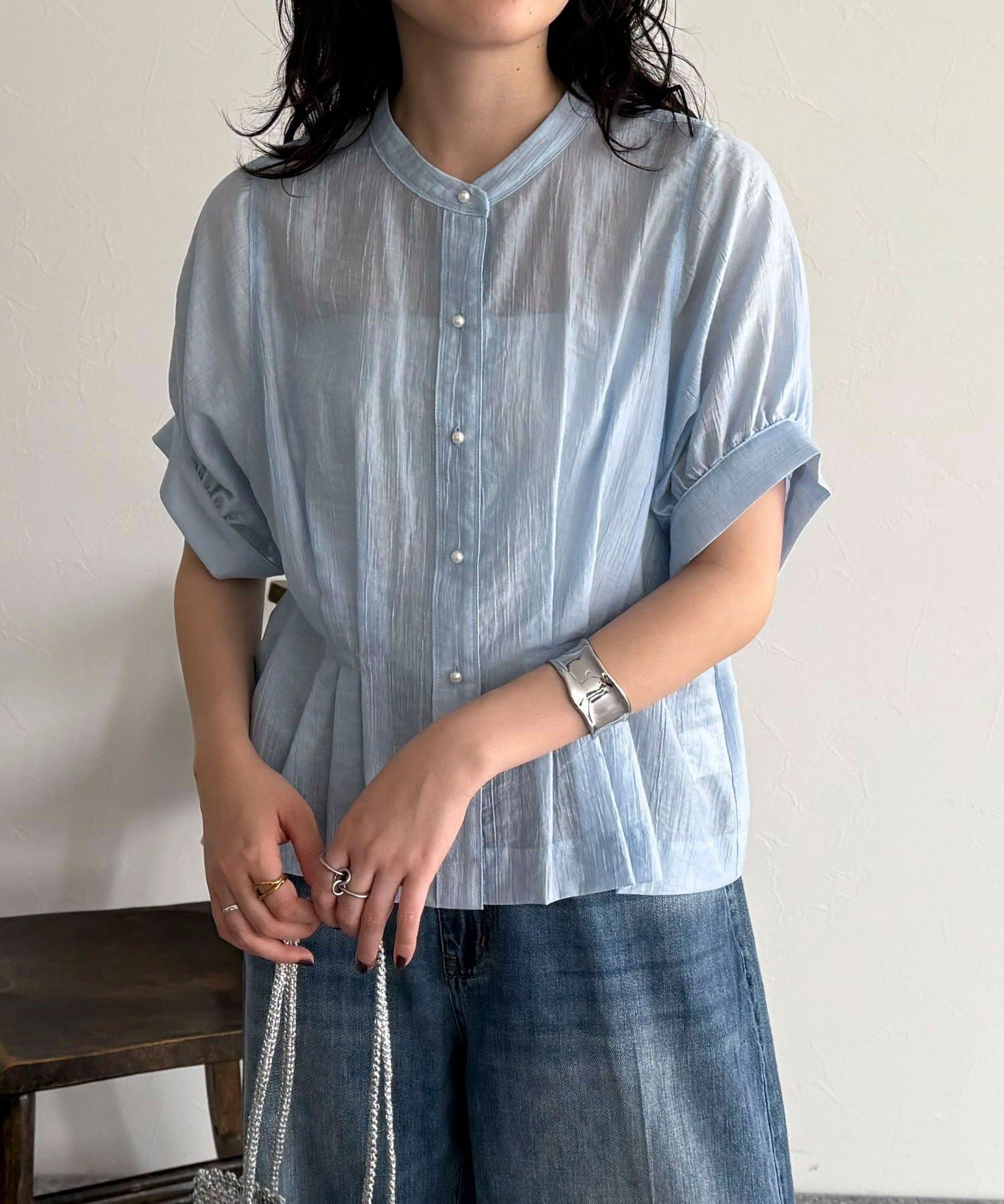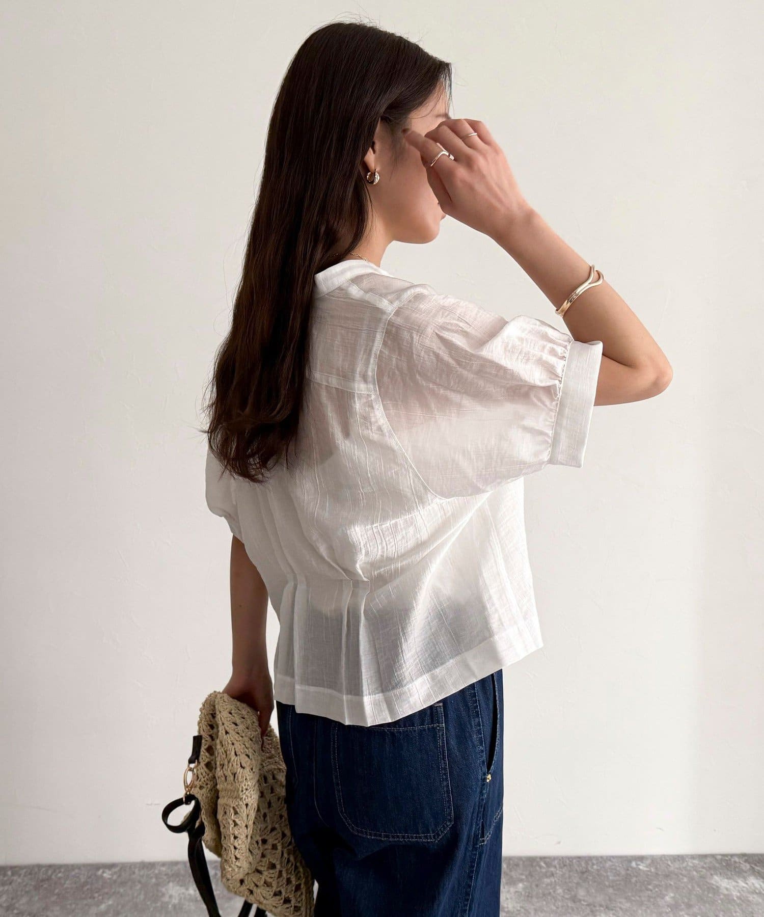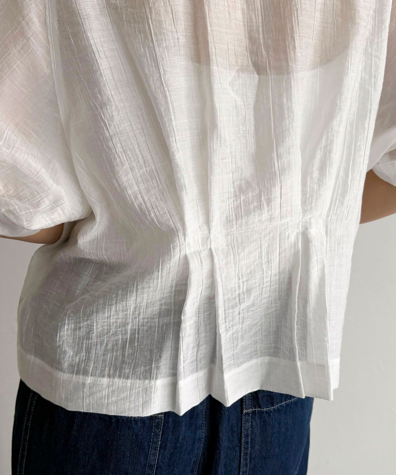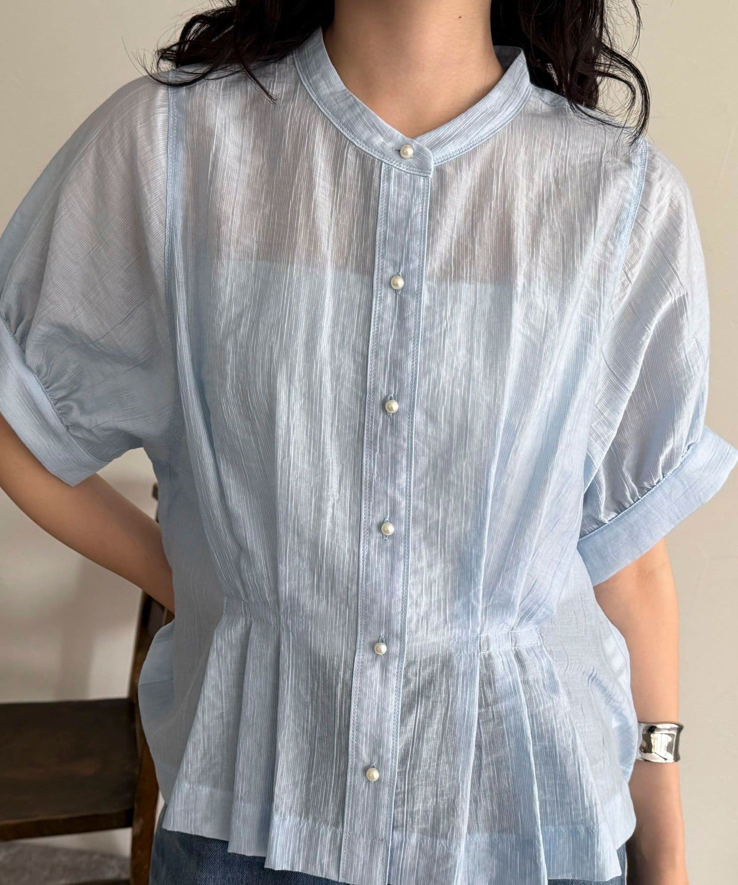 ・見た目にも涼し気なシアー素材で前開きで羽織にもなるデザインブラウスです