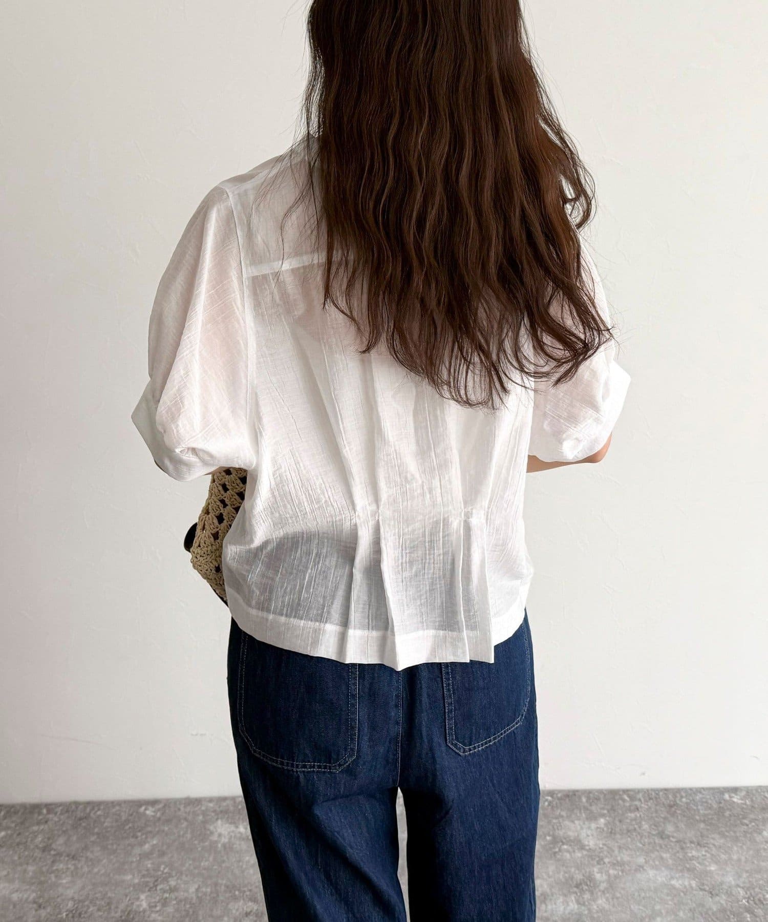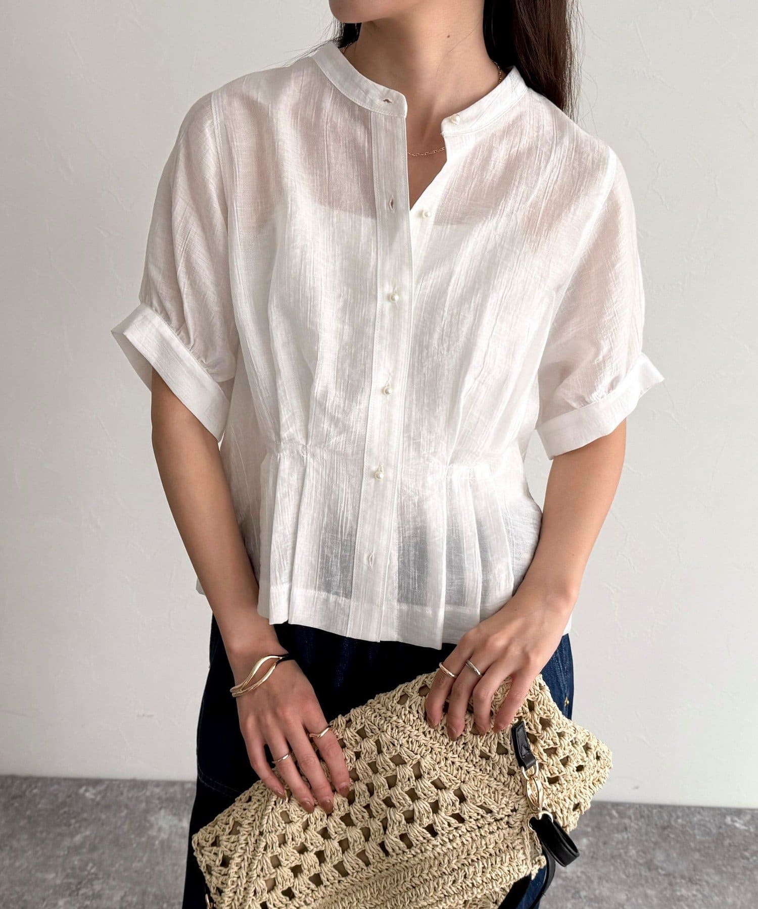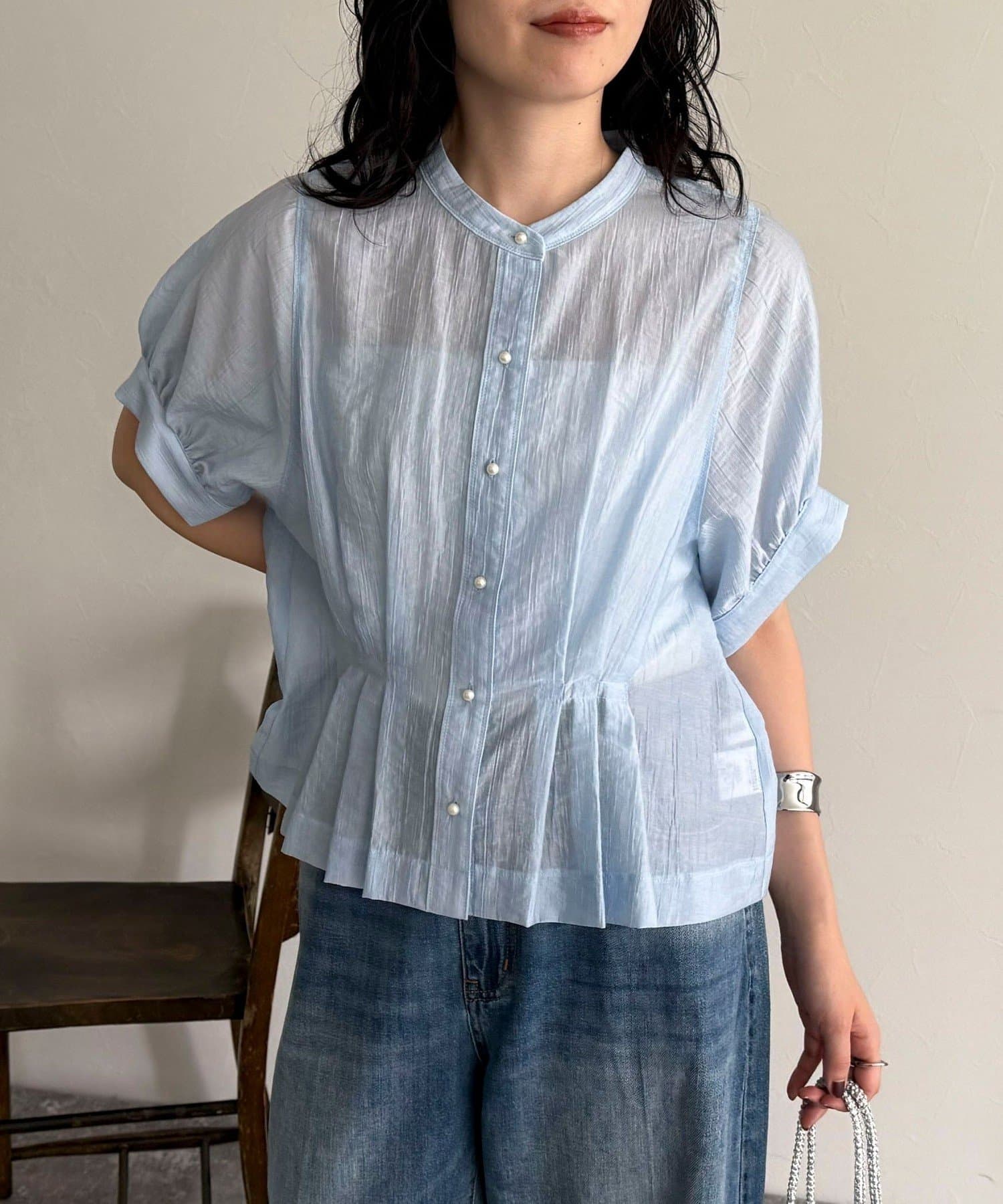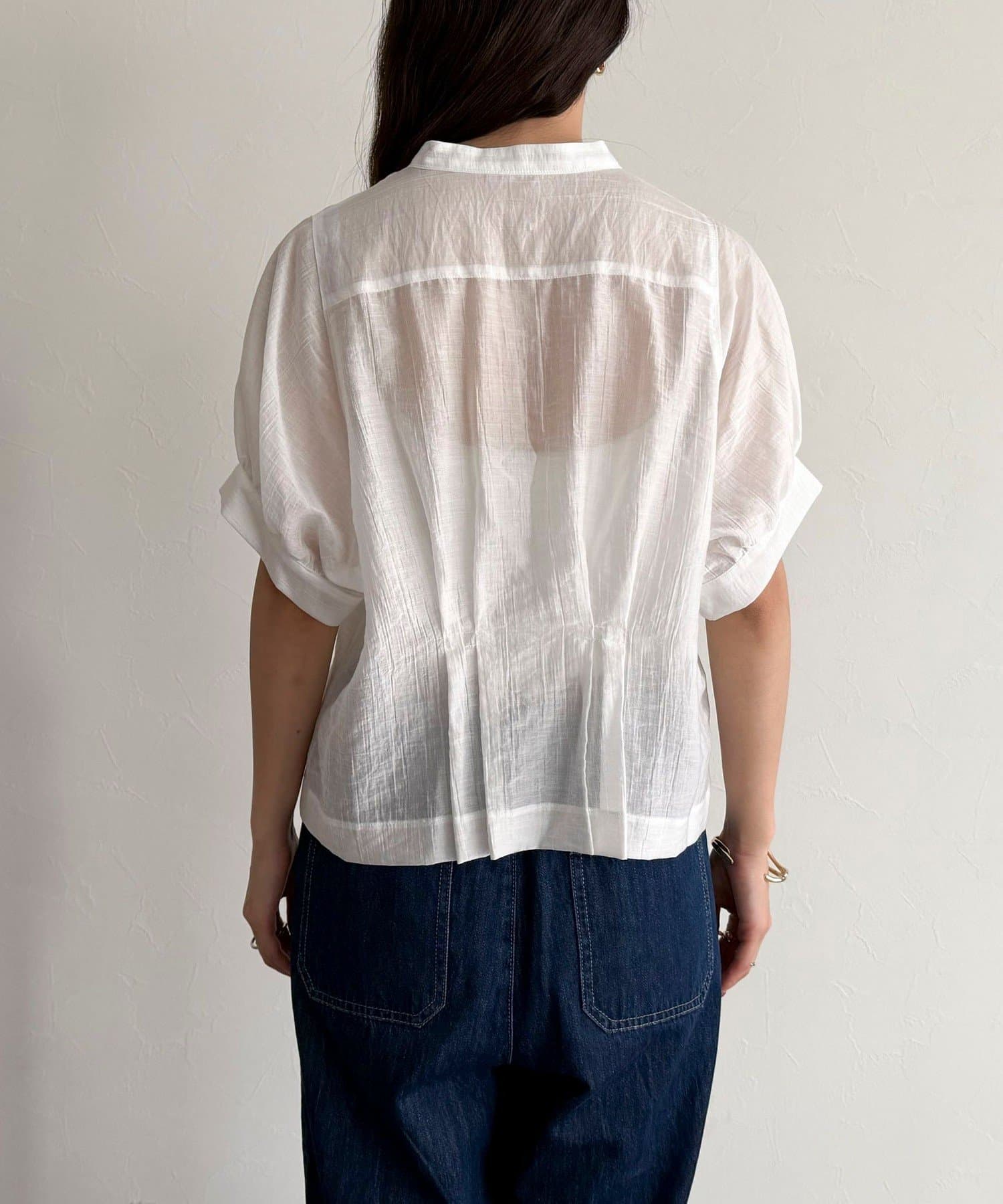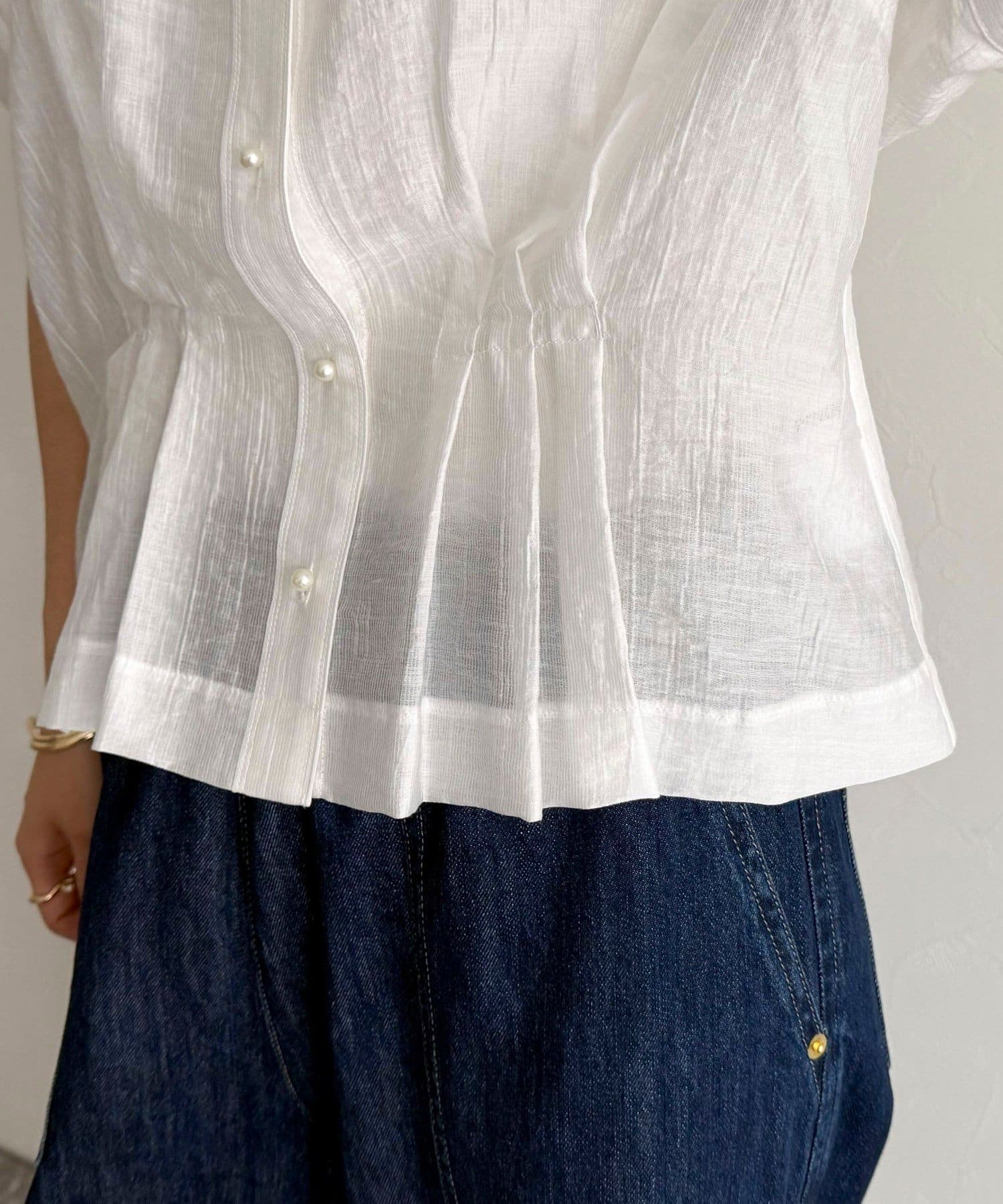 ・見た目にも涼し気なシアー素材で前開きで羽織にもなるデザインブラウスです