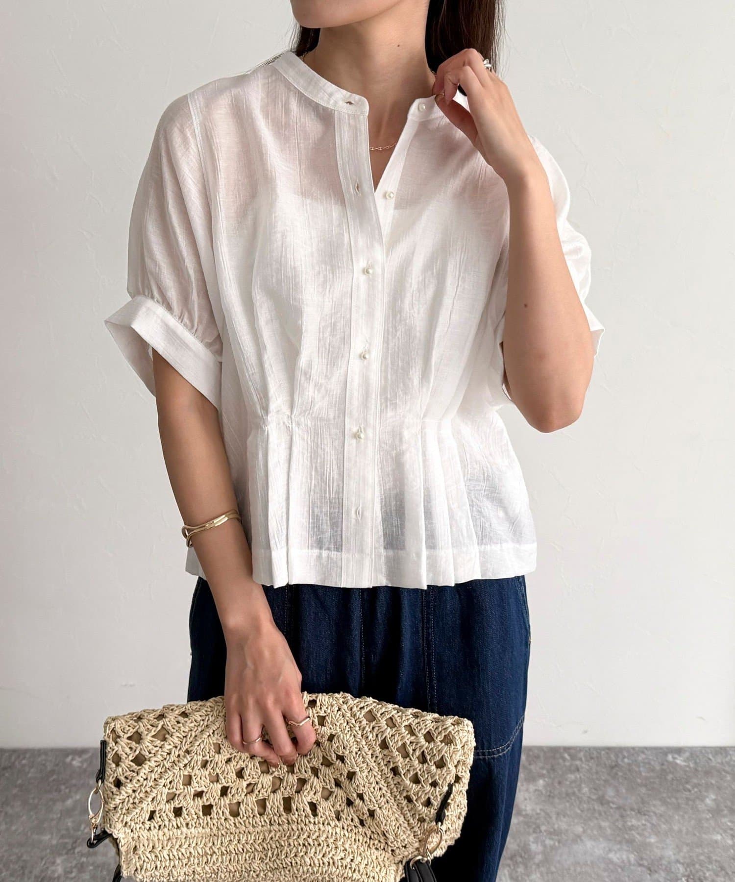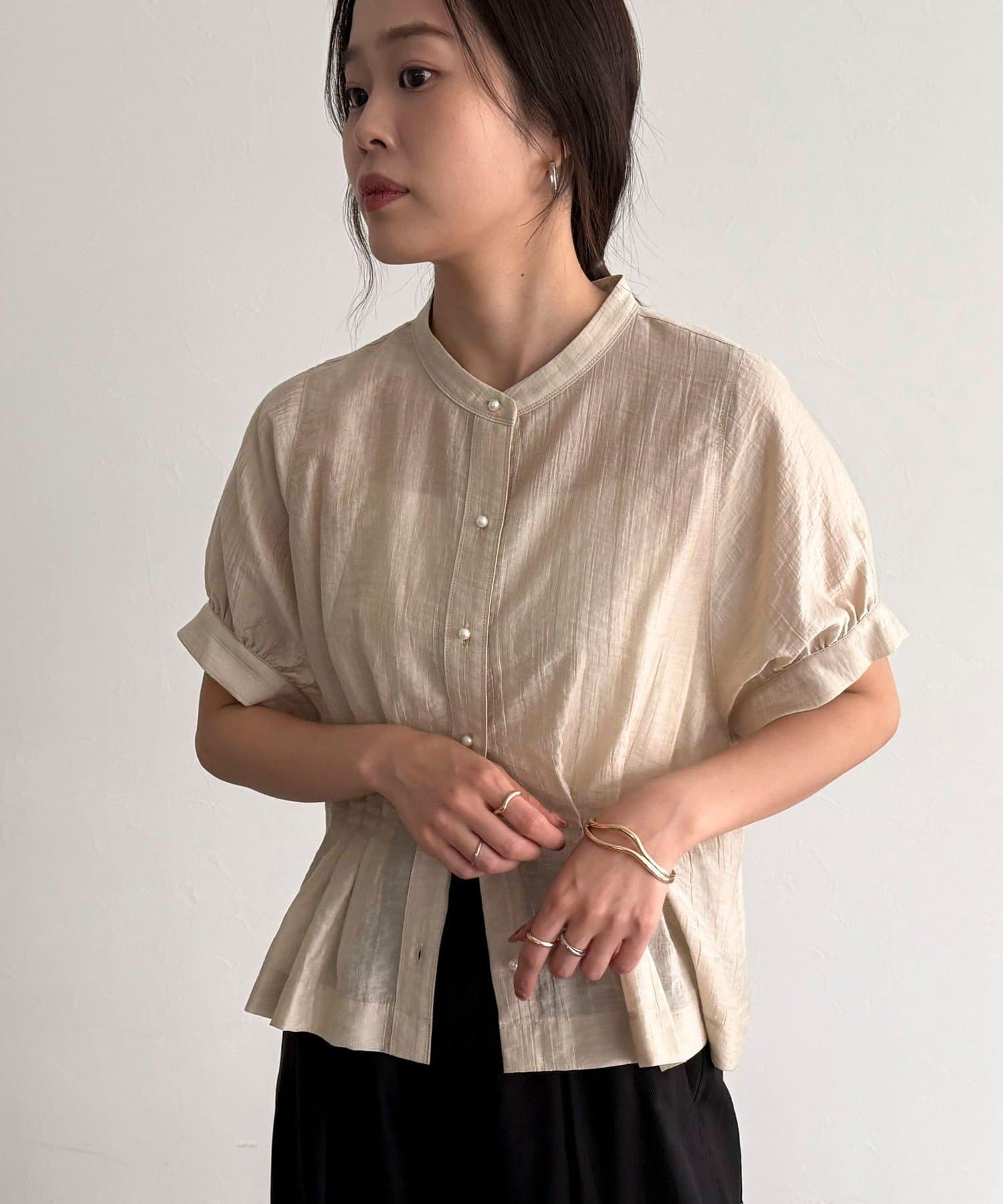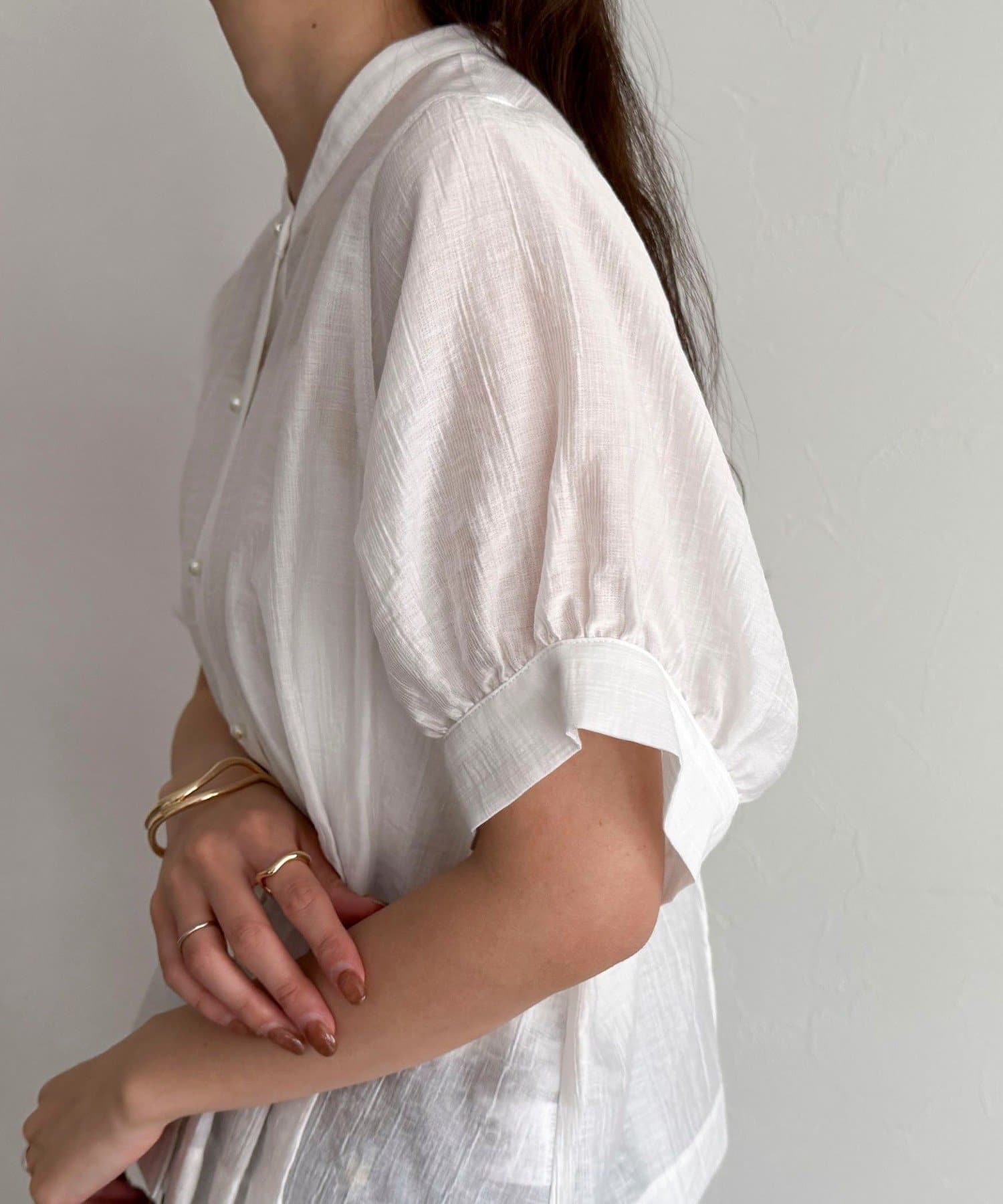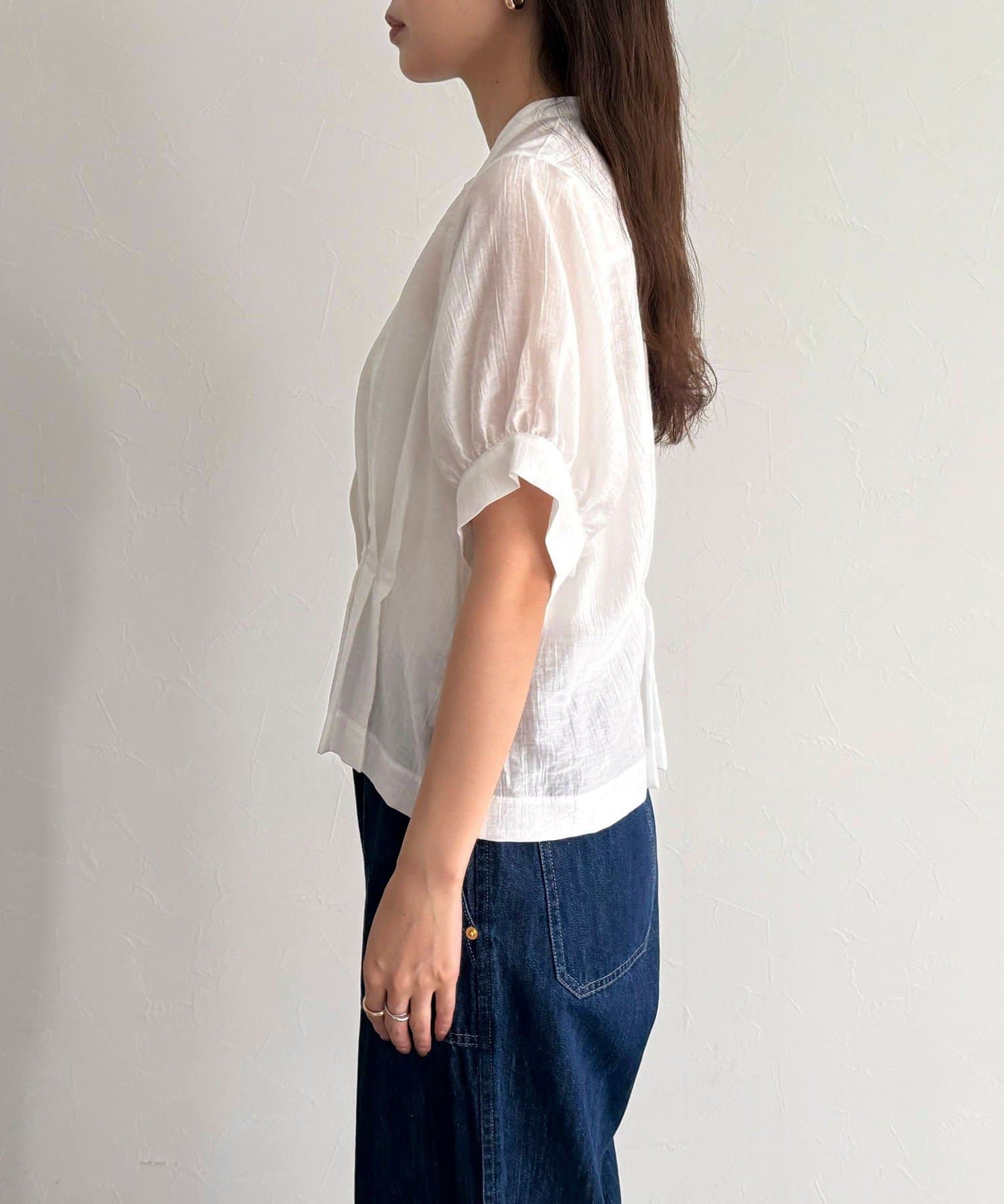 ・見た目にも涼し気なシアー素材で前開きで羽織にもなるデザインブラウスです