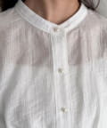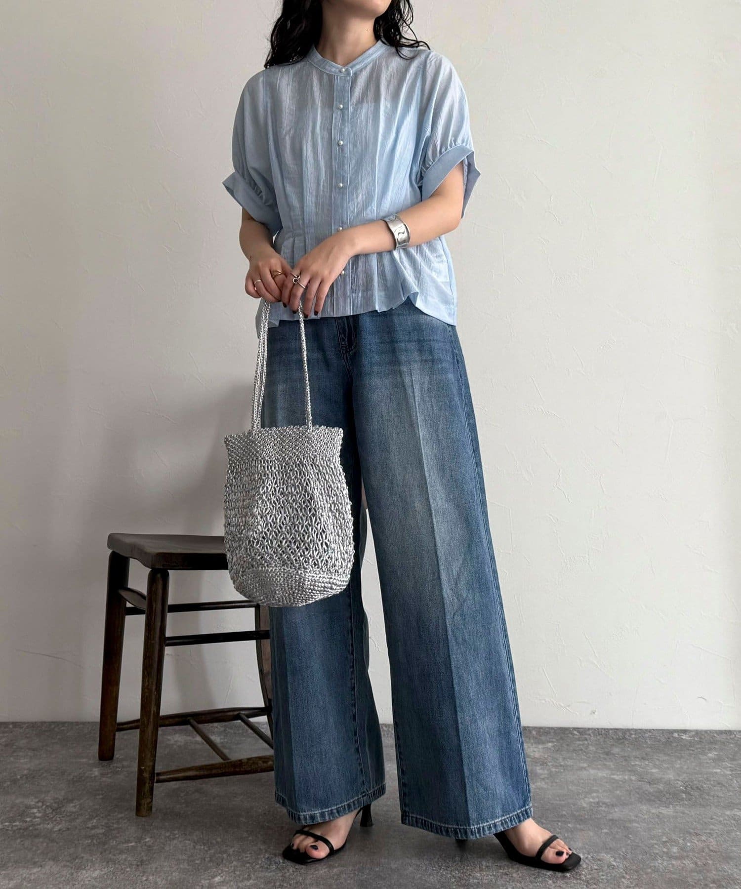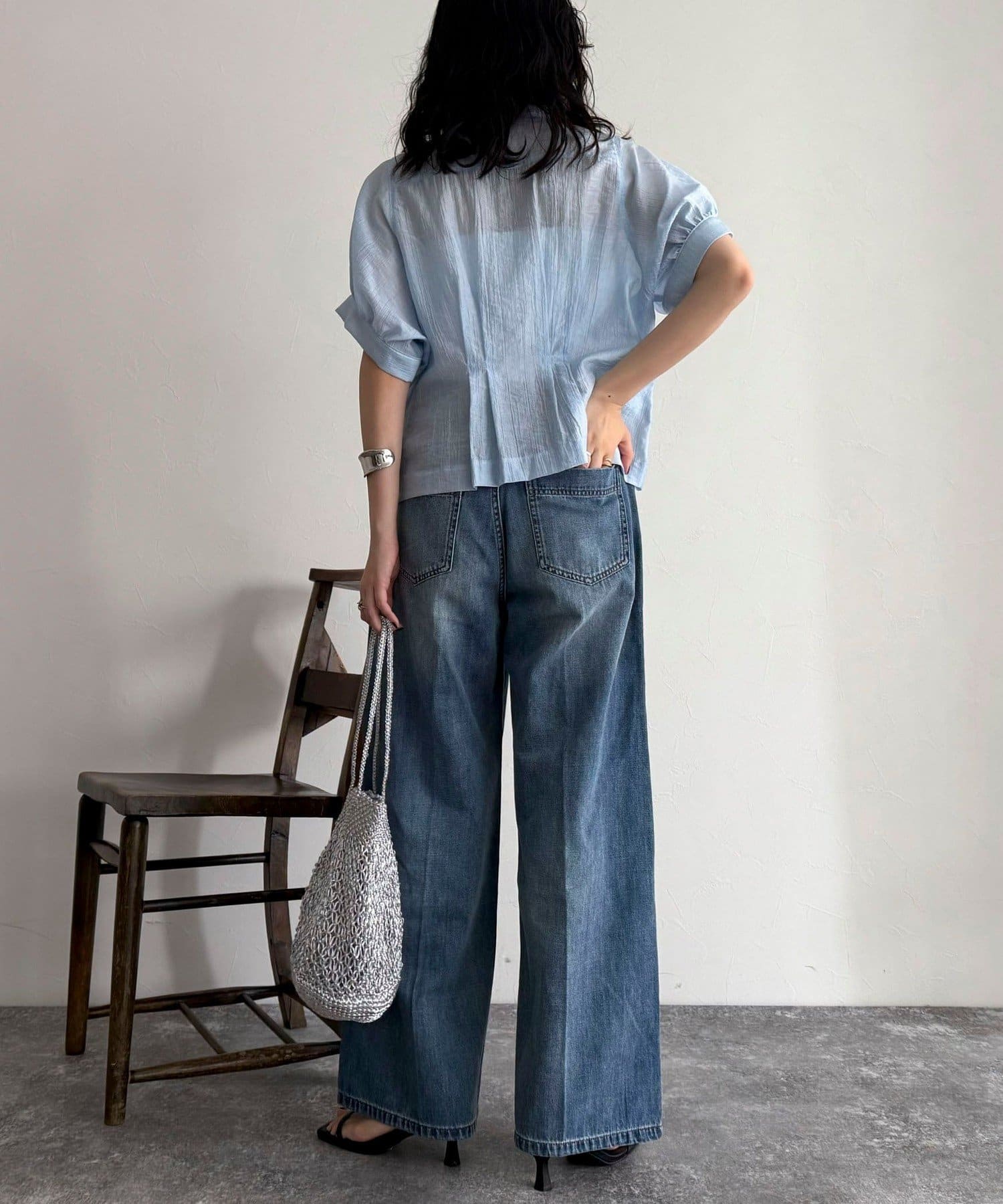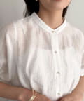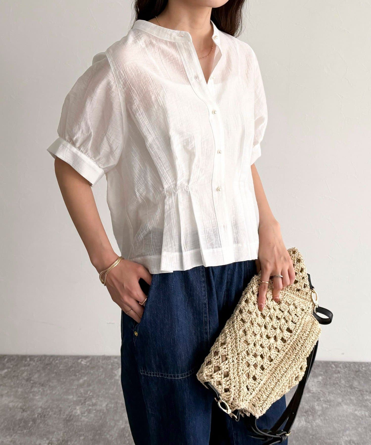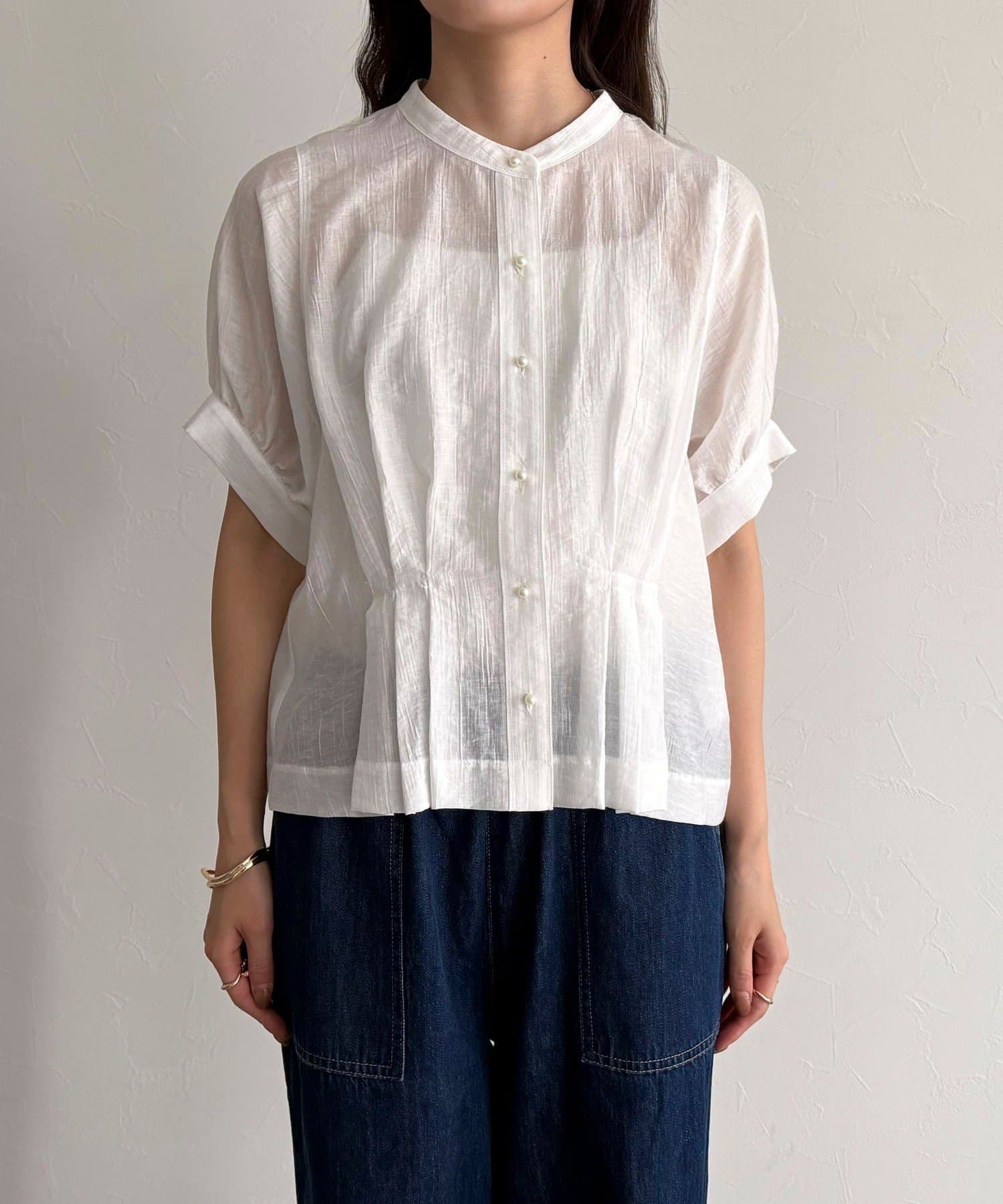 ・見た目にも涼し気なシアー素材で前開きで羽織にもなるデザインブラウスです