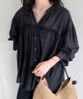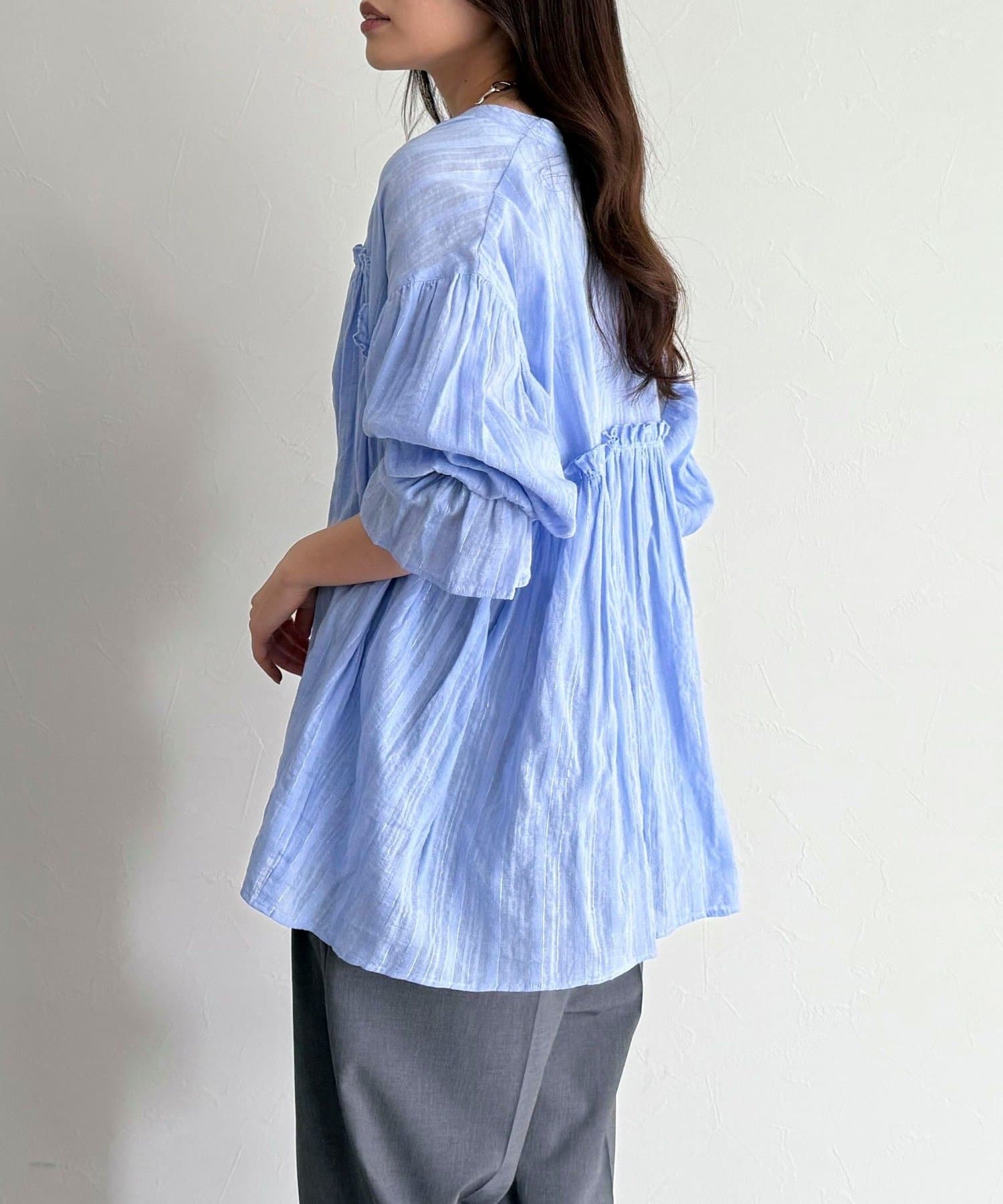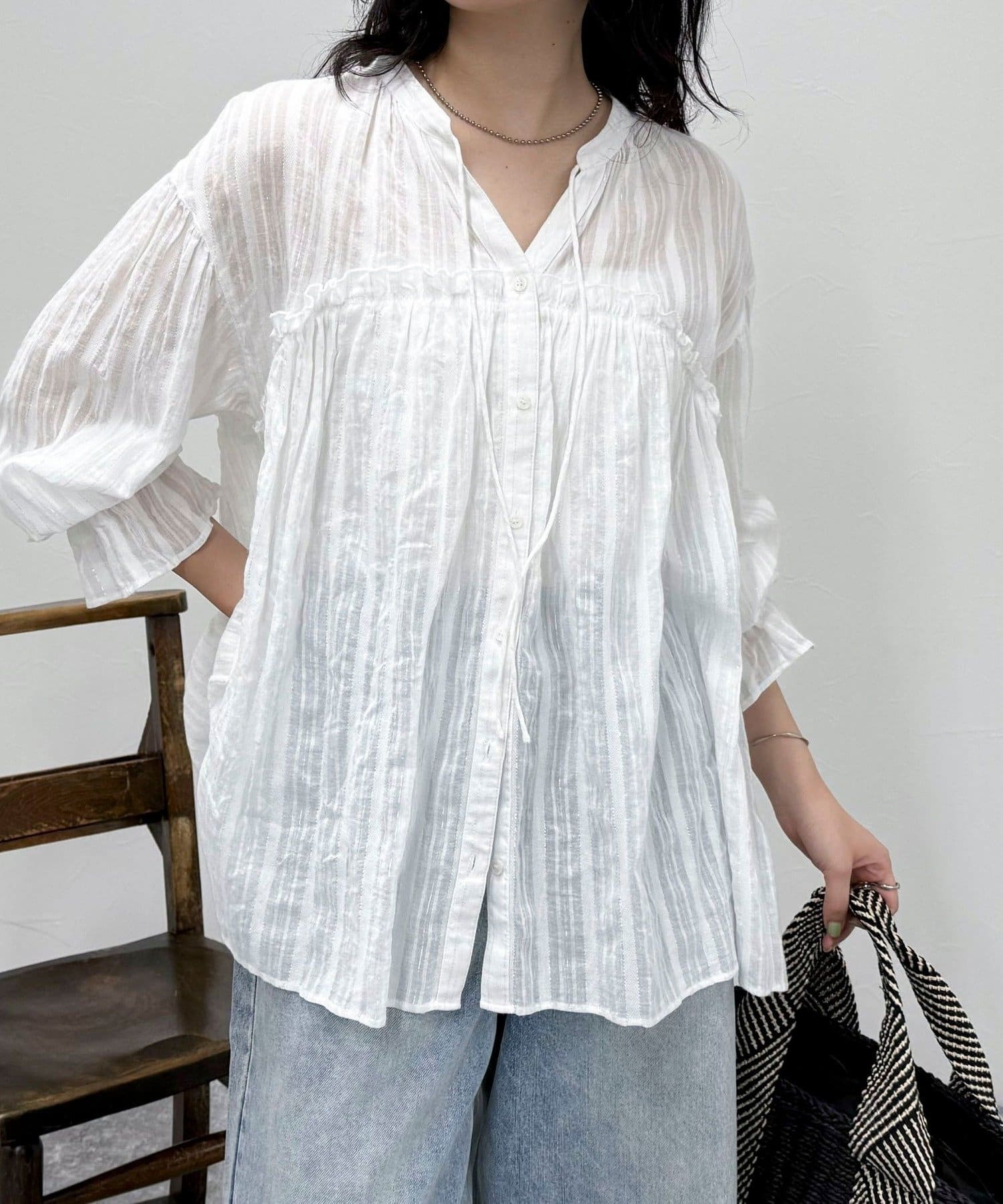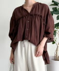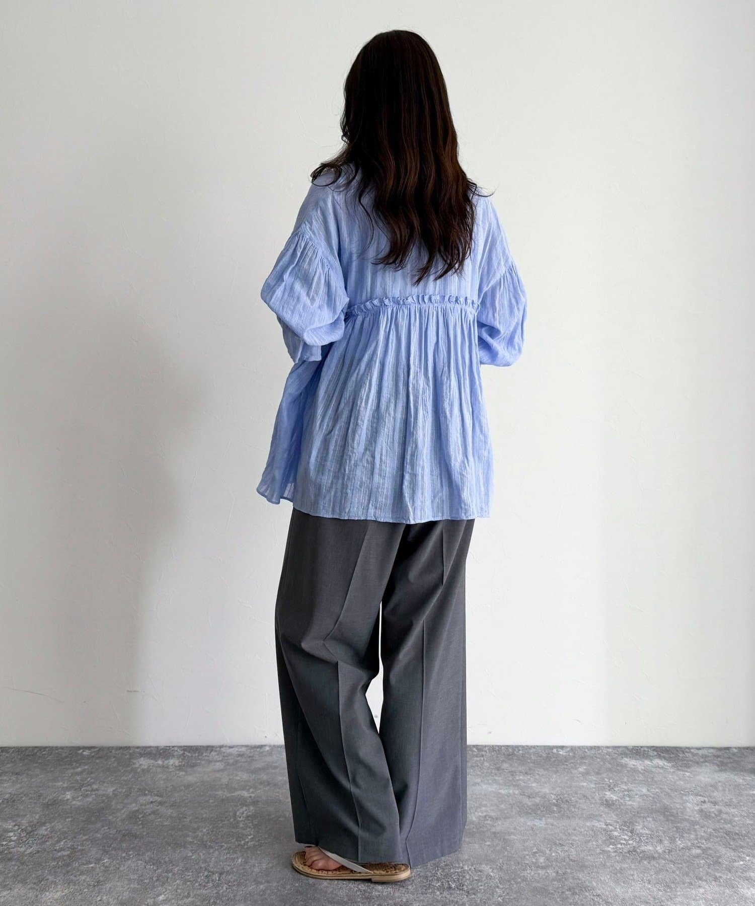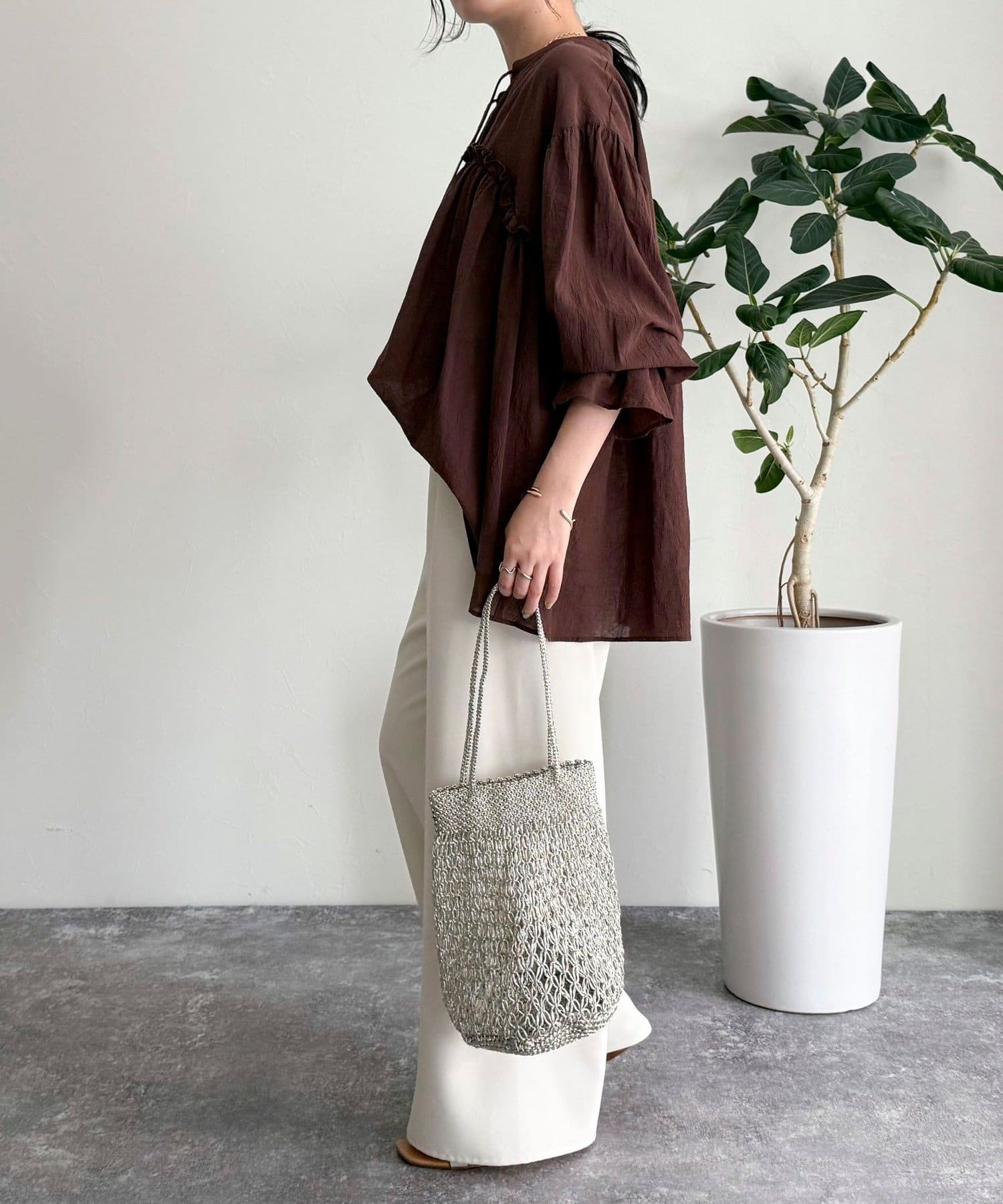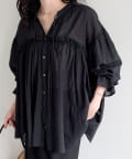 ・ギャザーや襟元のリボンデザインが女性らしいコットンブラウスです