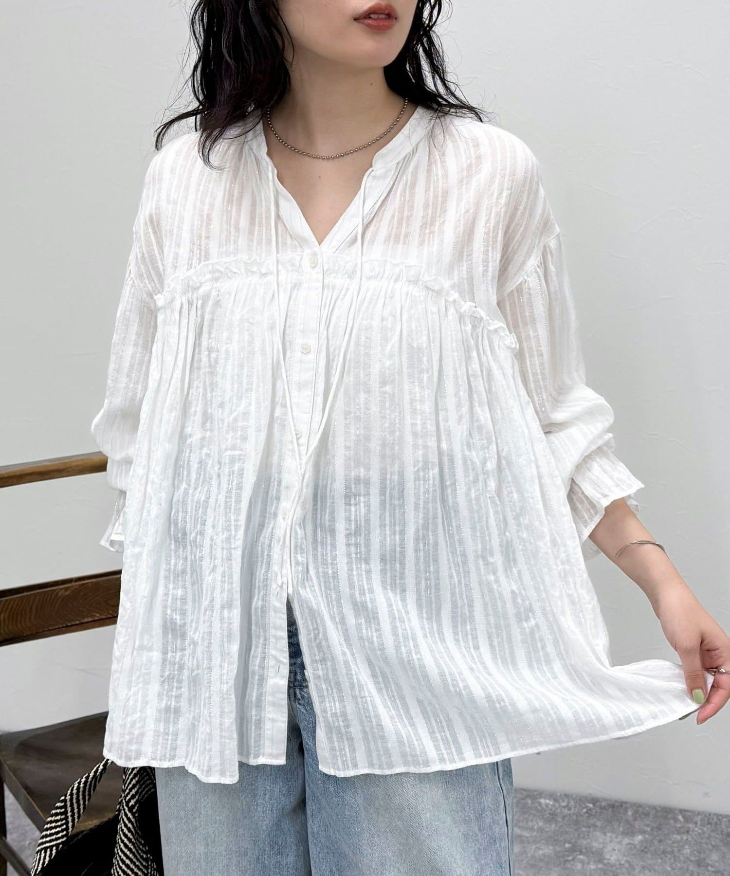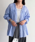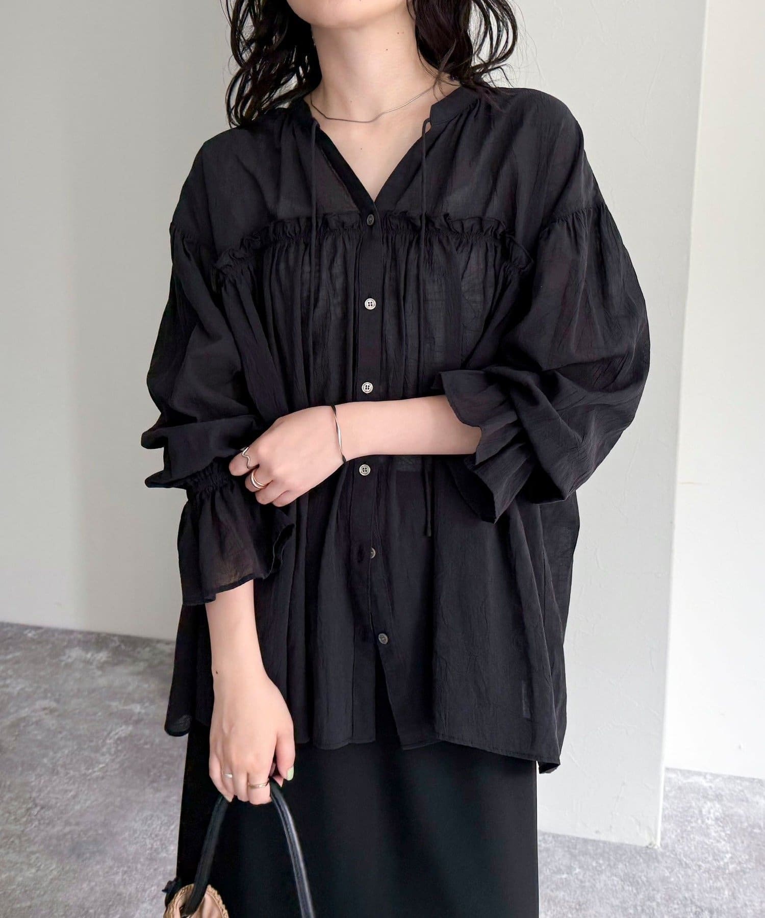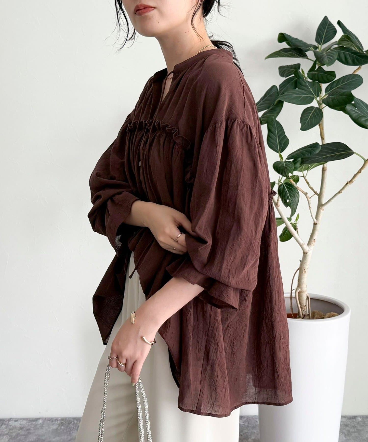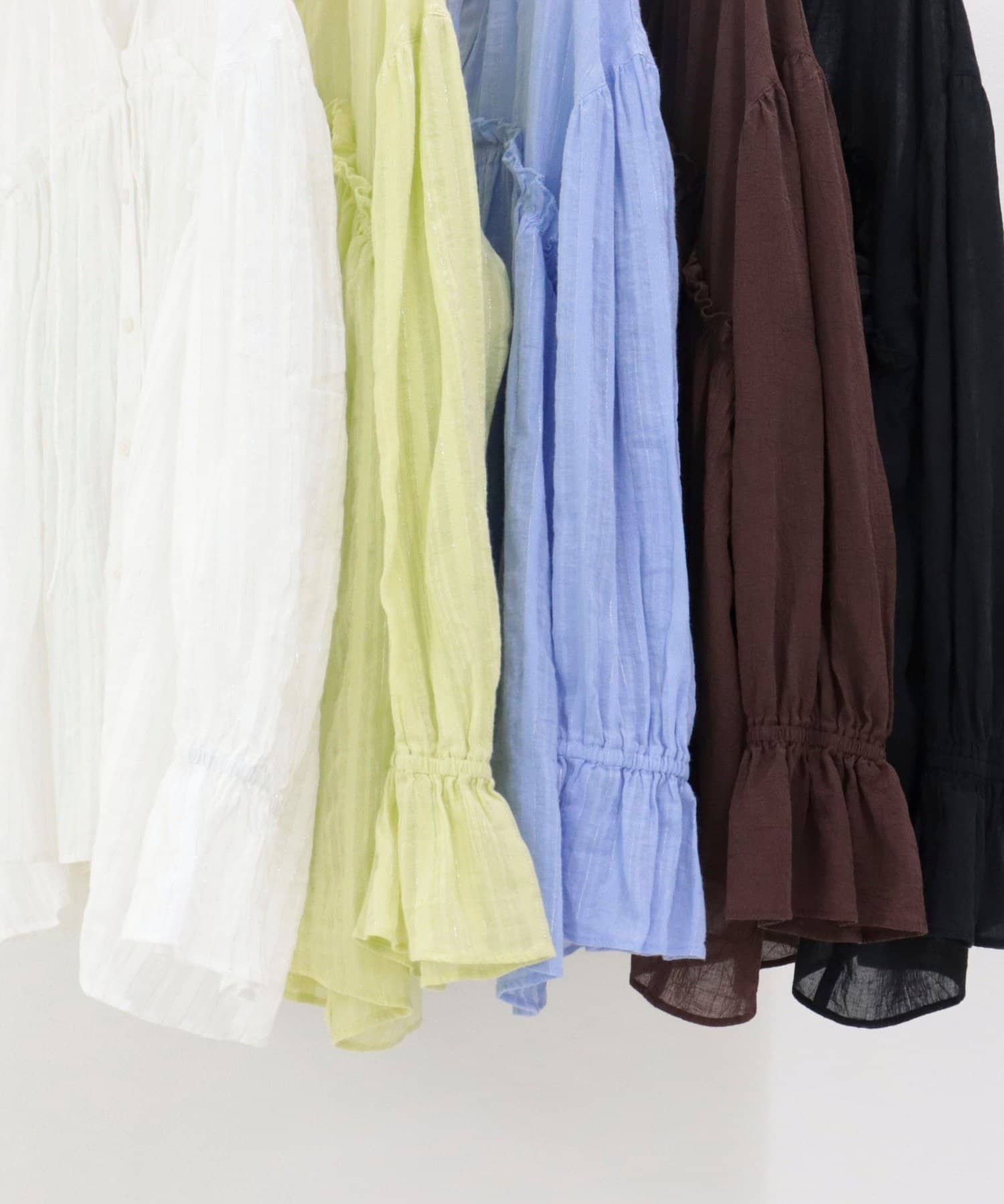 ・ギャザーや襟元のリボンデザインが女性らしいコットンブラウスです