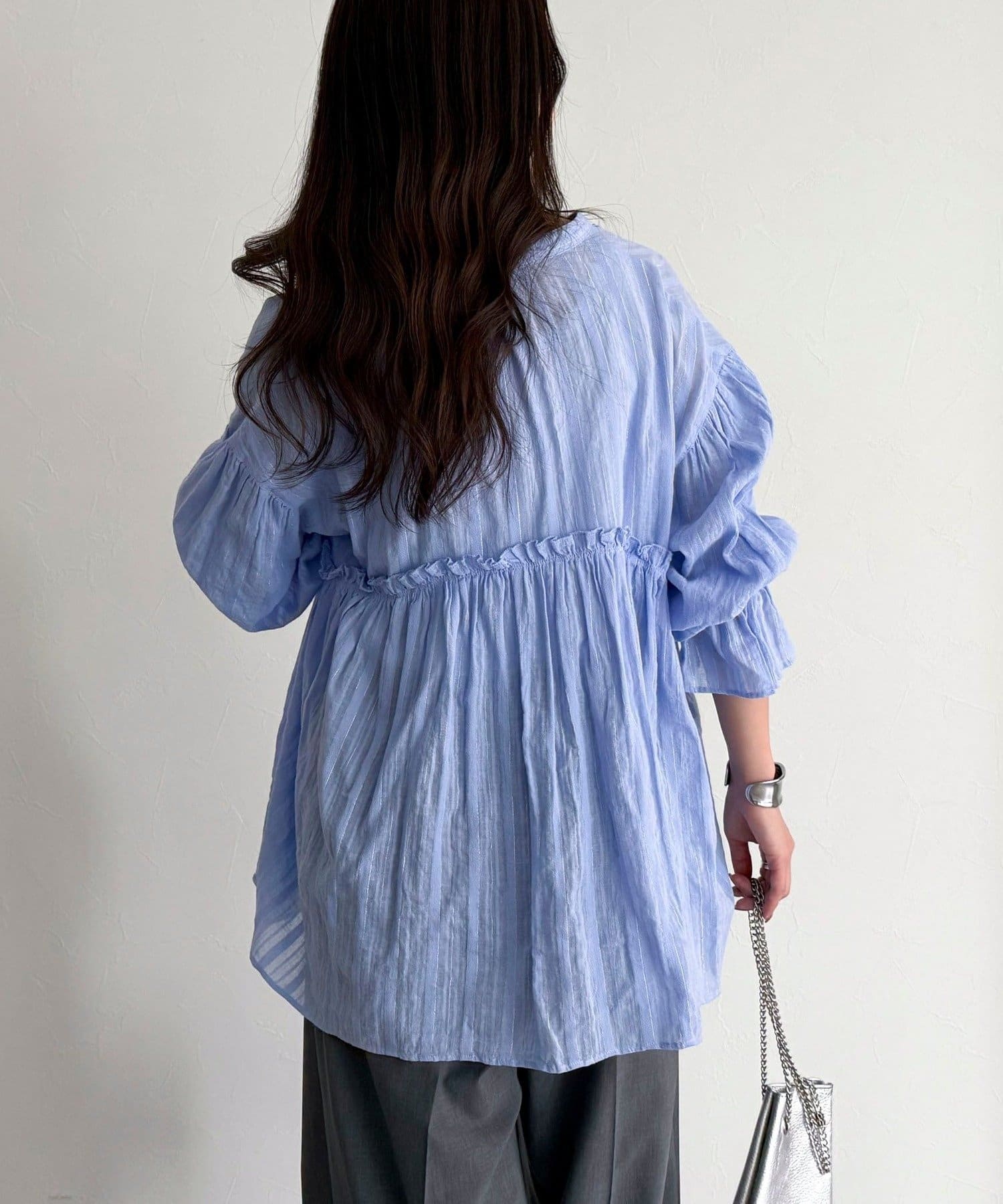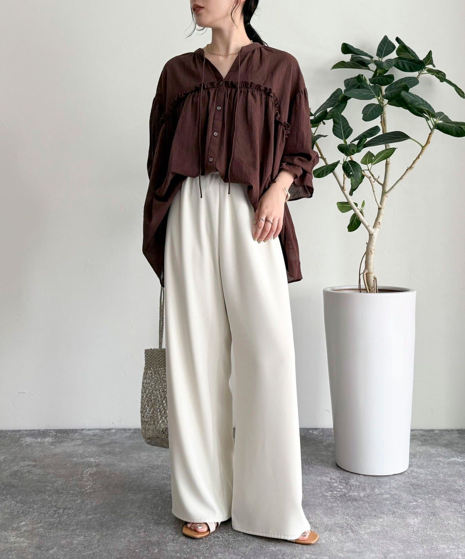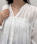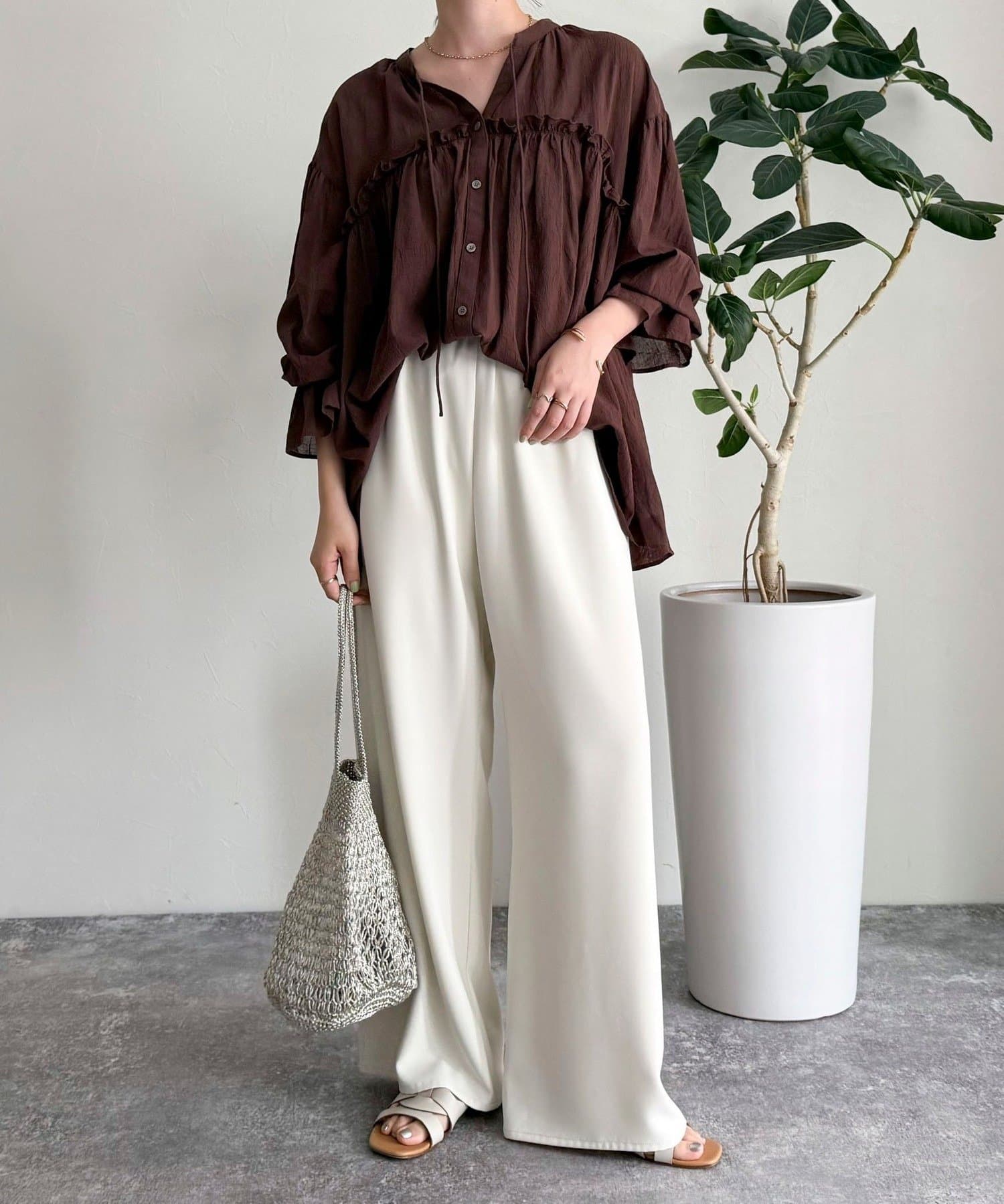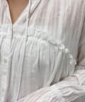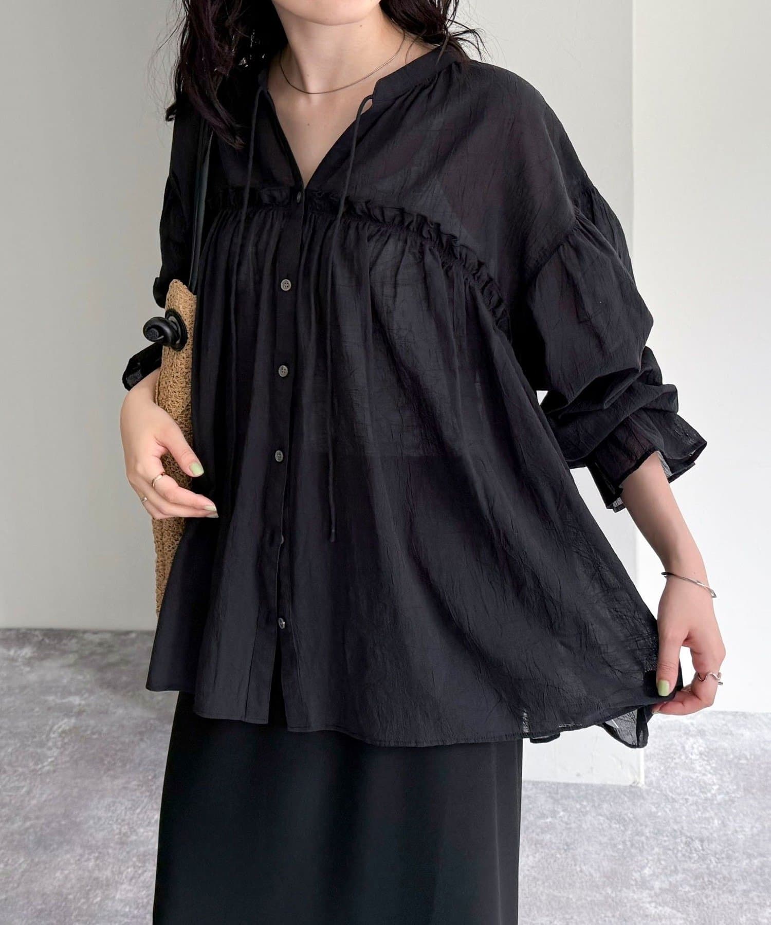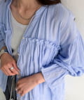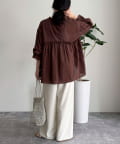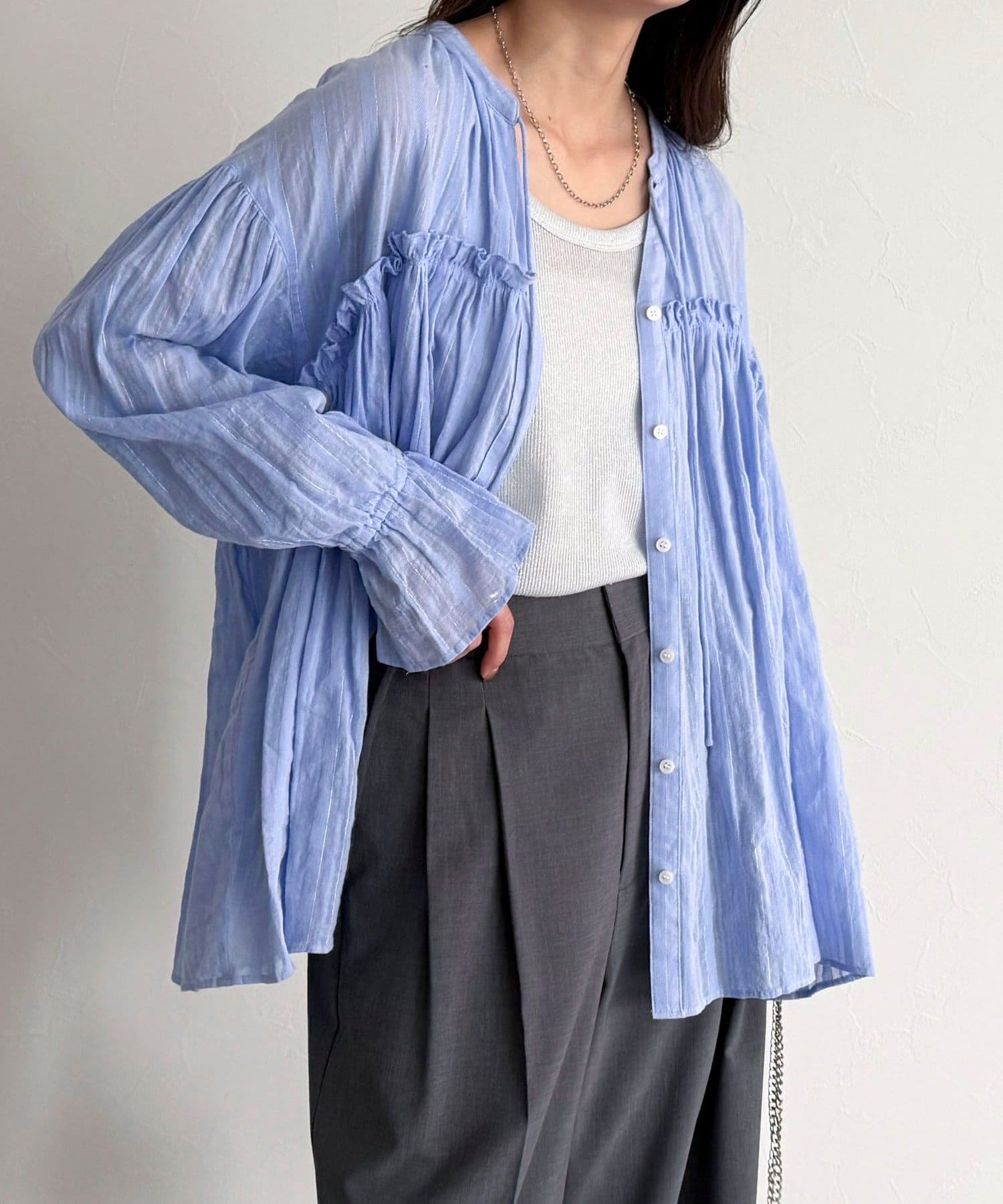 ・ギャザーや襟元のリボンデザインが女性らしいコットンブラウスです