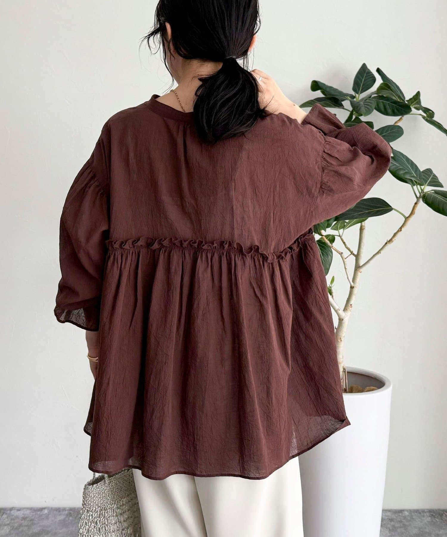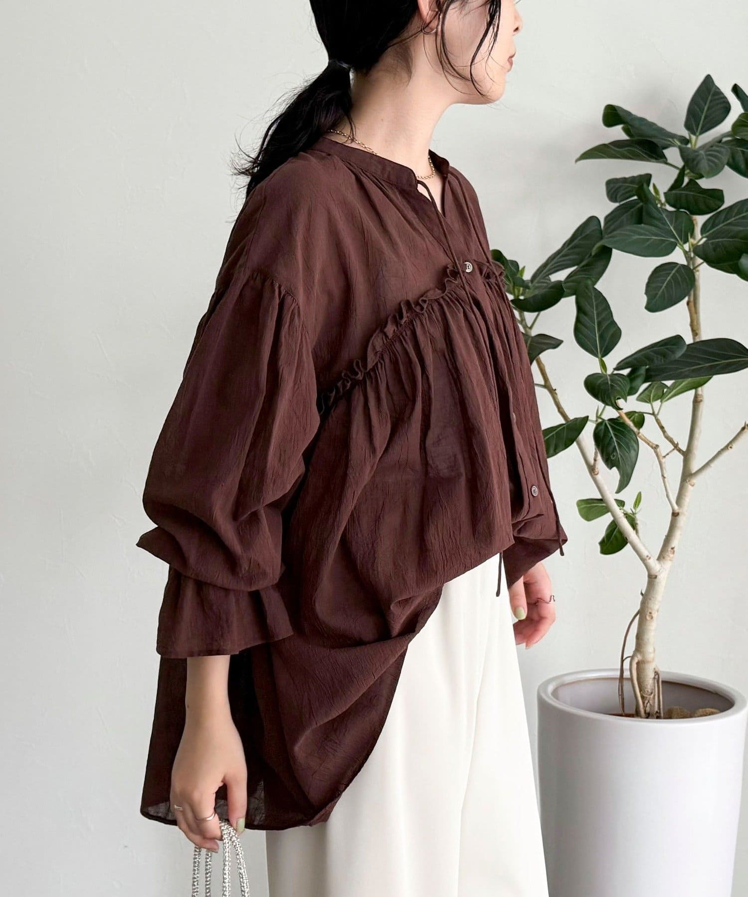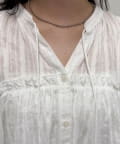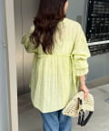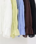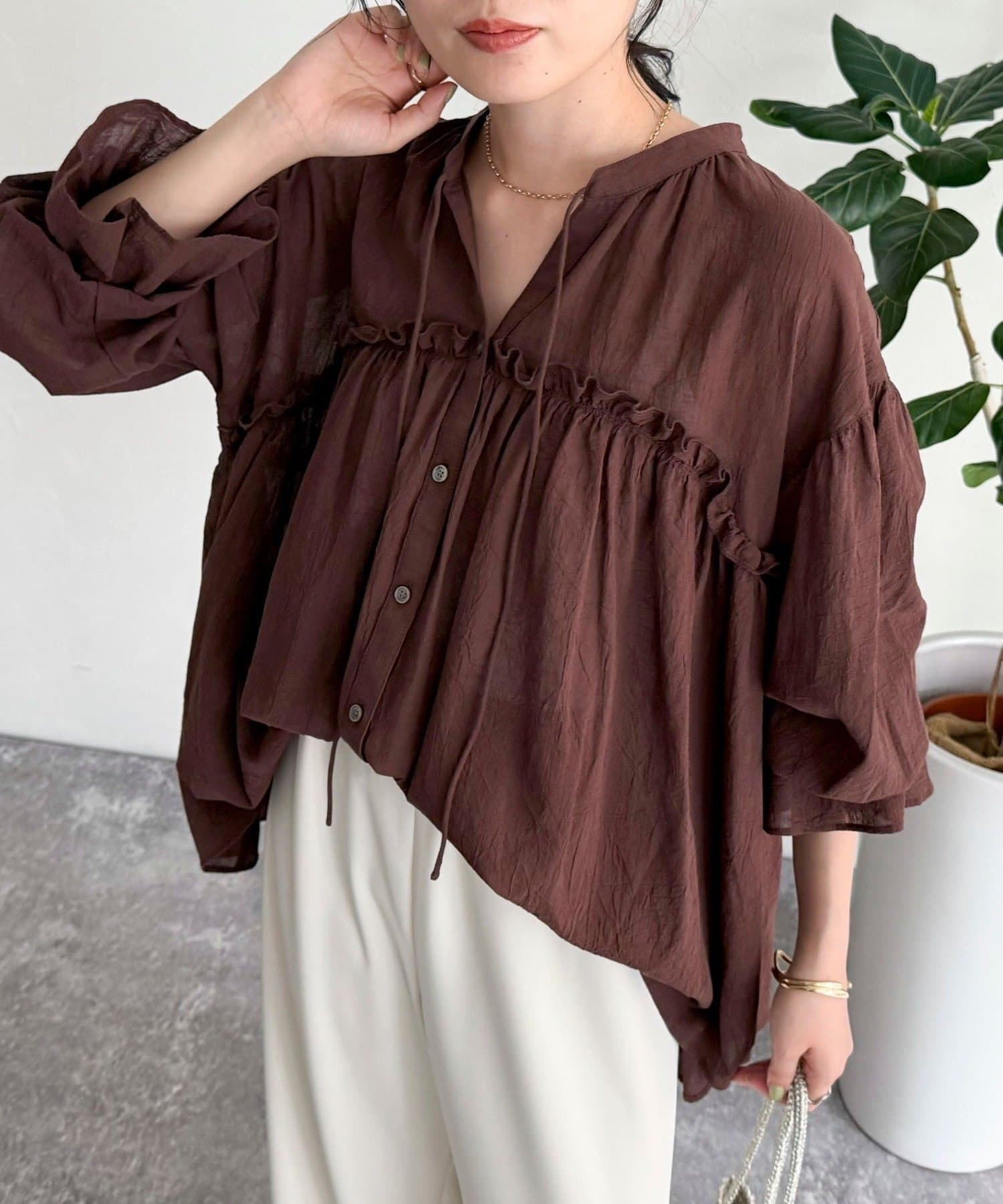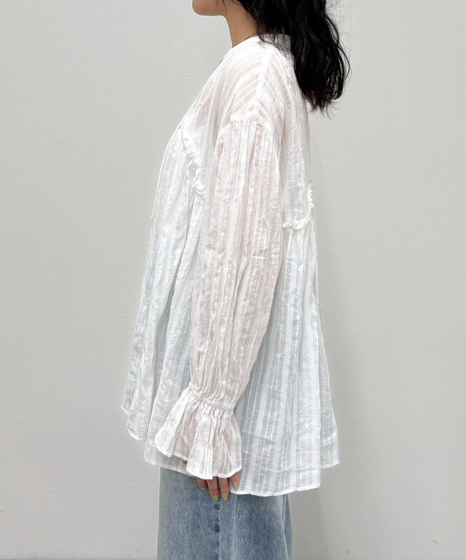 ・ギャザーや襟元のリボンデザインが女性らしいコットンブラウスです