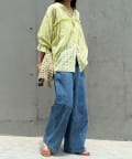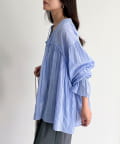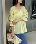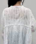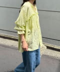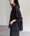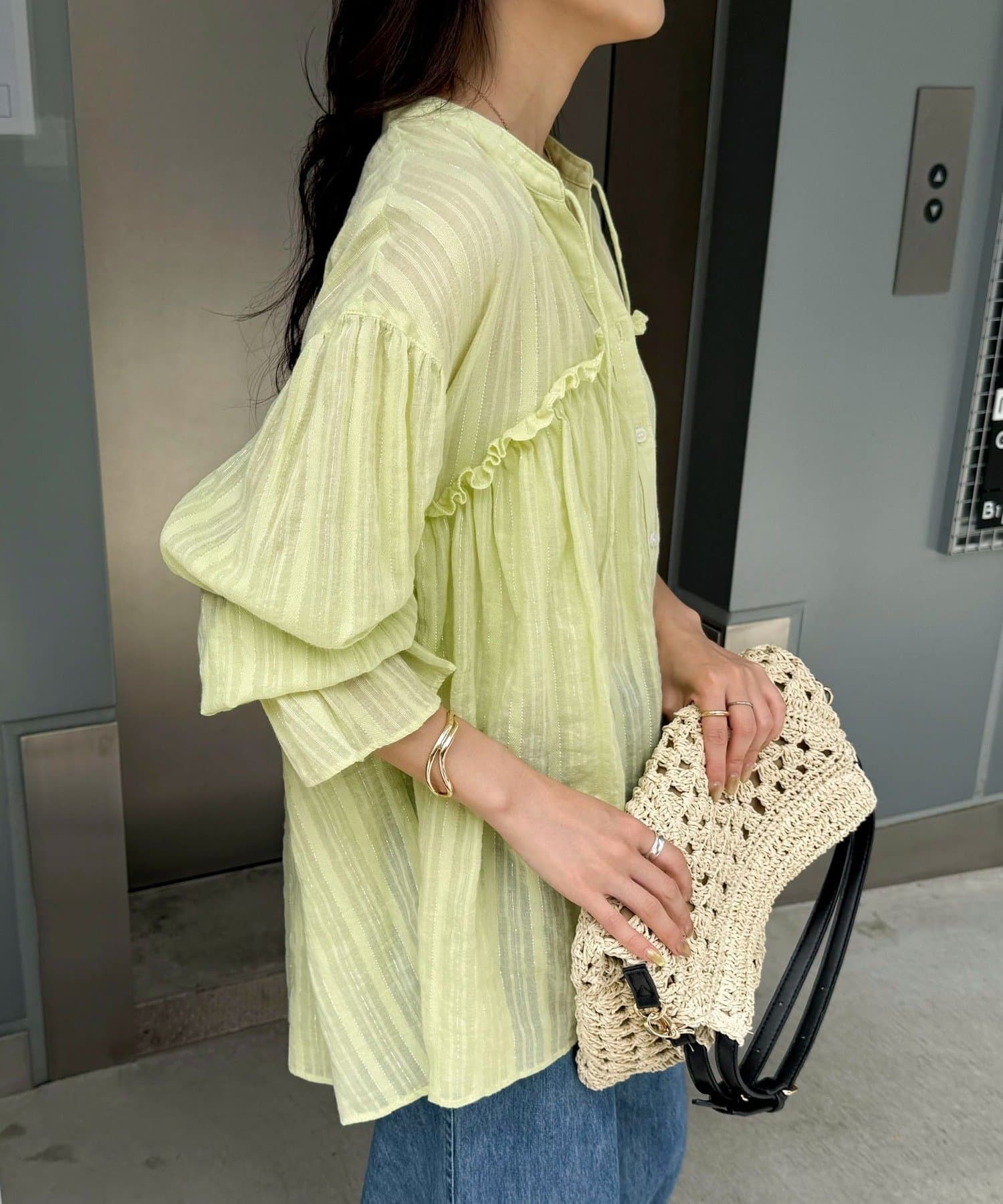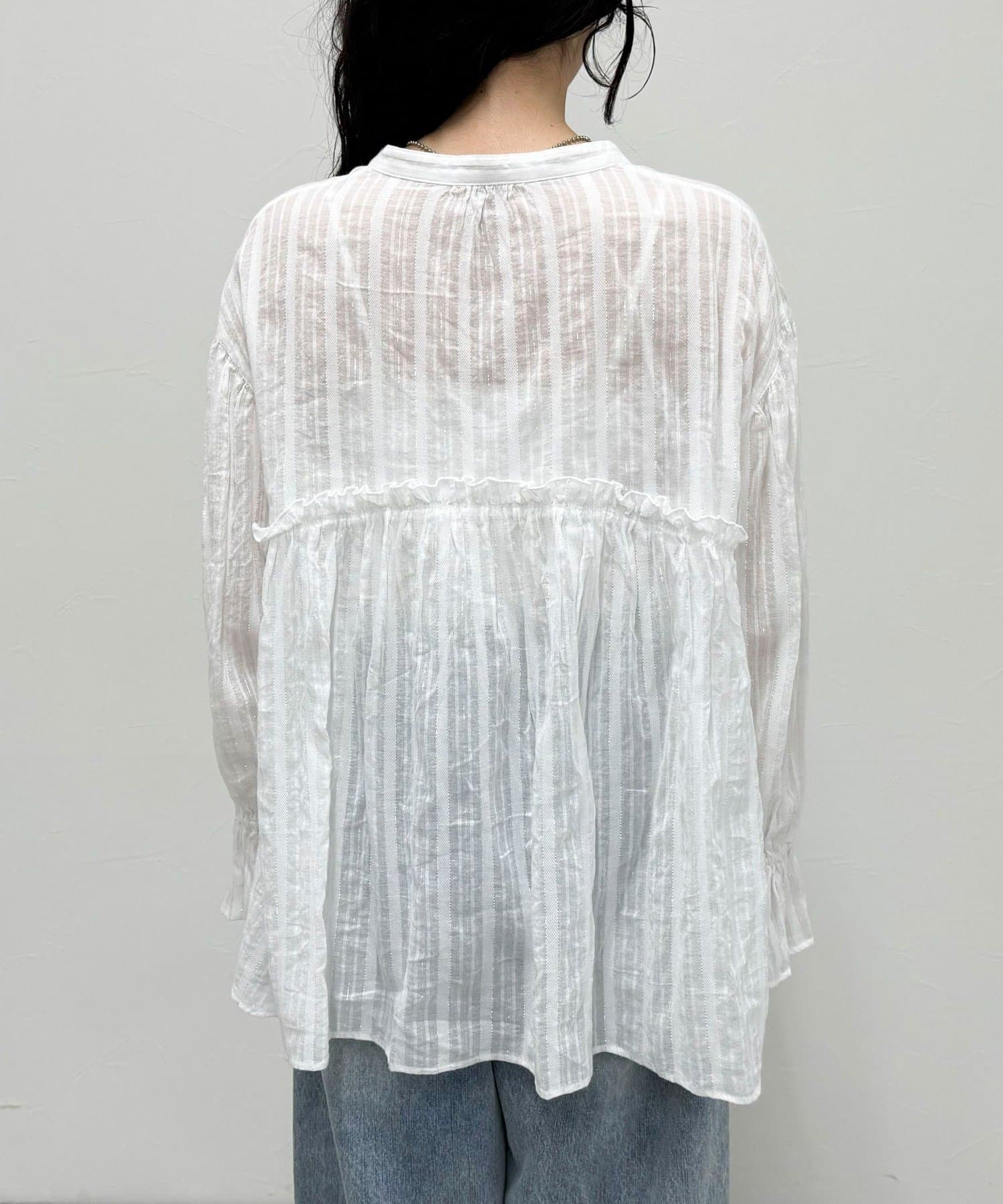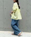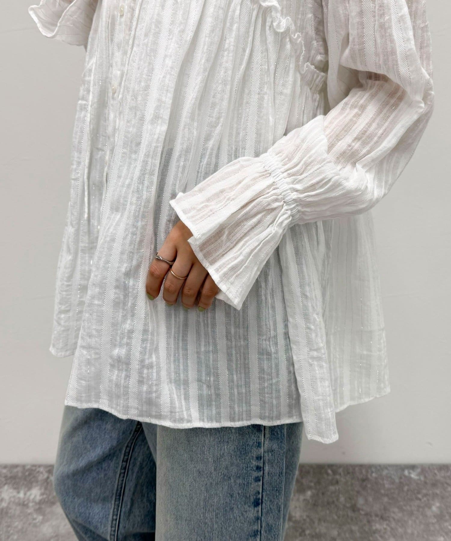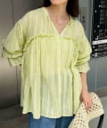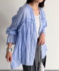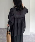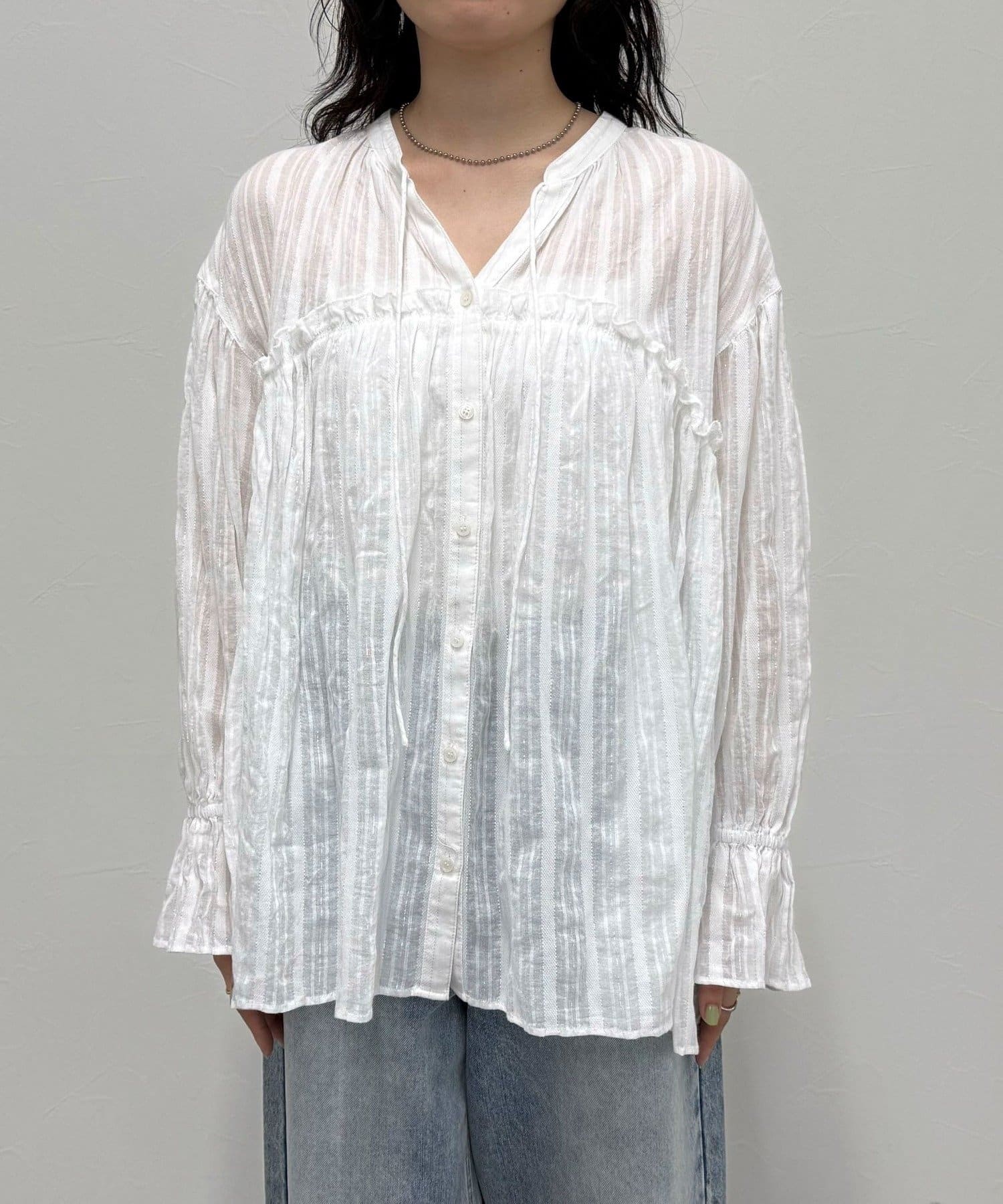 ・ギャザーや襟元のリボンデザインが女性らしいコットンブラウスです
