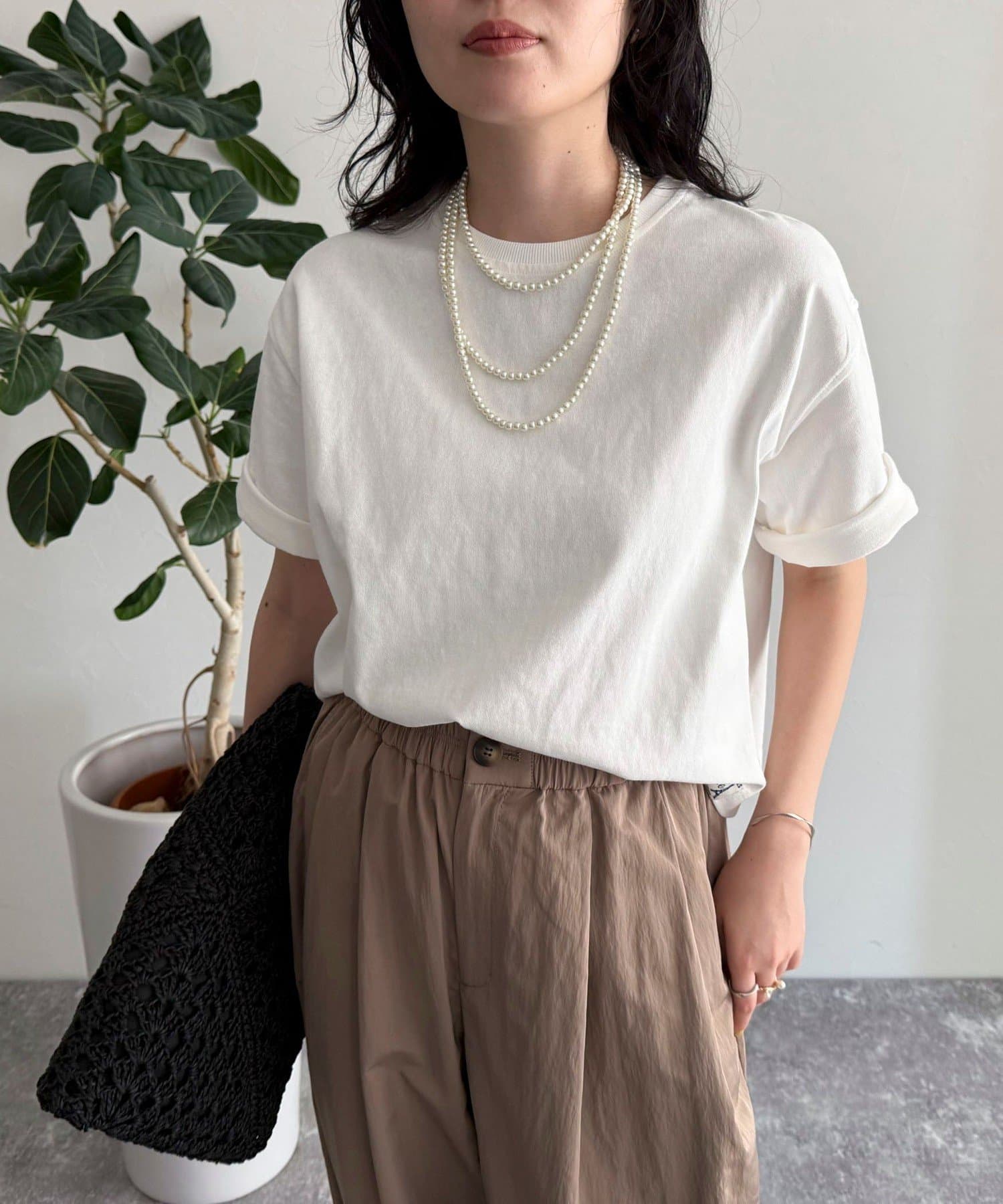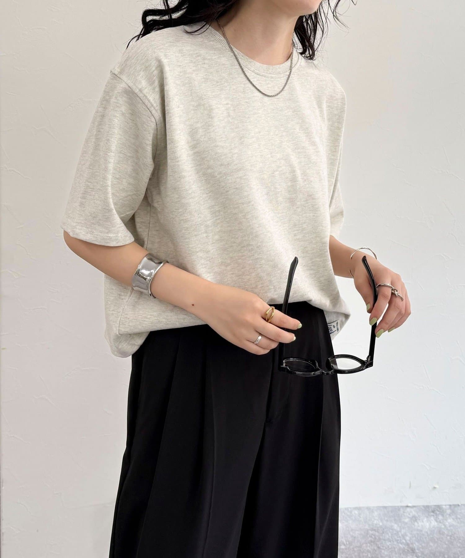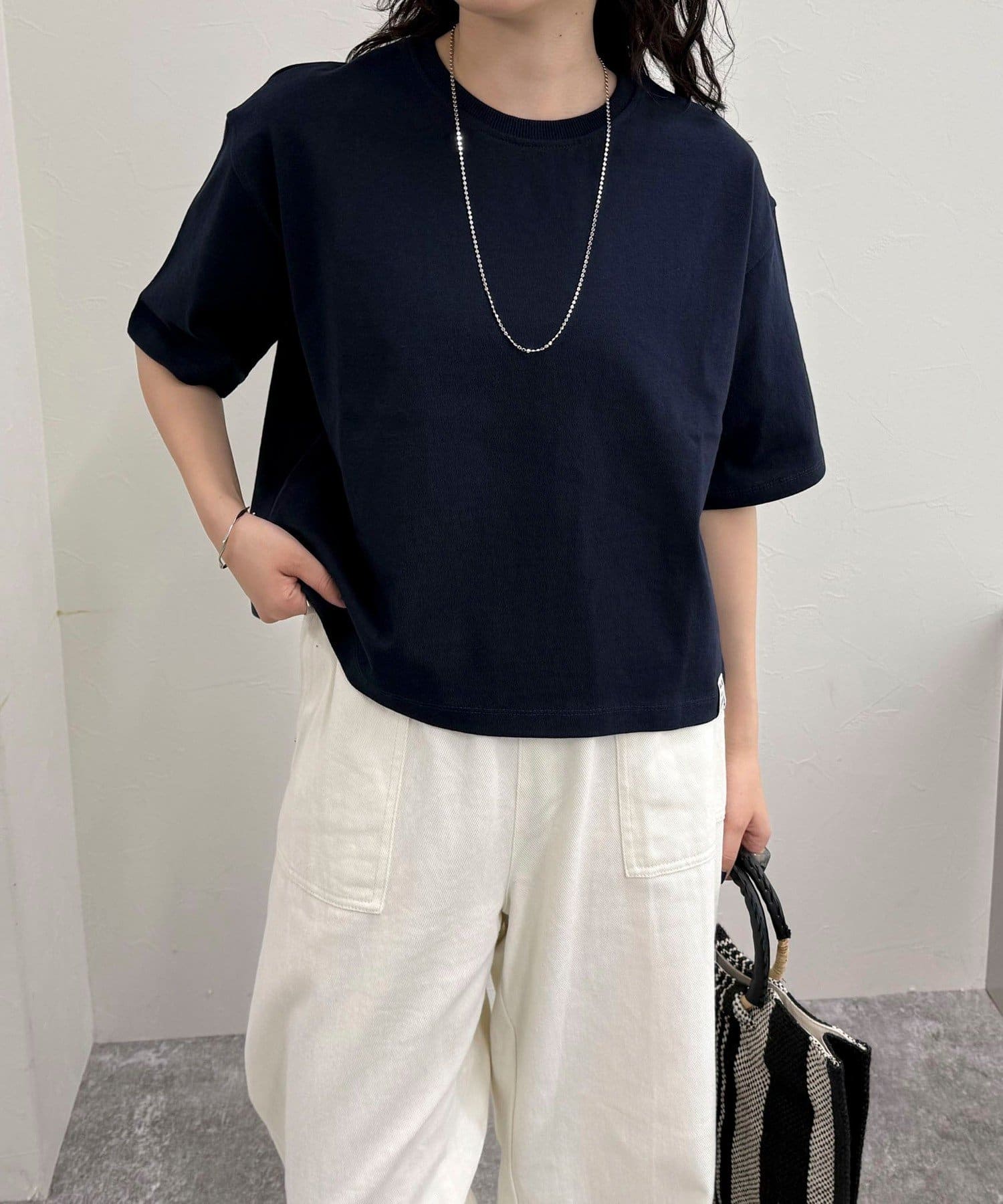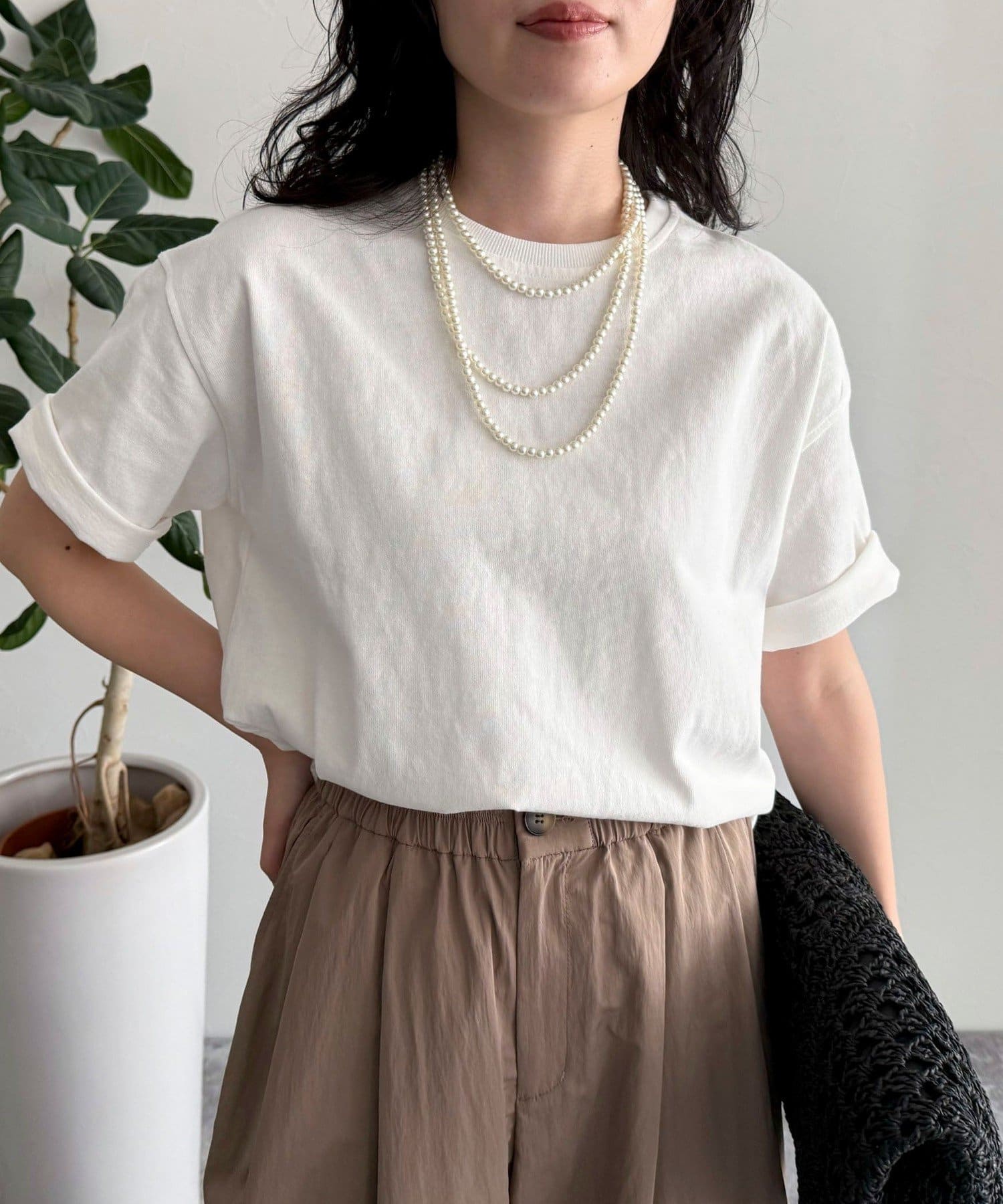 ・首元はすっきりとしたクルーネックで、ネックレスなどのアクセサリーも映えます