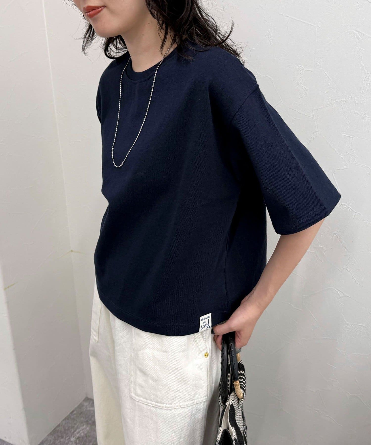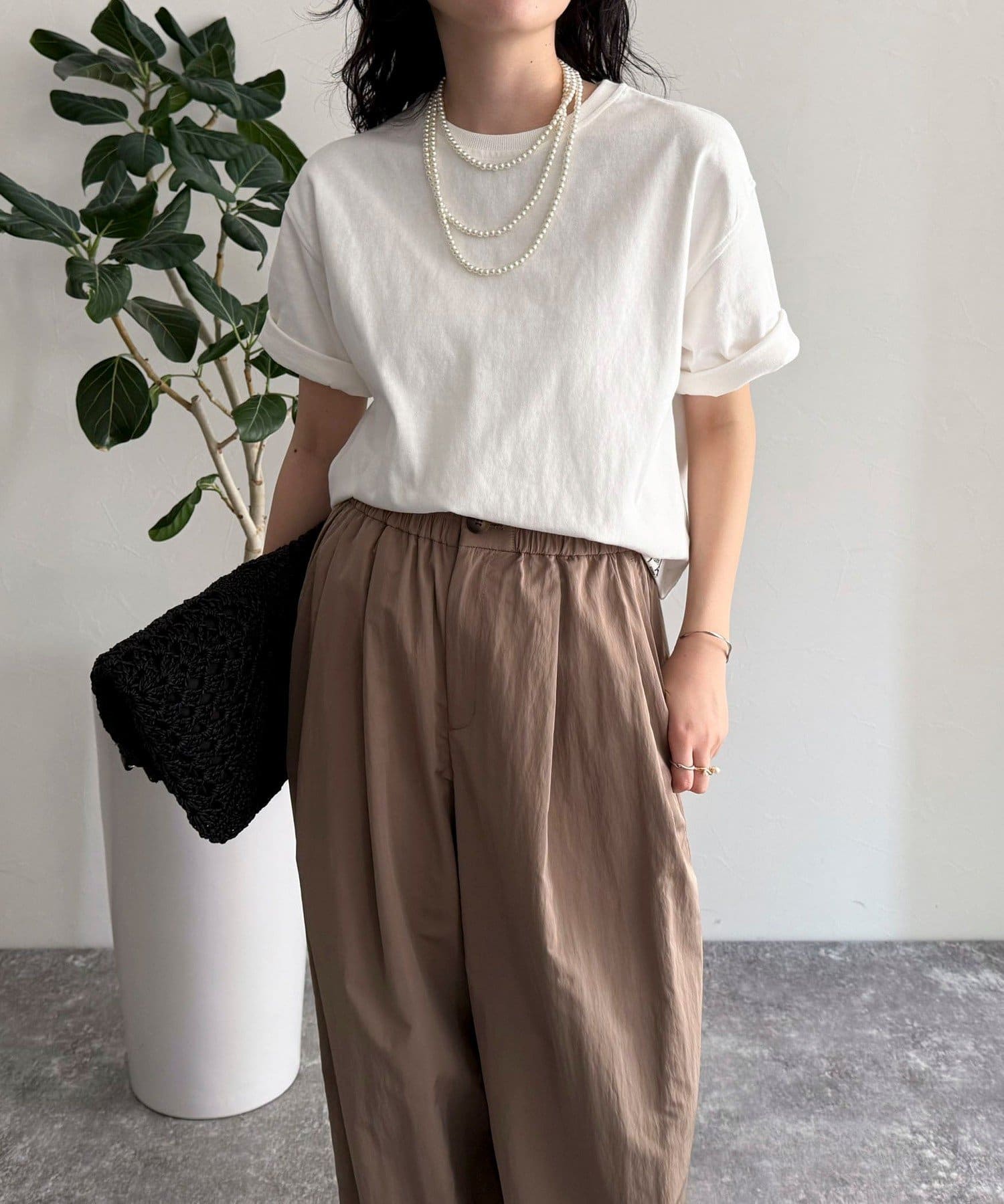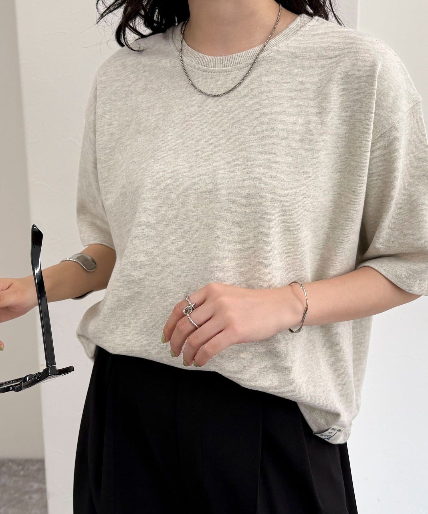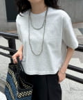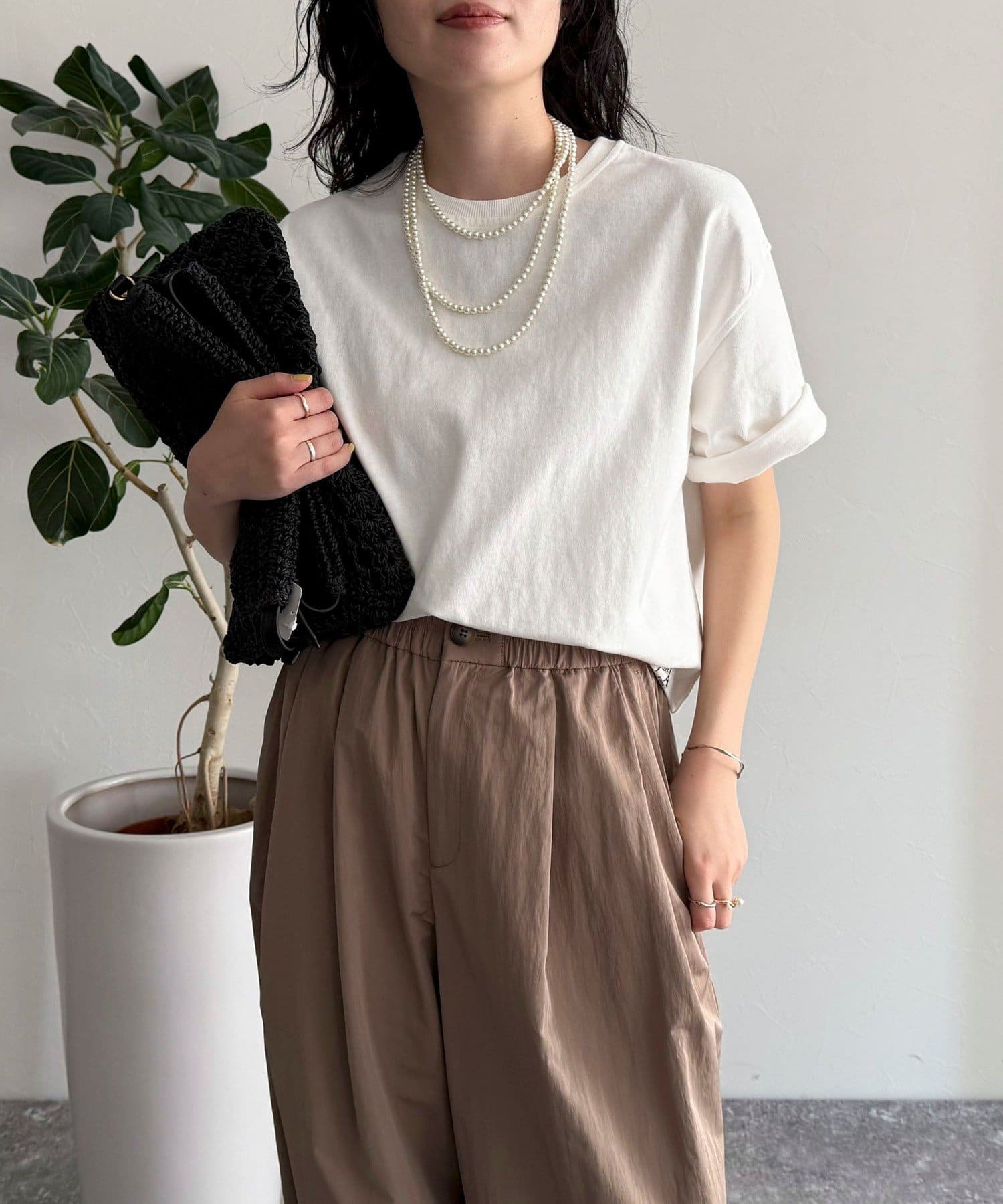 ・首元はすっきりとしたクルーネックで、ネックレスなどのアクセサリーも映えます