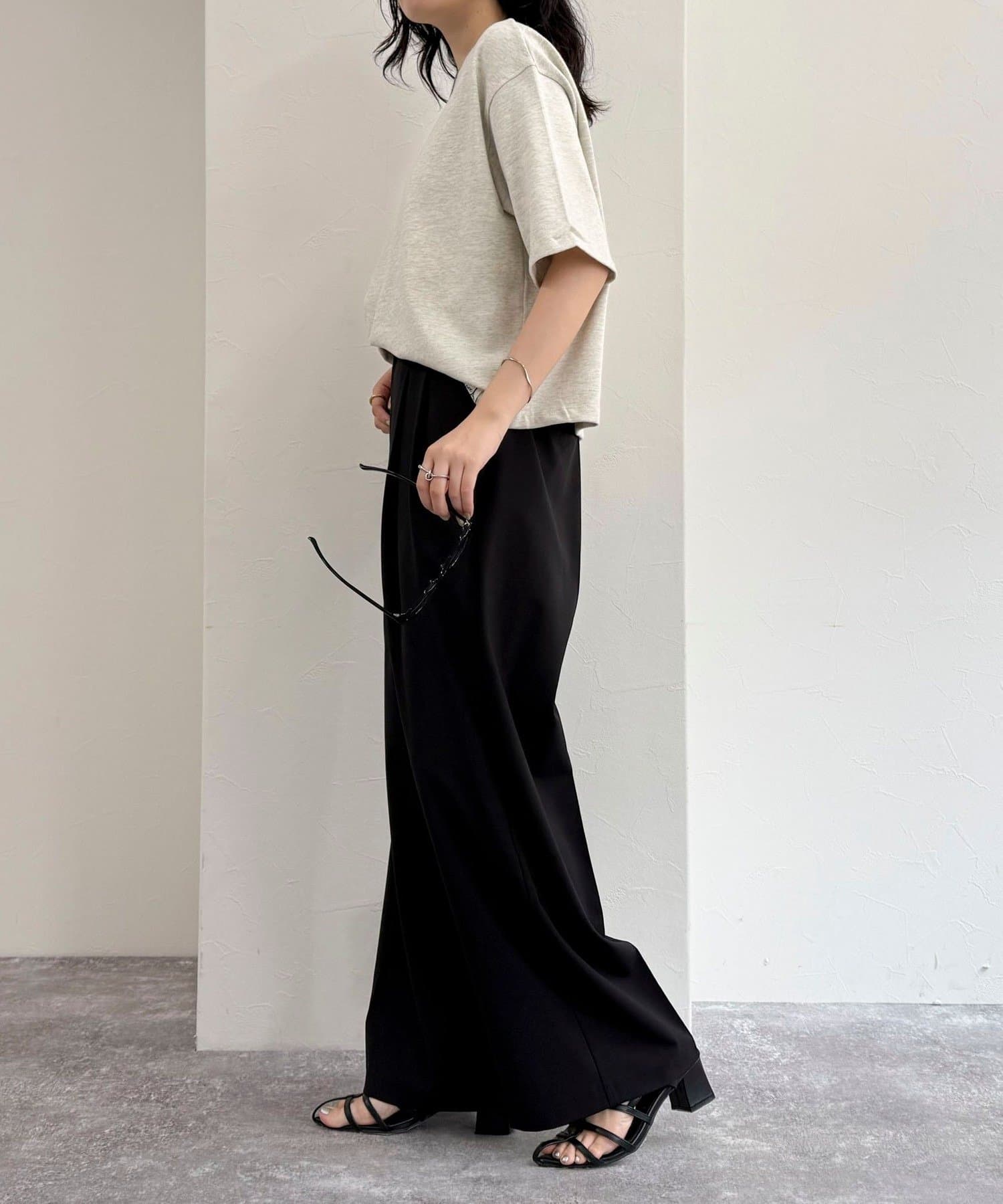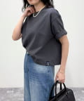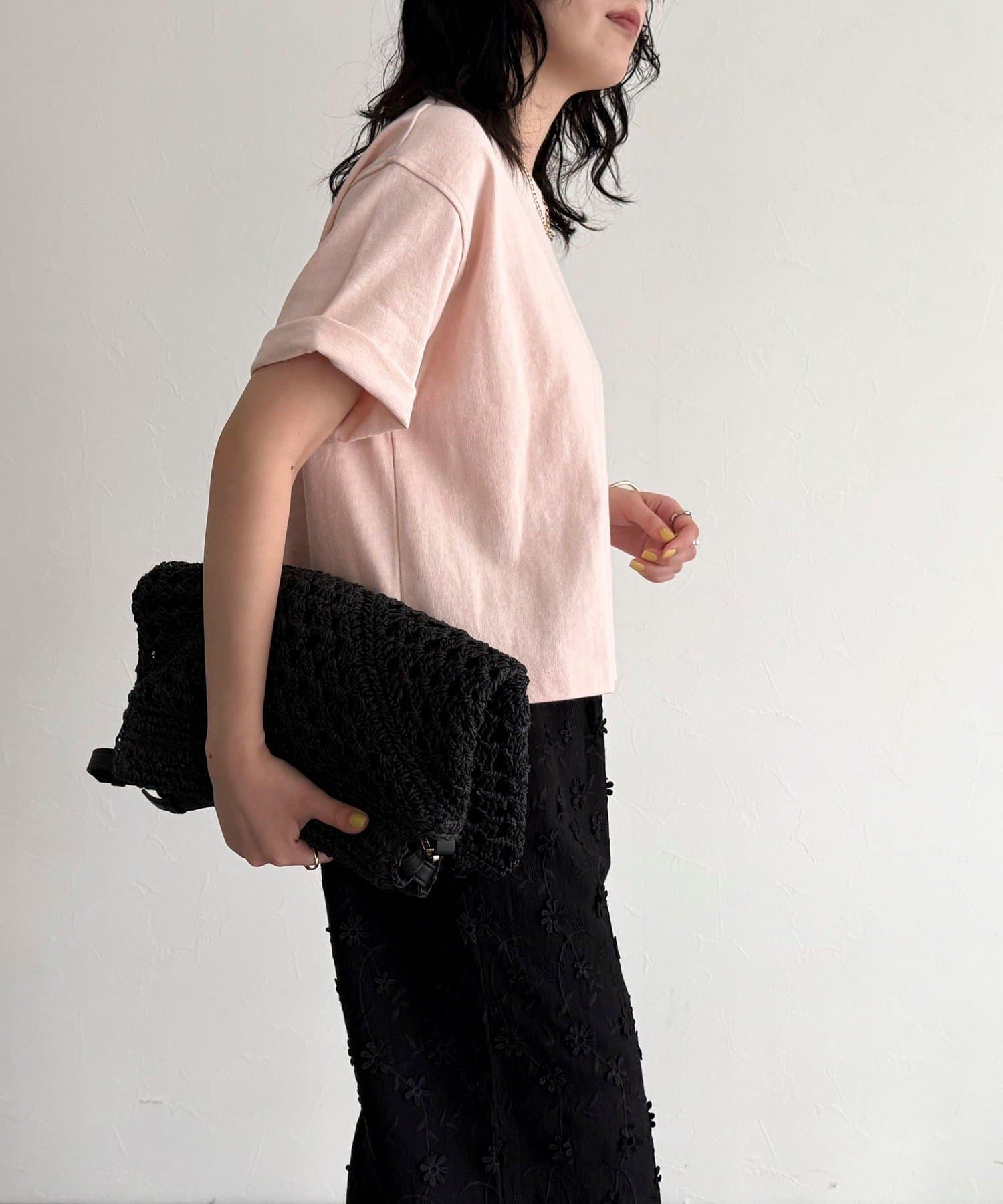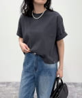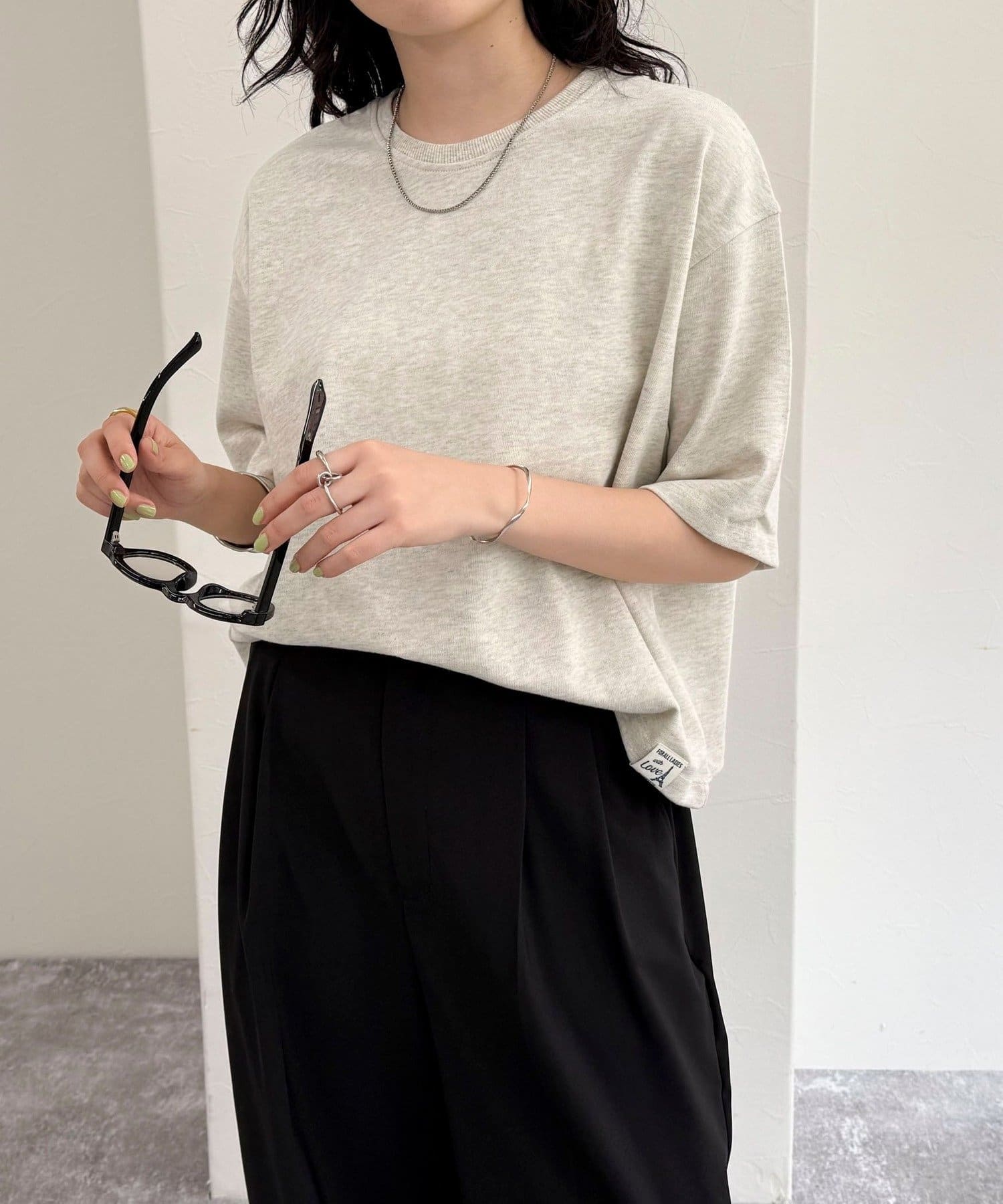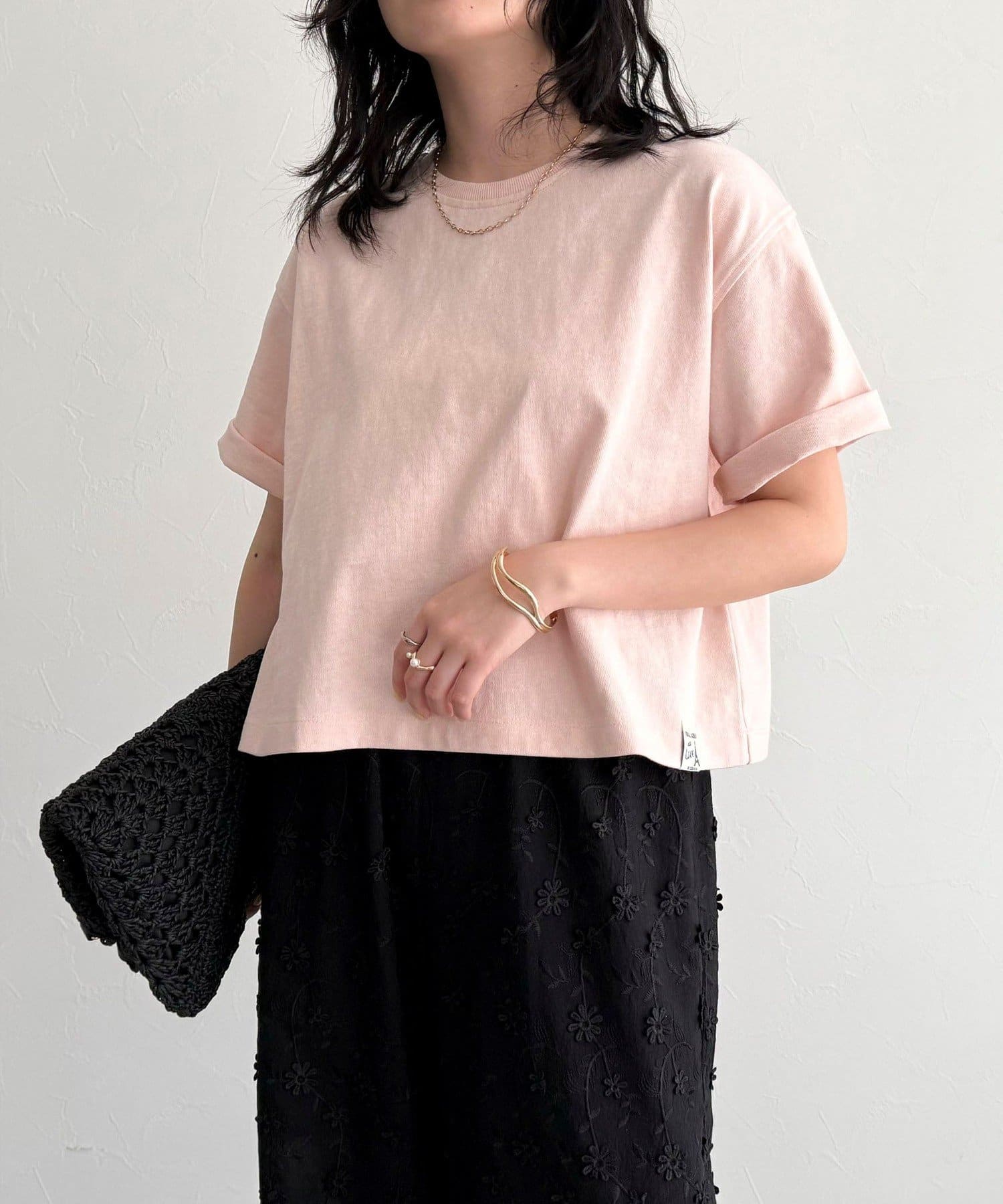 ・首元はすっきりとしたクルーネックで、ネックレスなどのアクセサリーも映えます