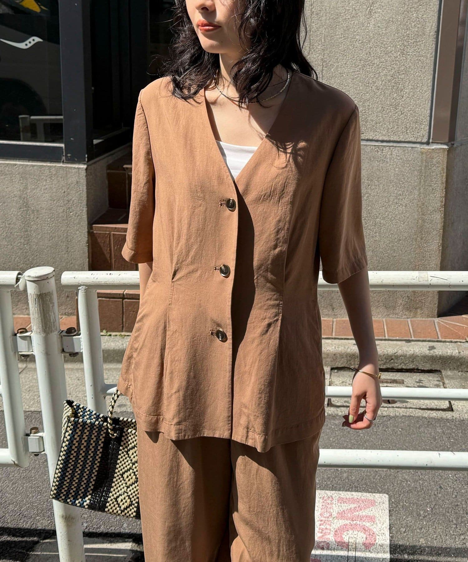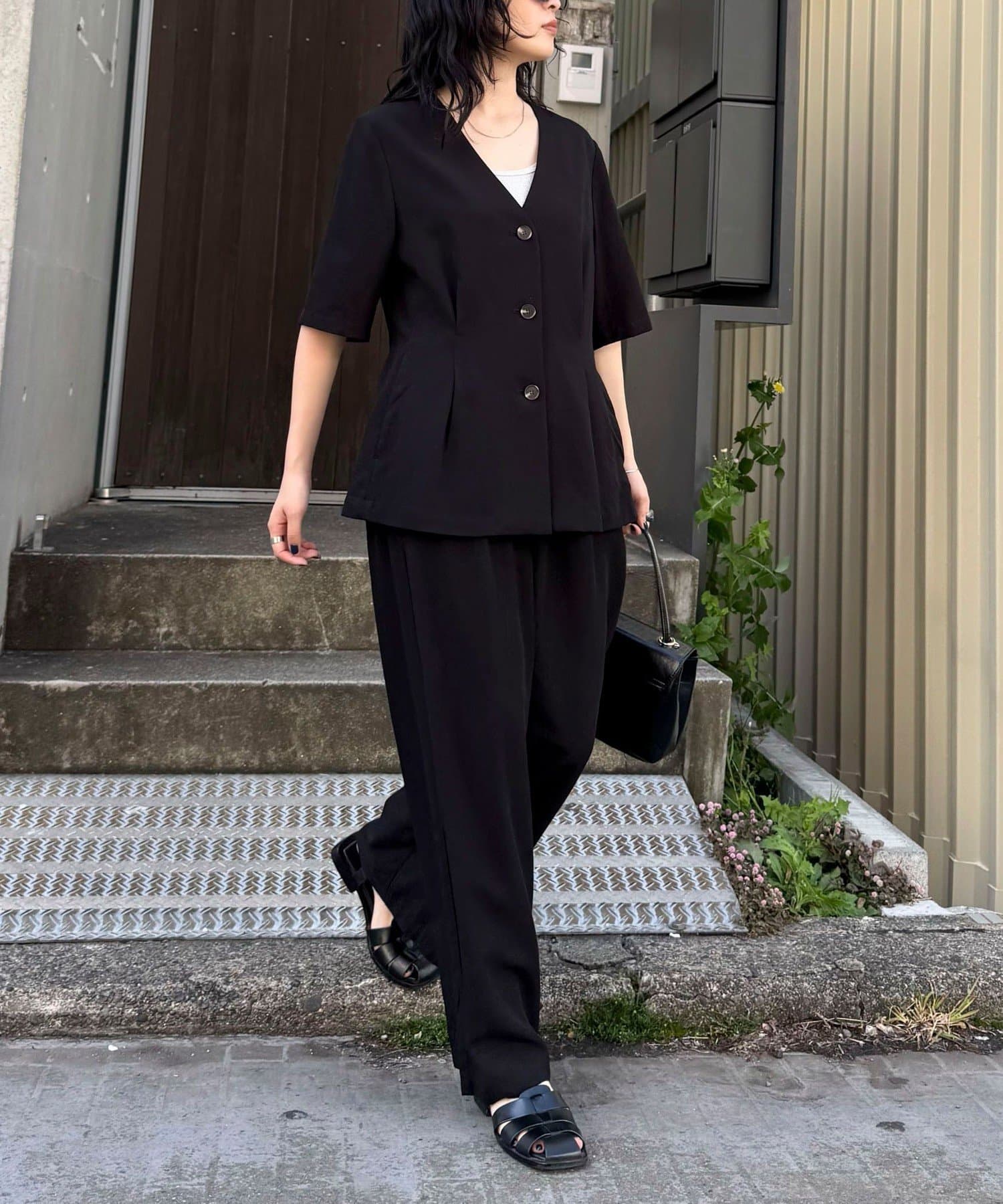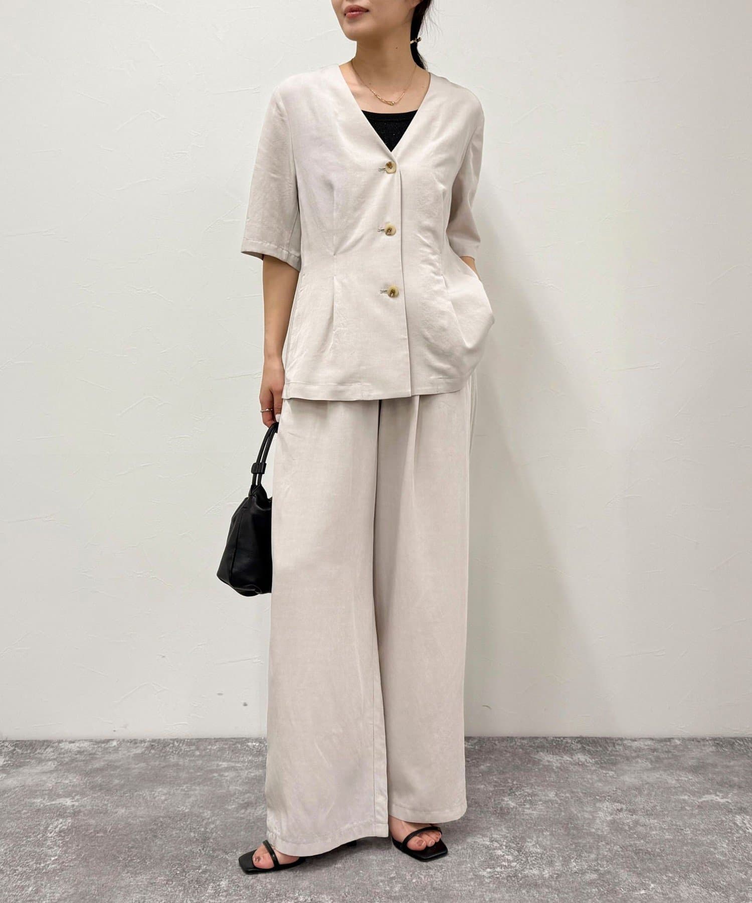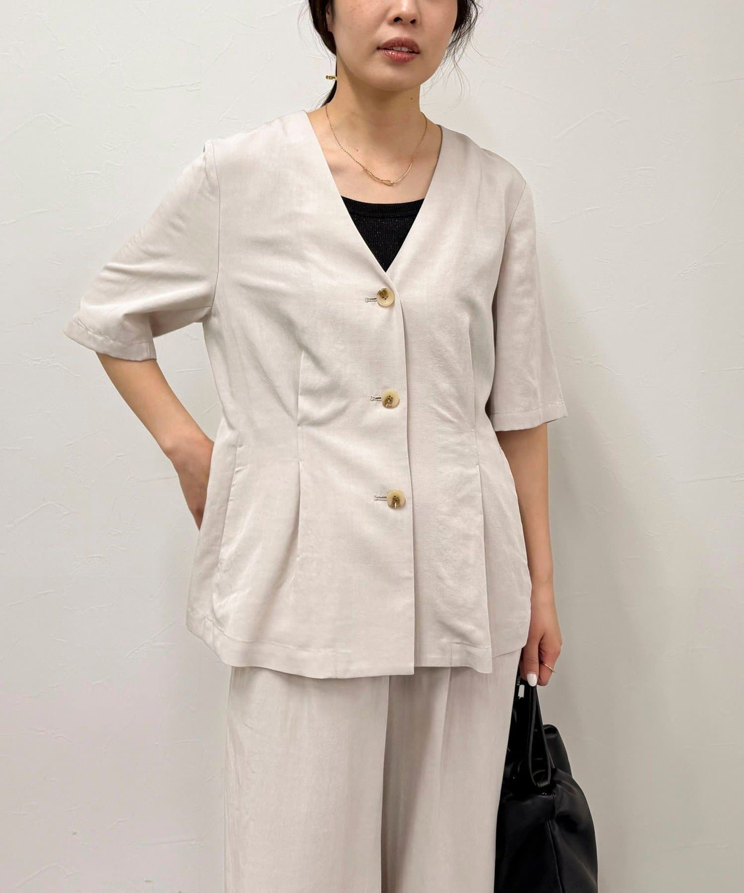 ・ノーカラーでかっちりし過ぎず、カジュアル合わせもしやすいデザインです