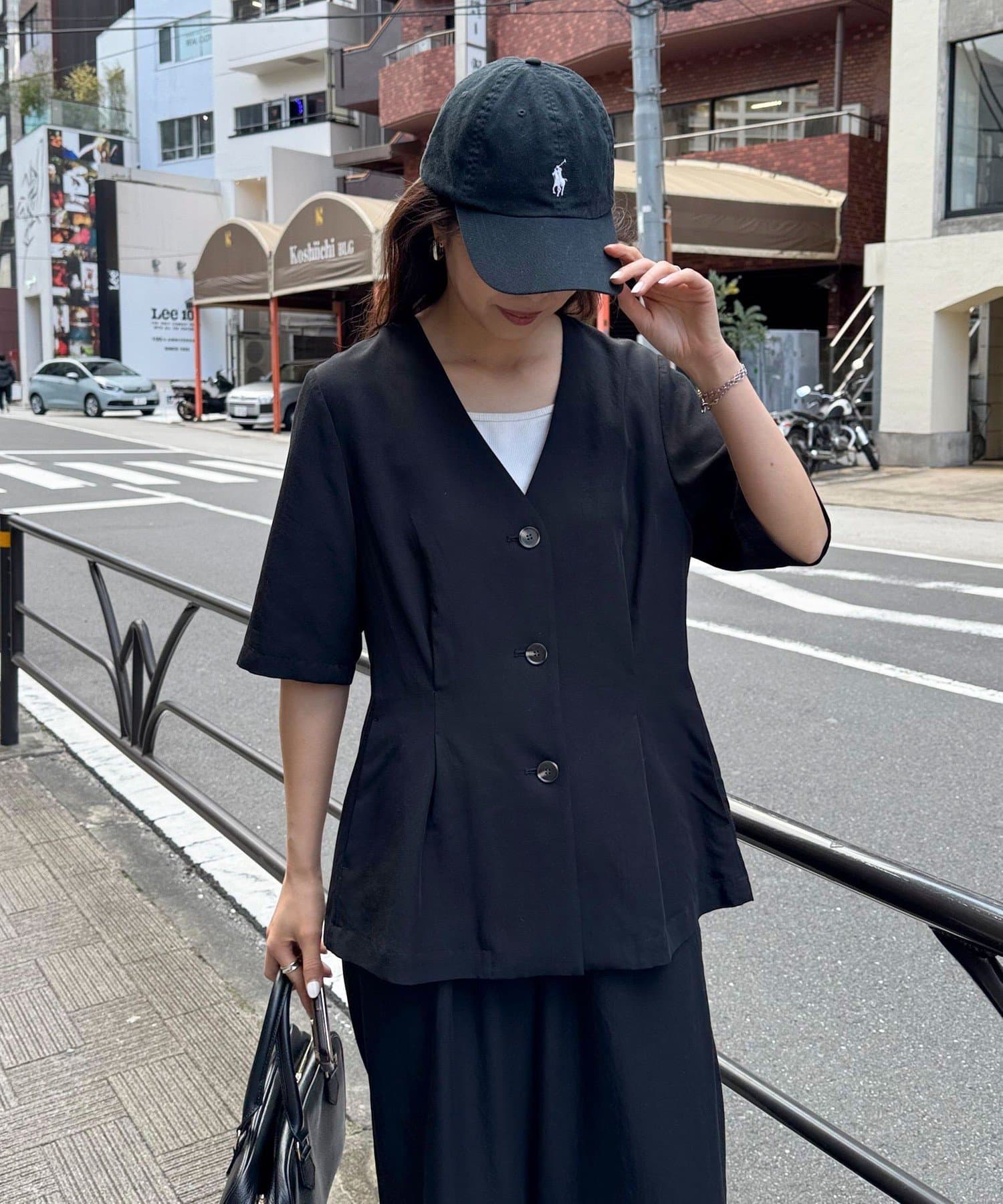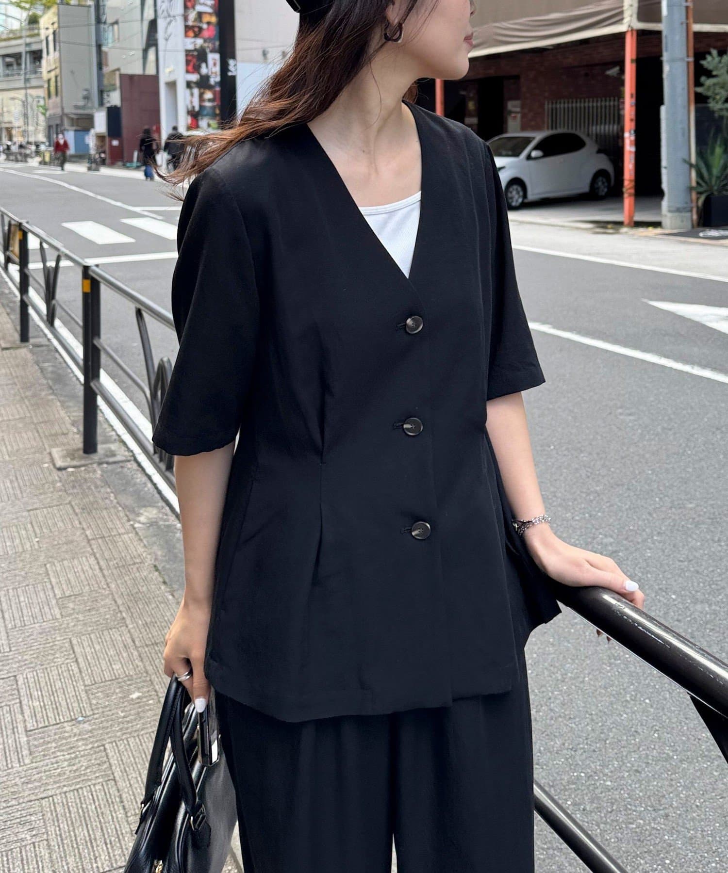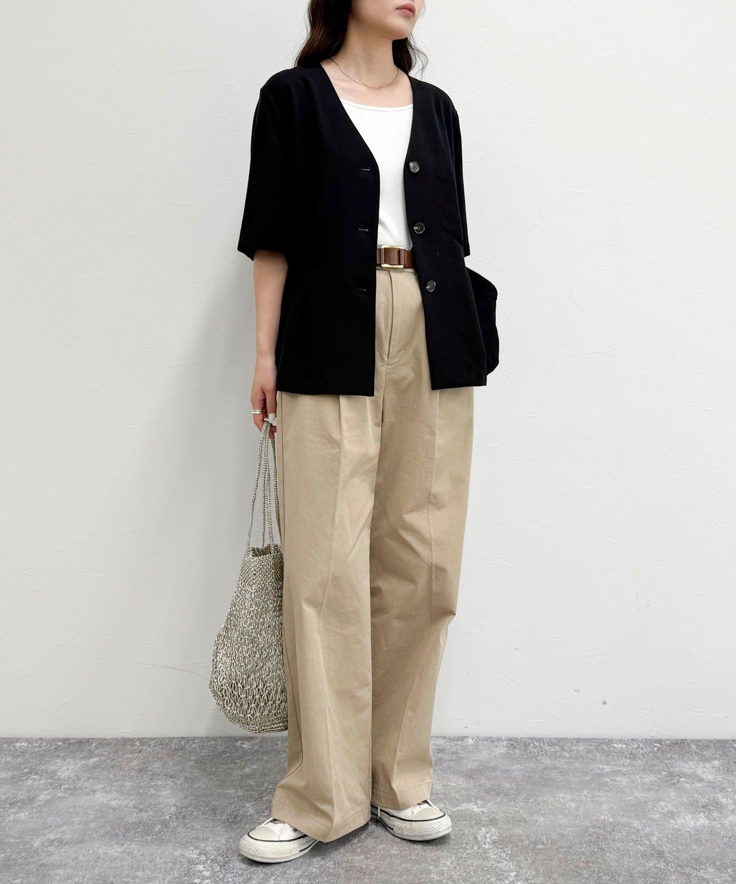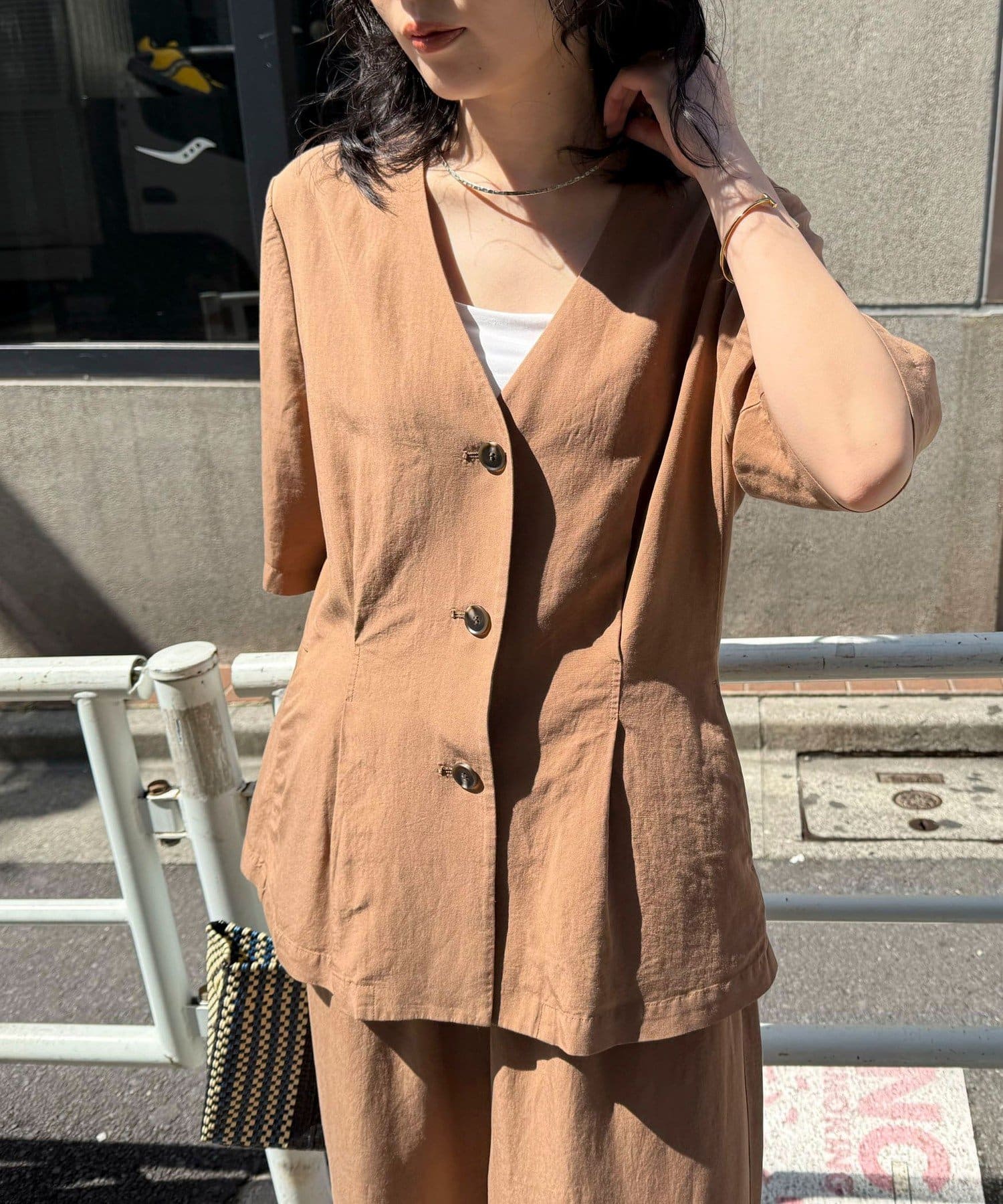 ・ノーカラーでかっちりし過ぎず、カジュアル合わせもしやすいデザインです