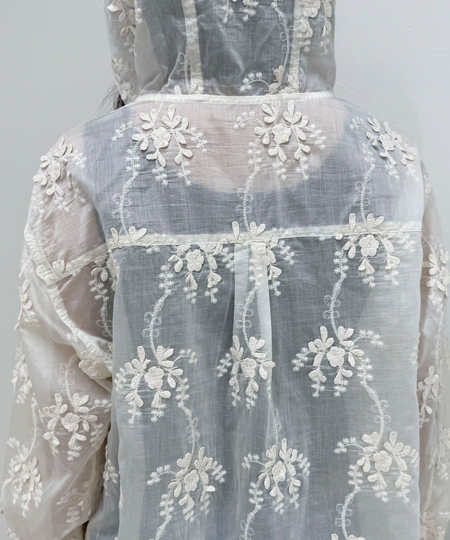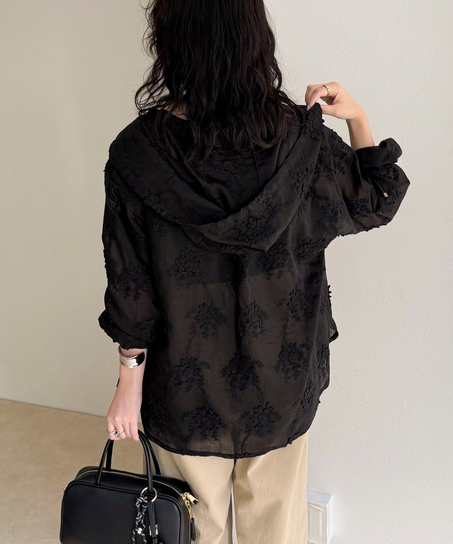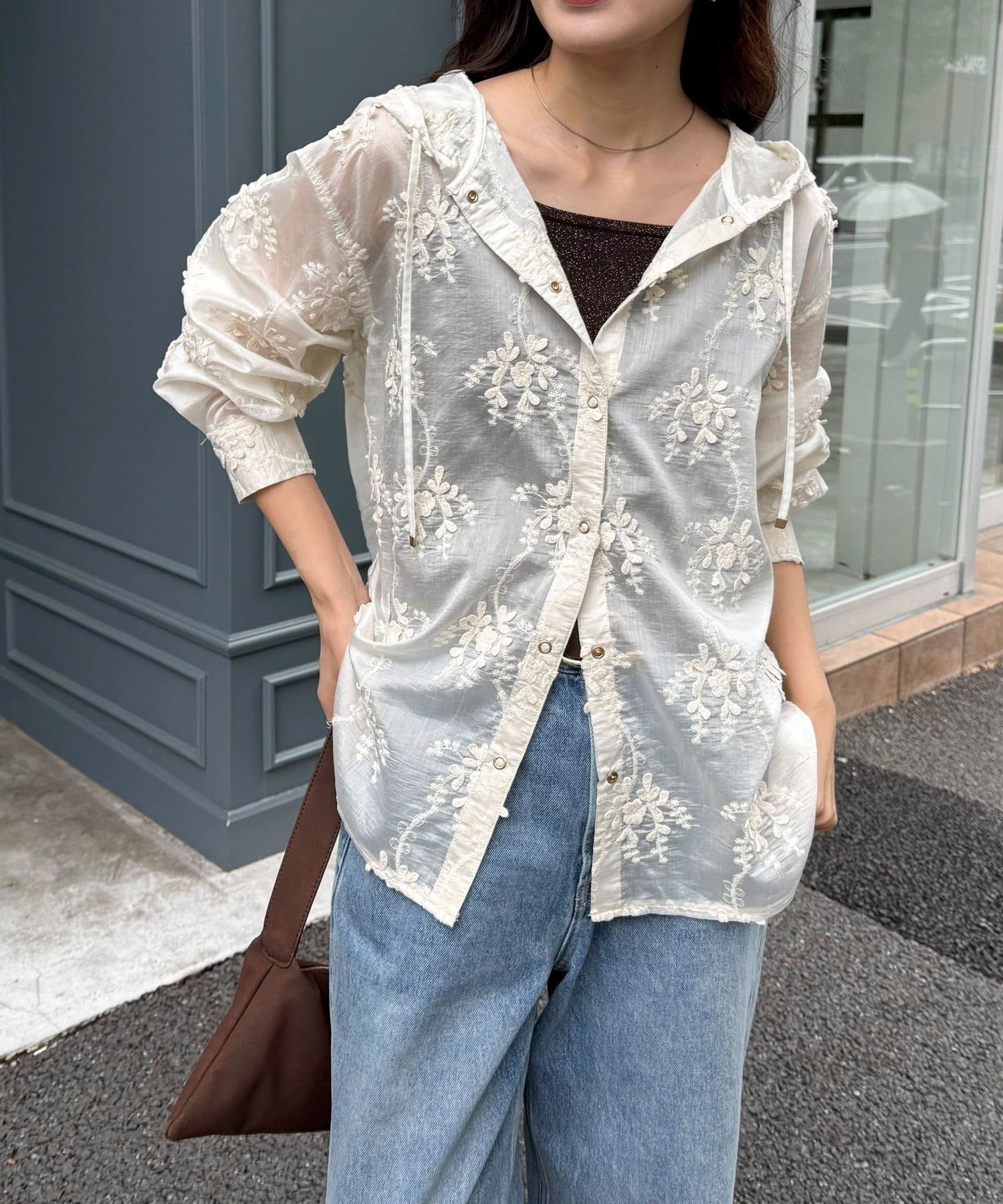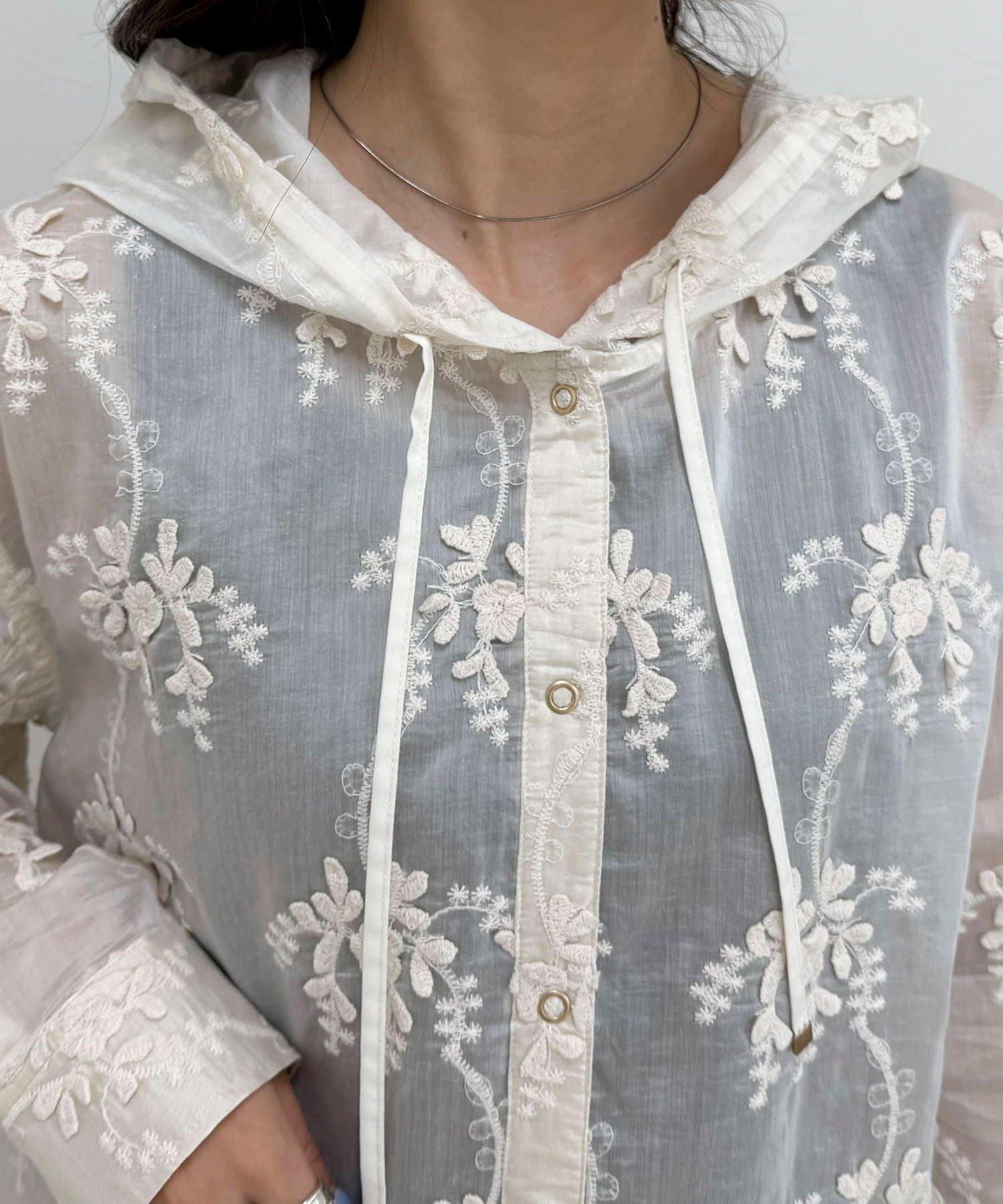 繊細な刺繍と透け感で魅せる、大人のフードシャツ