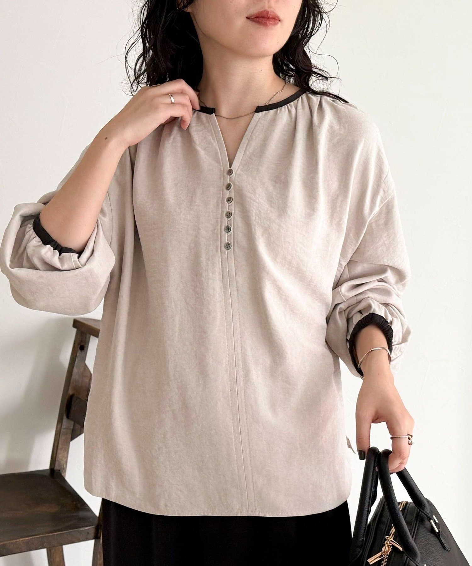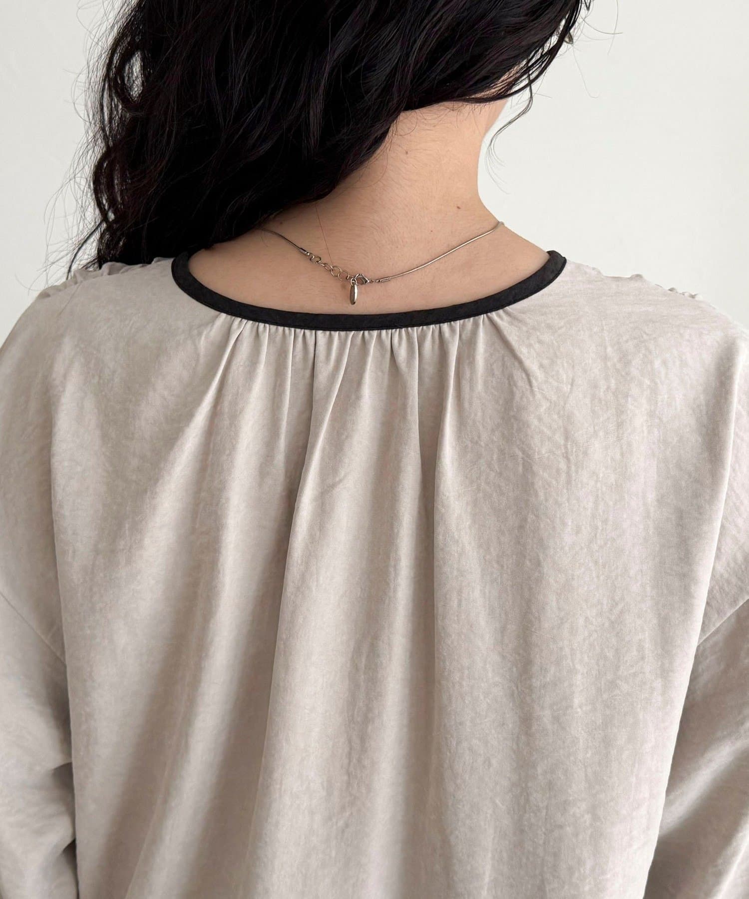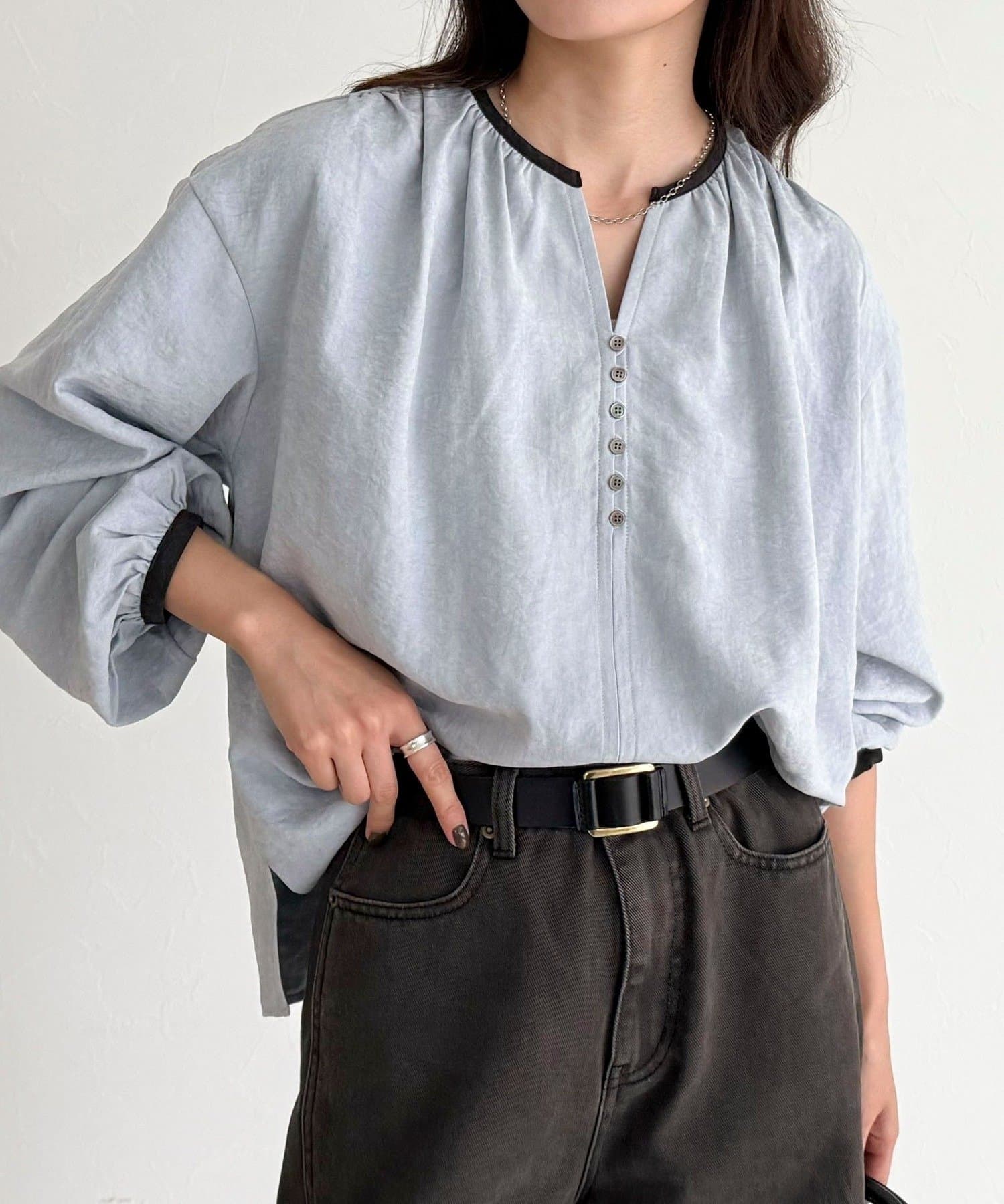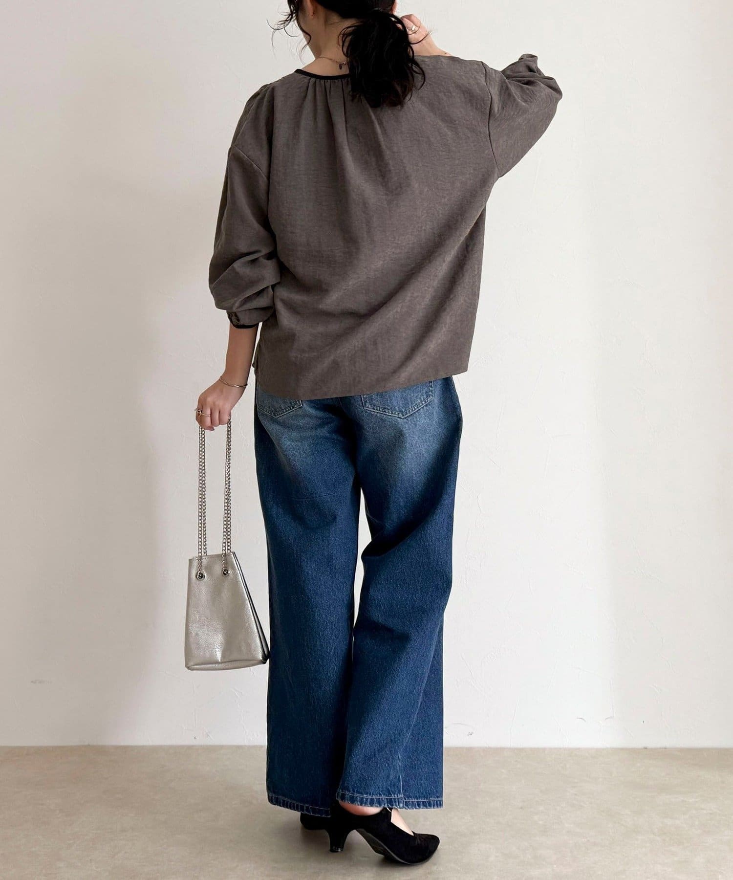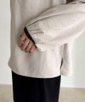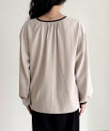 ・襟元や袖にギャザーをあしらい、女性らしいシルエットを演出