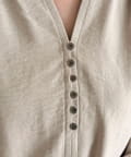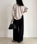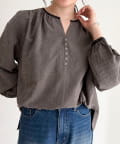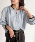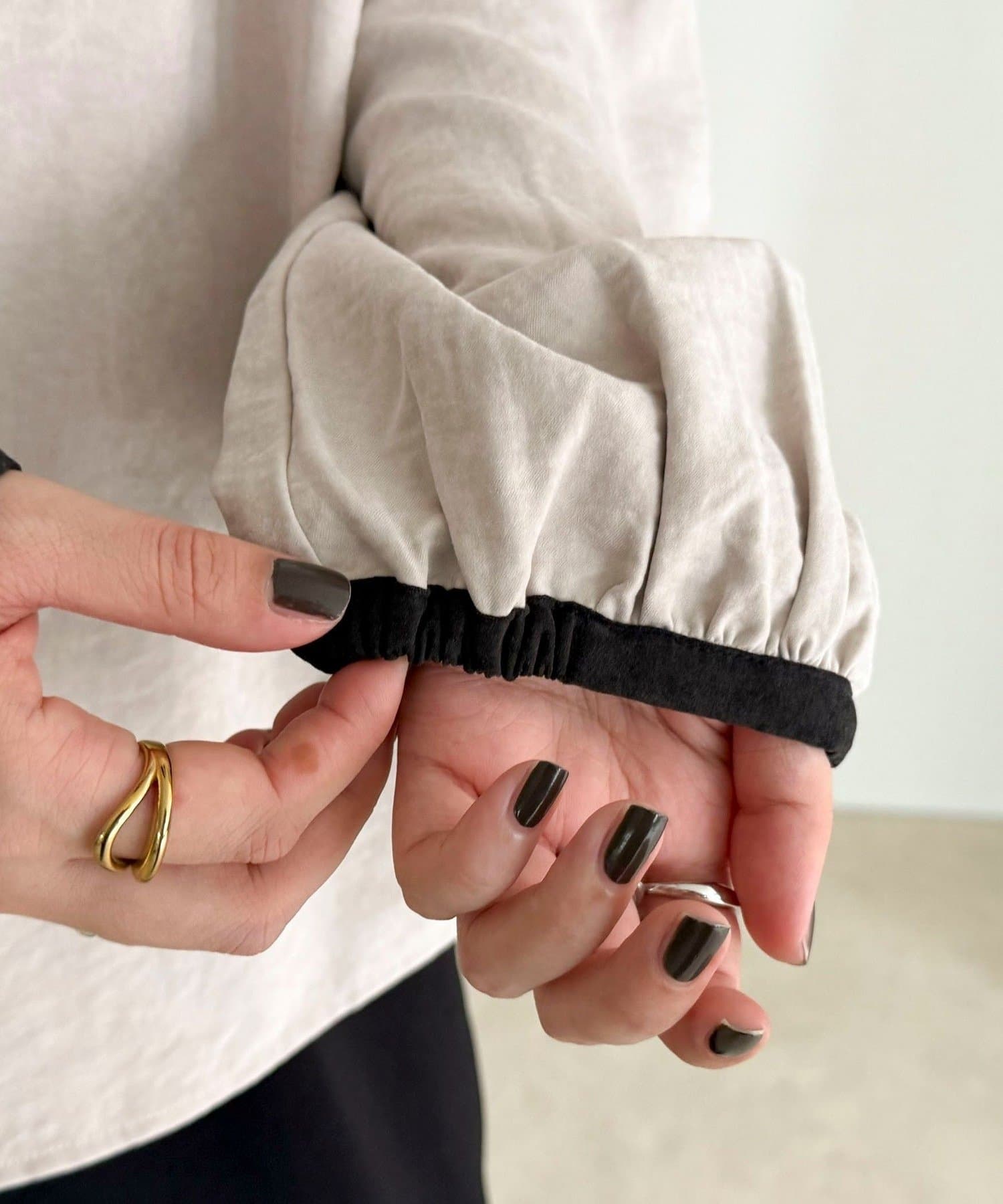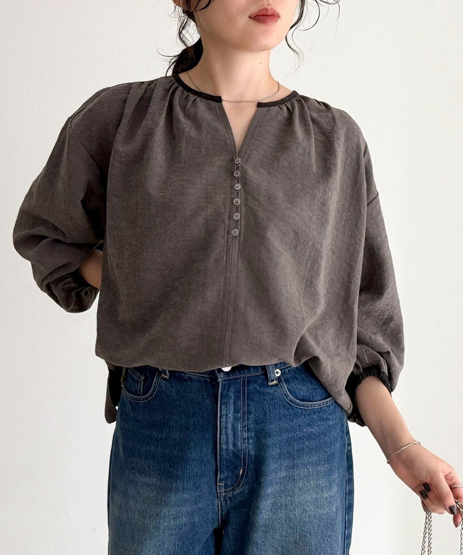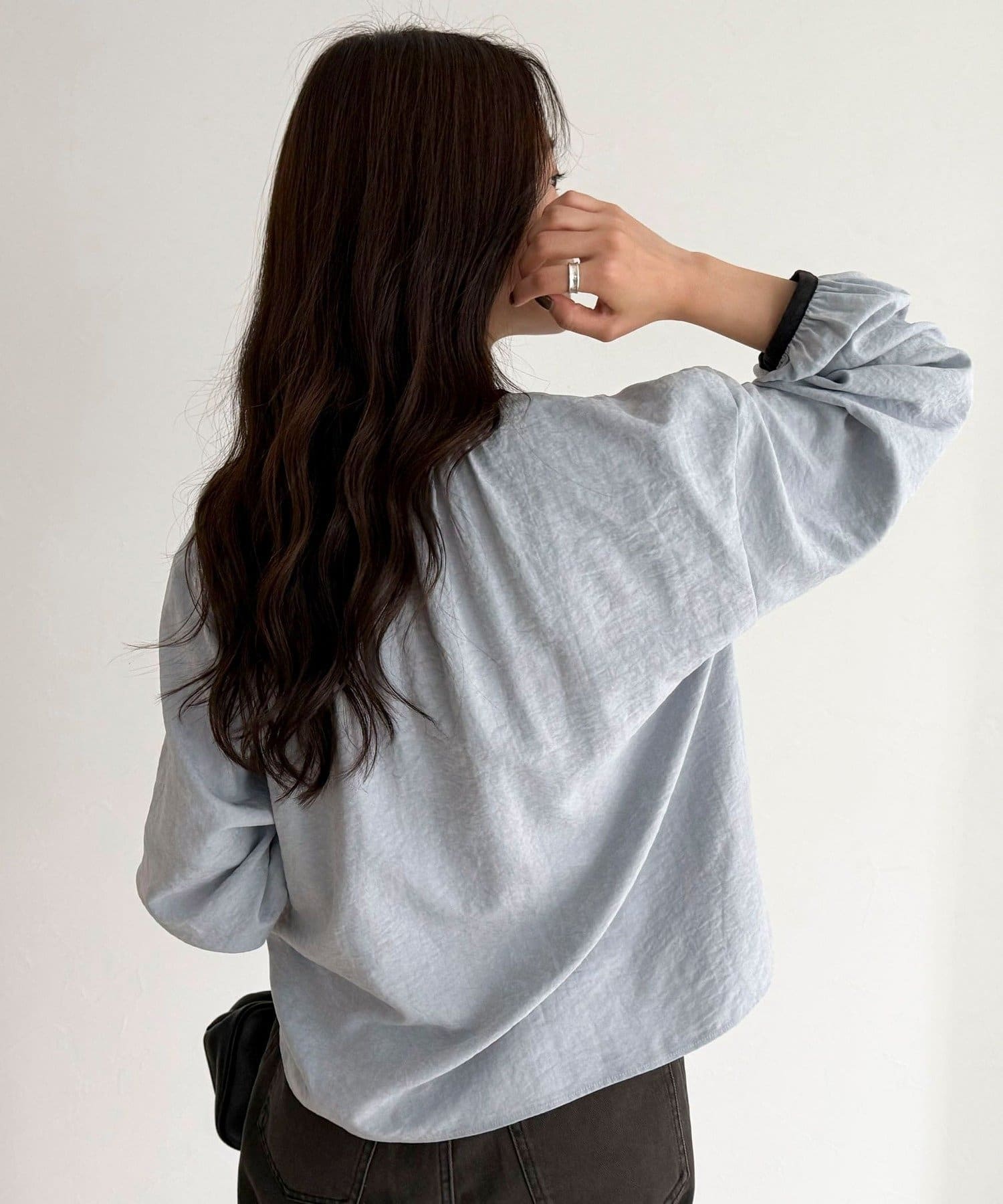 ・襟元や袖にギャザーをあしらい、女性らしいシルエットを演出