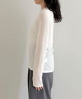 156cmスタッフ(38サイズ着用):体にほどよくフィットしますが、伸びが良く動きやすいです。袖は手首が少し隠れる長さで、インナーとしても使いやすい薄さ◎シアー感があるので、一枚で着ても重く見えず、重ね着すると程よく抜け感が出ます。