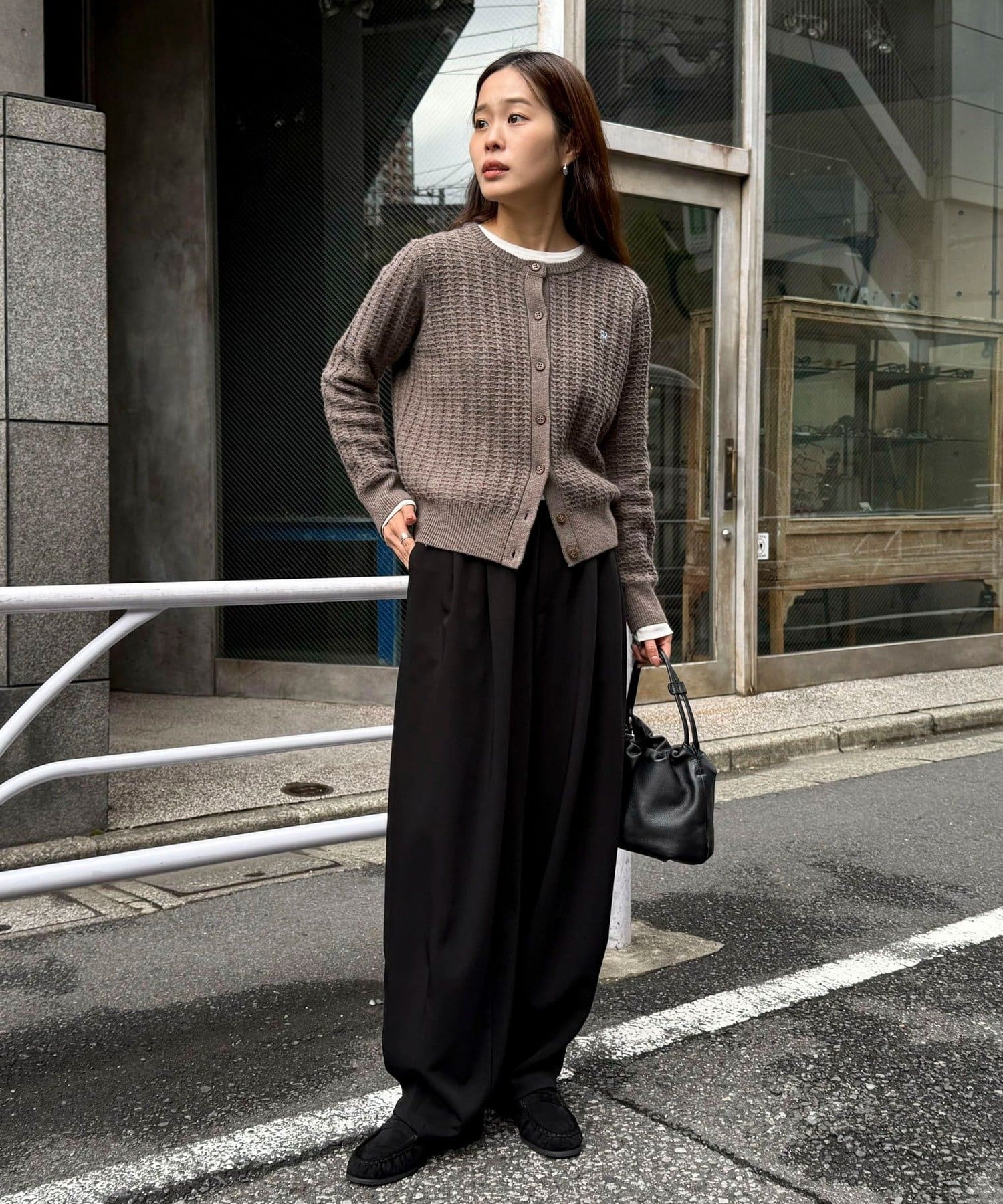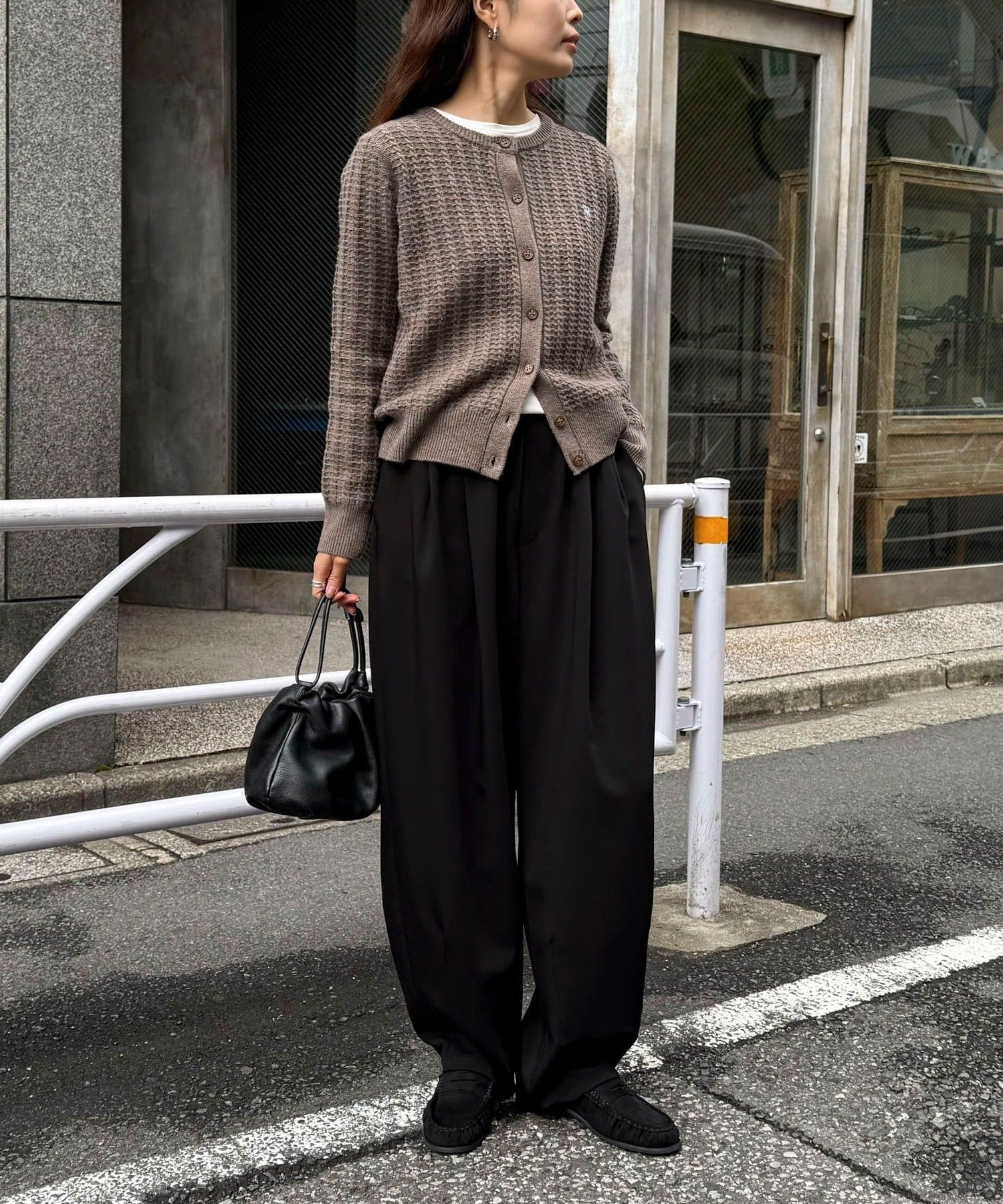 156cmスタッフ(38サイズ着用):ヒップに軽くかかる丈感でバランスよく着られました。前を閉じてプルオーバー風にも、羽織りとしても使えるので着回し力が高いです!