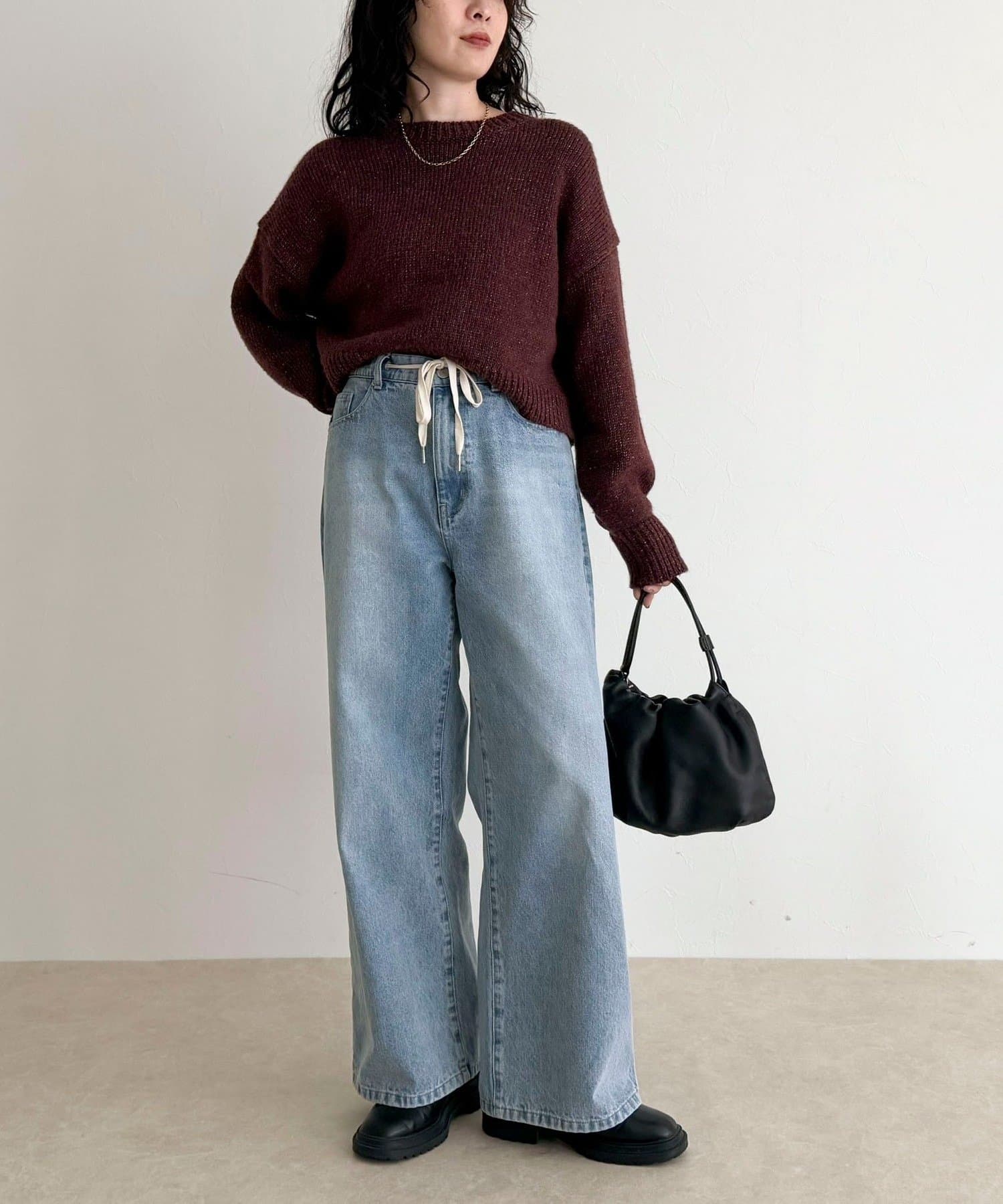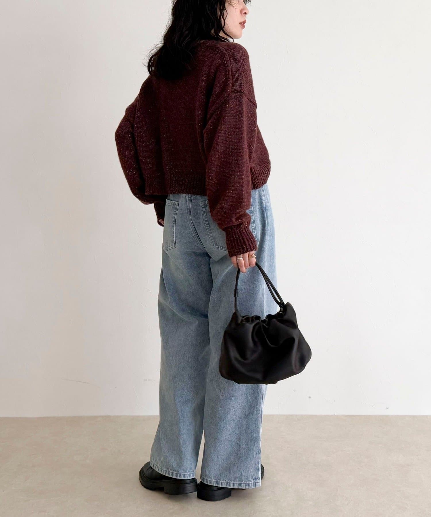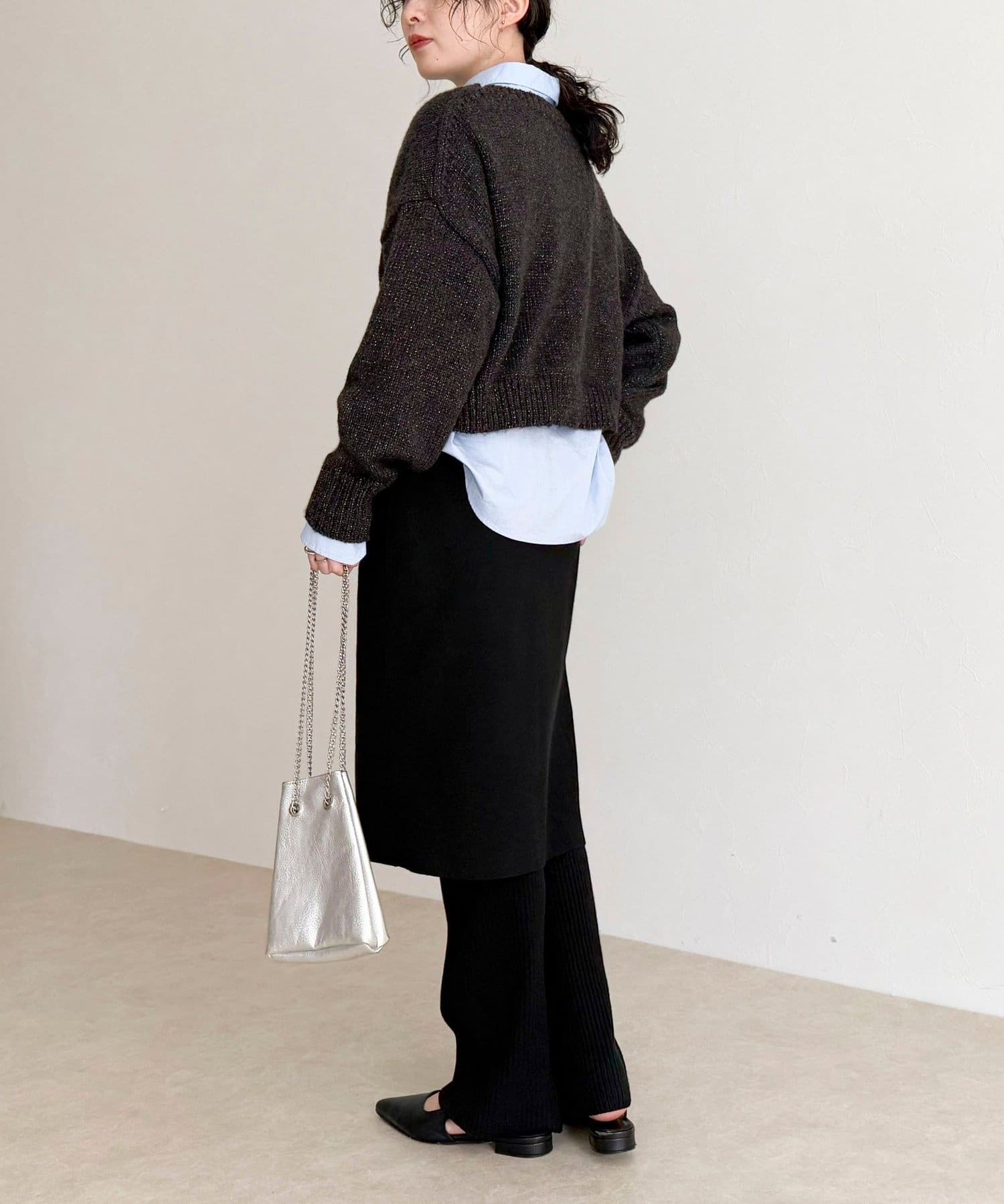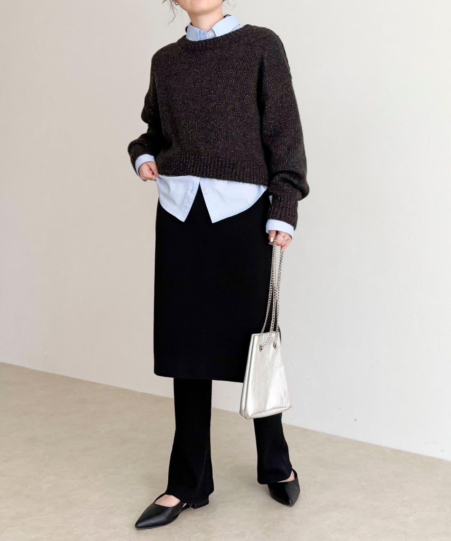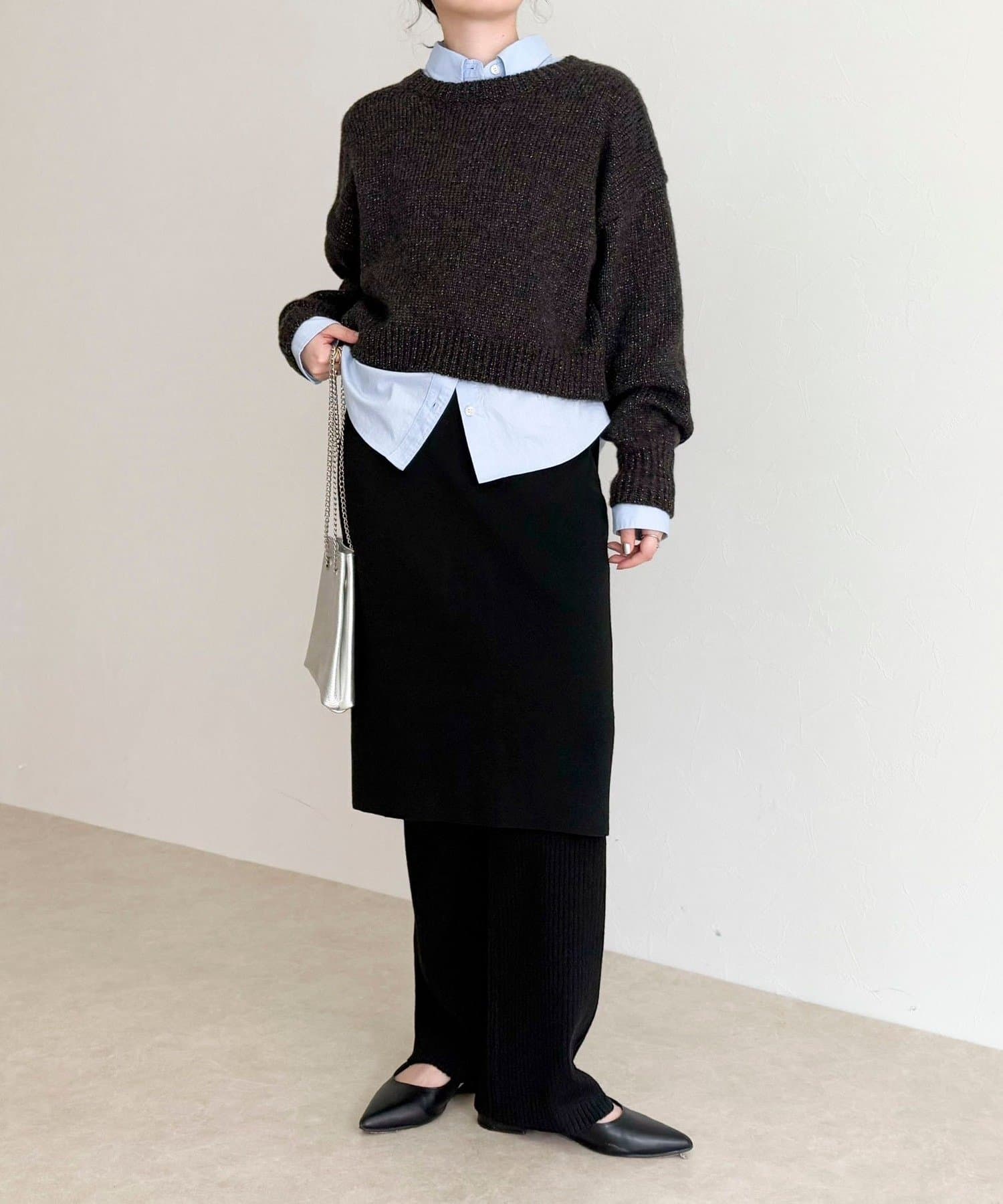 156cmスタッフ(38サイズ着用):短め丈ですがハイウエストボトムと合わせると腰回りがすっきり見えました!ラメ感は程よいキラキラで派手すぎず、日常使いしやすい印象です◎