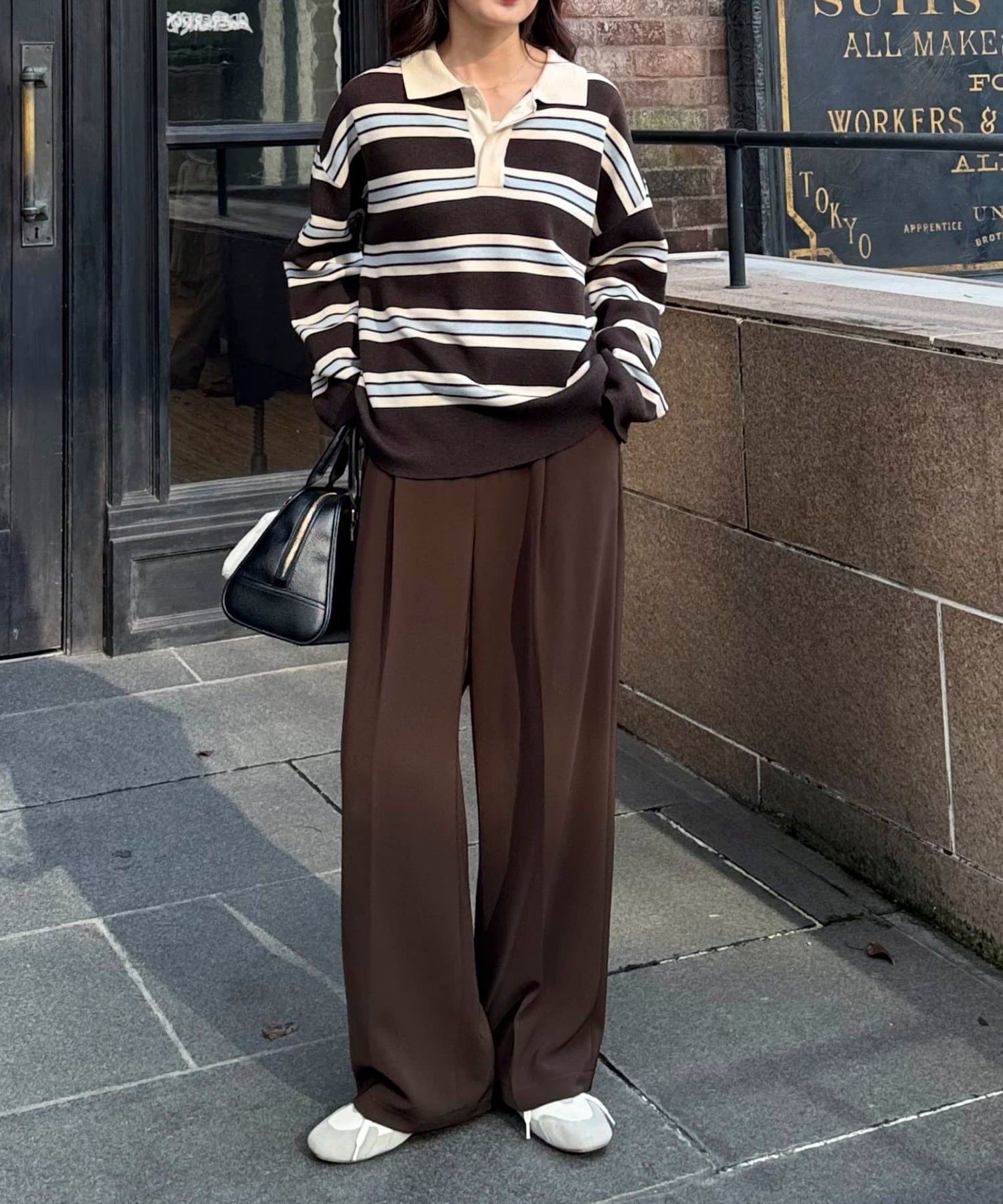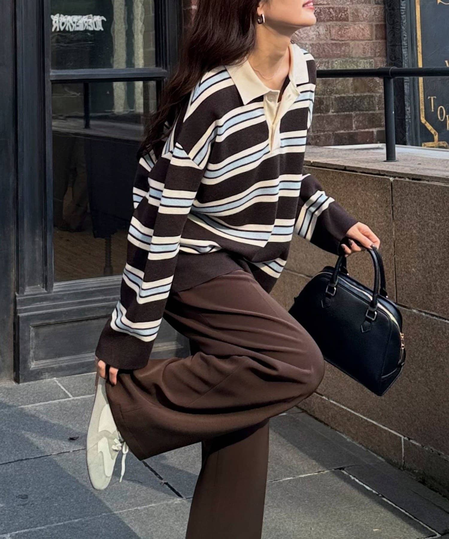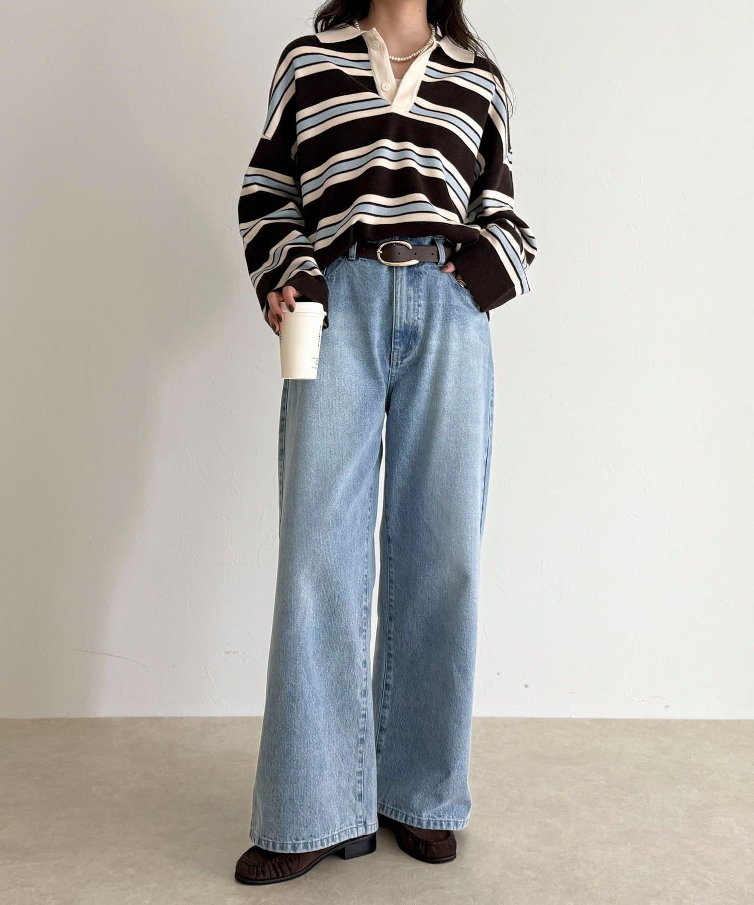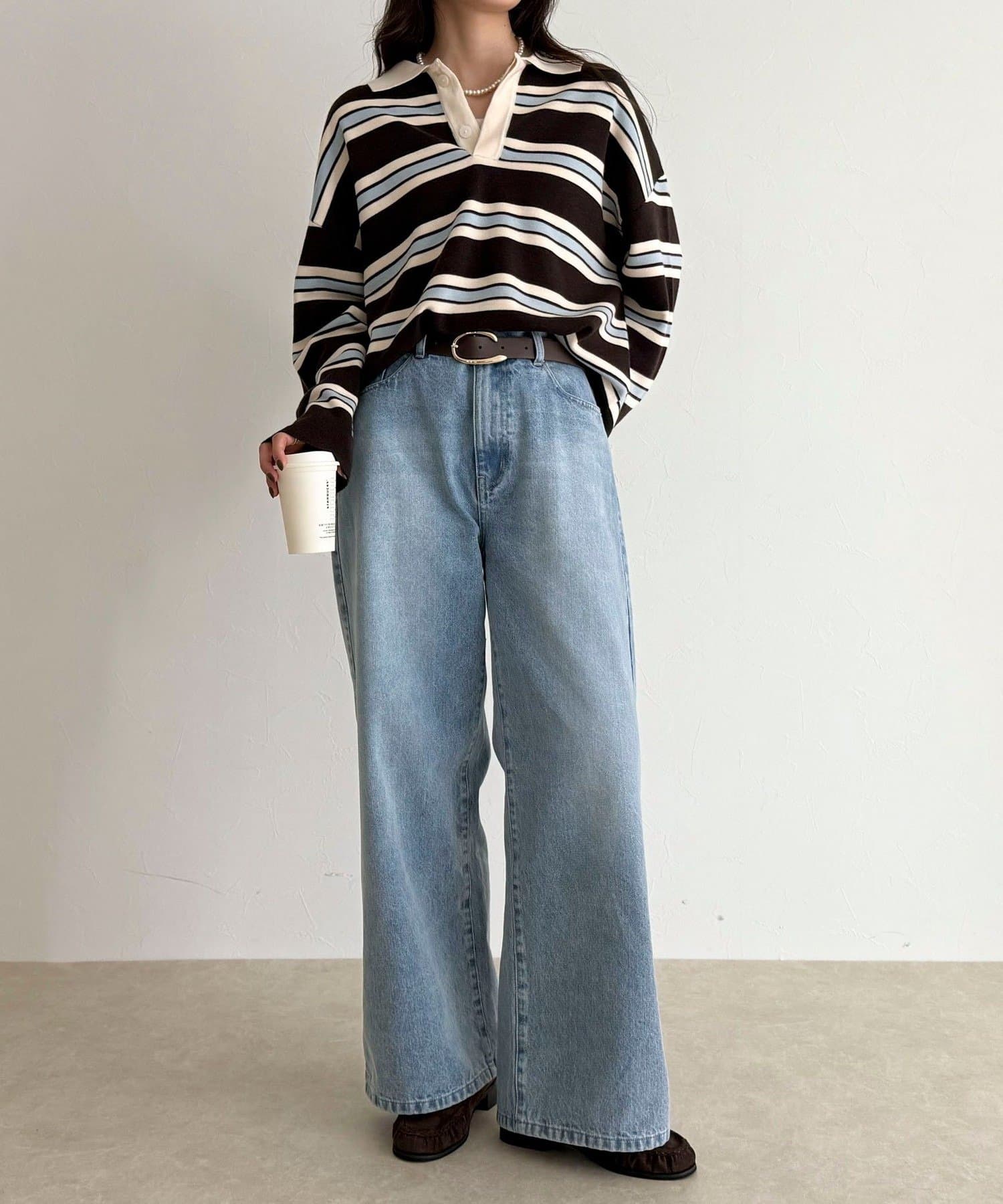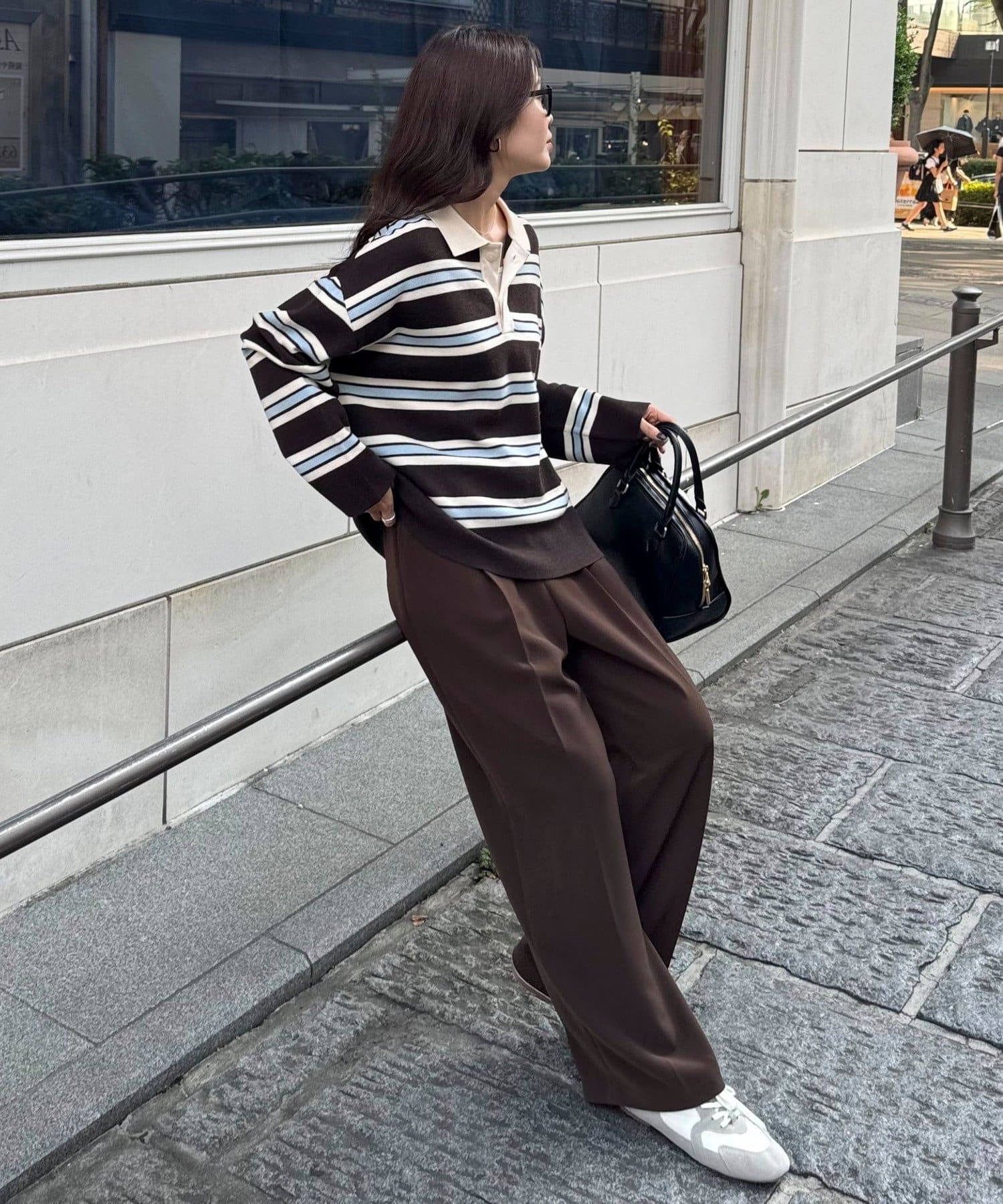 ・ 身長156cm/38サイズ着用:ゆったりとしたオーバーサイズで肩や腕まわりに余裕があり、動きやすいです。ボーダーがアクセントになり、1枚でもおしゃれに決まりました!