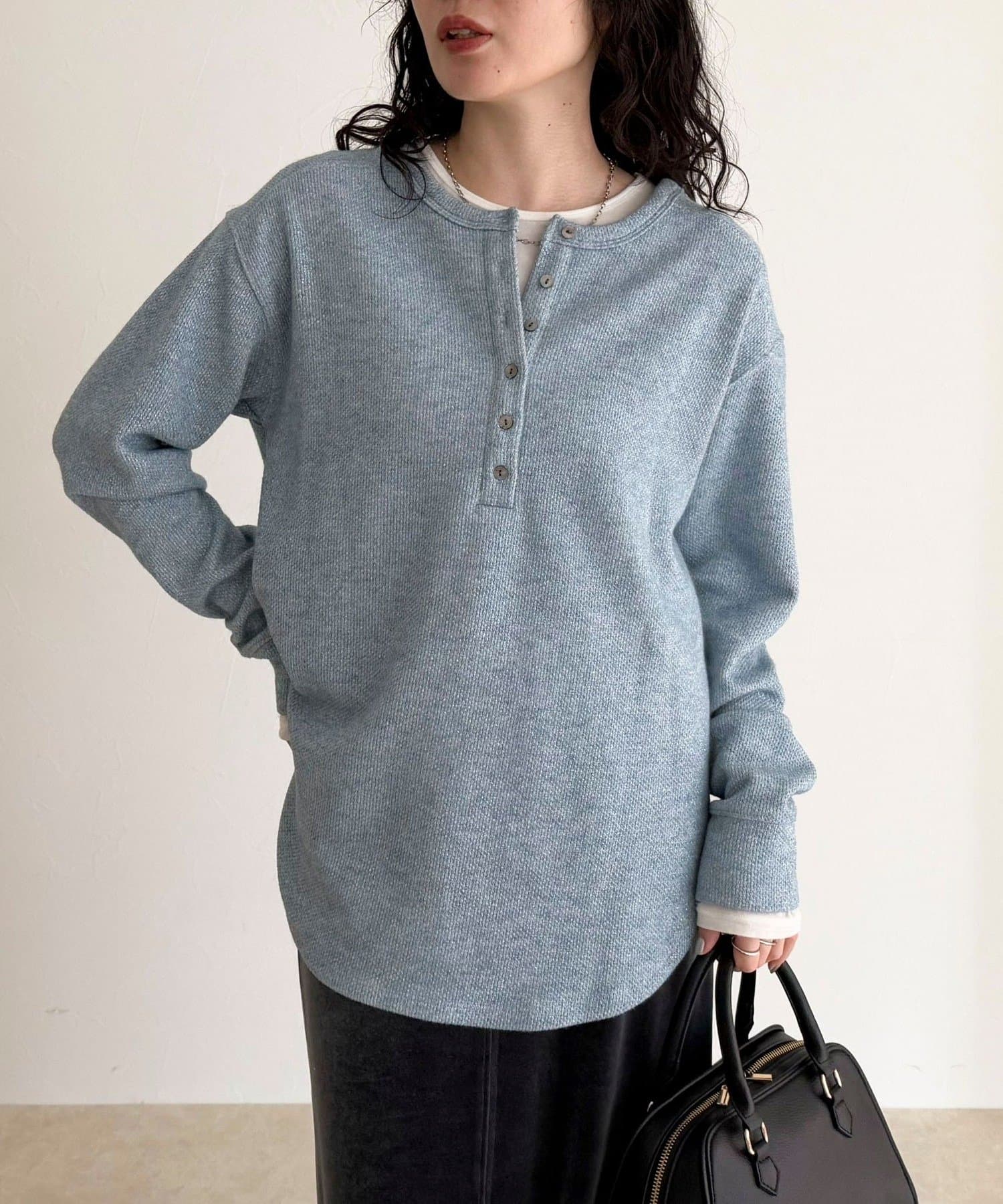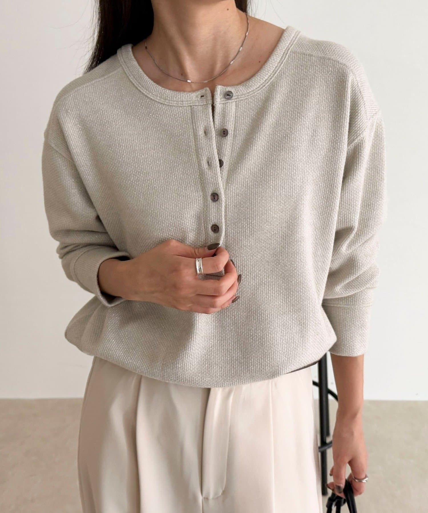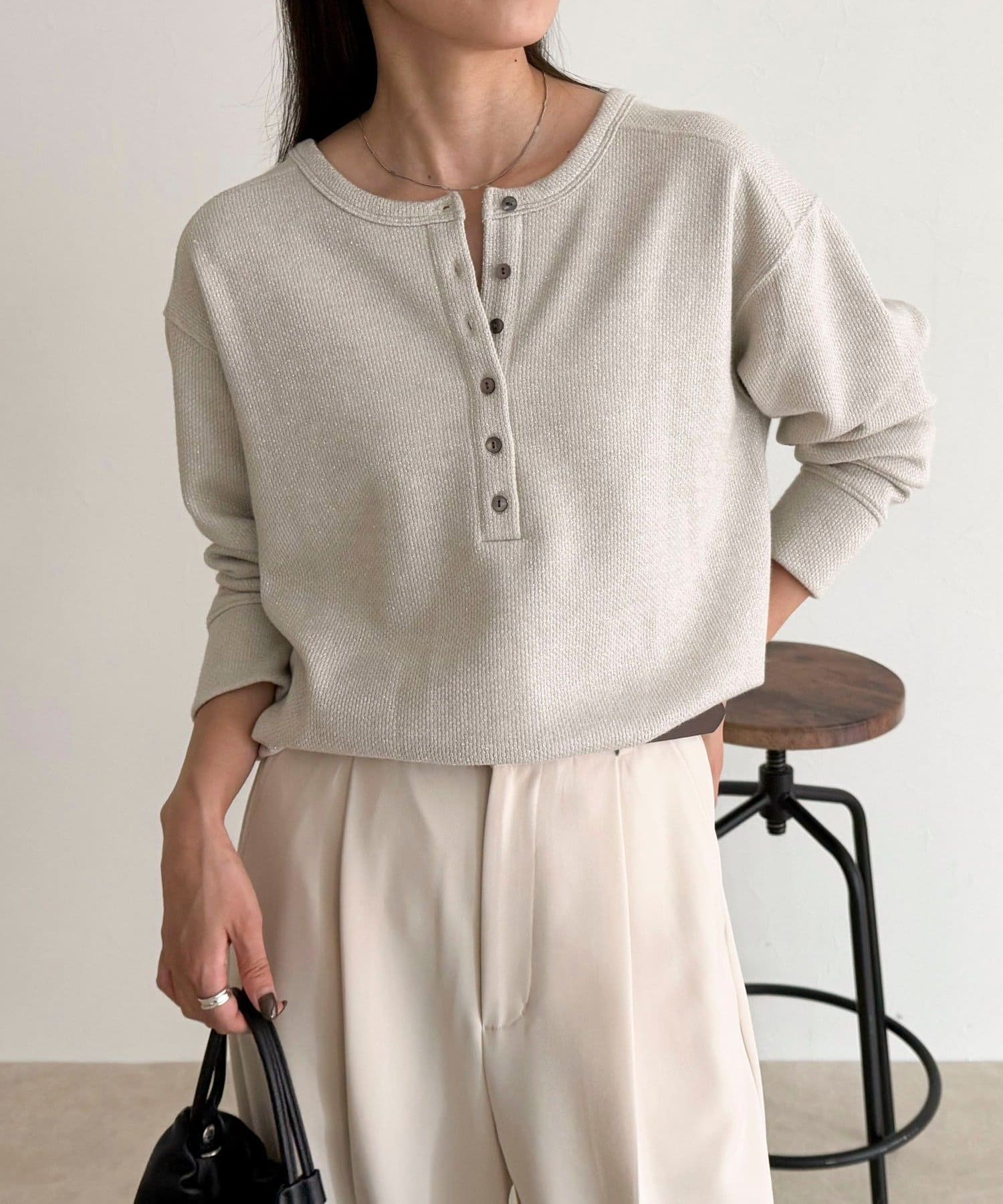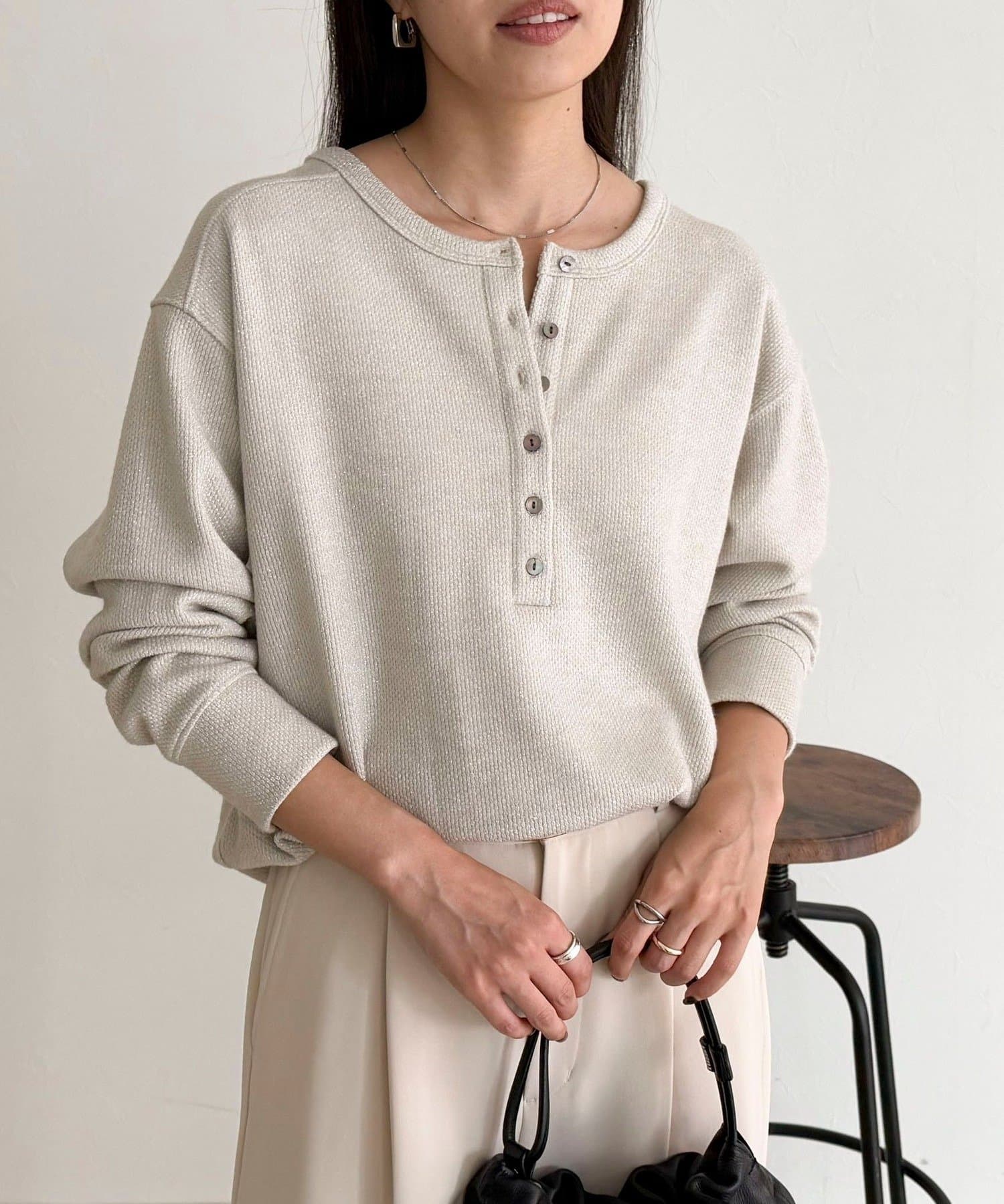 ・細かなラメが上品に輝くヘンリーネックプルオーバー