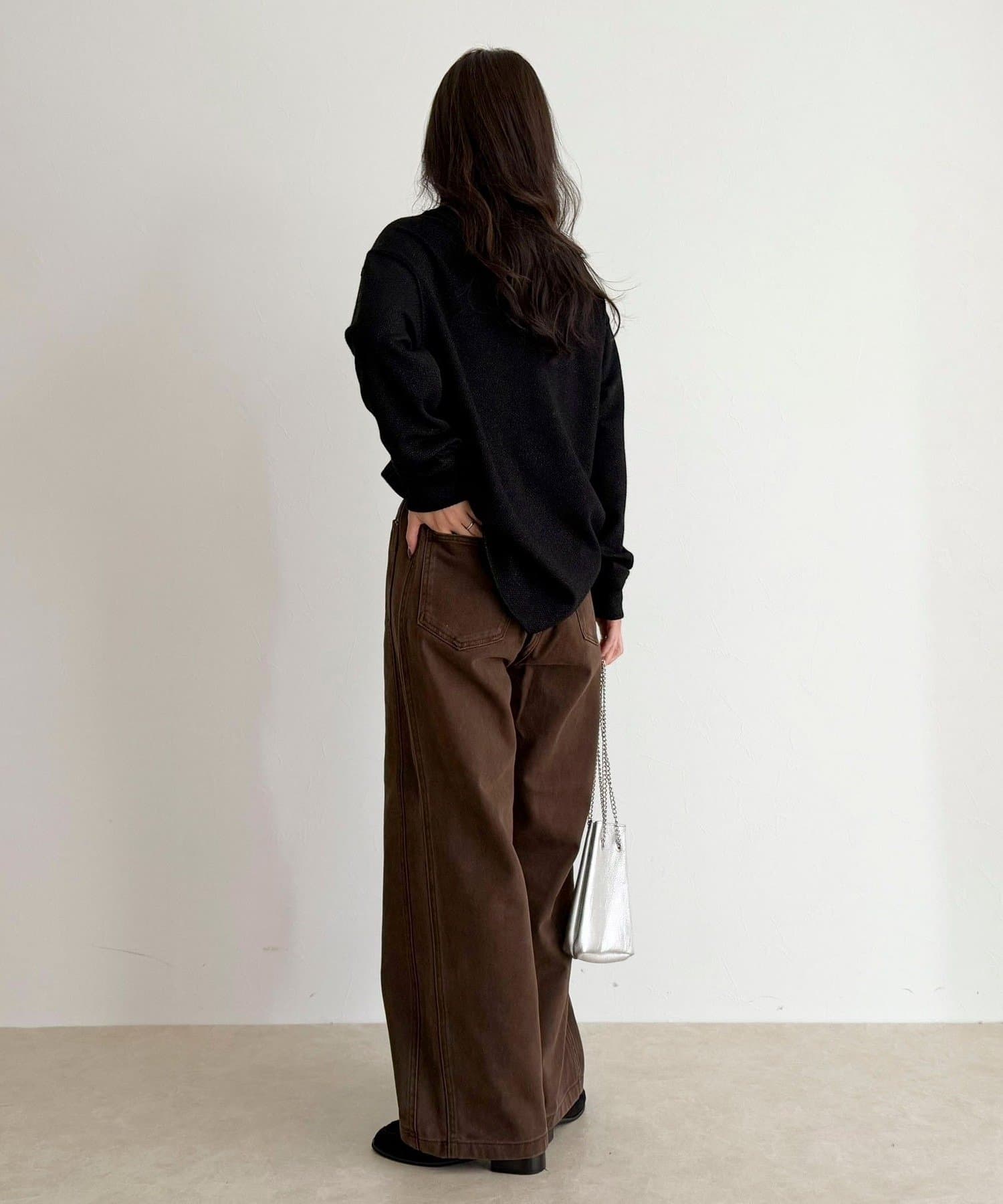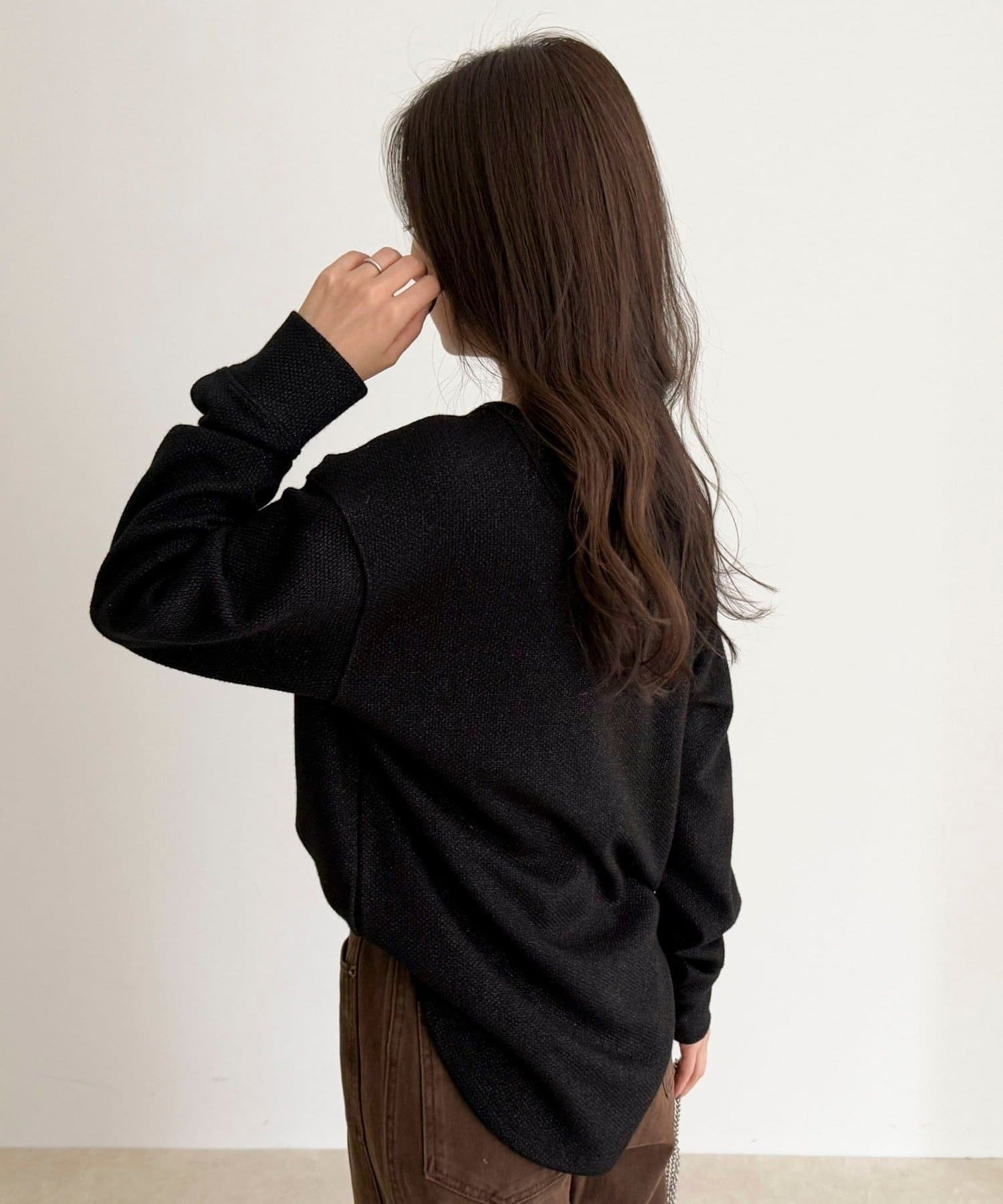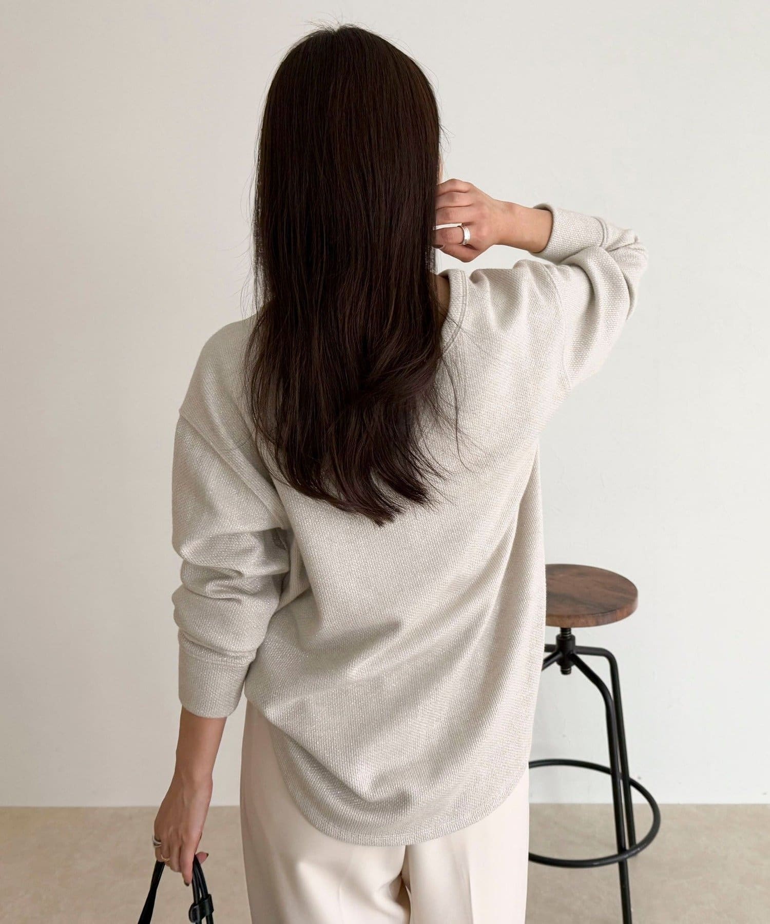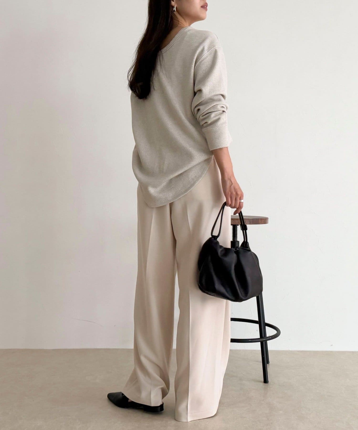 156cmスタッフ(38サイズ着用):ラメがさりげなく華やかさをプラスしてくれるので、シンプルボトムに合わせてもオシャレ見えしました!前後2WAYで着られるので、その日の気分で着こなしを変えられるのも嬉しいポイントです◎