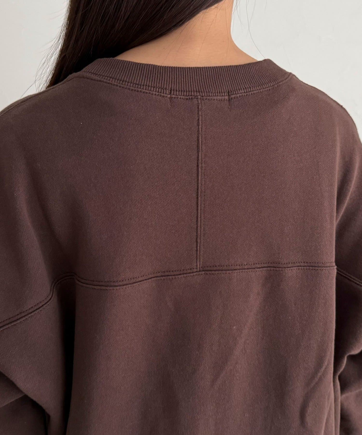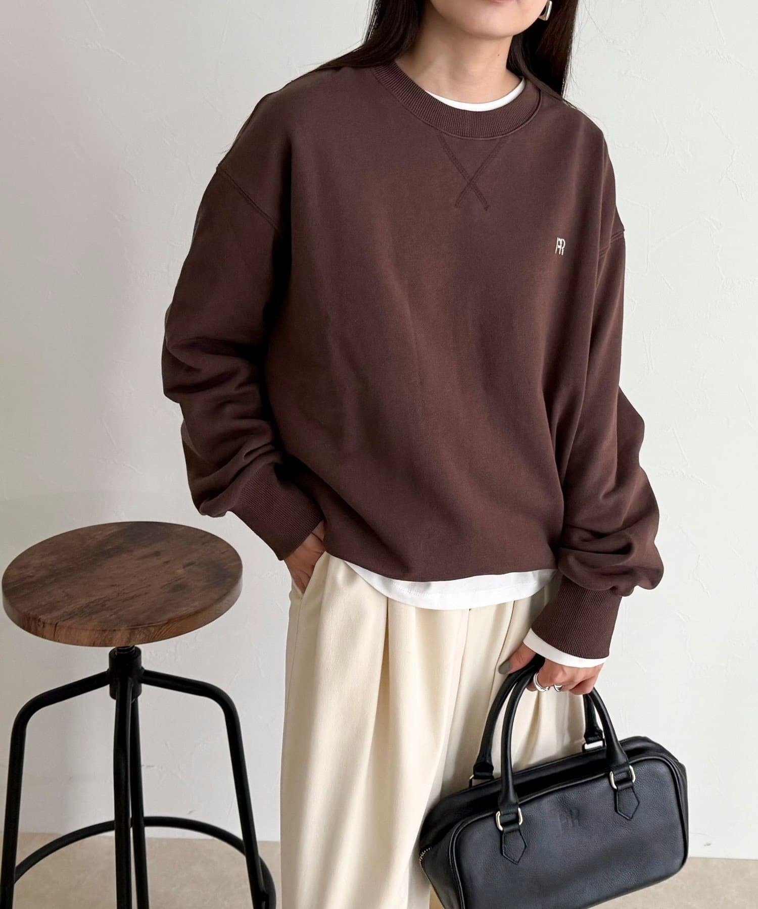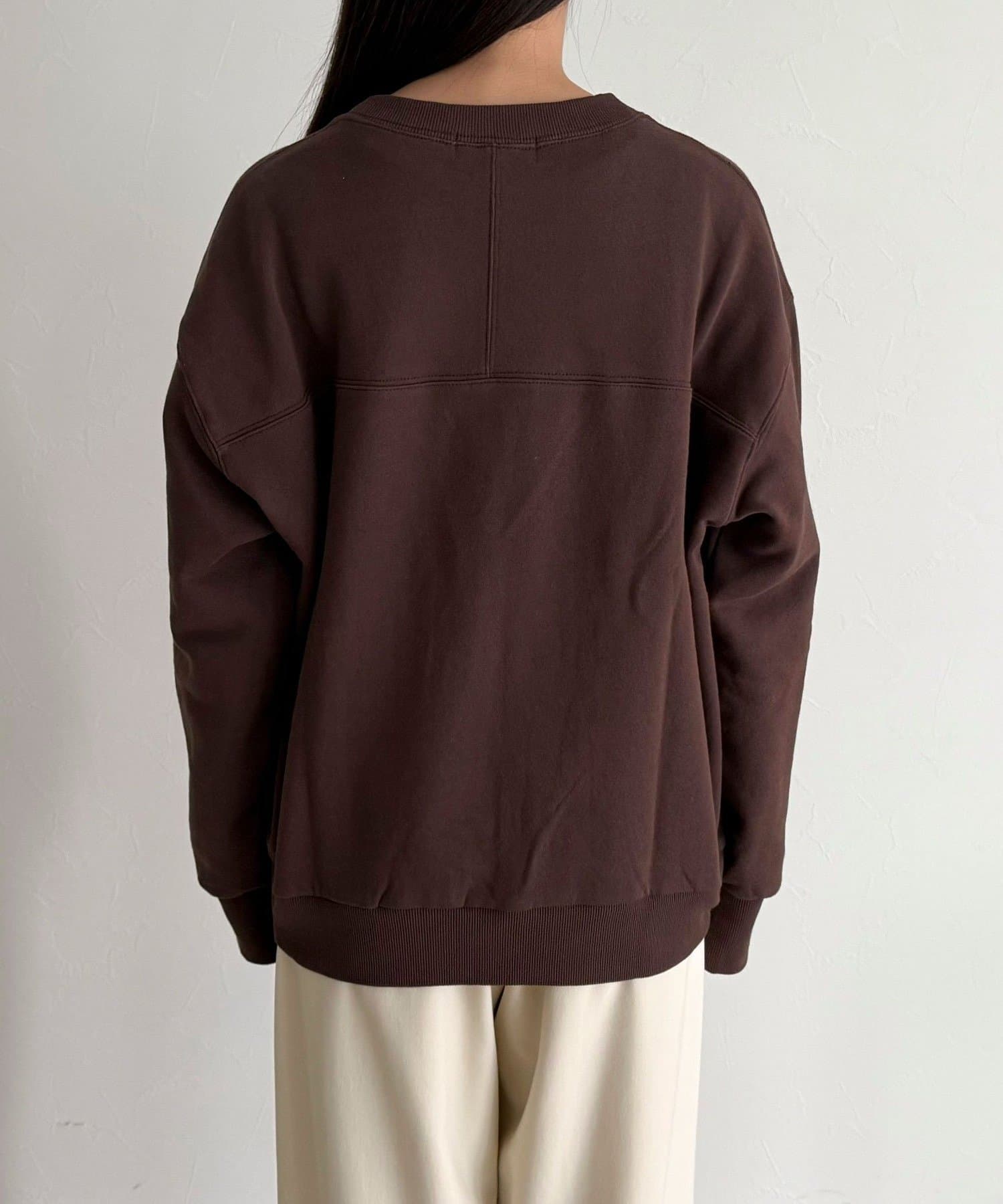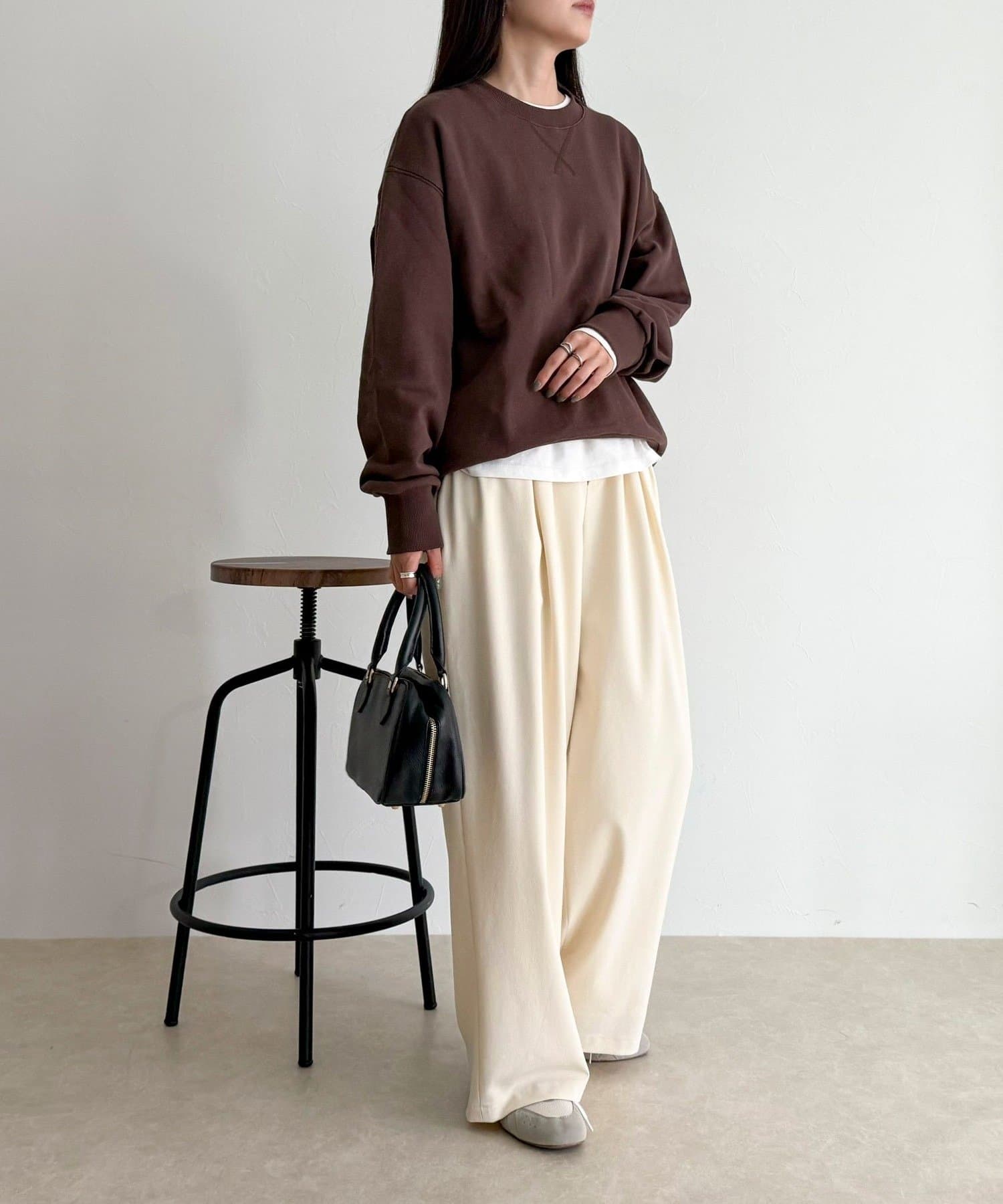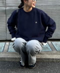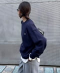 156cmスタッフ(38サイズ着用):程よくゆとりのあるサイズ感で、リラックスして着られます!ドロップショルダーのラインが女性らしく、スウェットでもラフになりすぎない印象になってくれます◎