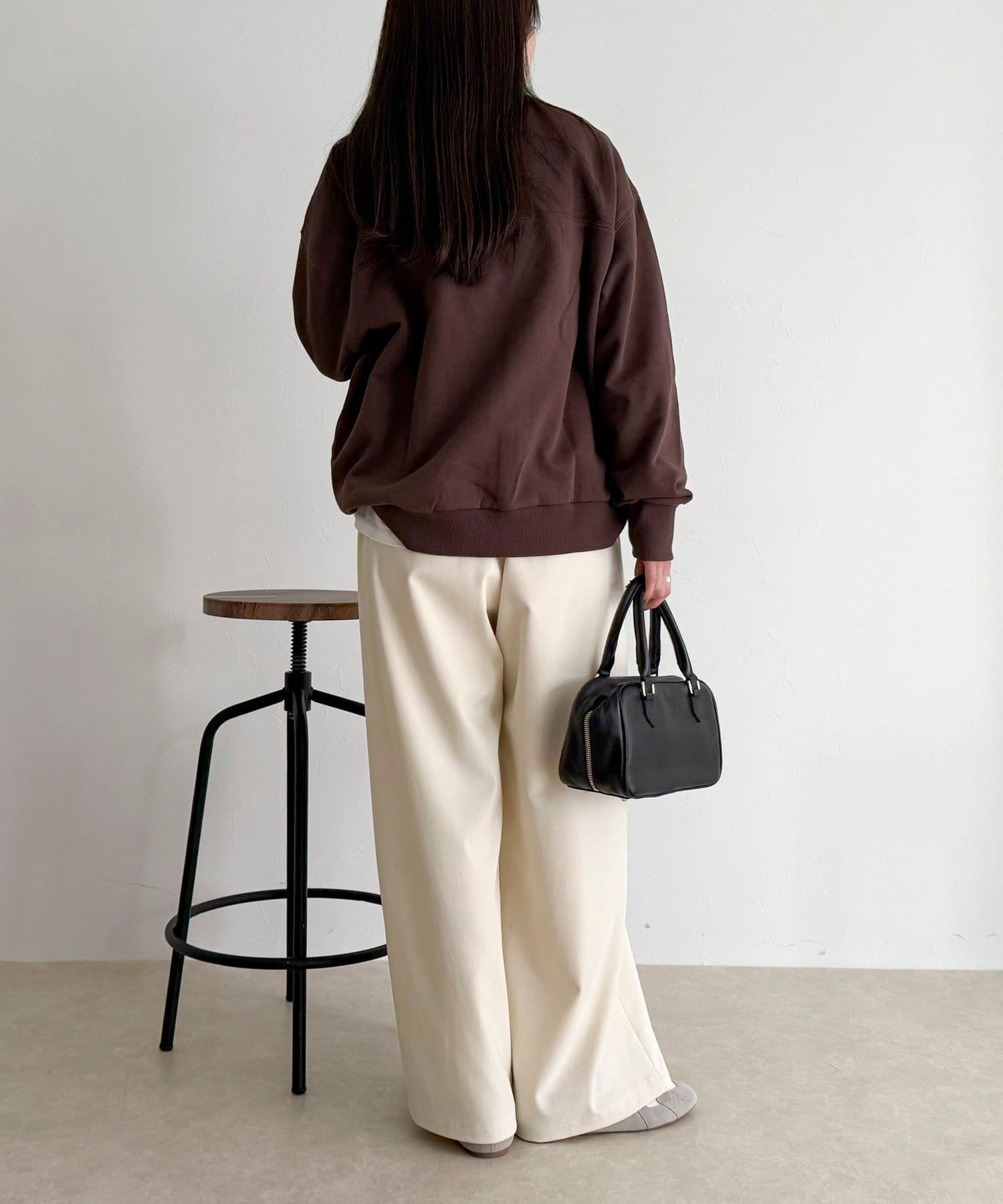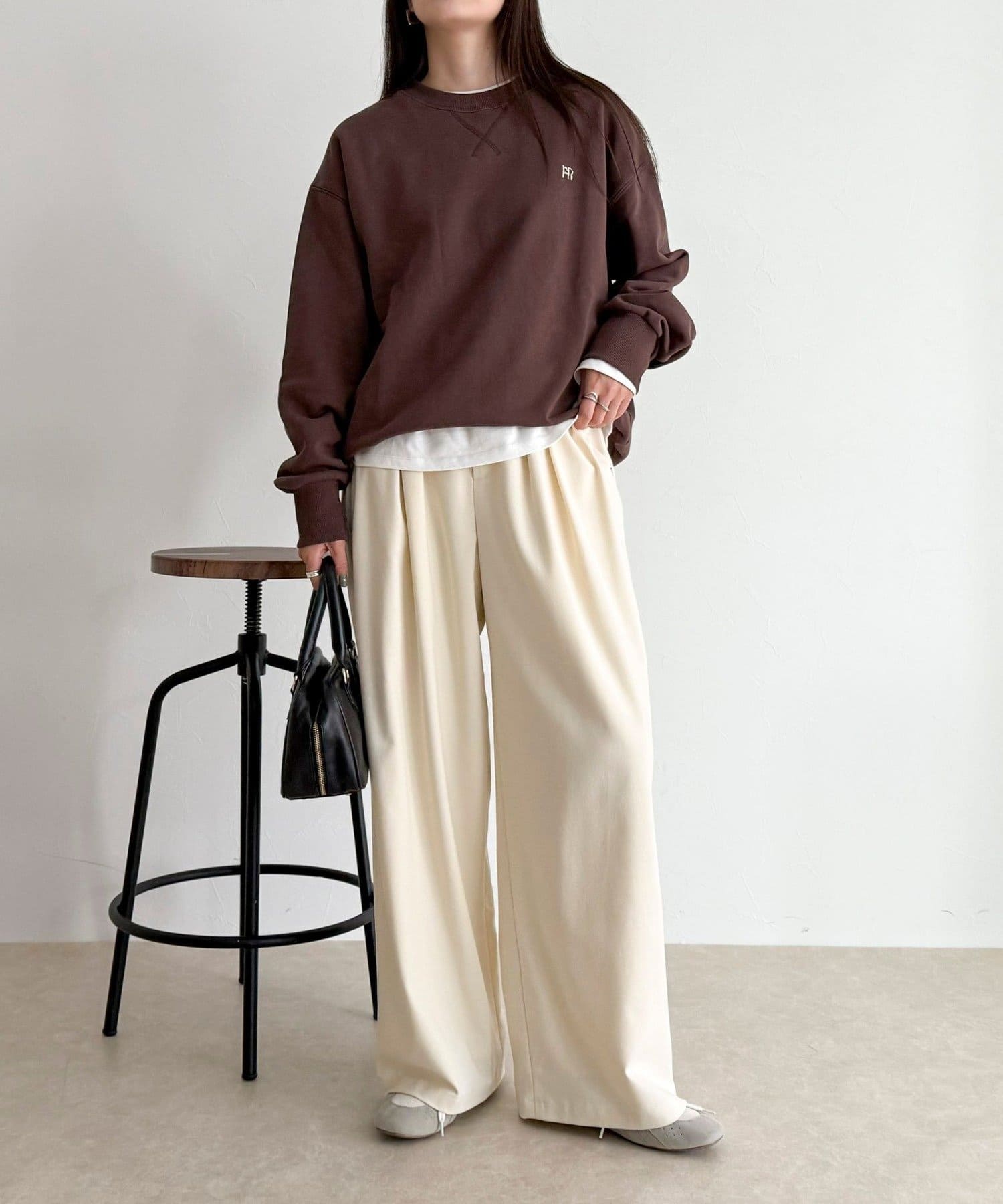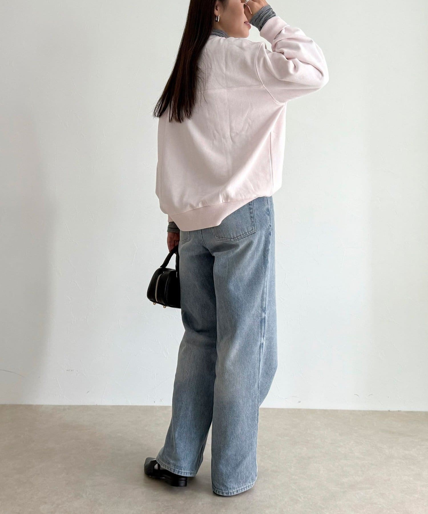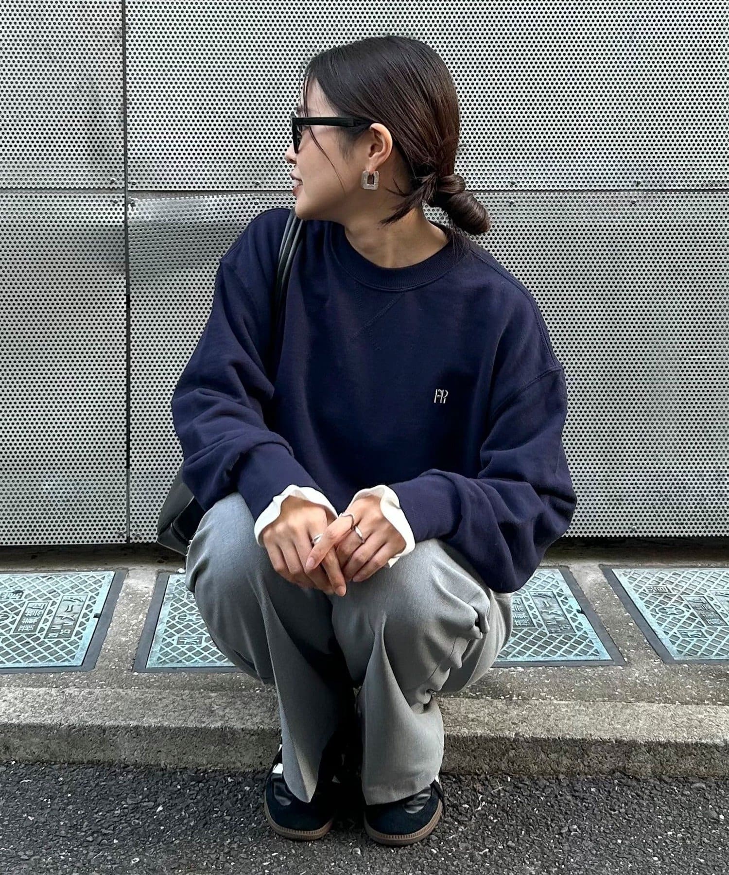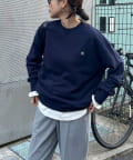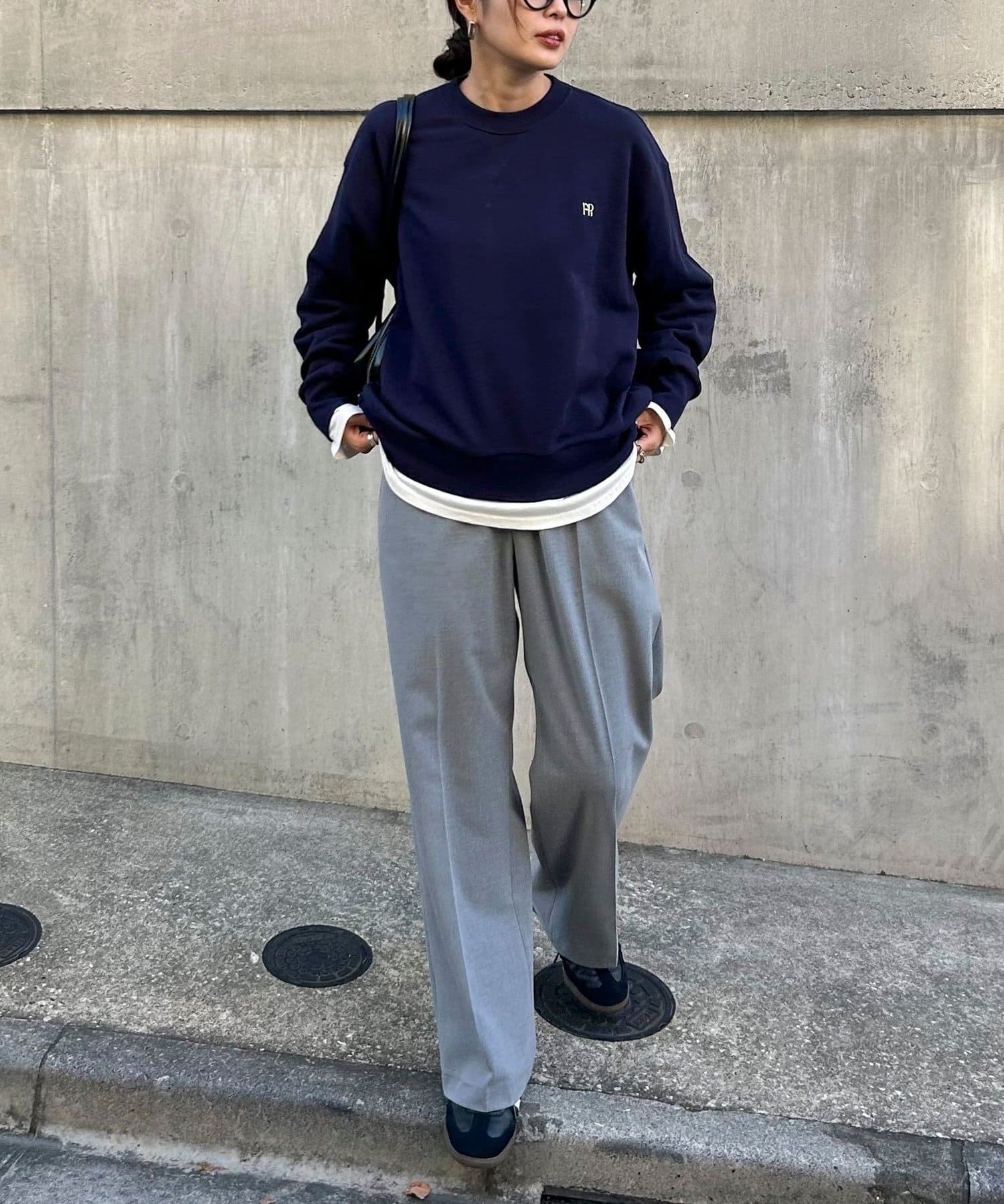 156cmスタッフ(38サイズ着用):程よくゆとりのあるサイズ感で、リラックスして着られます!ドロップショルダーのラインが女性らしく、スウェットでもラフになりすぎない印象になってくれます◎