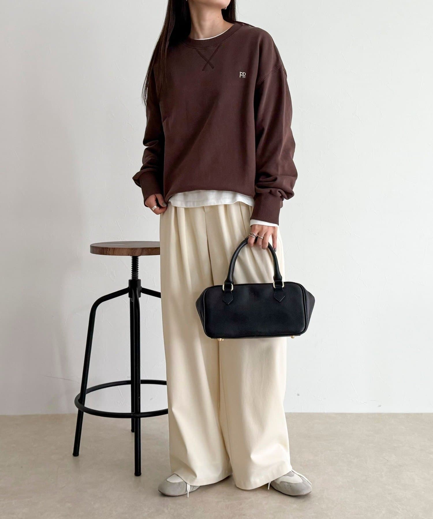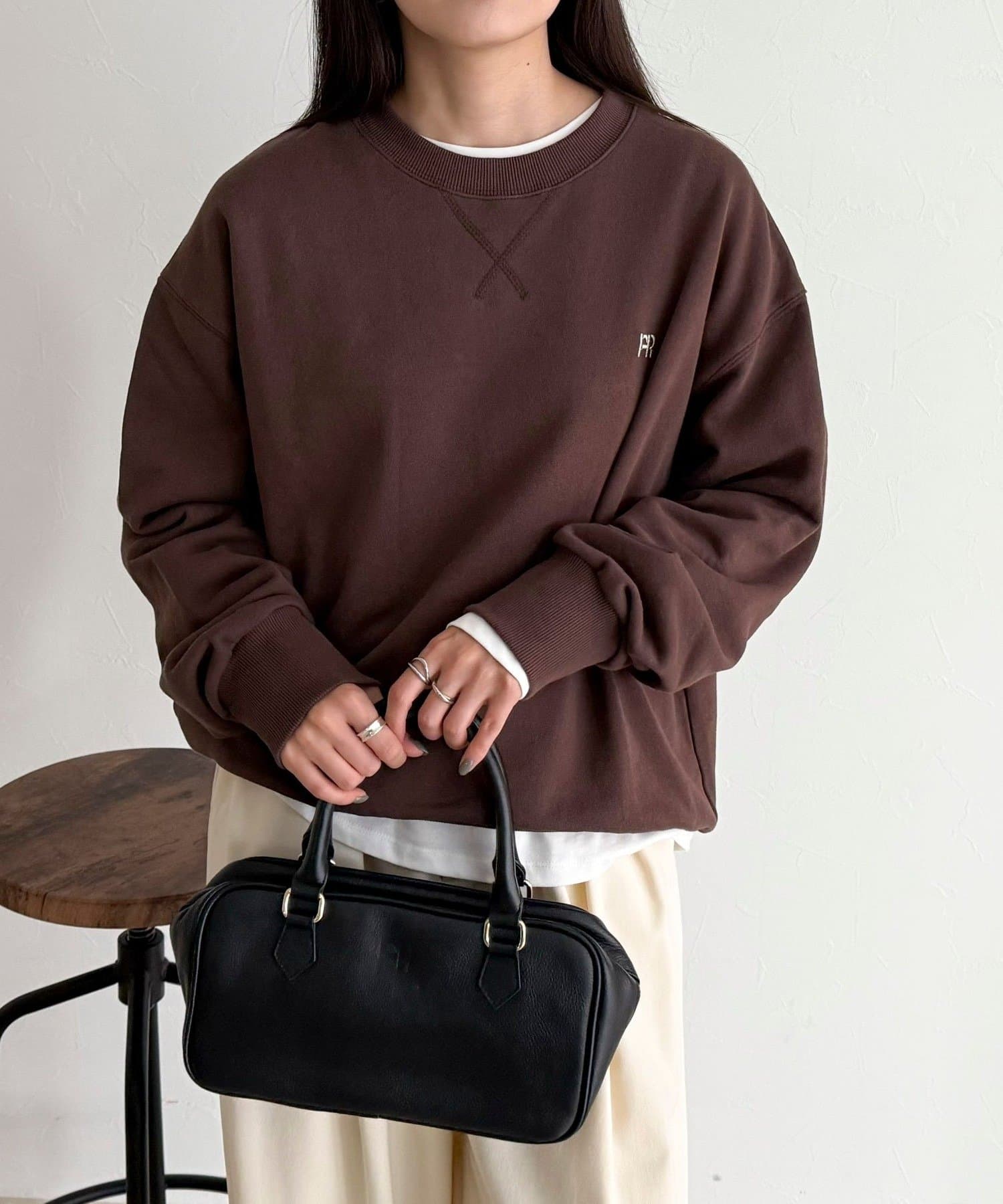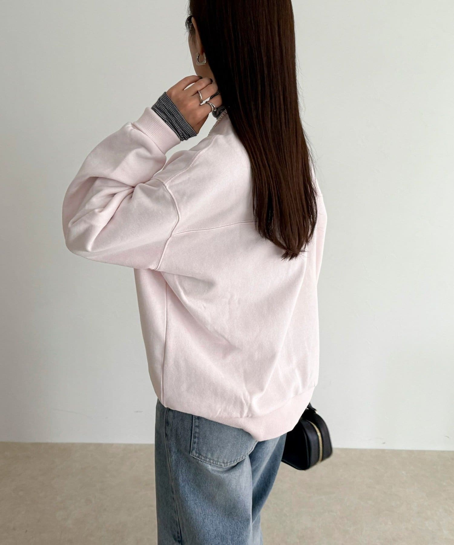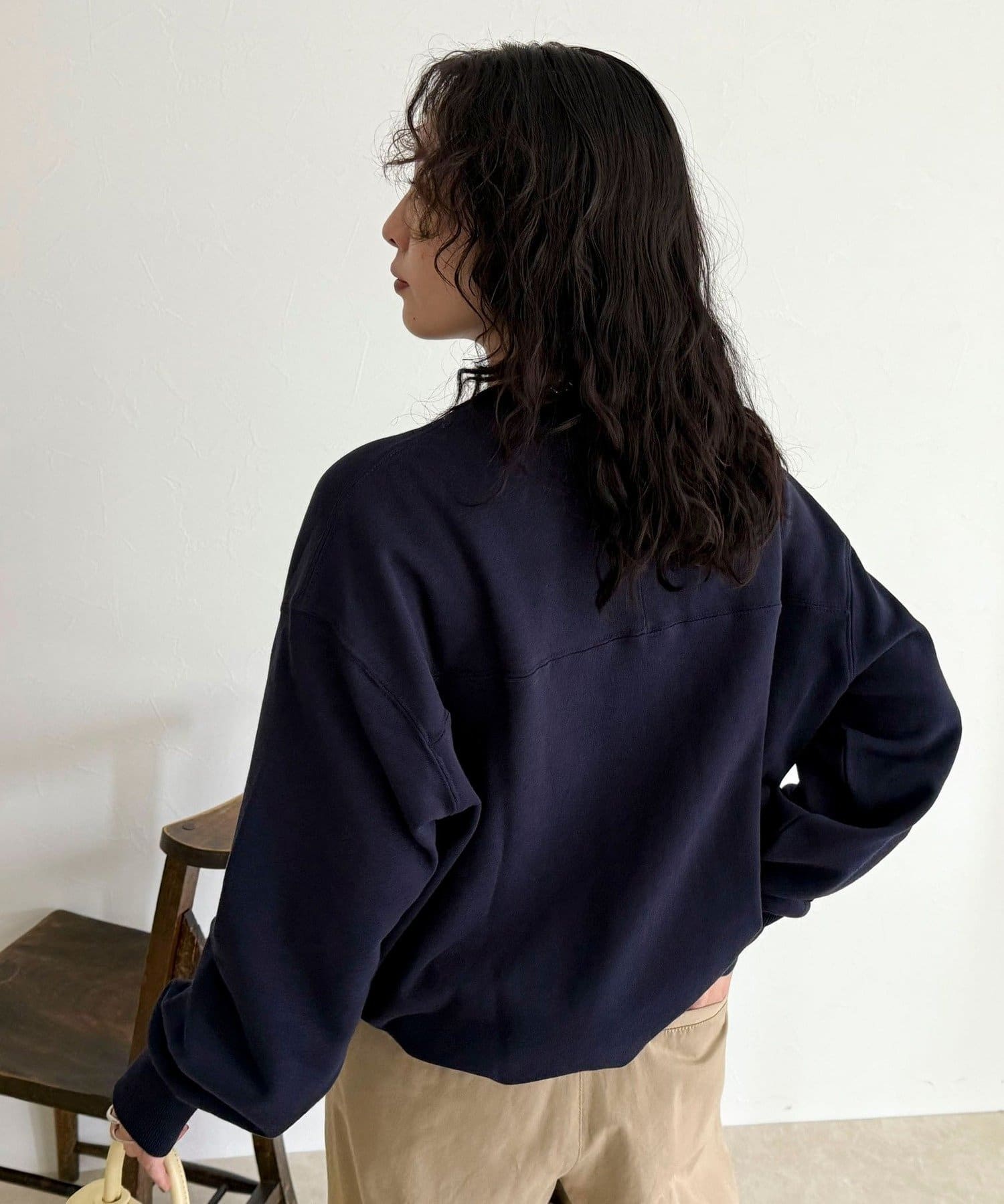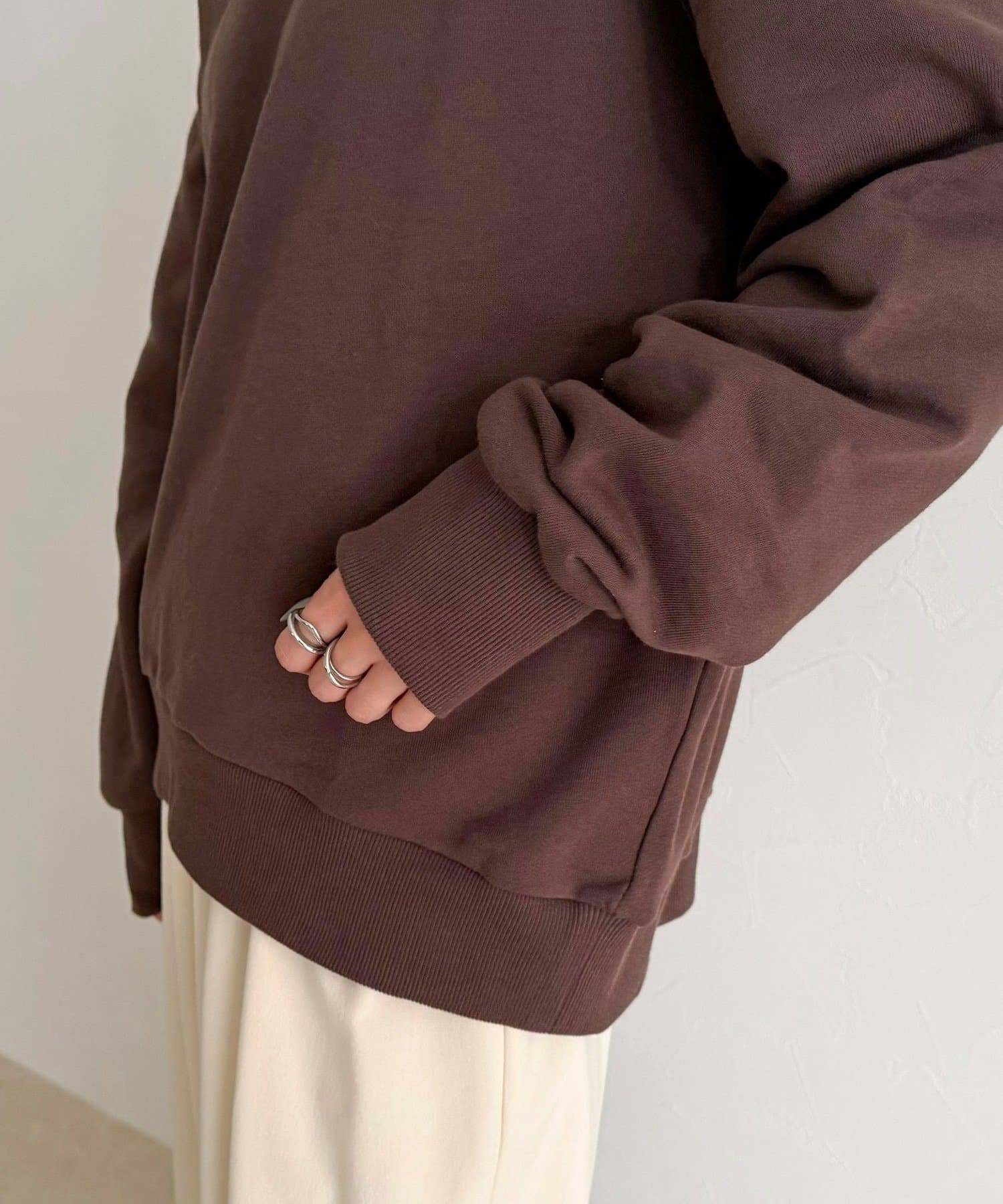 156cmスタッフ(38サイズ着用):程よくゆとりのあるサイズ感で、リラックスして着られます!ドロップショルダーのラインが女性らしく、スウェットでもラフになりすぎない印象になってくれます◎