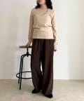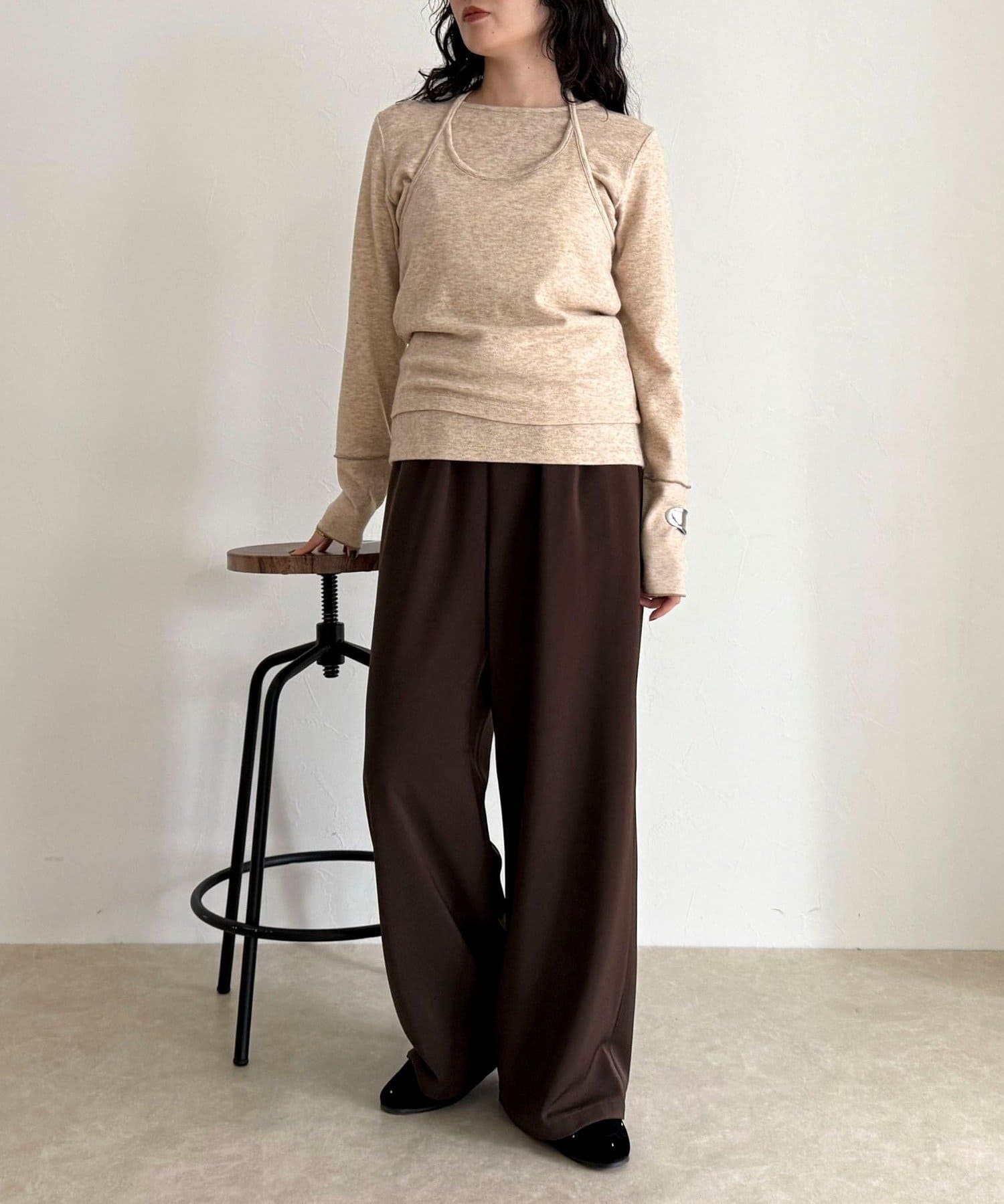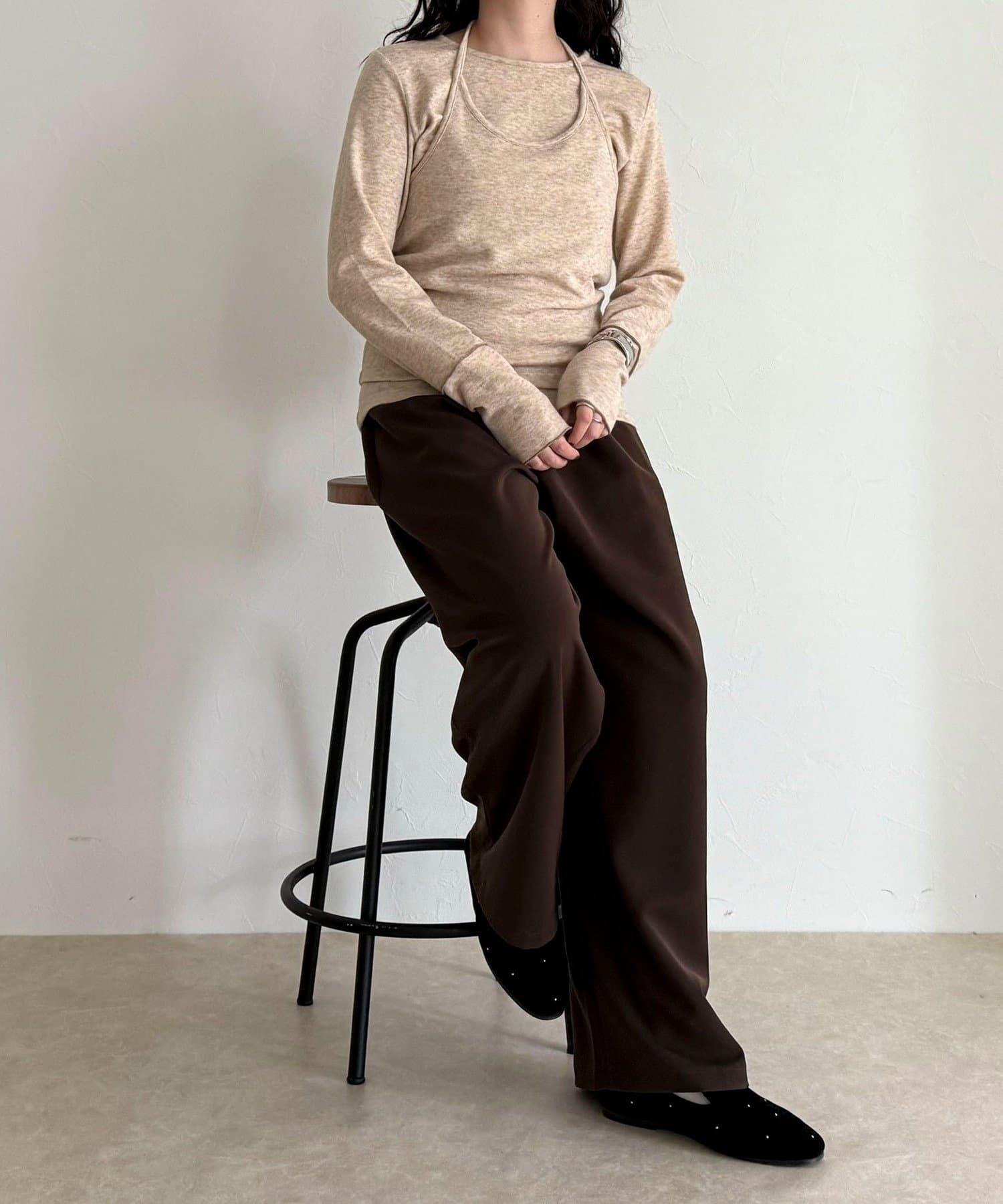160cmスタッフ(38サイズ着用): ビスチェを重ねるだけで一気にこなれ感が出て、簡単に今っぽいレイヤードスタイルが完成します。 ロンTは柔らかく肌触りがよい素材で、程よいフィット感。ビスチェも締め付けがなく、長時間着ていても快適でした。 ボトムを選ばず合わせやすく、スタイルアップして見えるのも嬉しいポイントです。