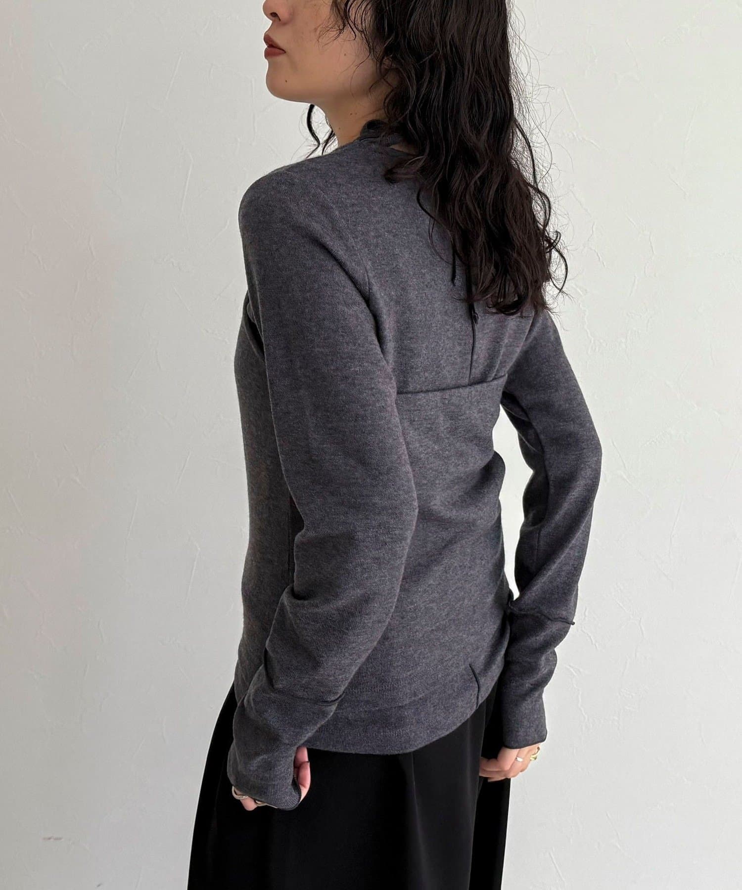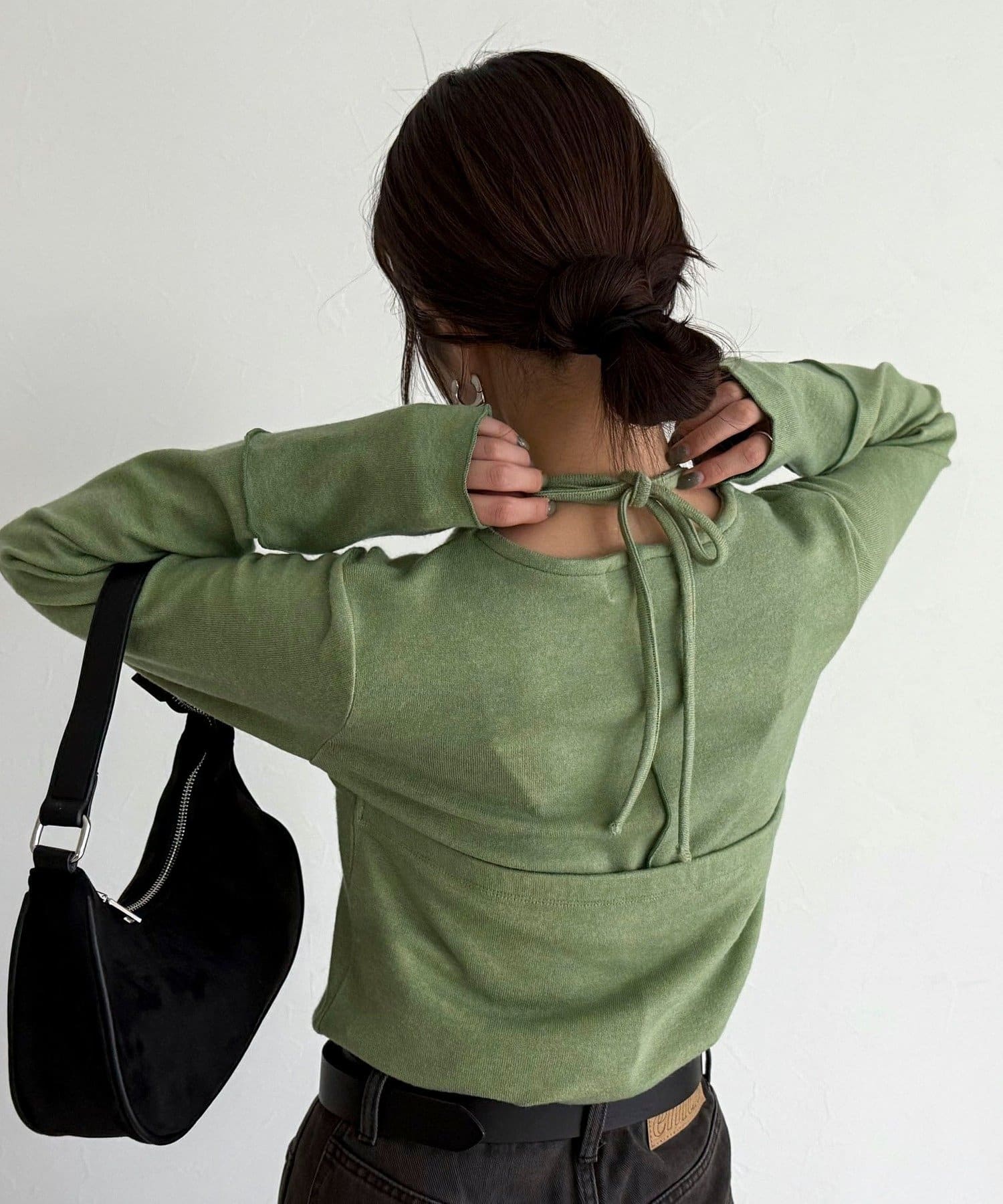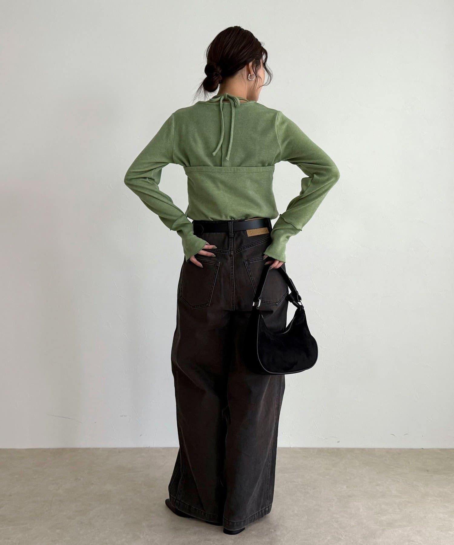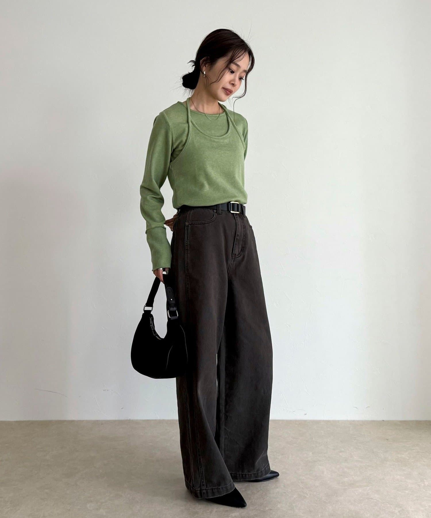 155cmスタッフ(38サイズ着用): コンパクトなビスチェが上半身をすっきり見せてくれて、バランス良く着こなせました。 ロンTは1枚でも着られるちょうど良い厚みで、セットで着ても重たく見えません。 デニムやスカート、どちらとも相性が良く、着回し力抜群のアイテムです◎