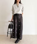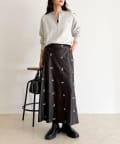 156cmスタッフ(38サイズ着用):ウエストのゴムが柔らかくフィットし、長時間穿いても楽ちん!刺繍が華やかなので、シンプルなトップスを合わせるだけで主役になるスカートです◎