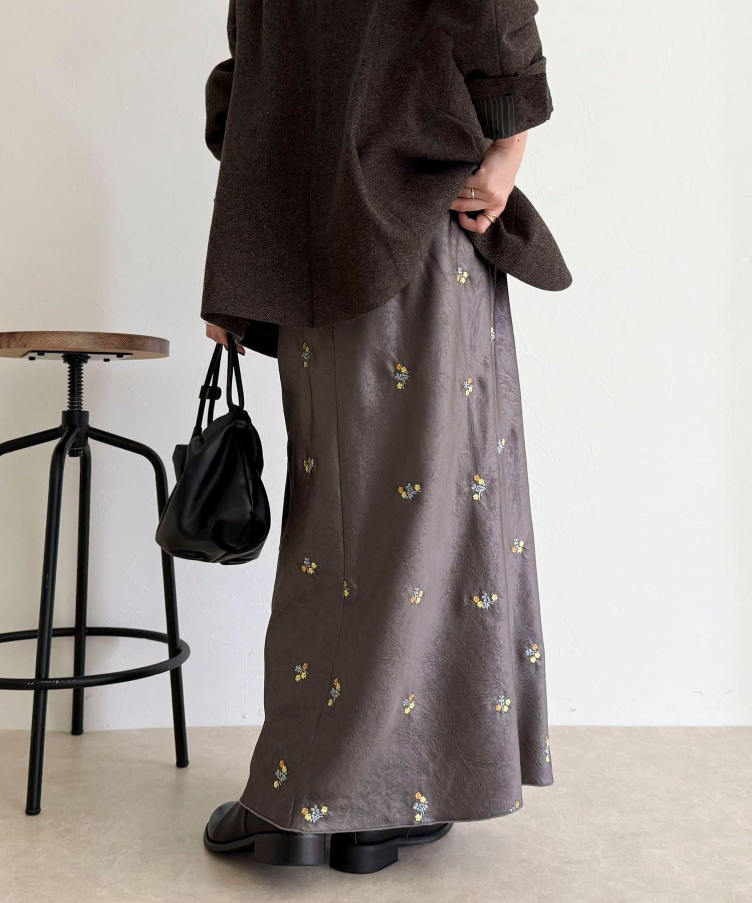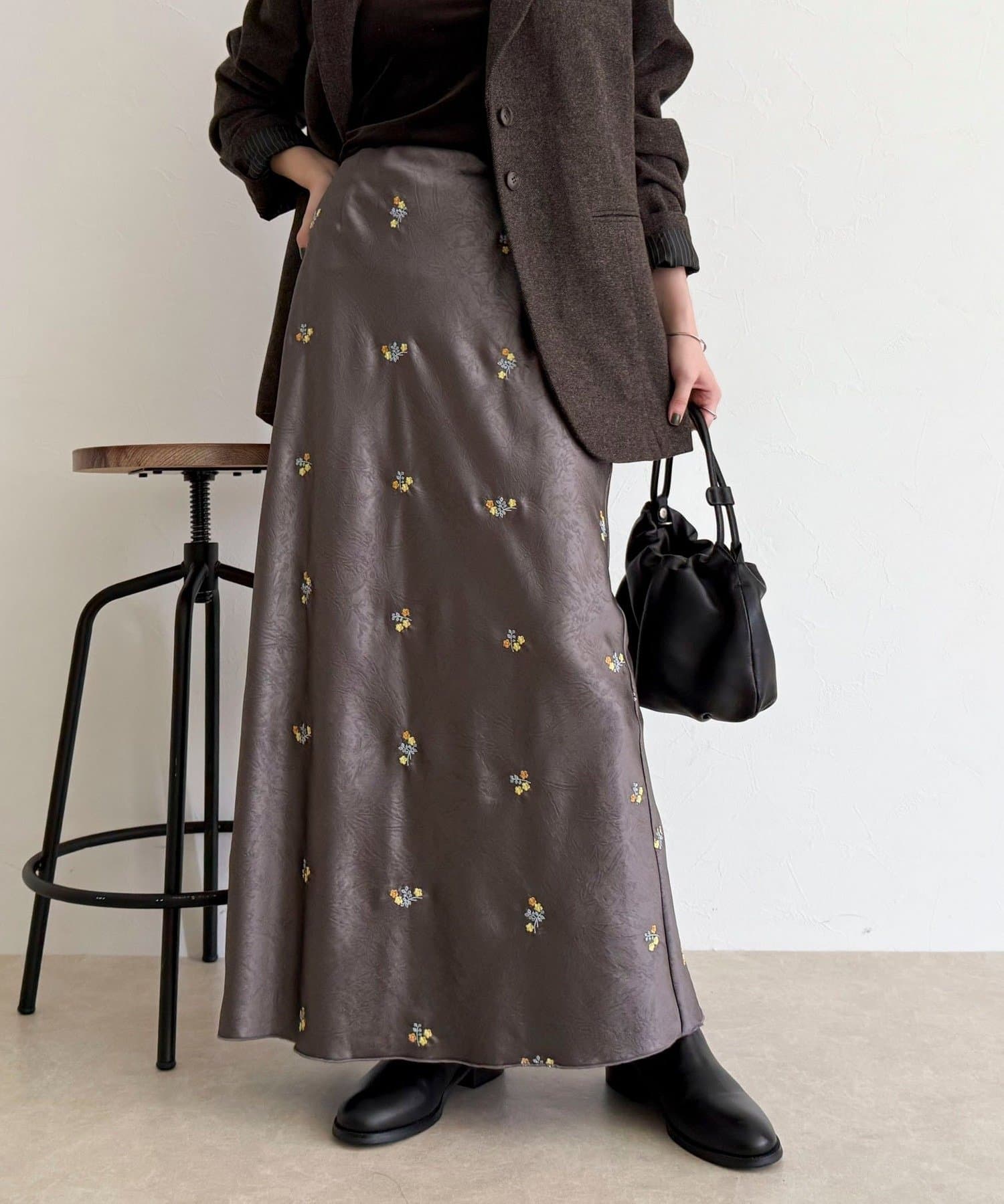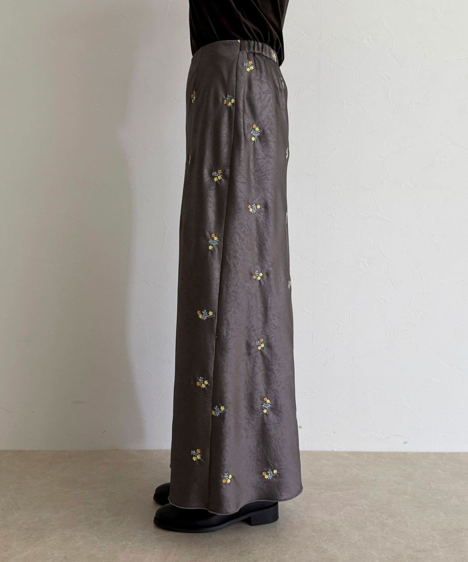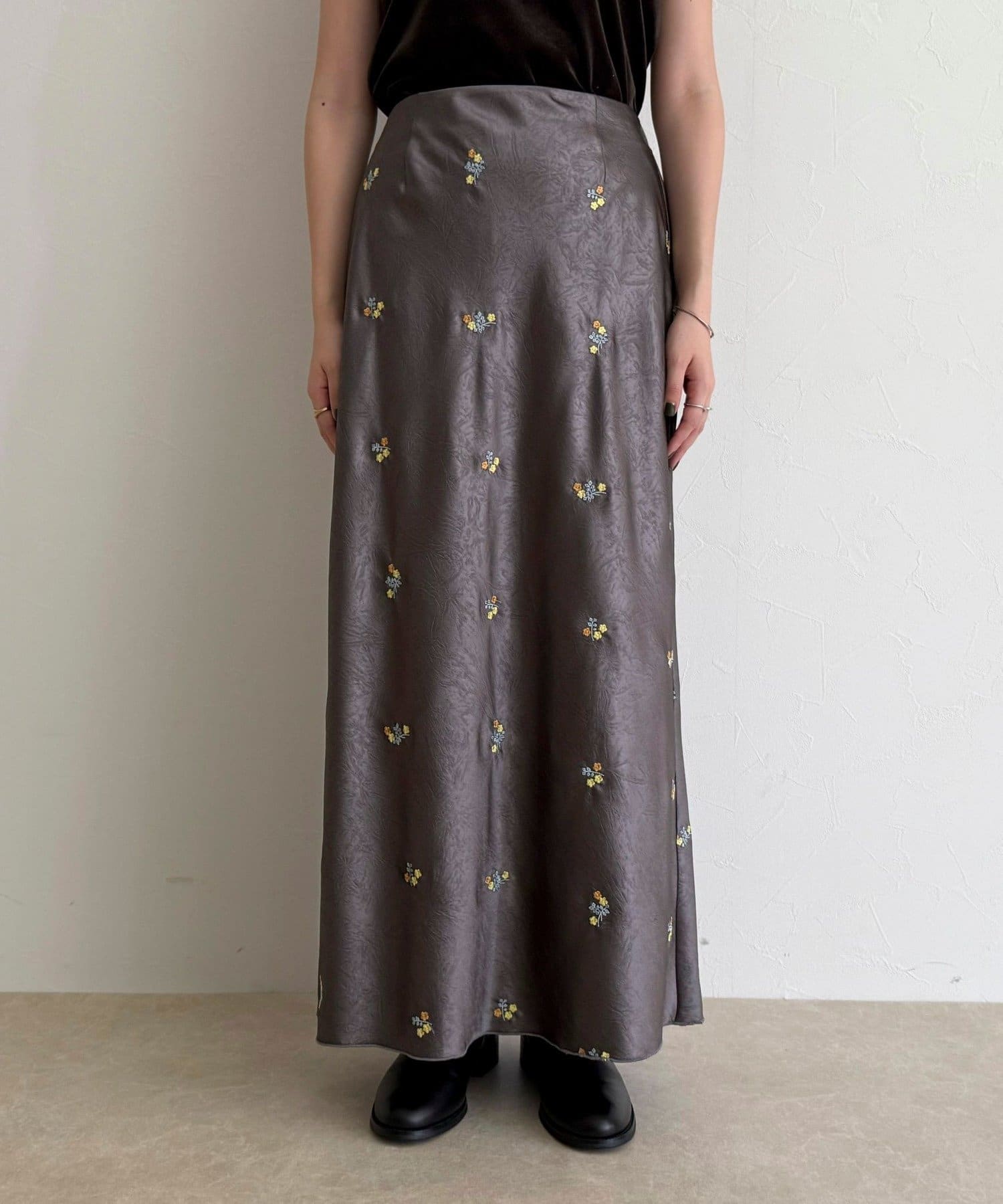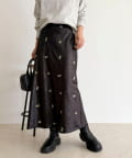 ・表情のあるサテン素材に華やかなフラワー刺繍を施した上品なスカート