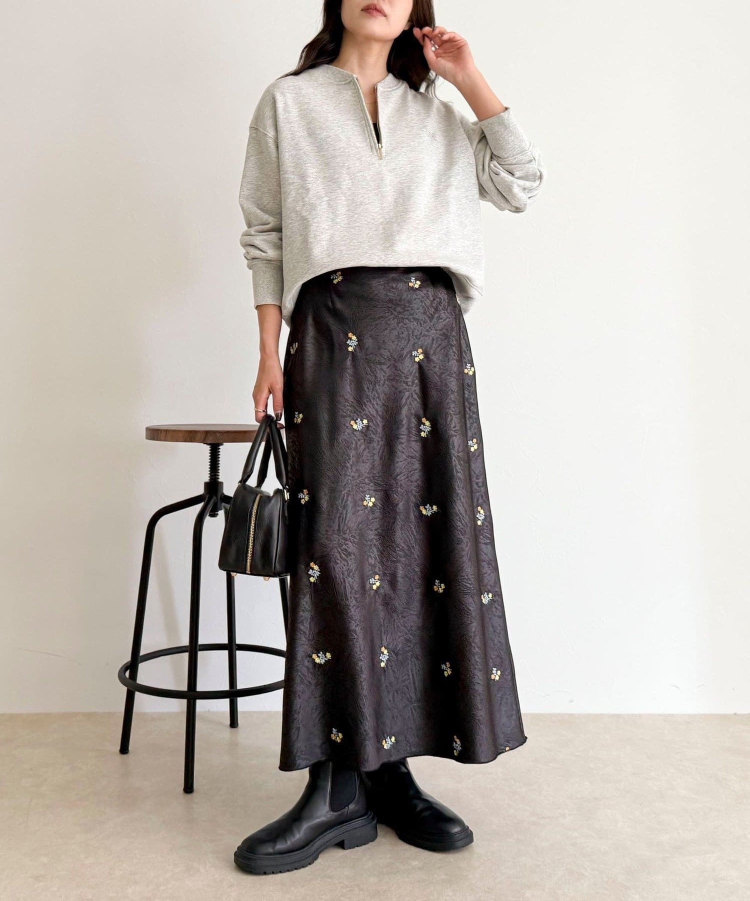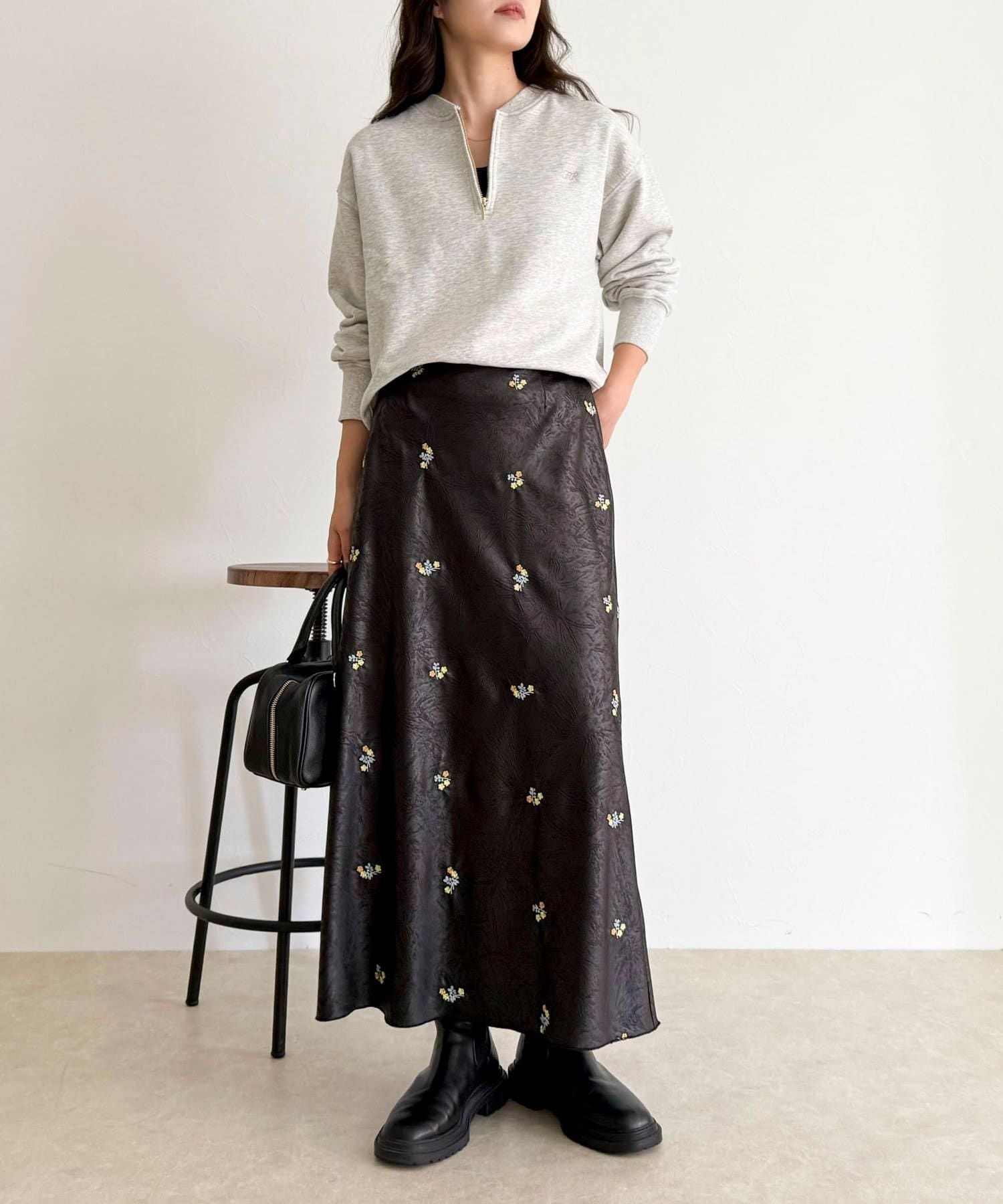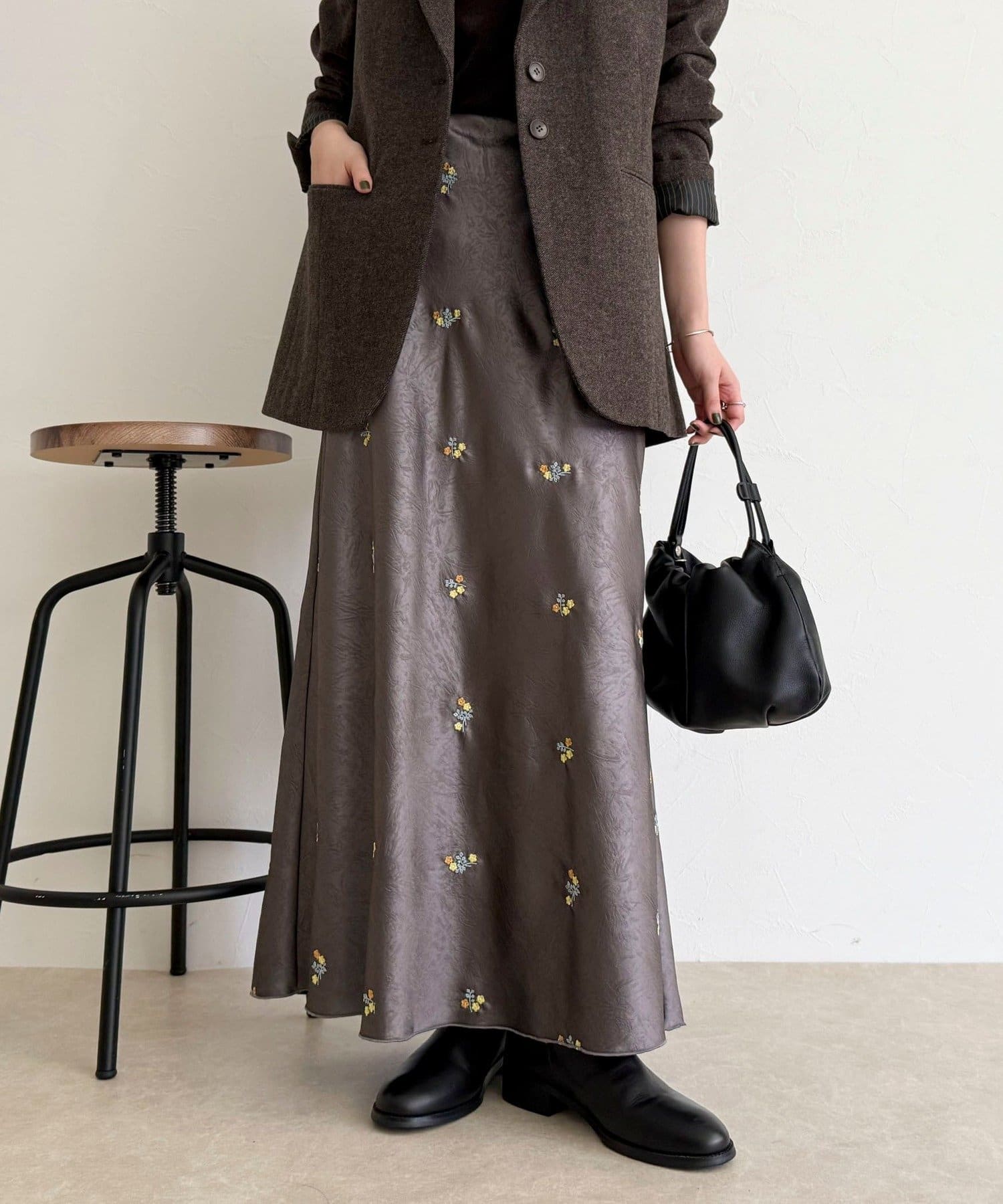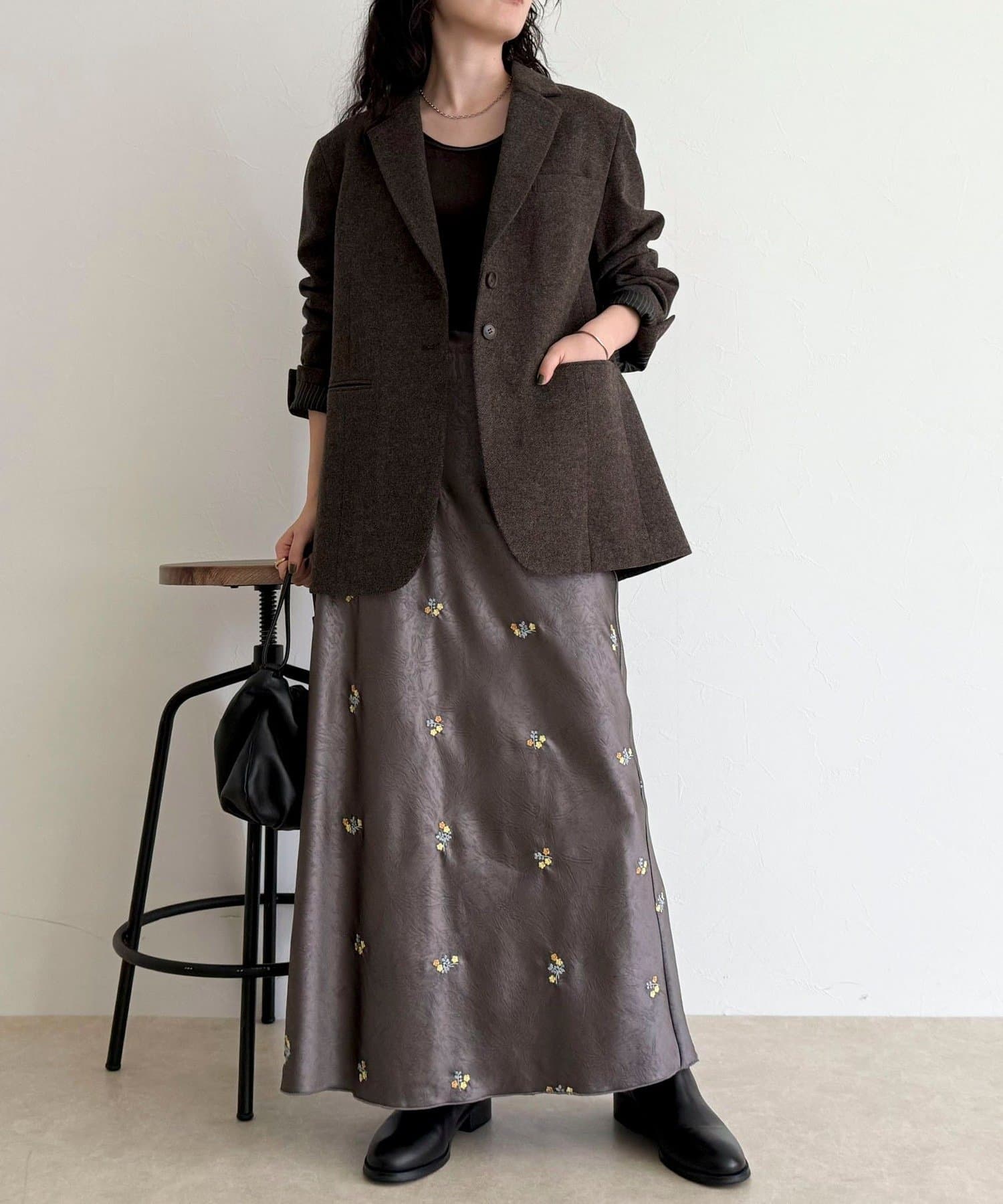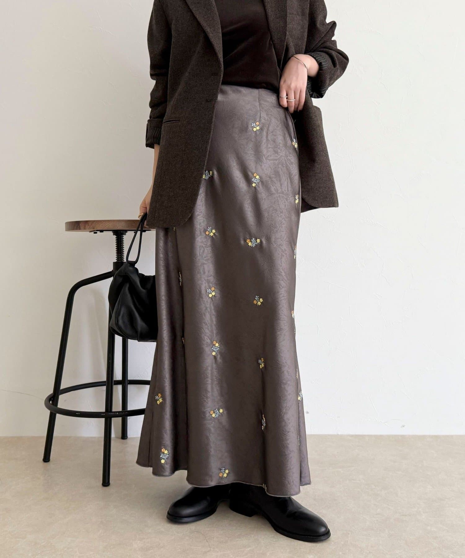 ・表情のあるサテン素材に華やかなフラワー刺繍を施した上品なスカート