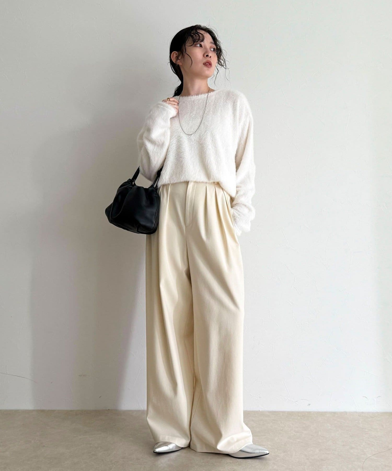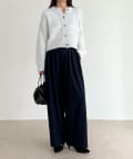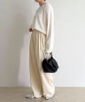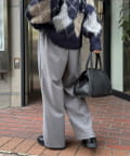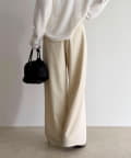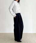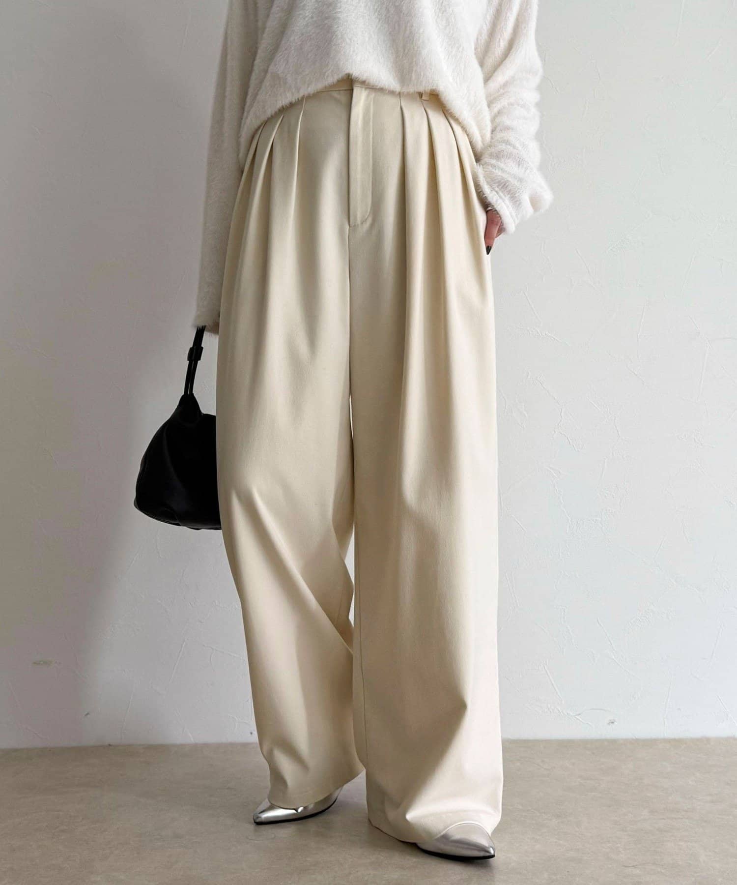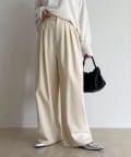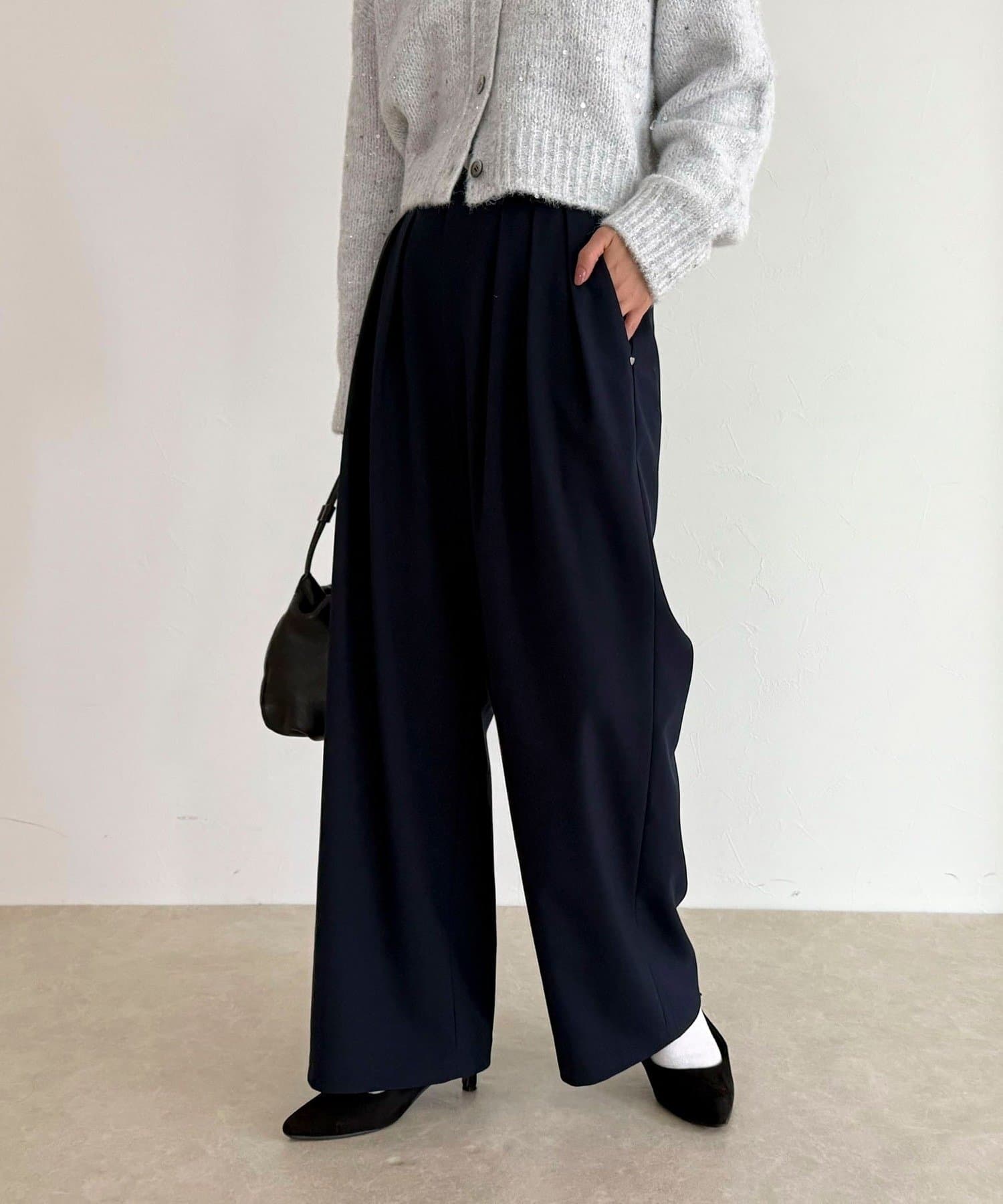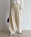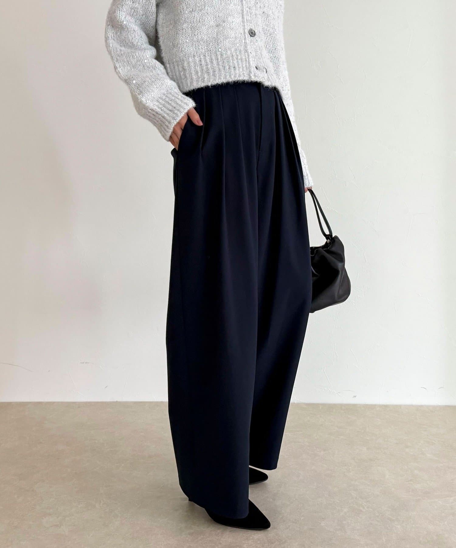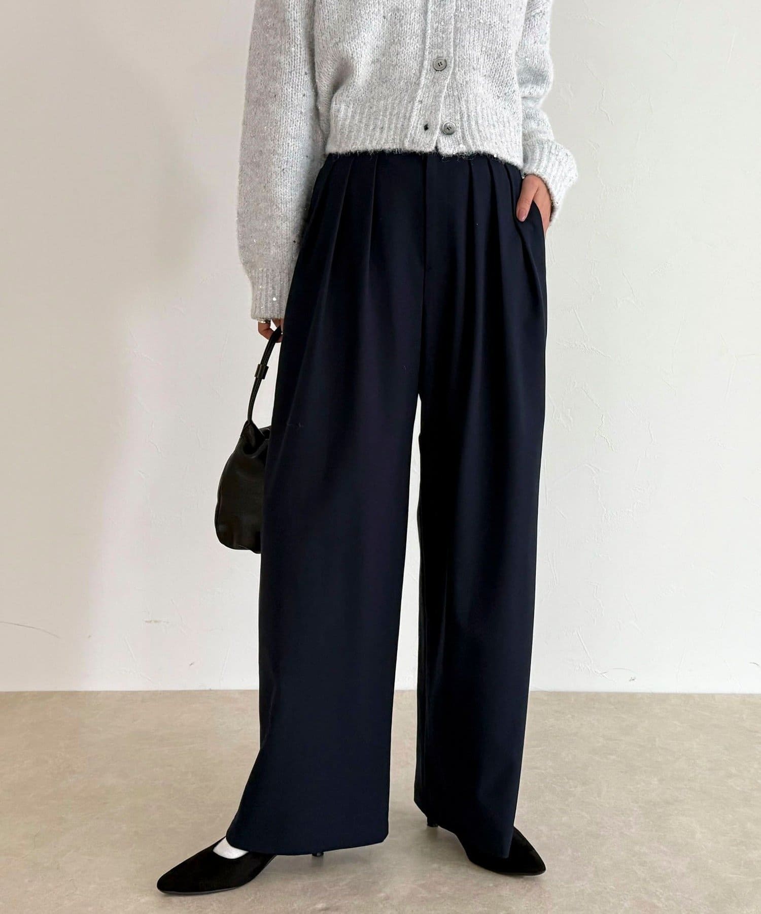3タックの効果で腰回りがすっきり見え、ワイドでももたつかず上品な印象です◎