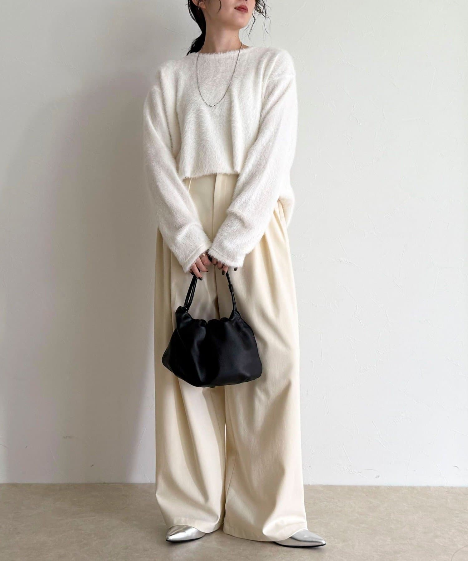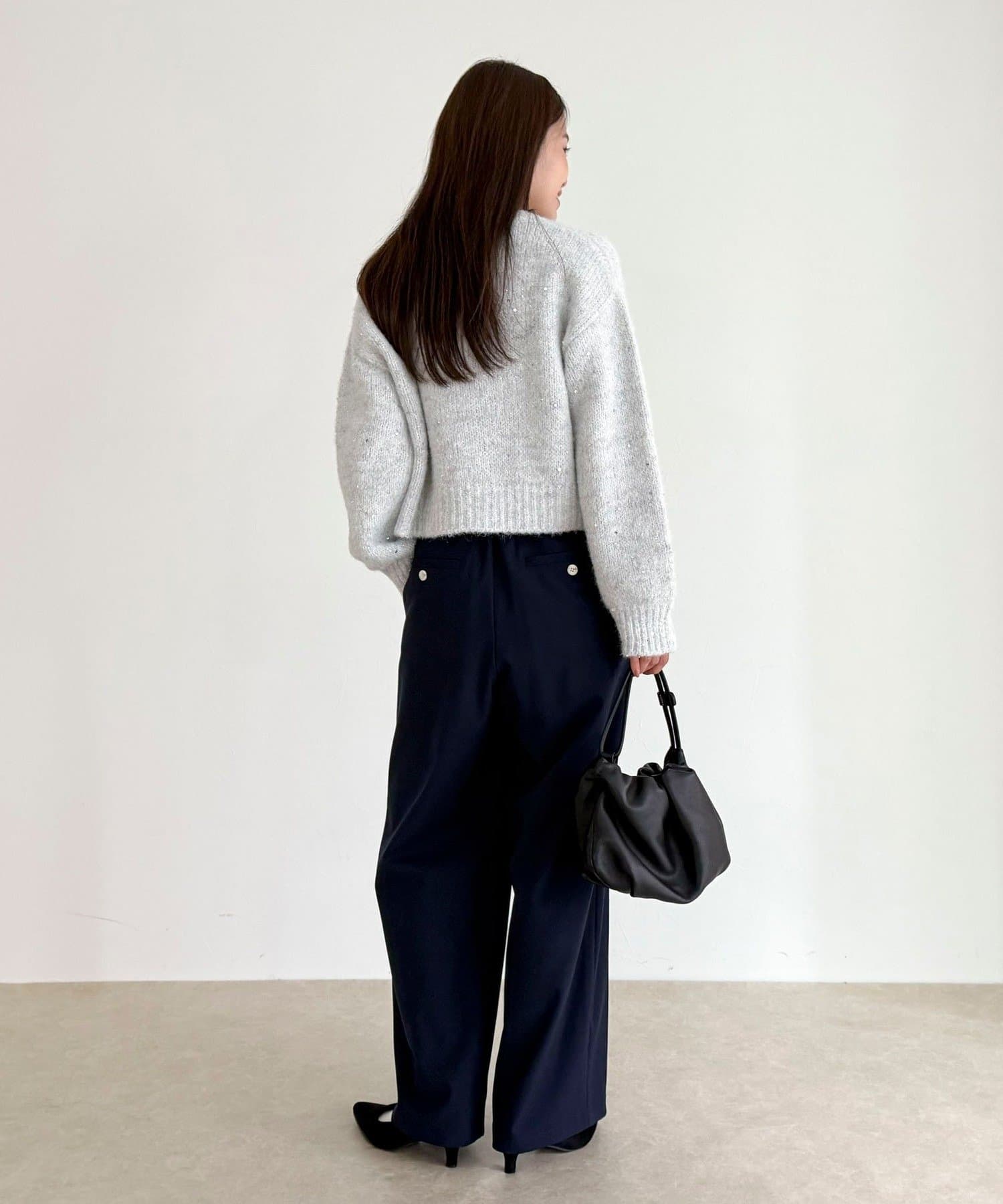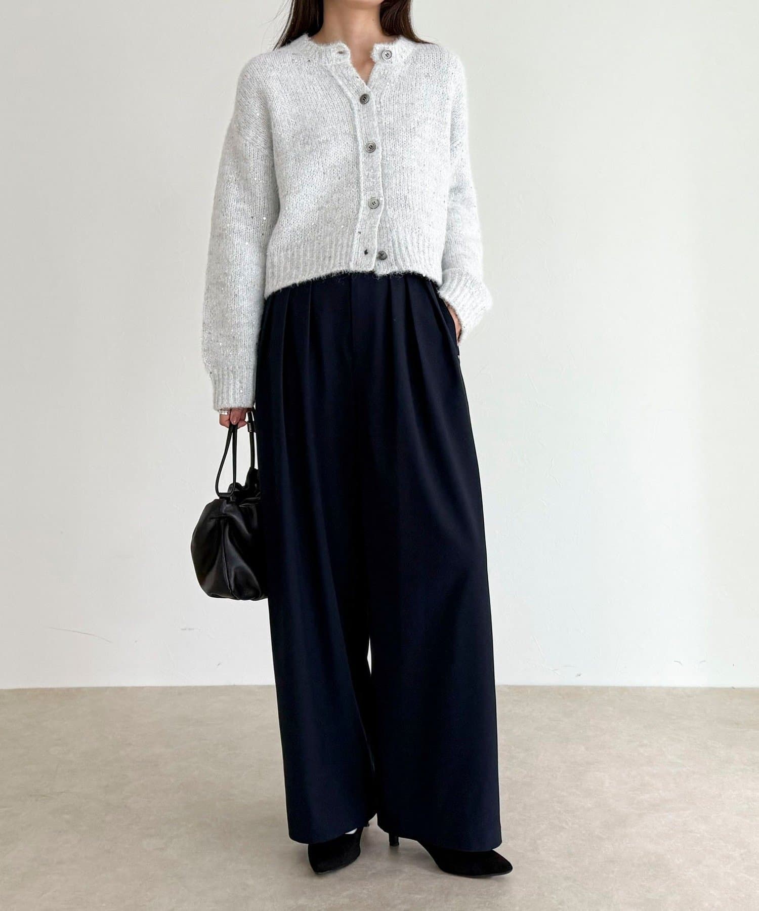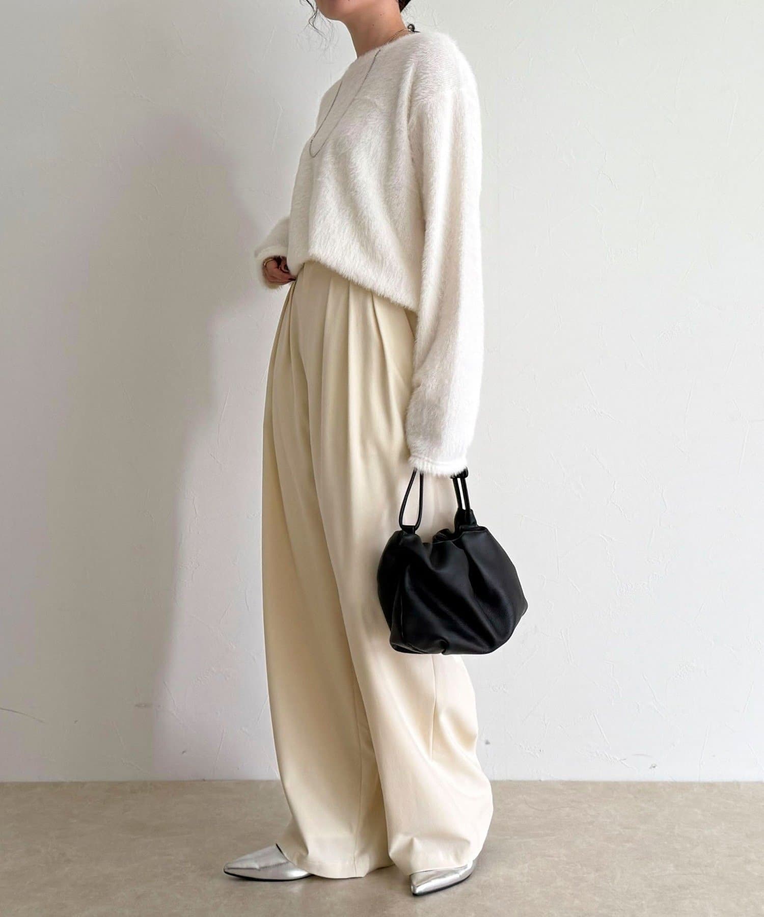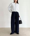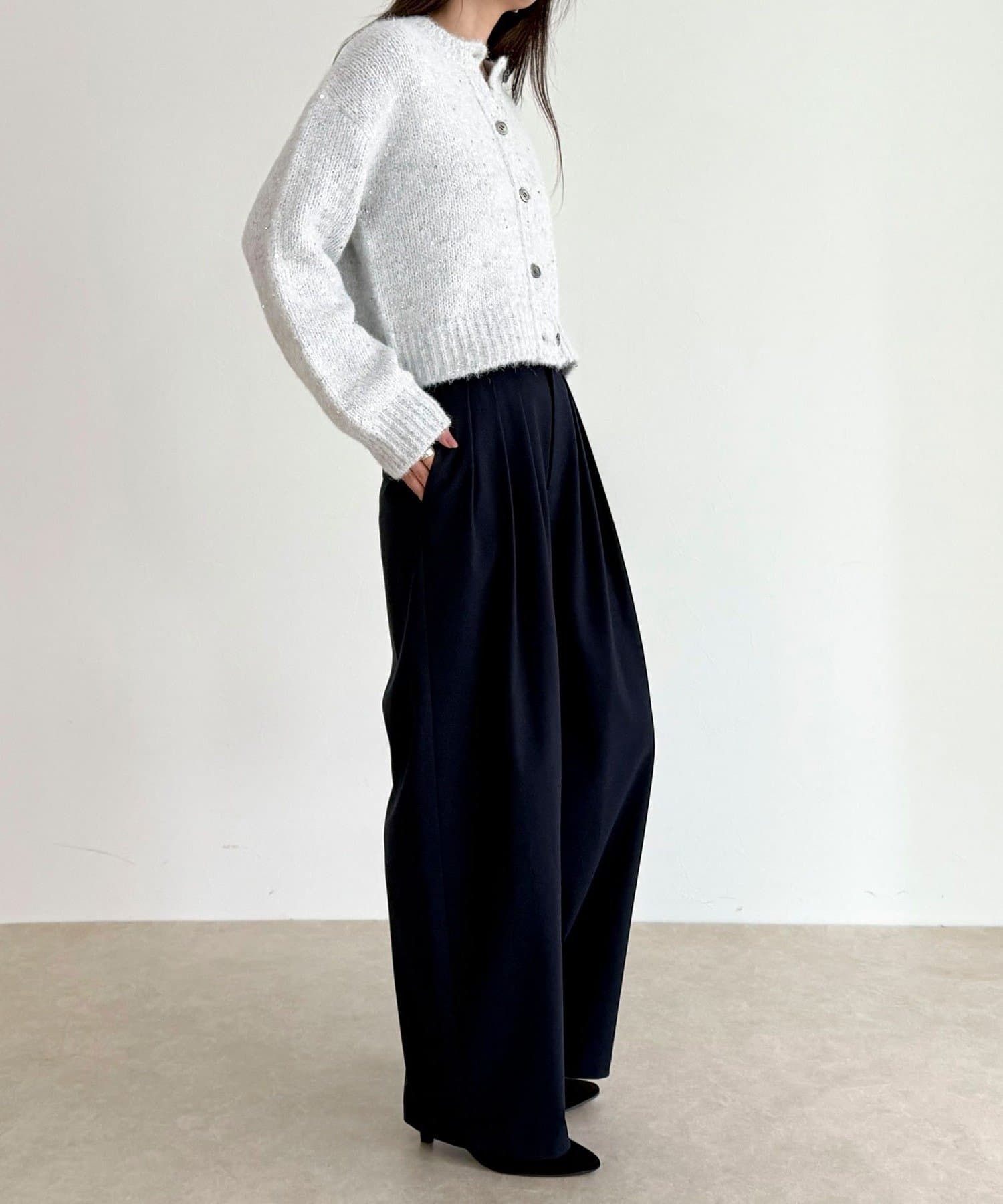 3タックの効果で腰回りがすっきり見え、ワイドでももたつかず上品な印象です◎