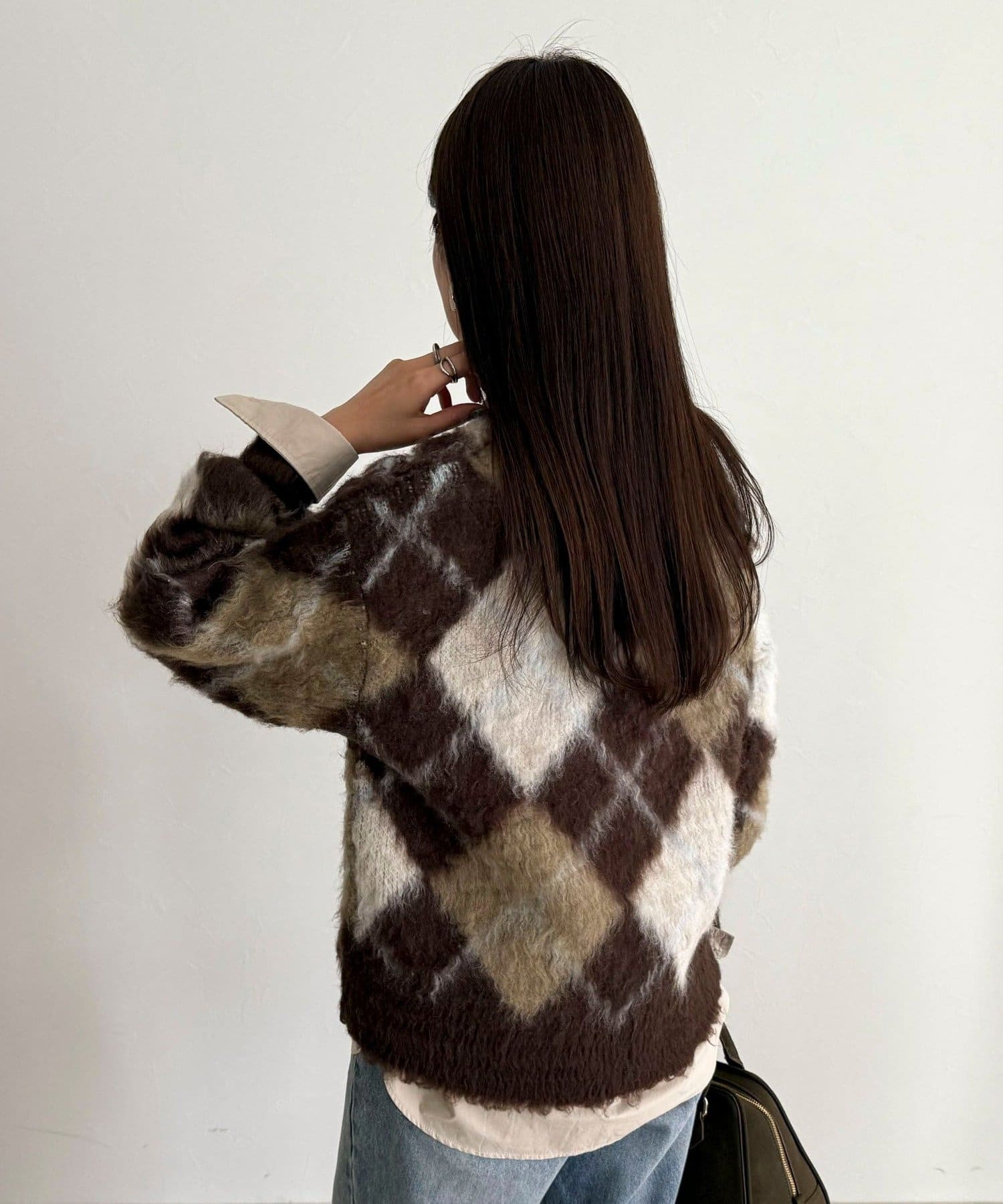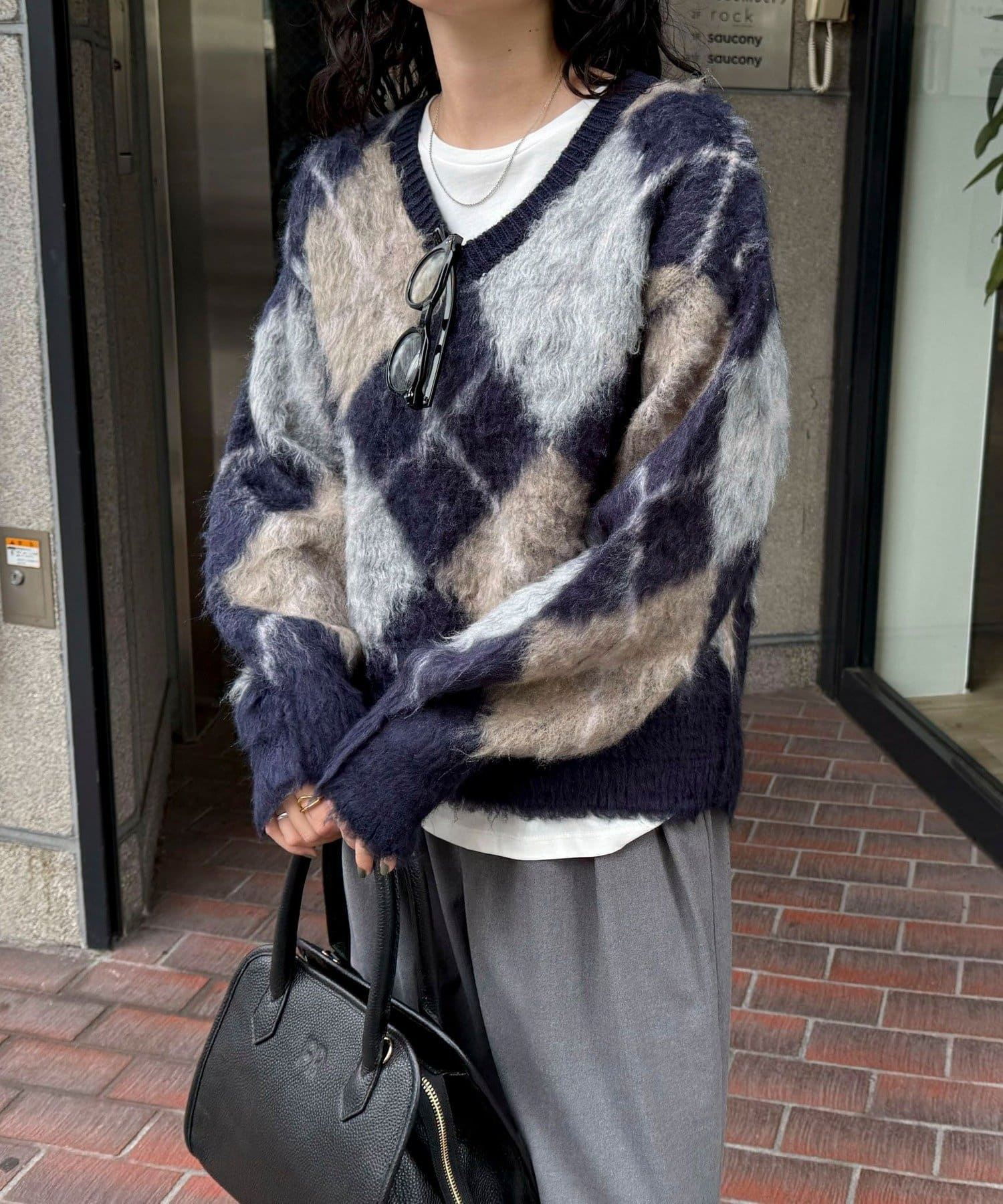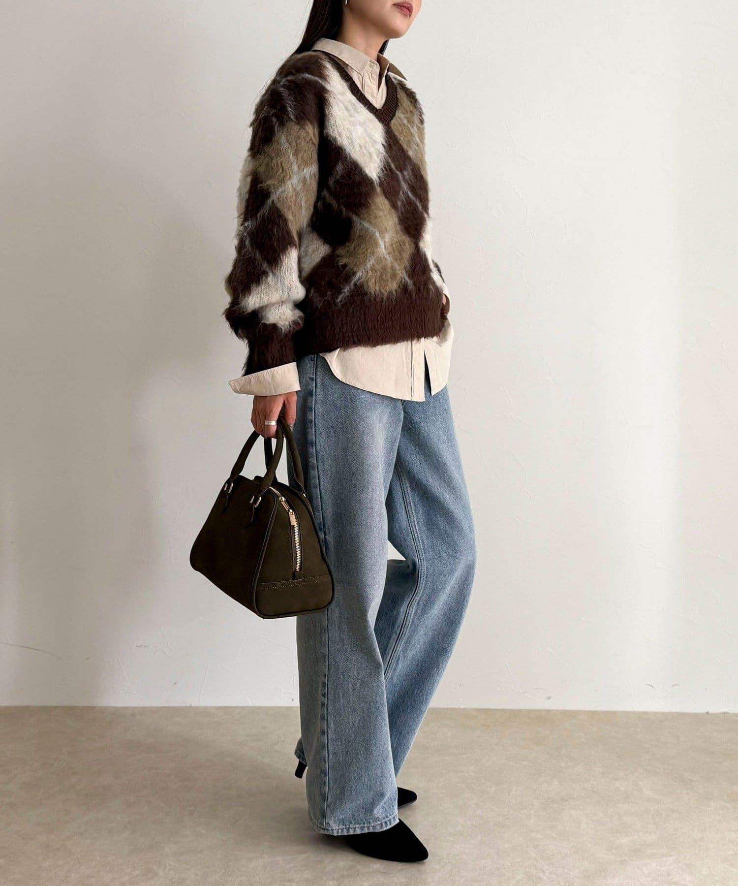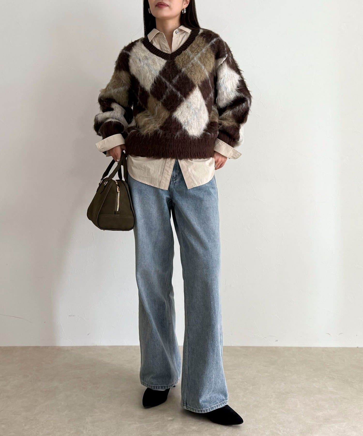 アーガイル柄起毛Vネックニット