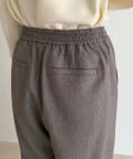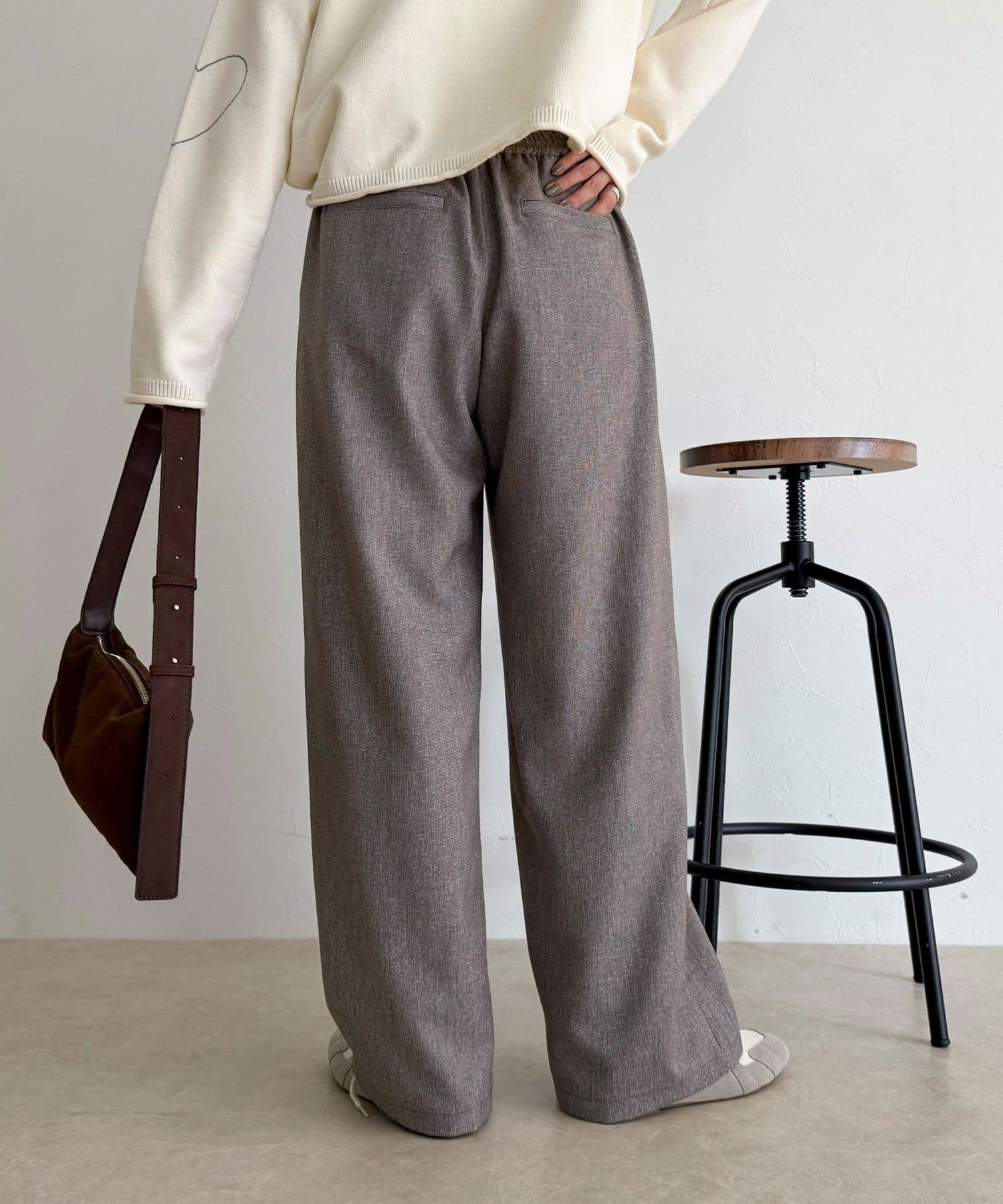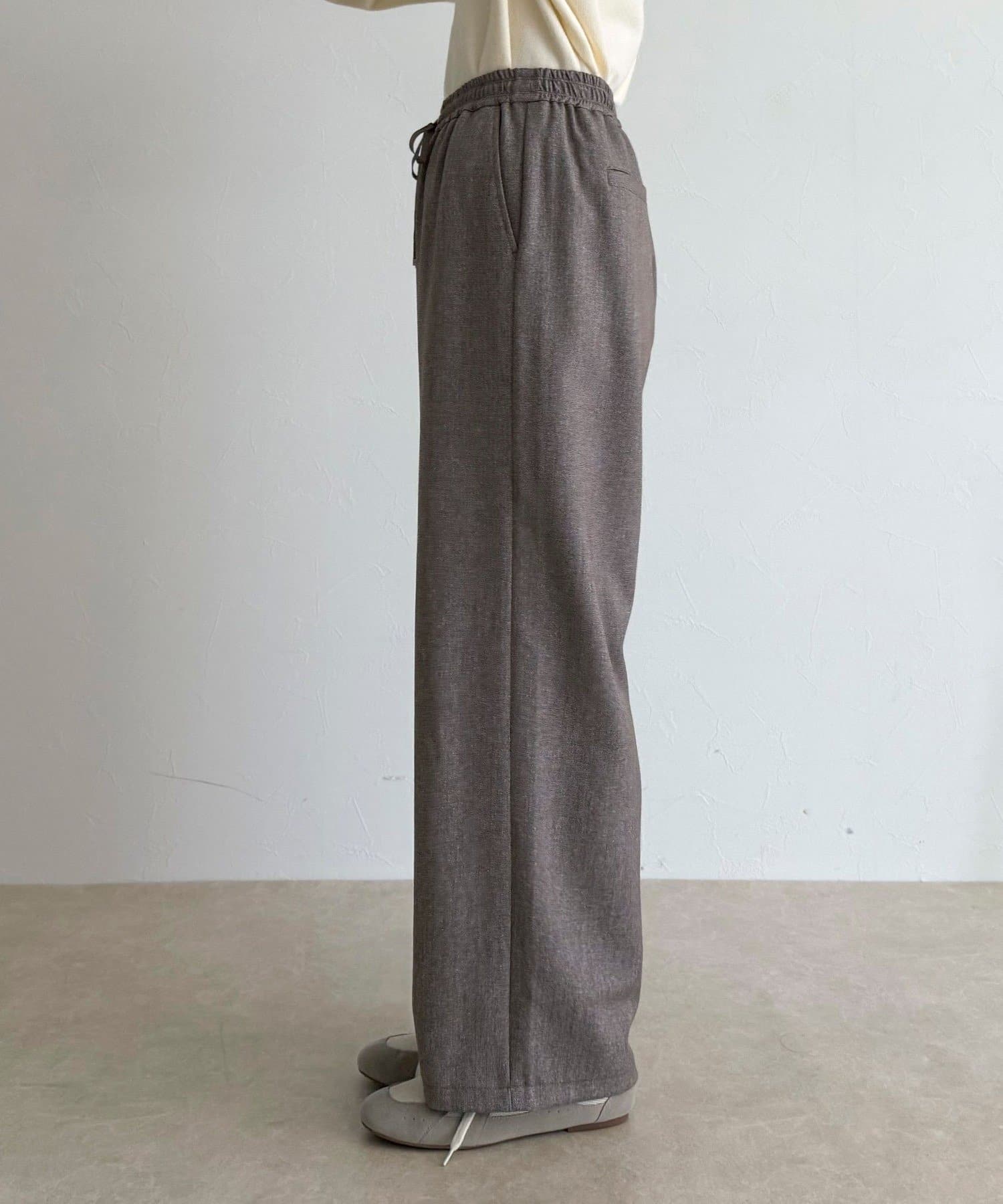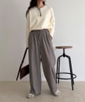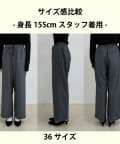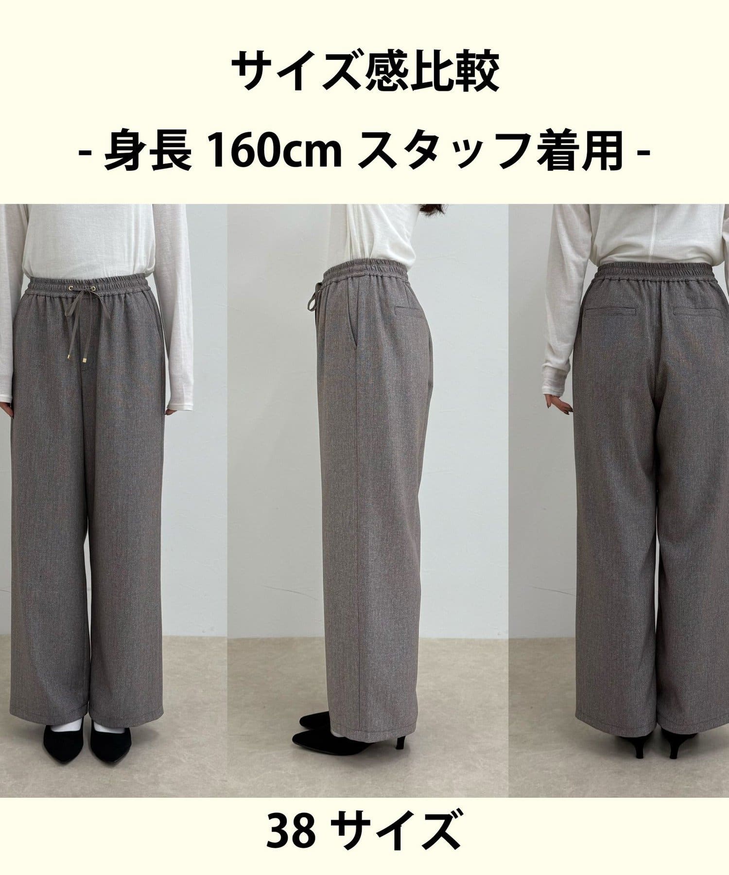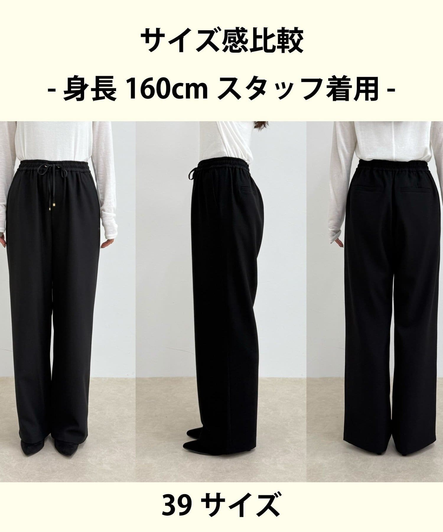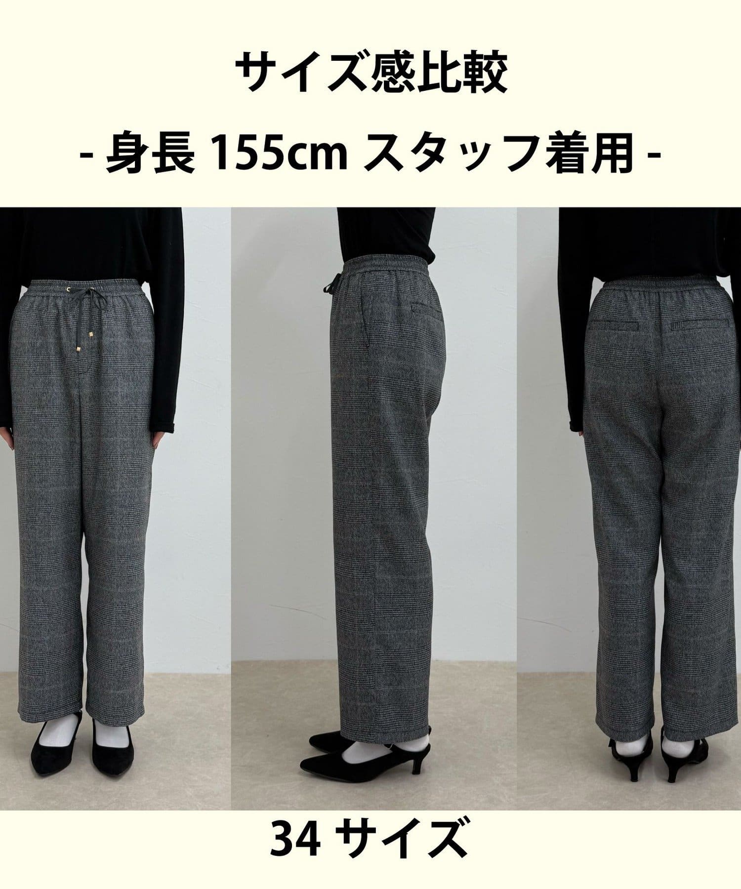 156cmスタッフ(38サイズ着用):ウエストはゴムで楽ちんですがだらしなく見えず、ストレートシルエットで脚がきれいに見えます!34サイズなら小柄な方でもバランスよく着られ、39サイズは高身長の方にぴったりの丈感です!デイリーからオフィスまで幅広く使える万能パンツです◎