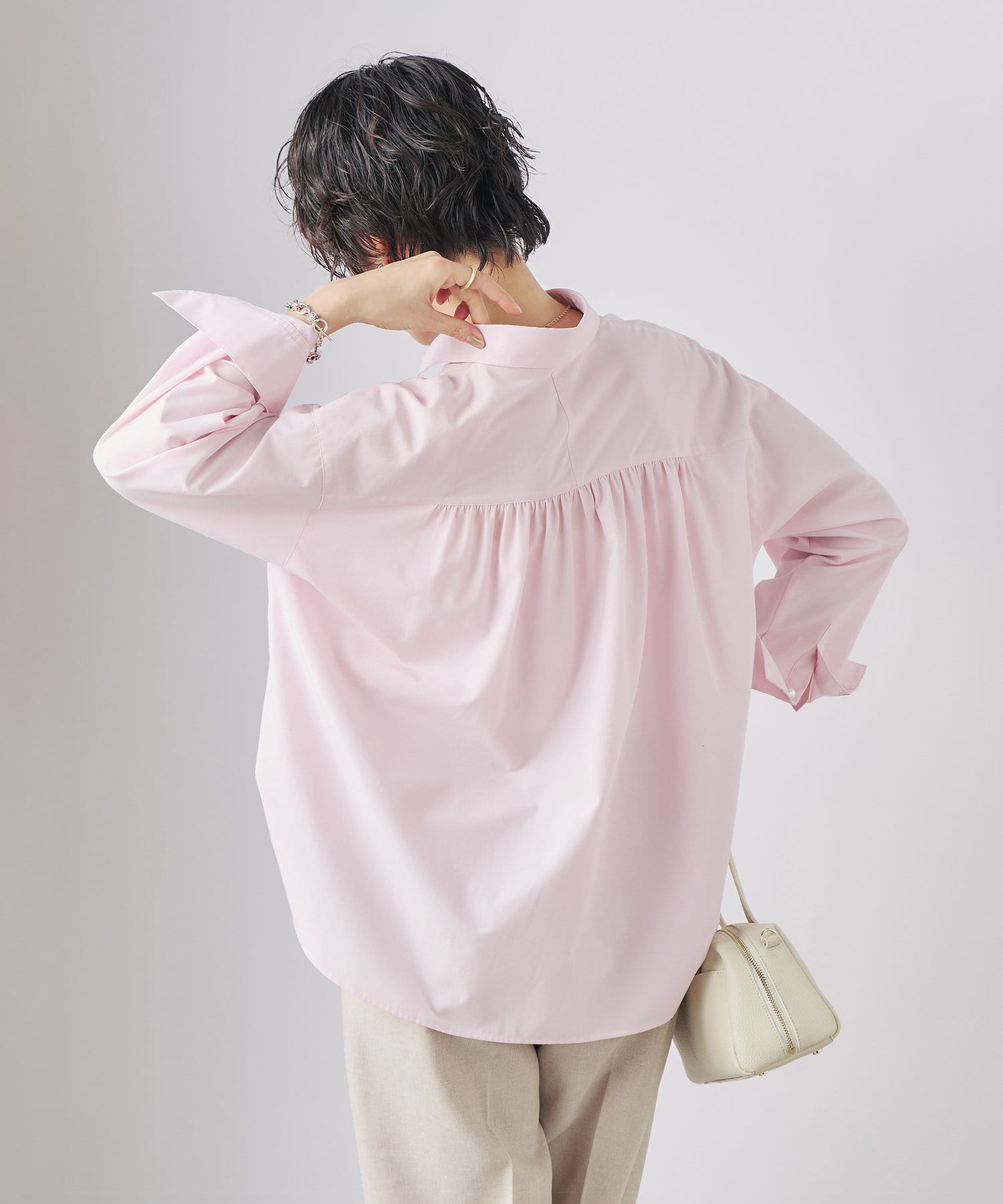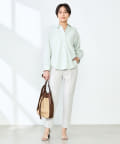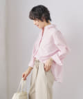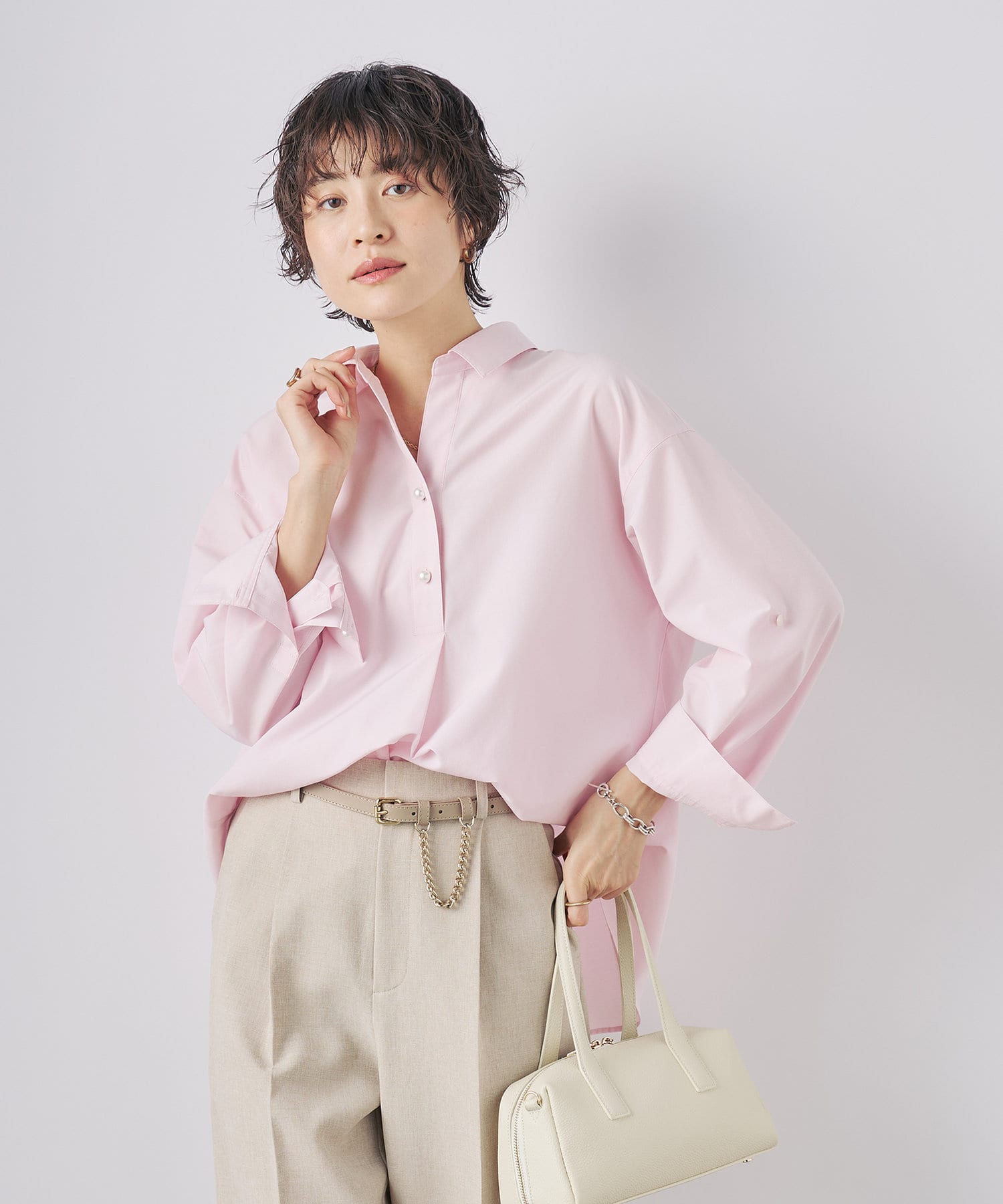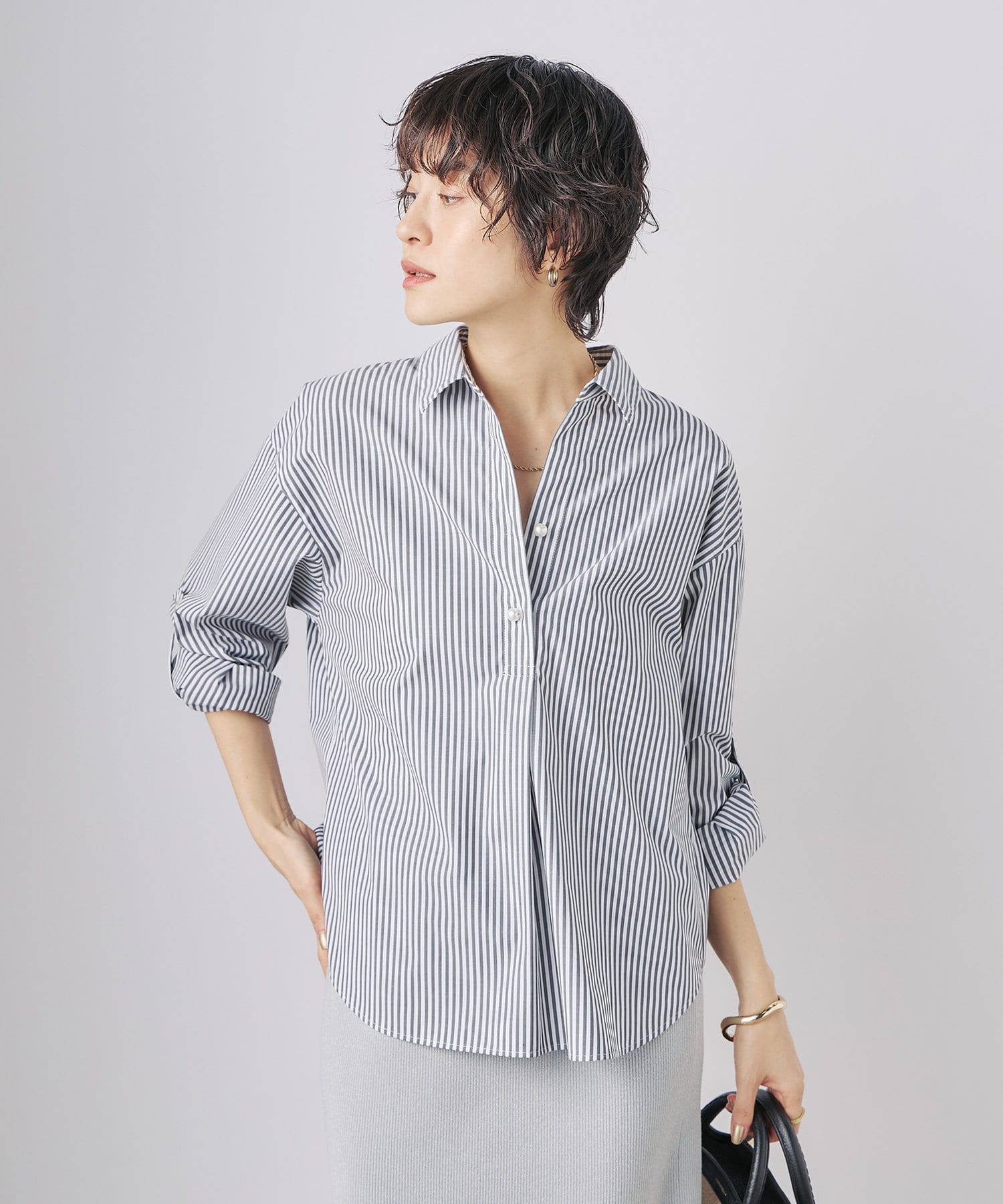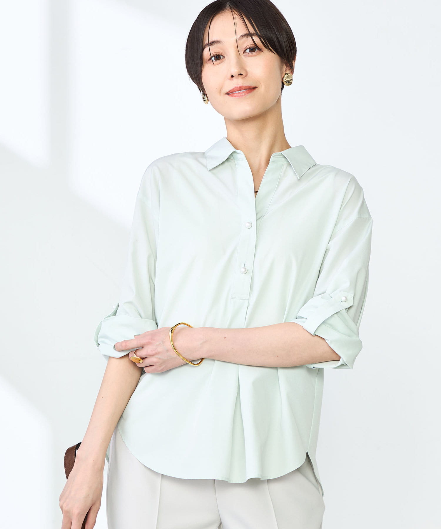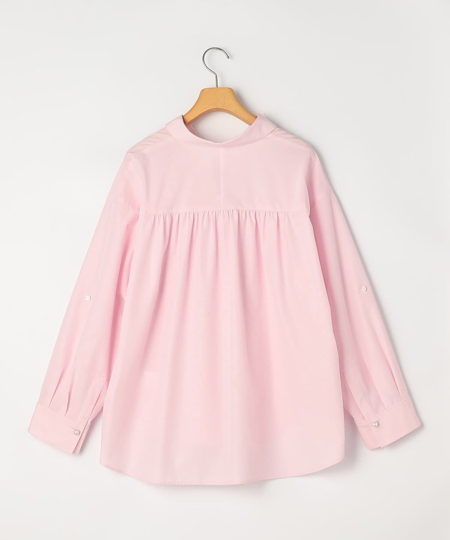 ・定番人気の大きめパール釦がポイントのスキッパーシャツ