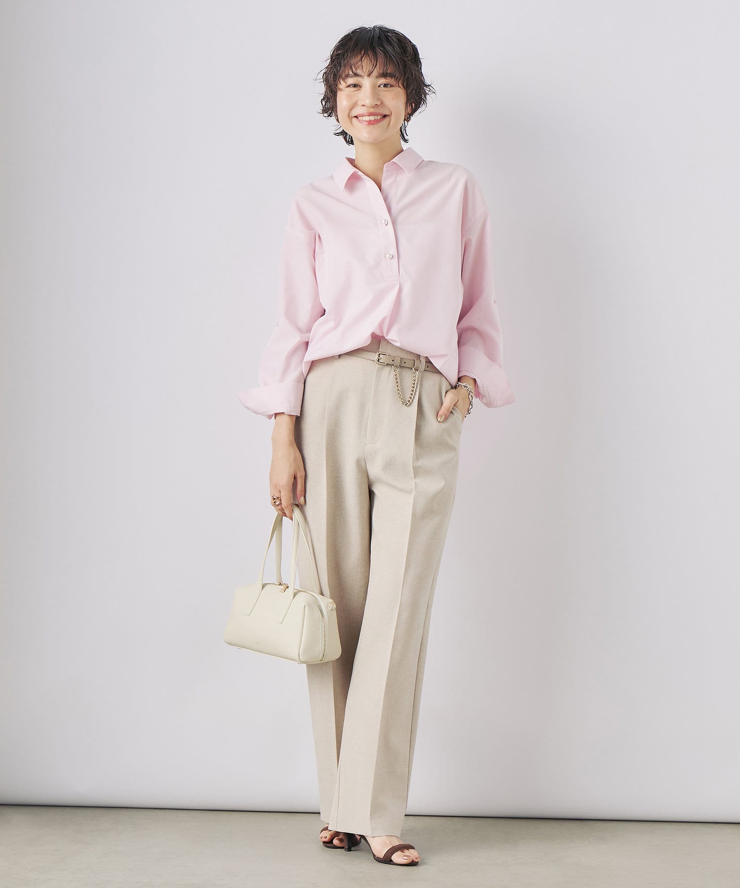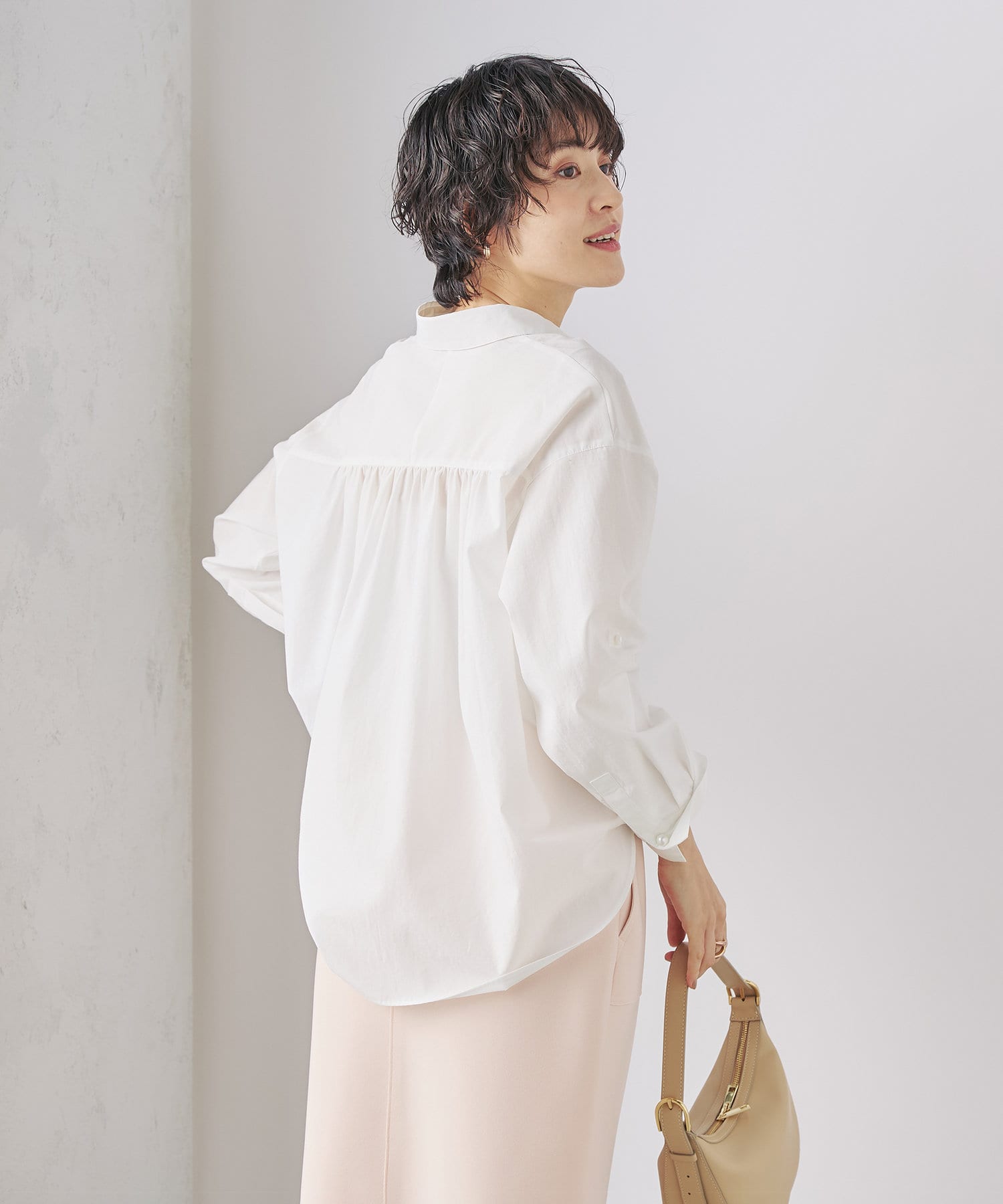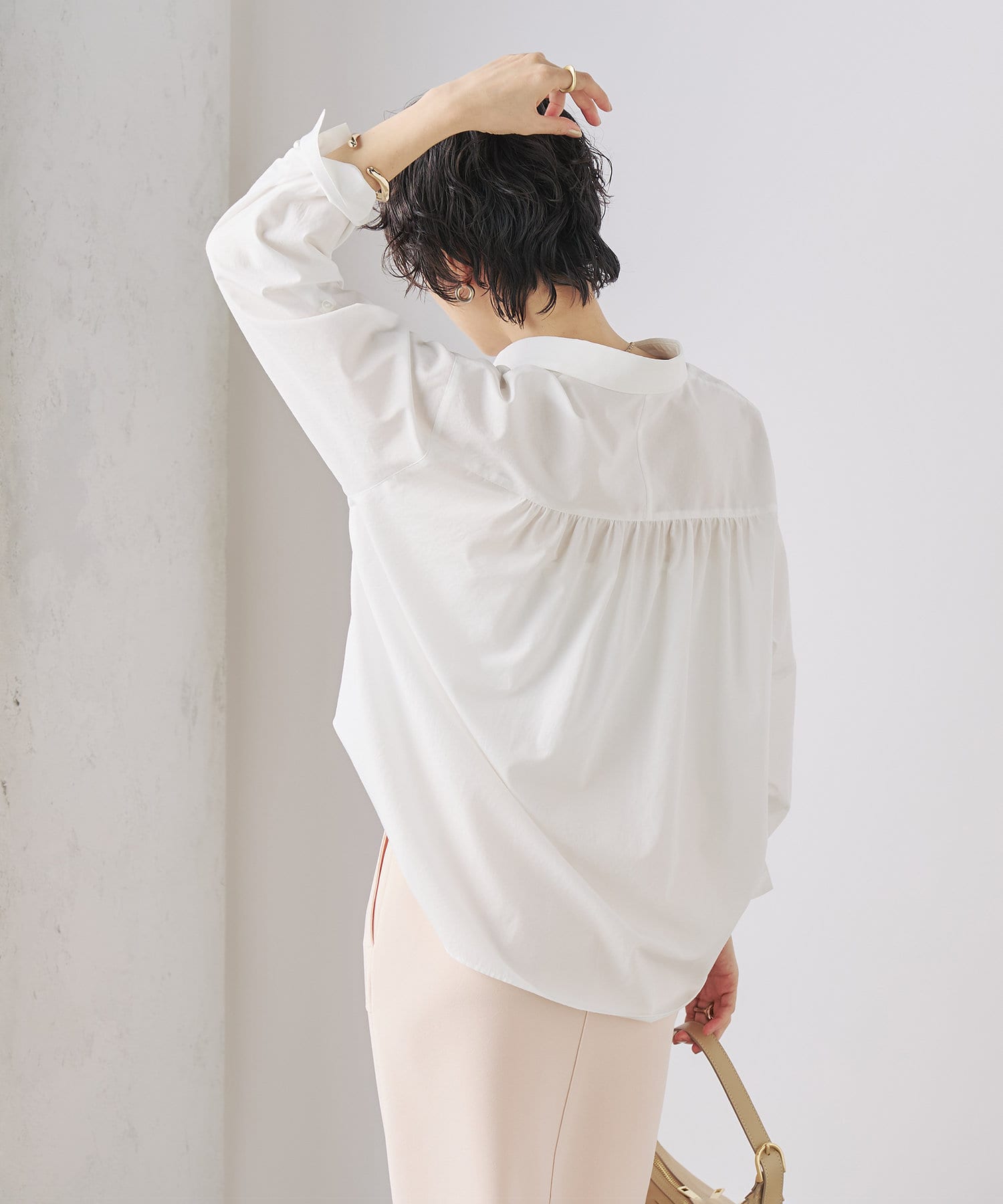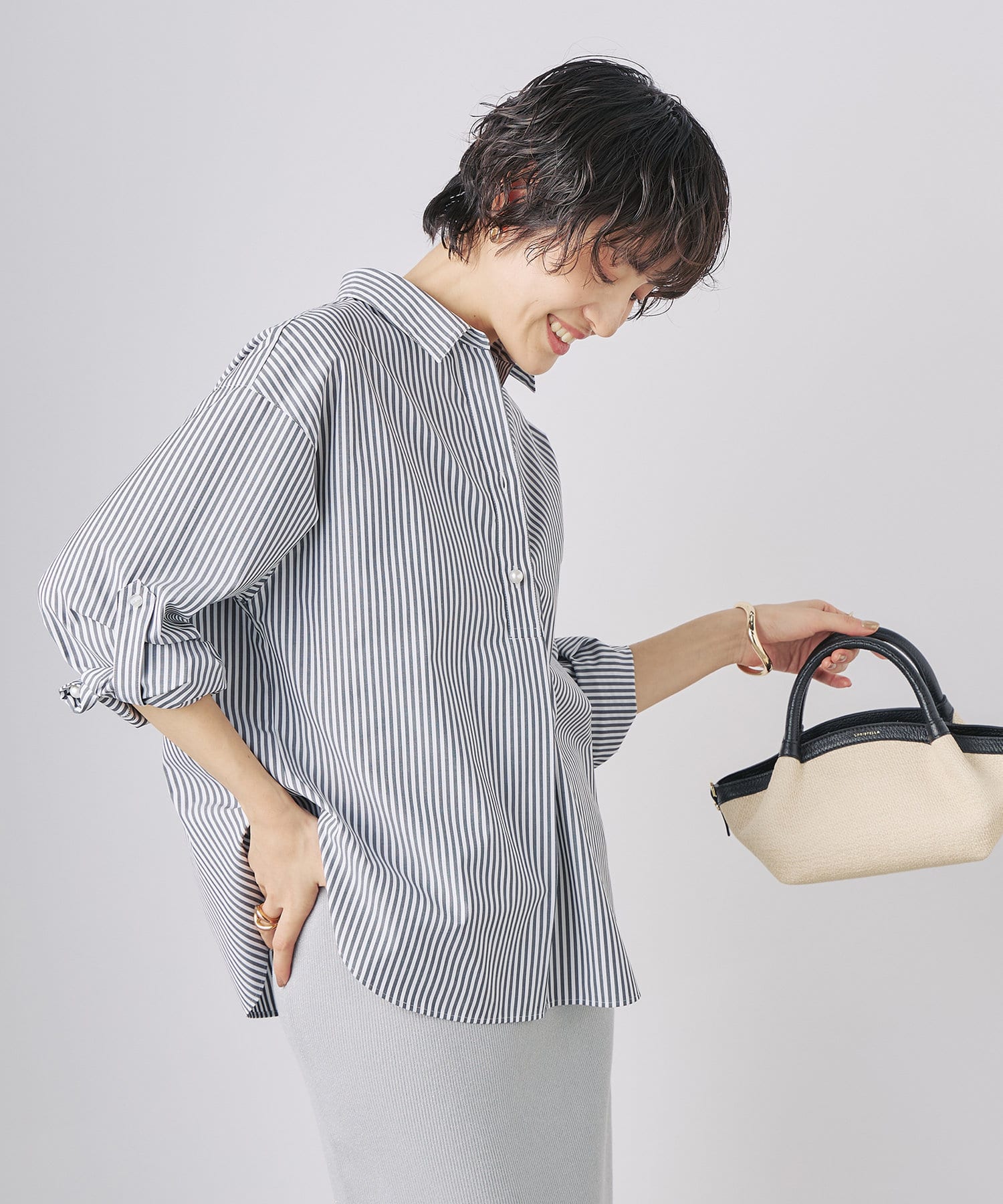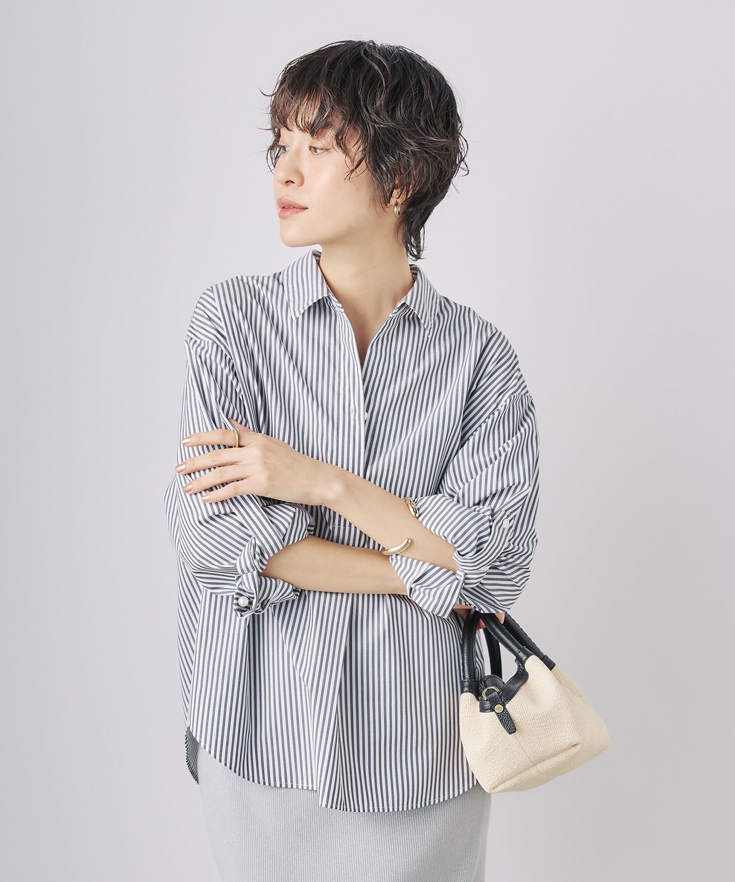 ・定番人気の大きめパール釦がポイントのスキッパーシャツ