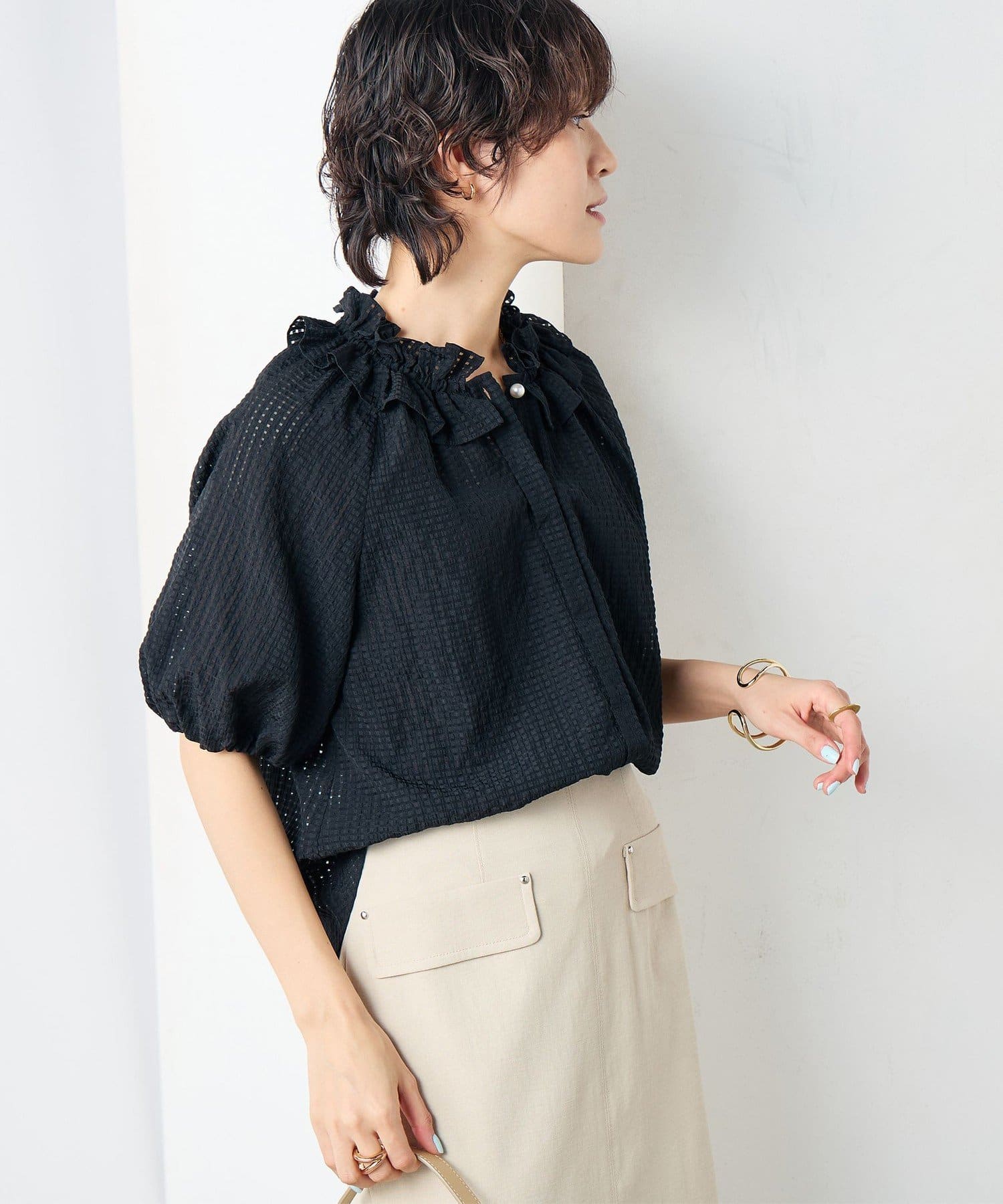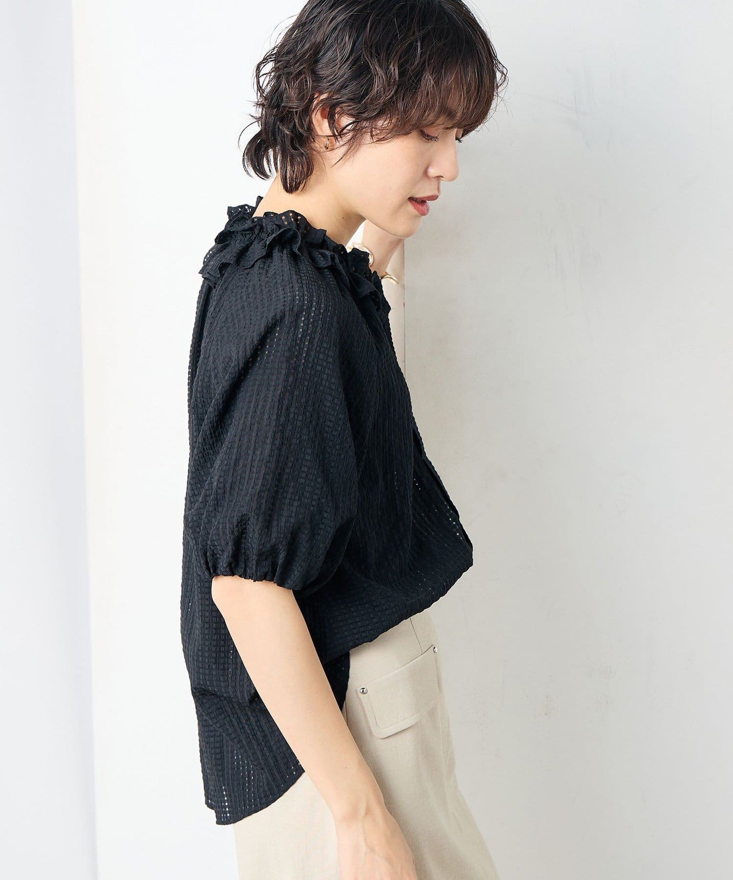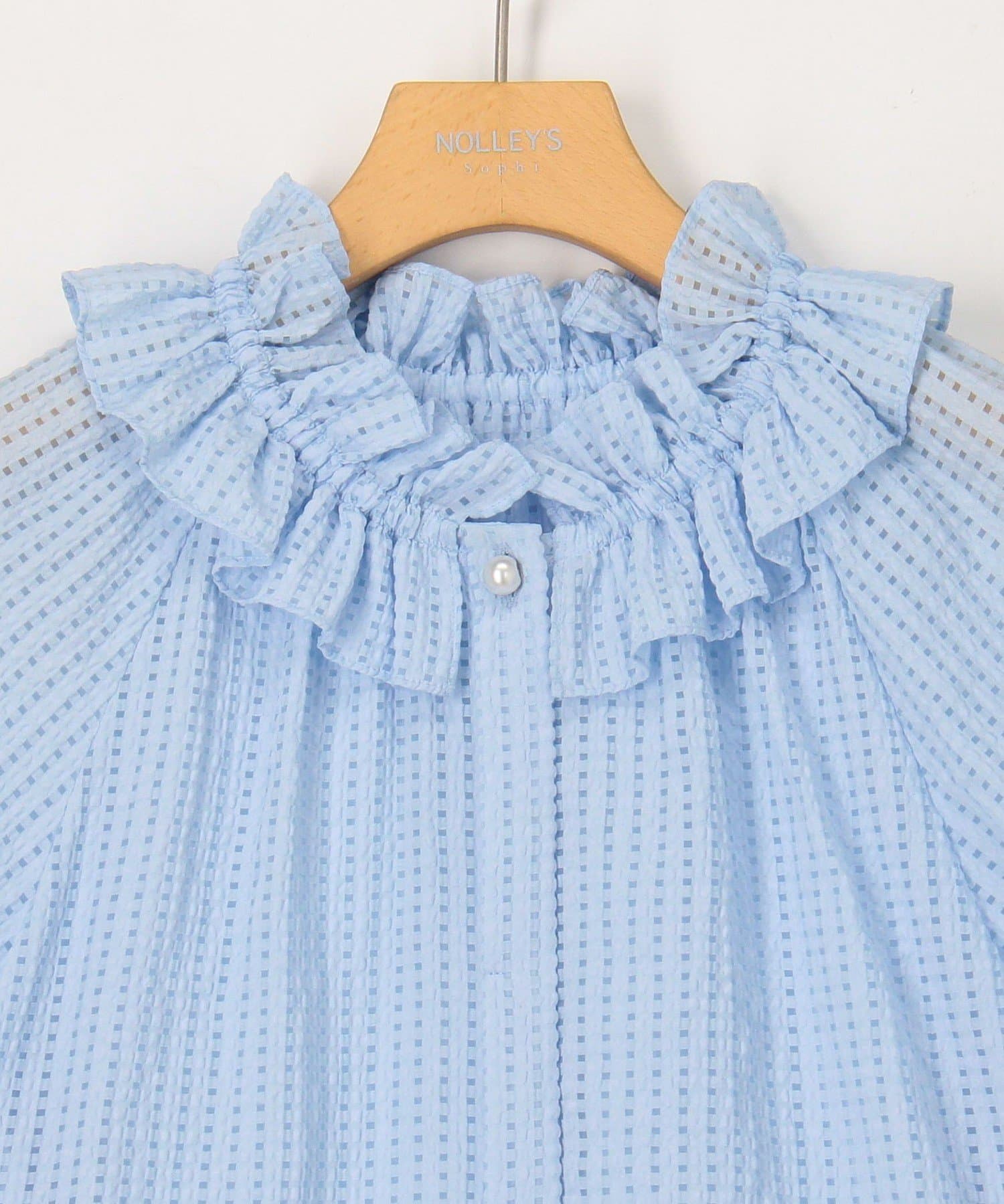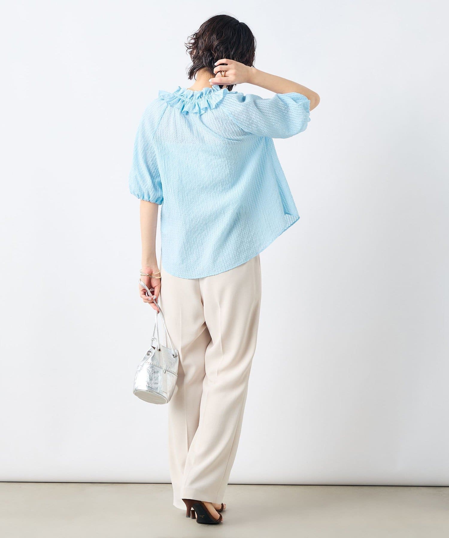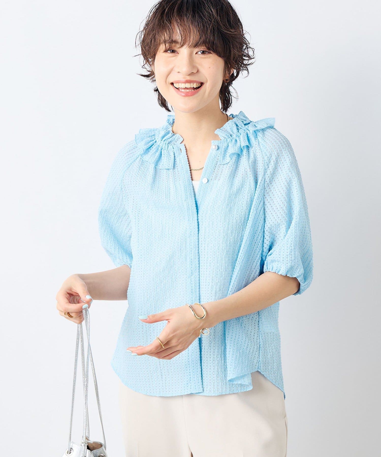 ・ポコポコとした凹凸のあるシアーサッカーチェック素材を使用したブラウス