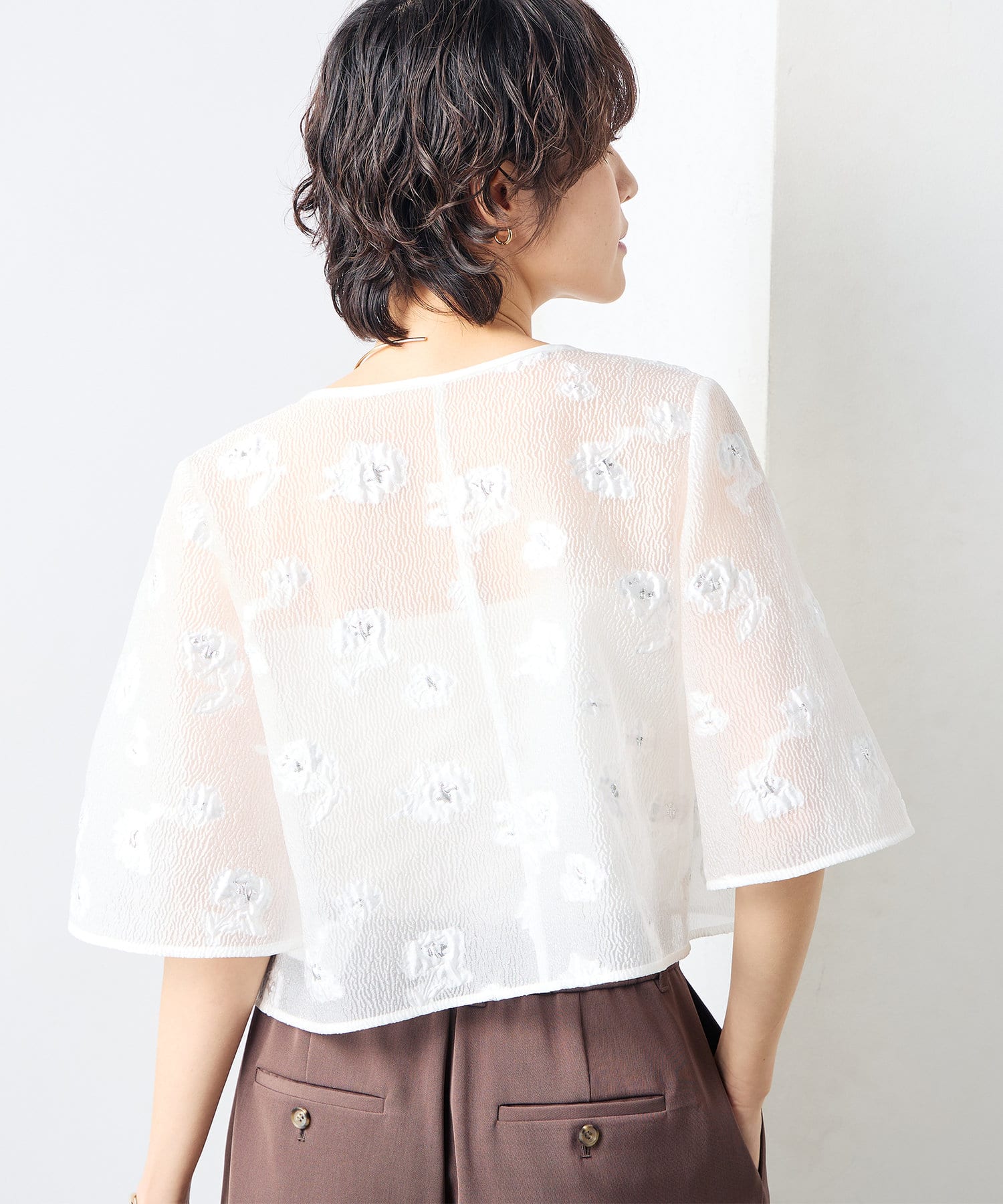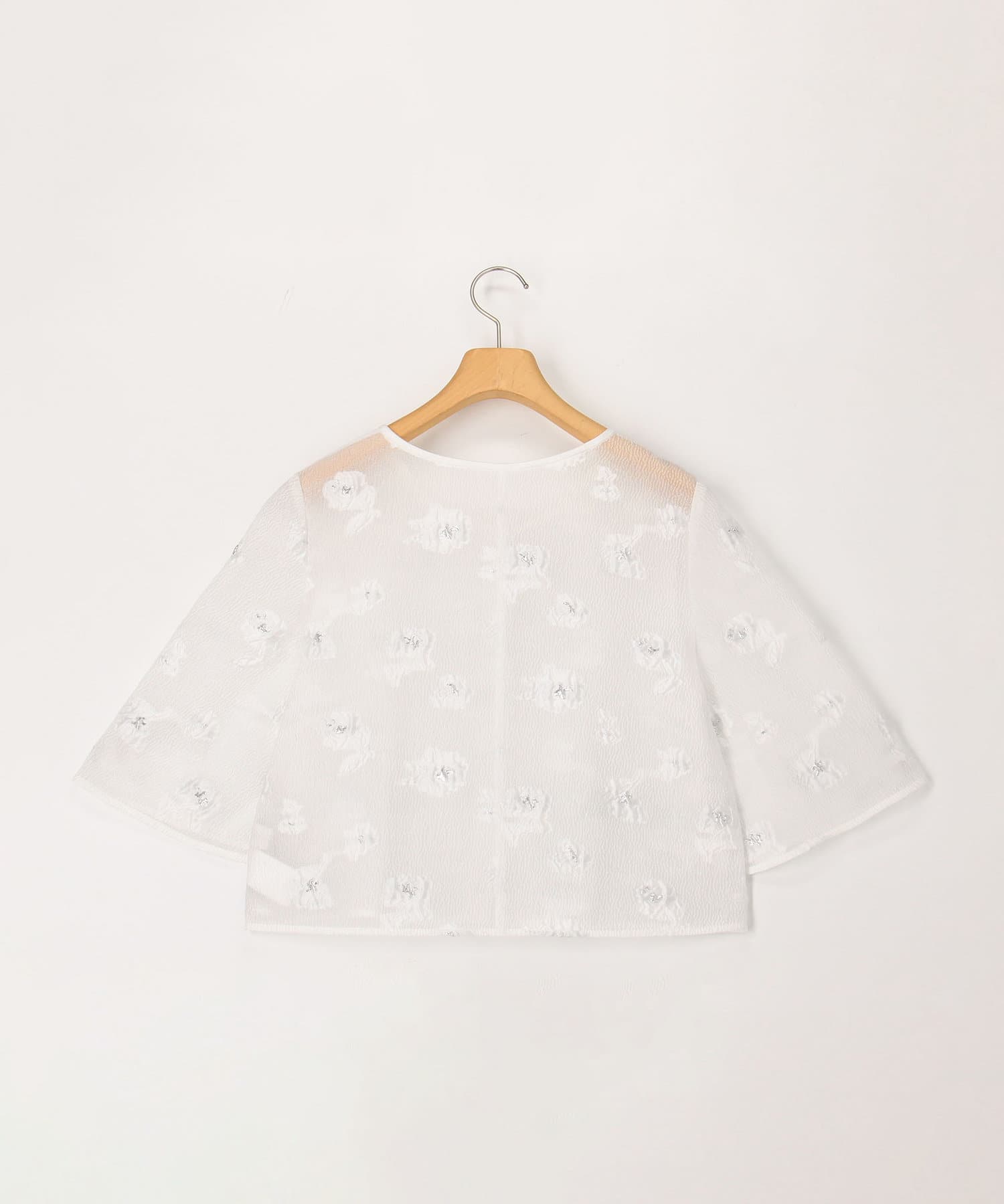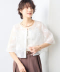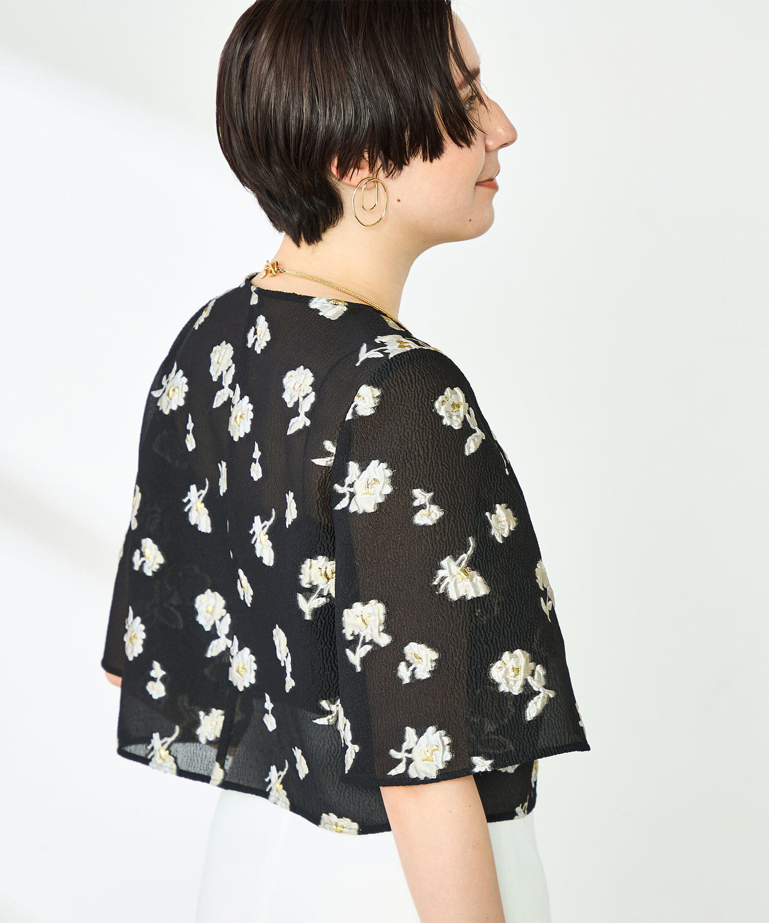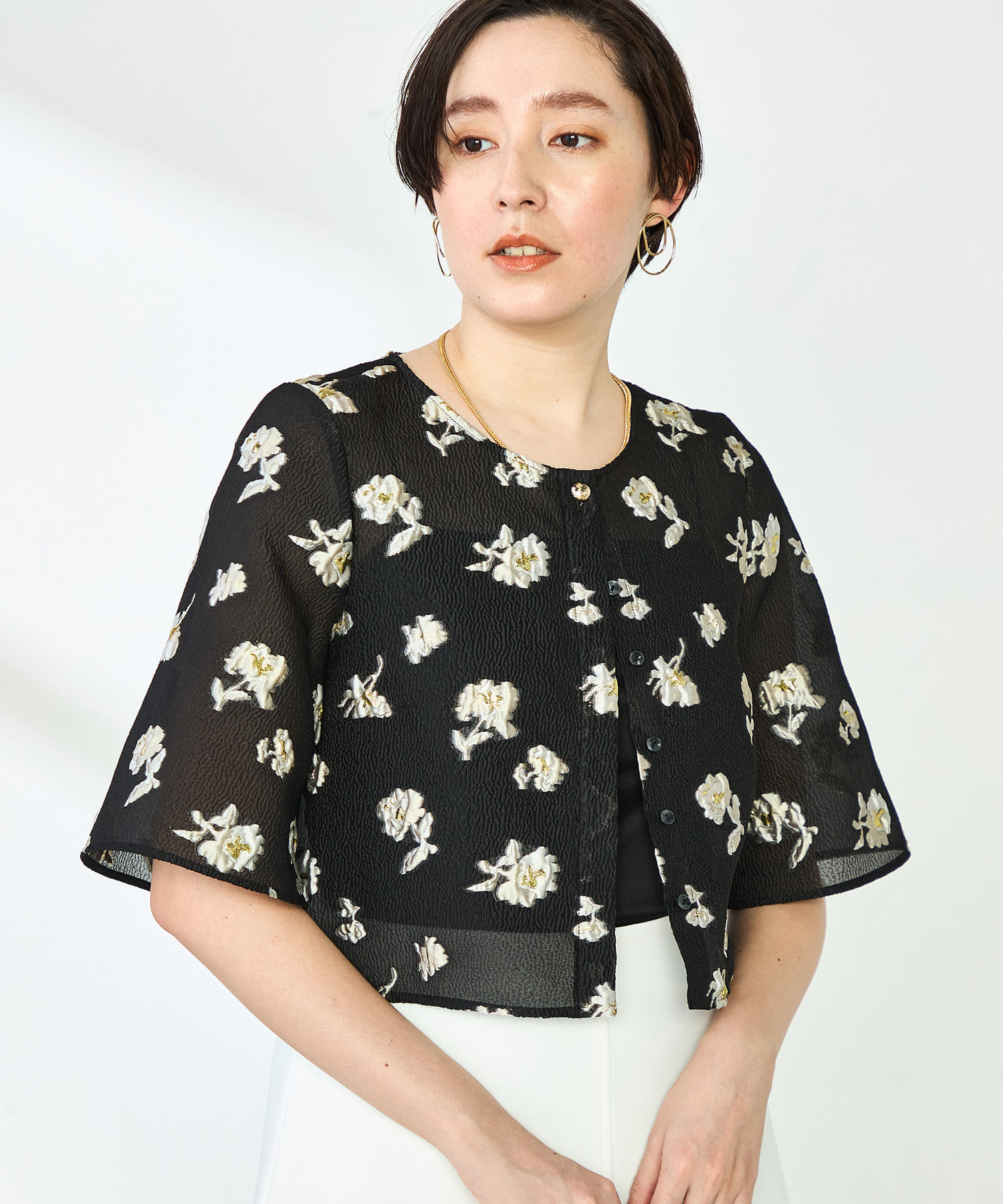 ・ラメ混の大きめフラワー柄が目を引くカットジャガード素材のボレロブラウス