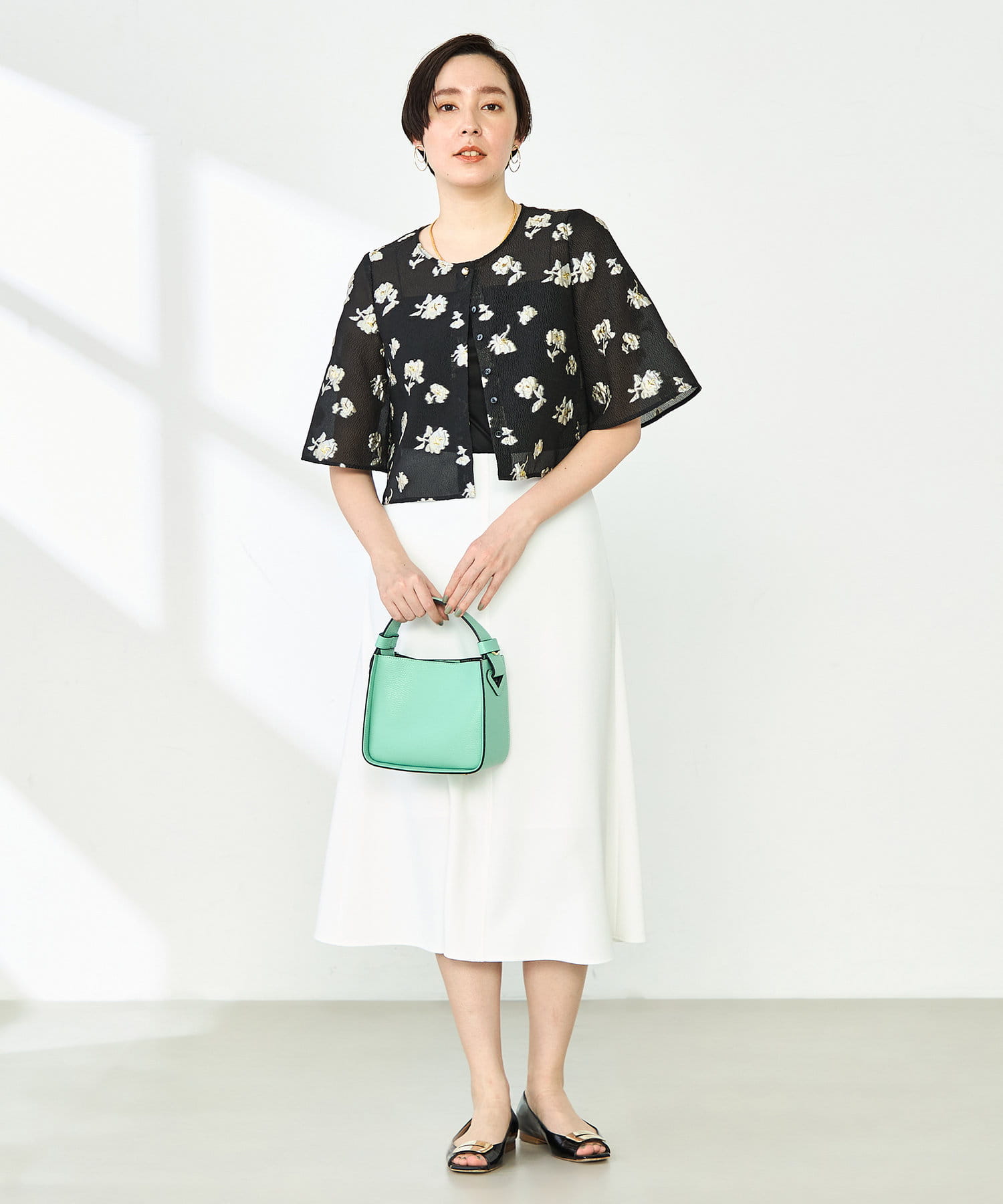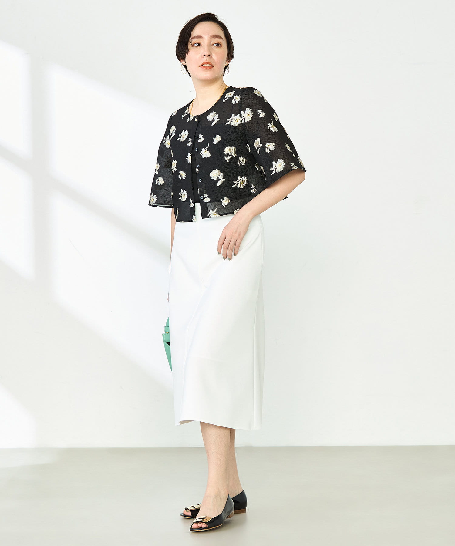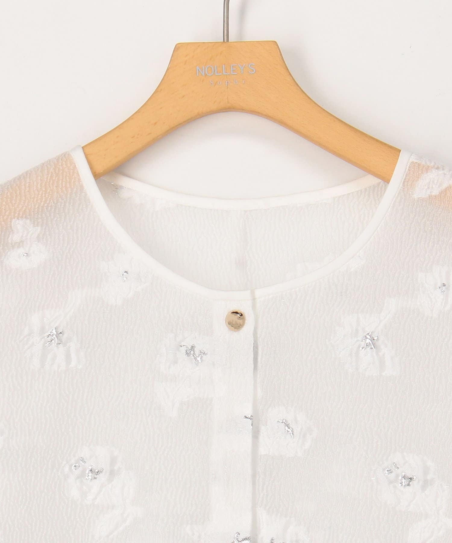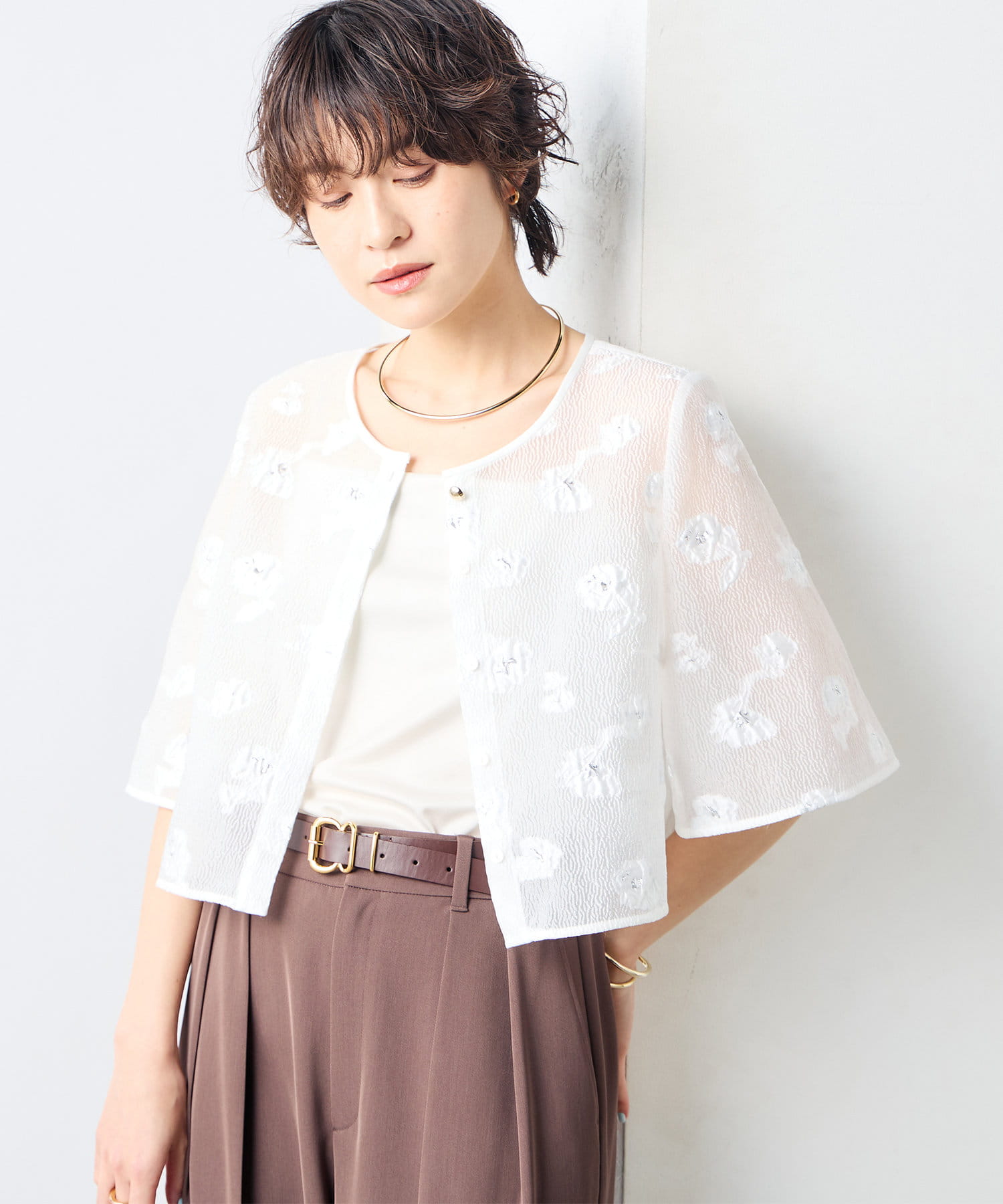 ・ラメ混の大きめフラワー柄が目を引くカットジャガード素材のボレロブラウス