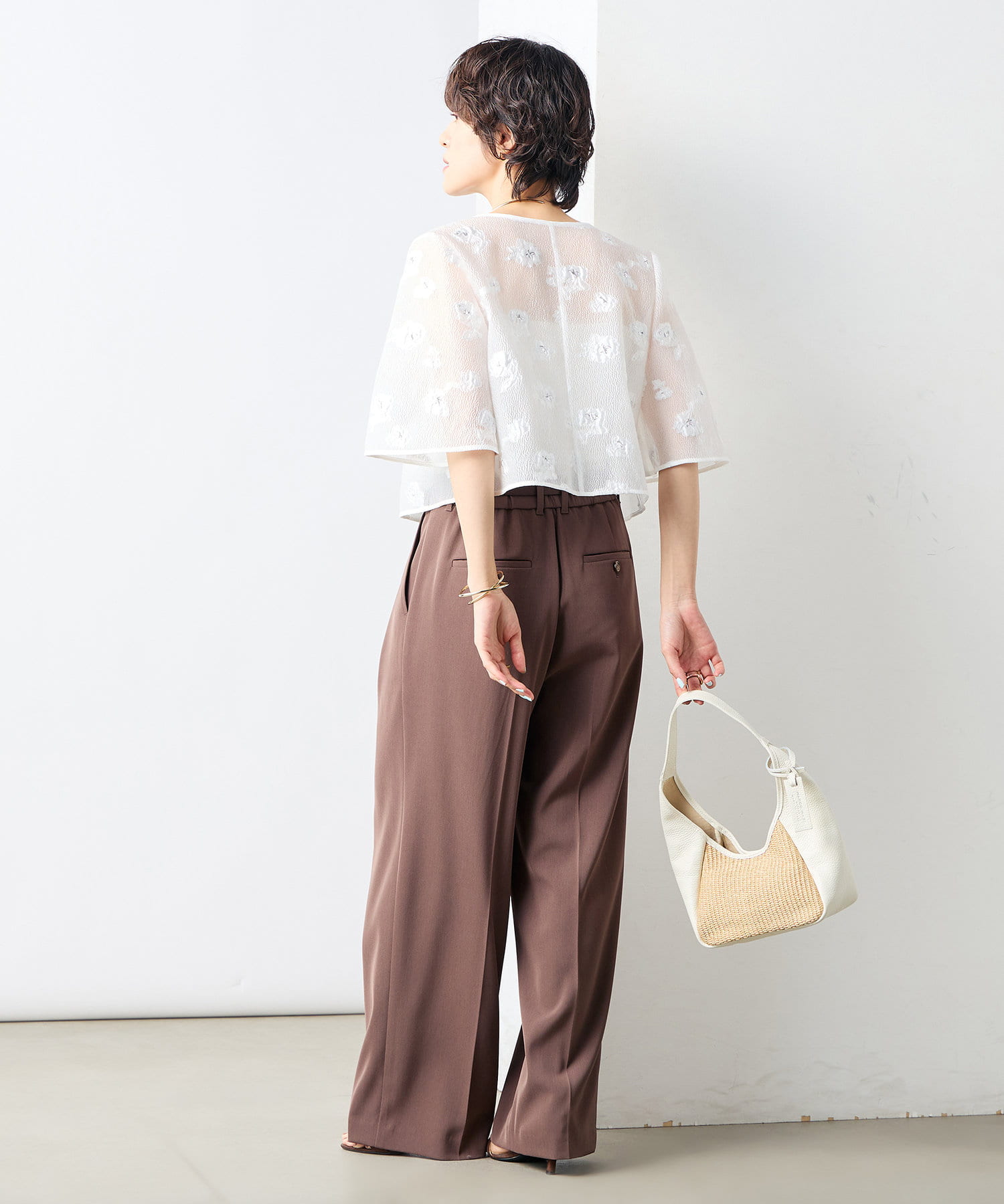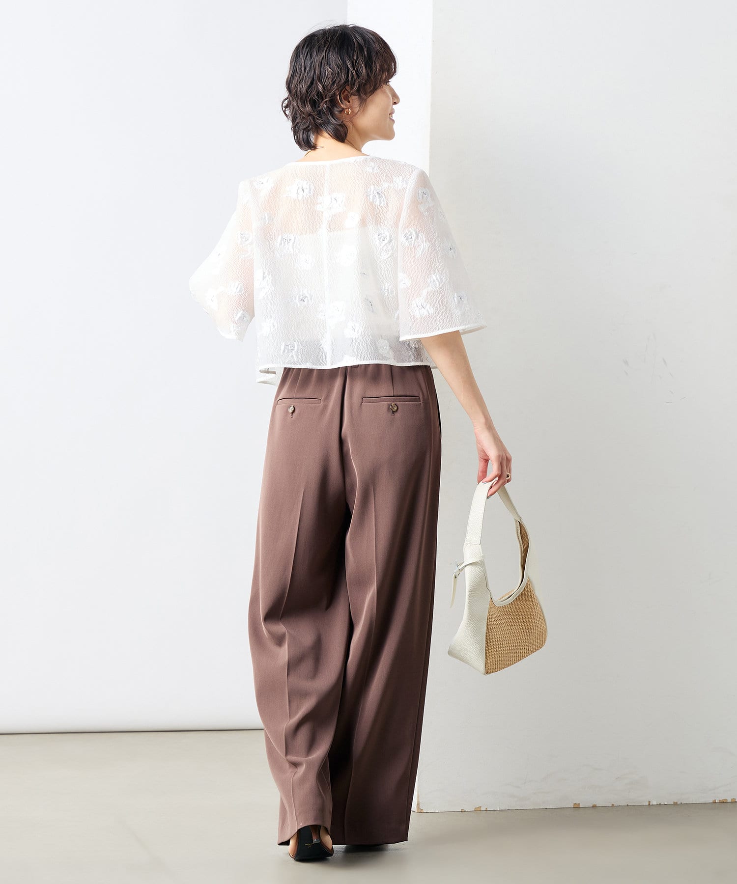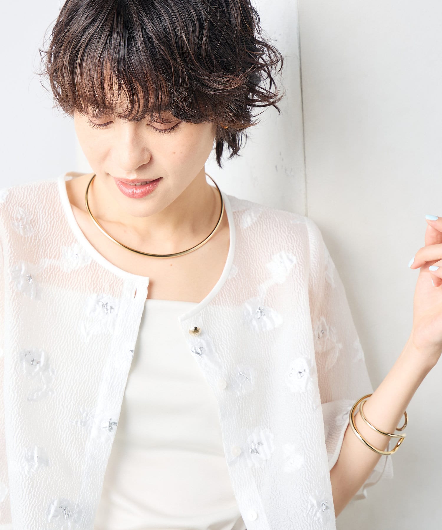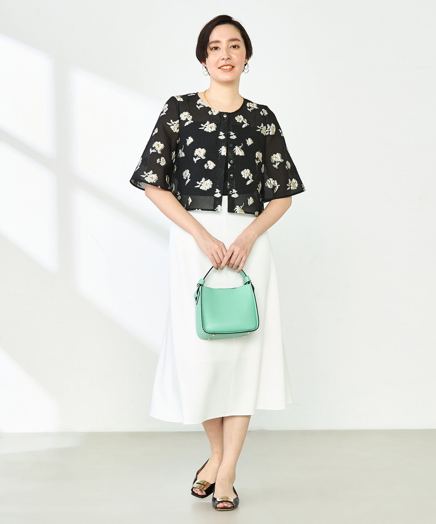 ・ラメ混の大きめフラワー柄が目を引くカットジャガード素材のボレロブラウス