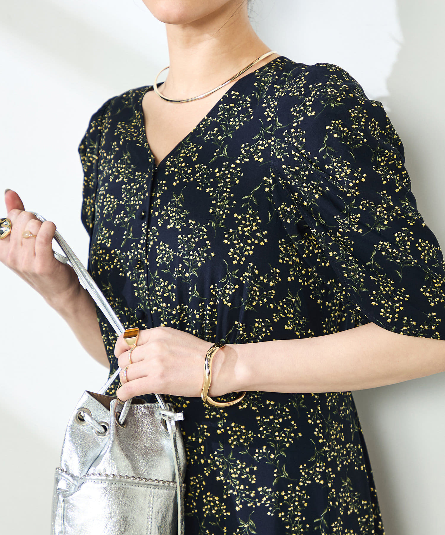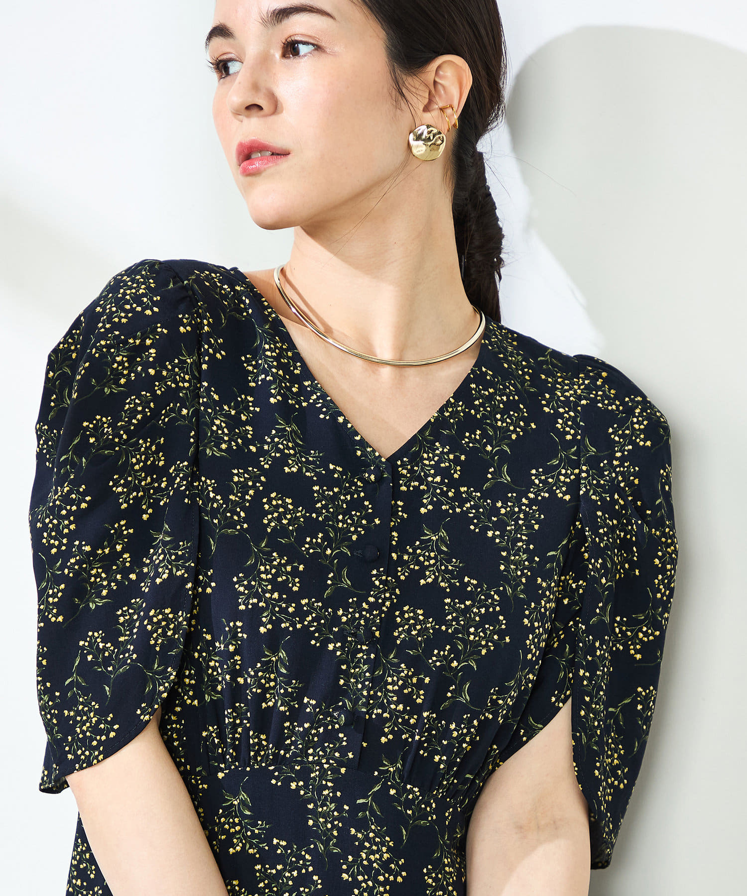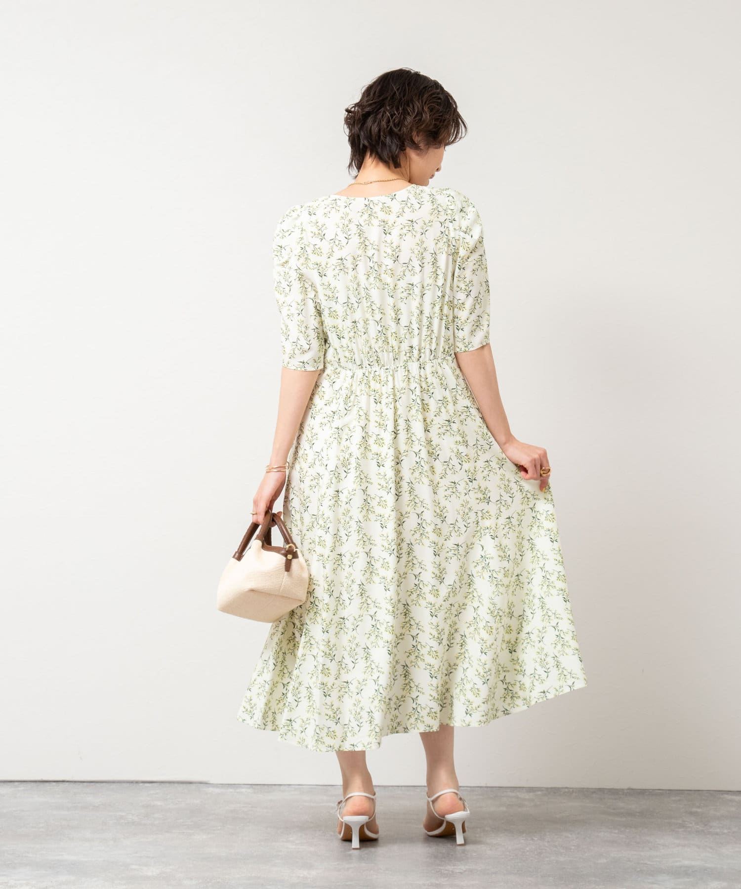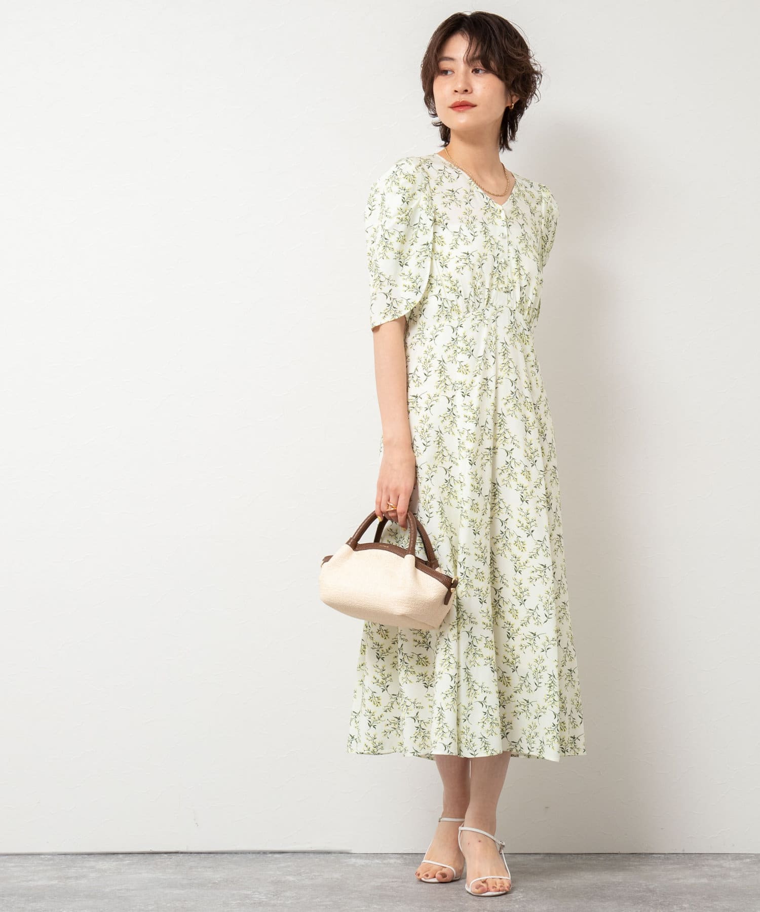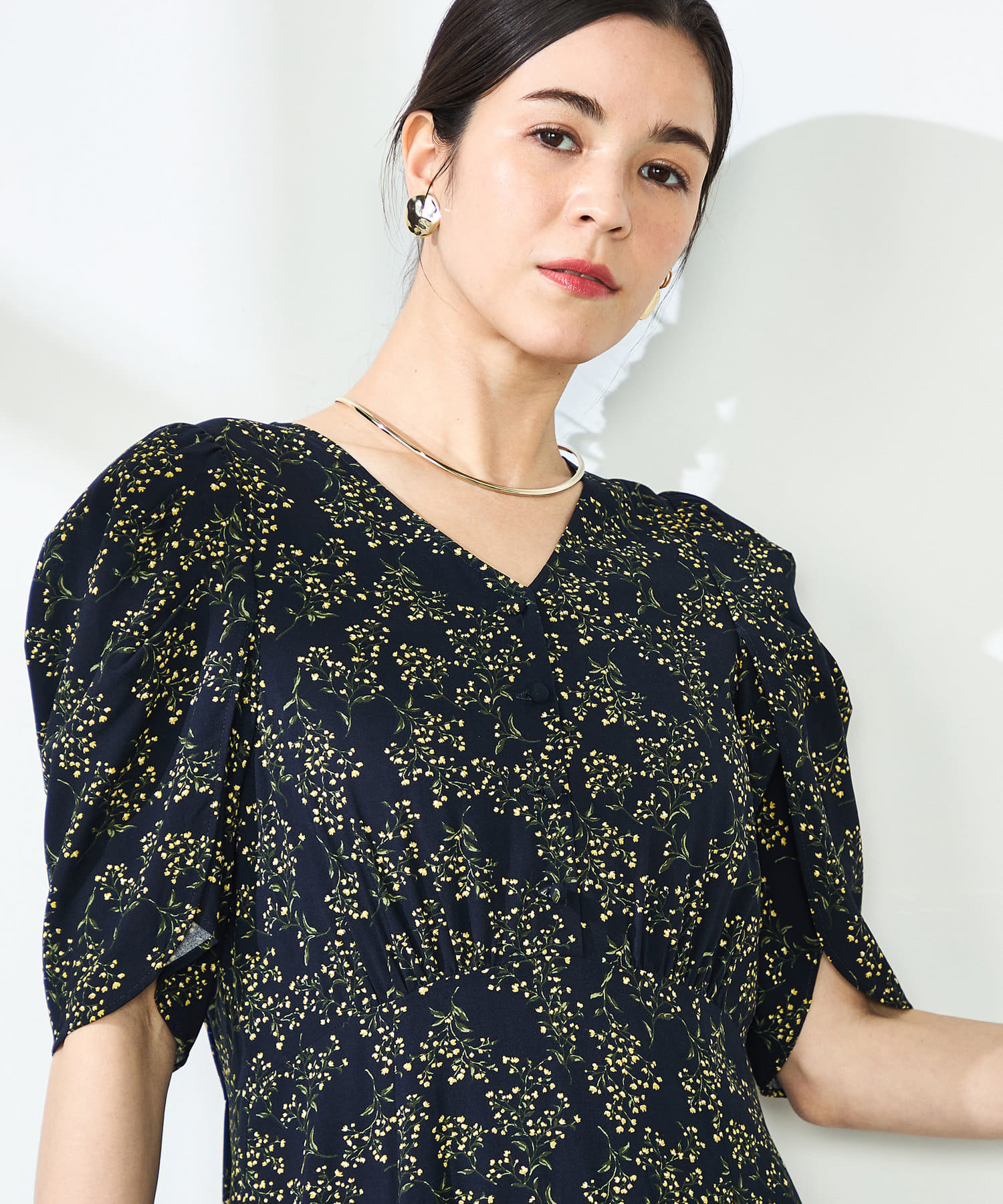 ミモザプリントチューリップスリーブワンピース