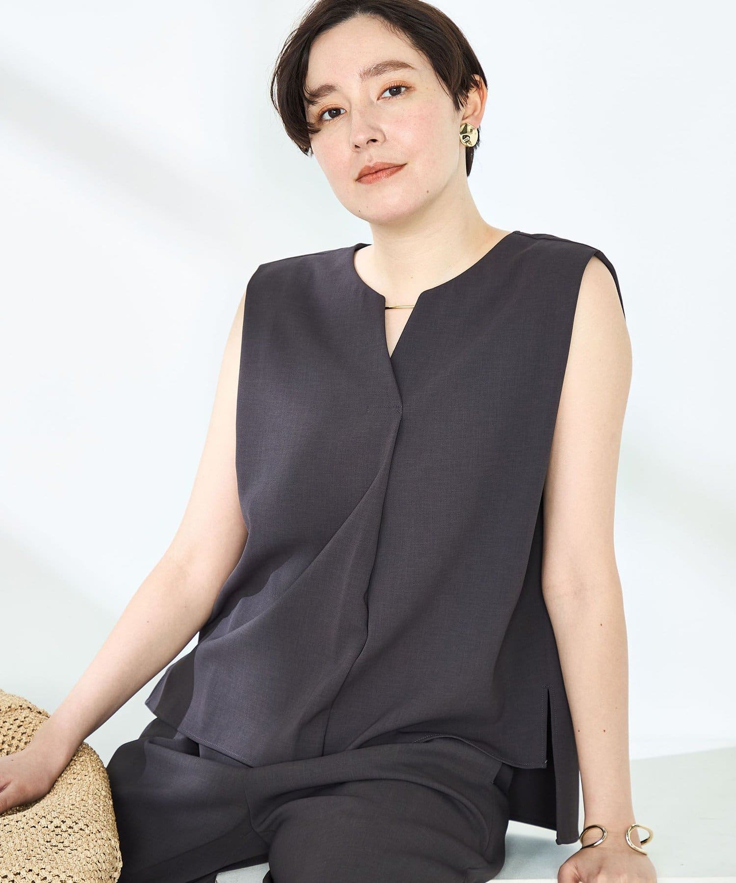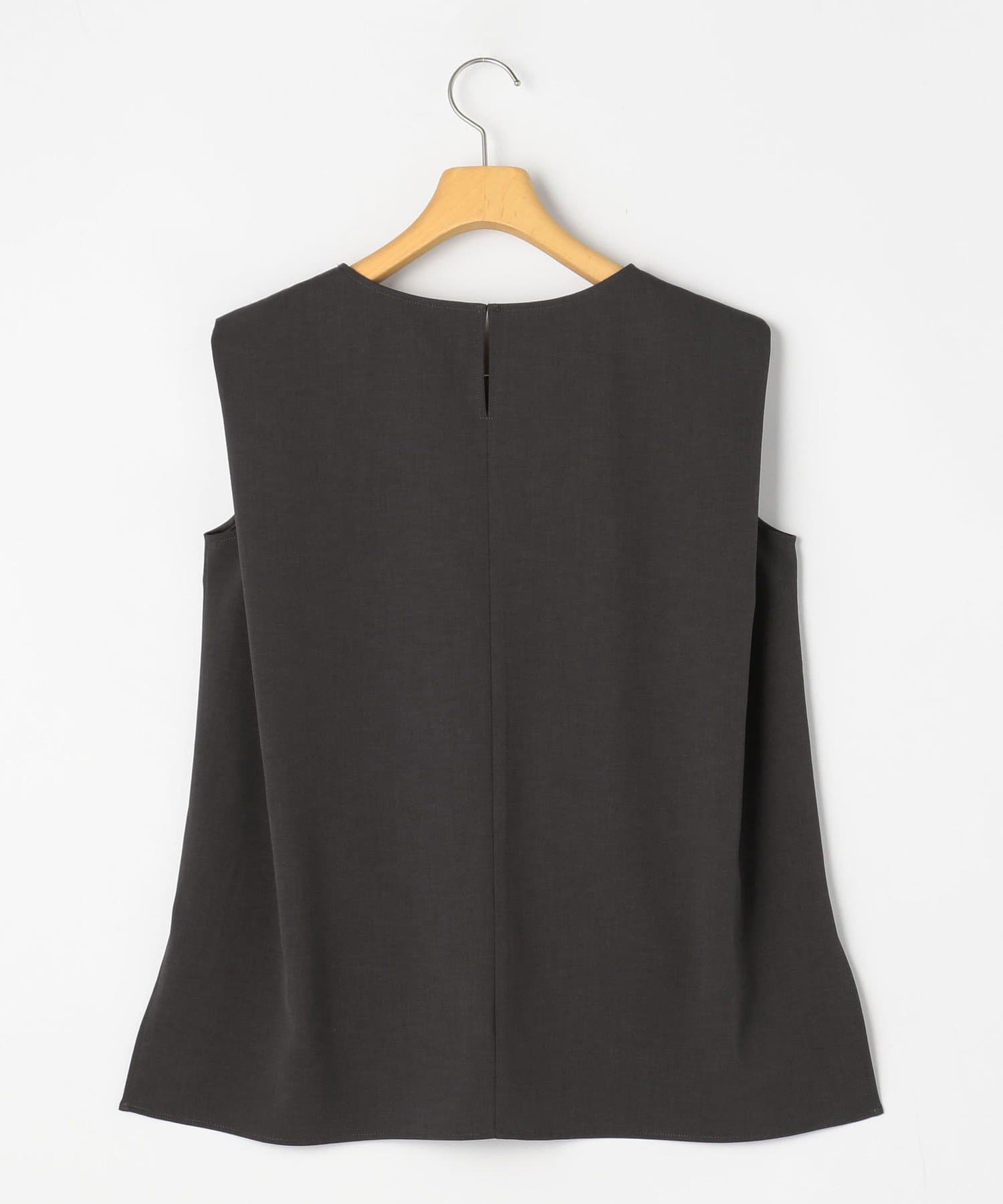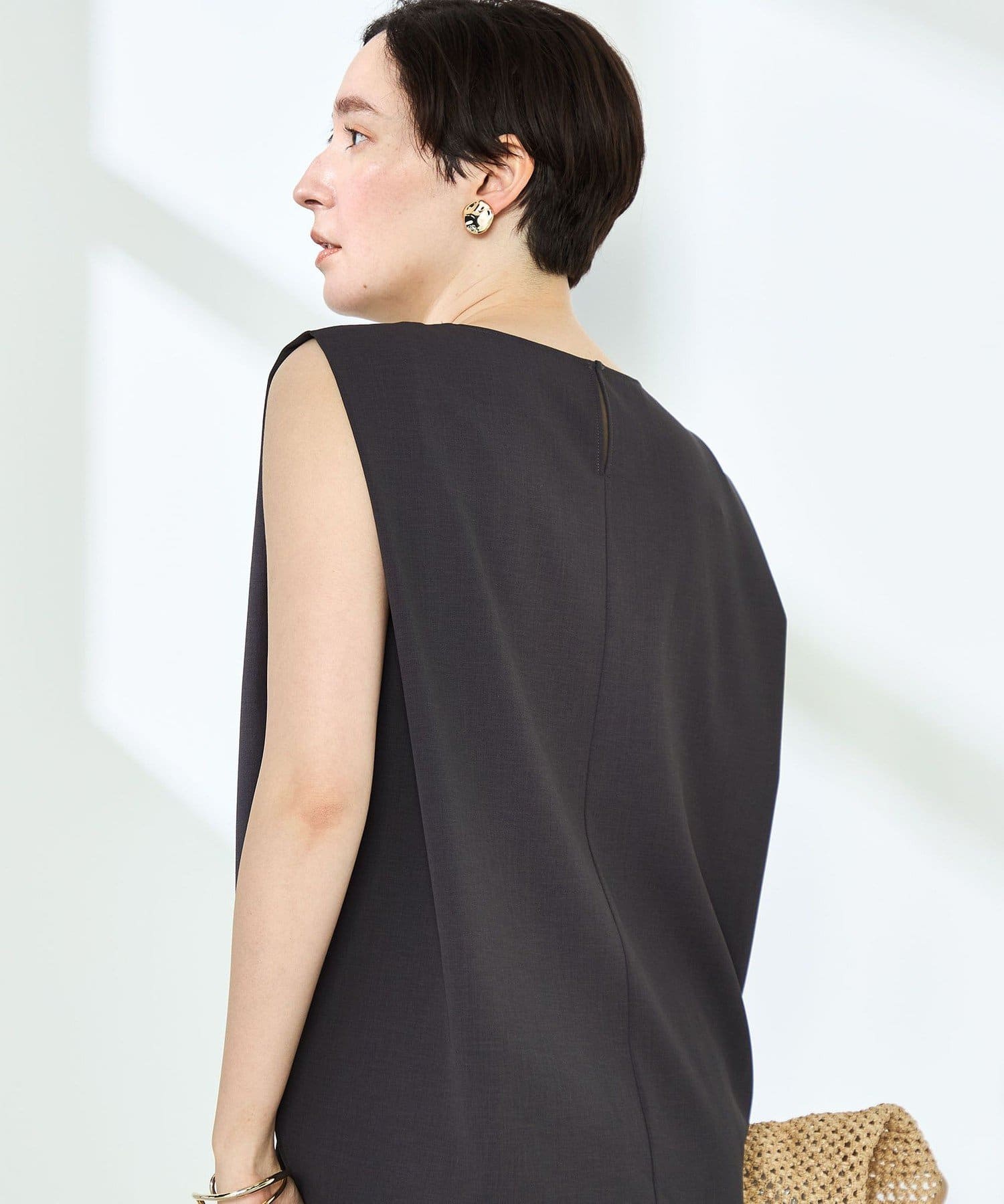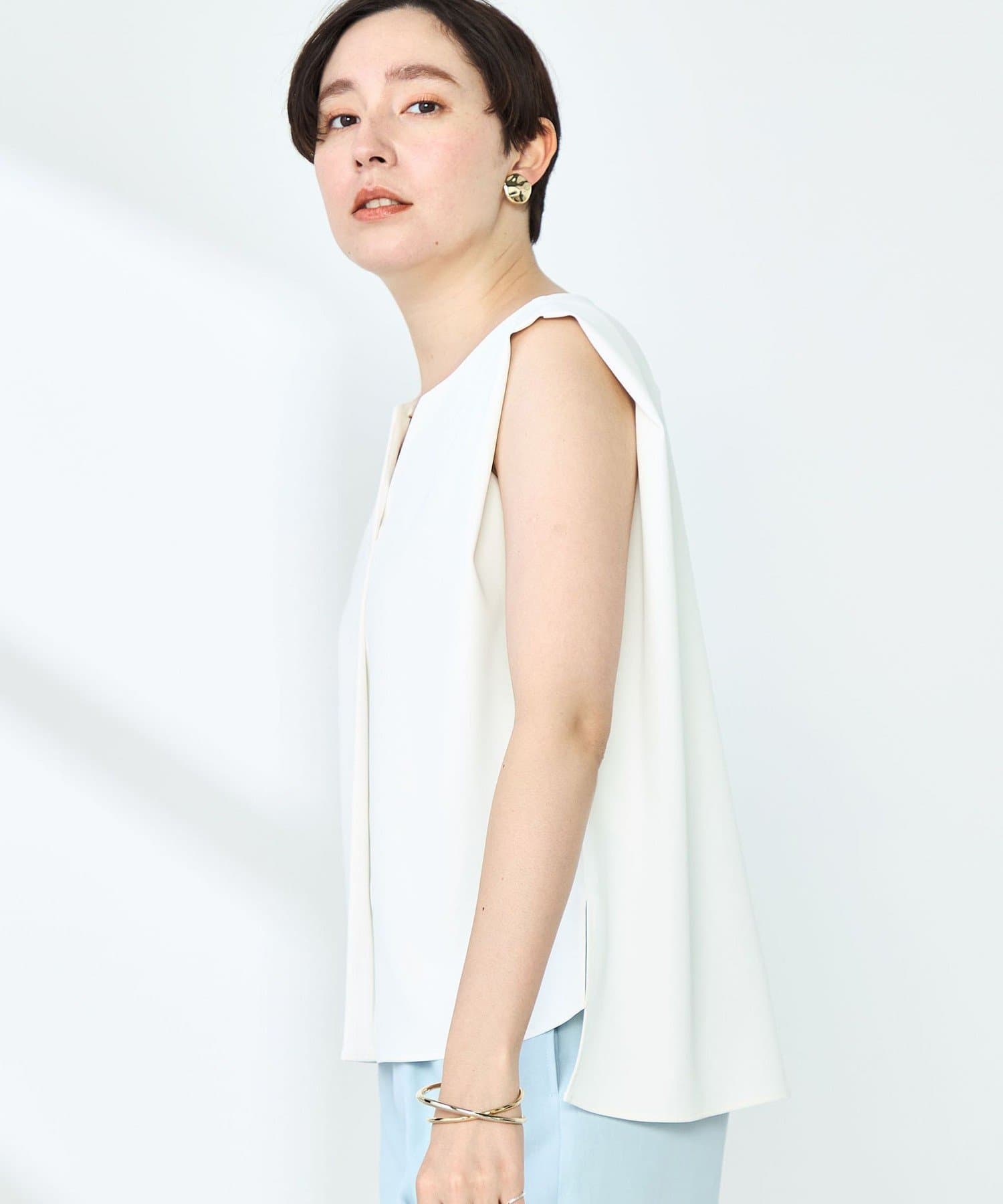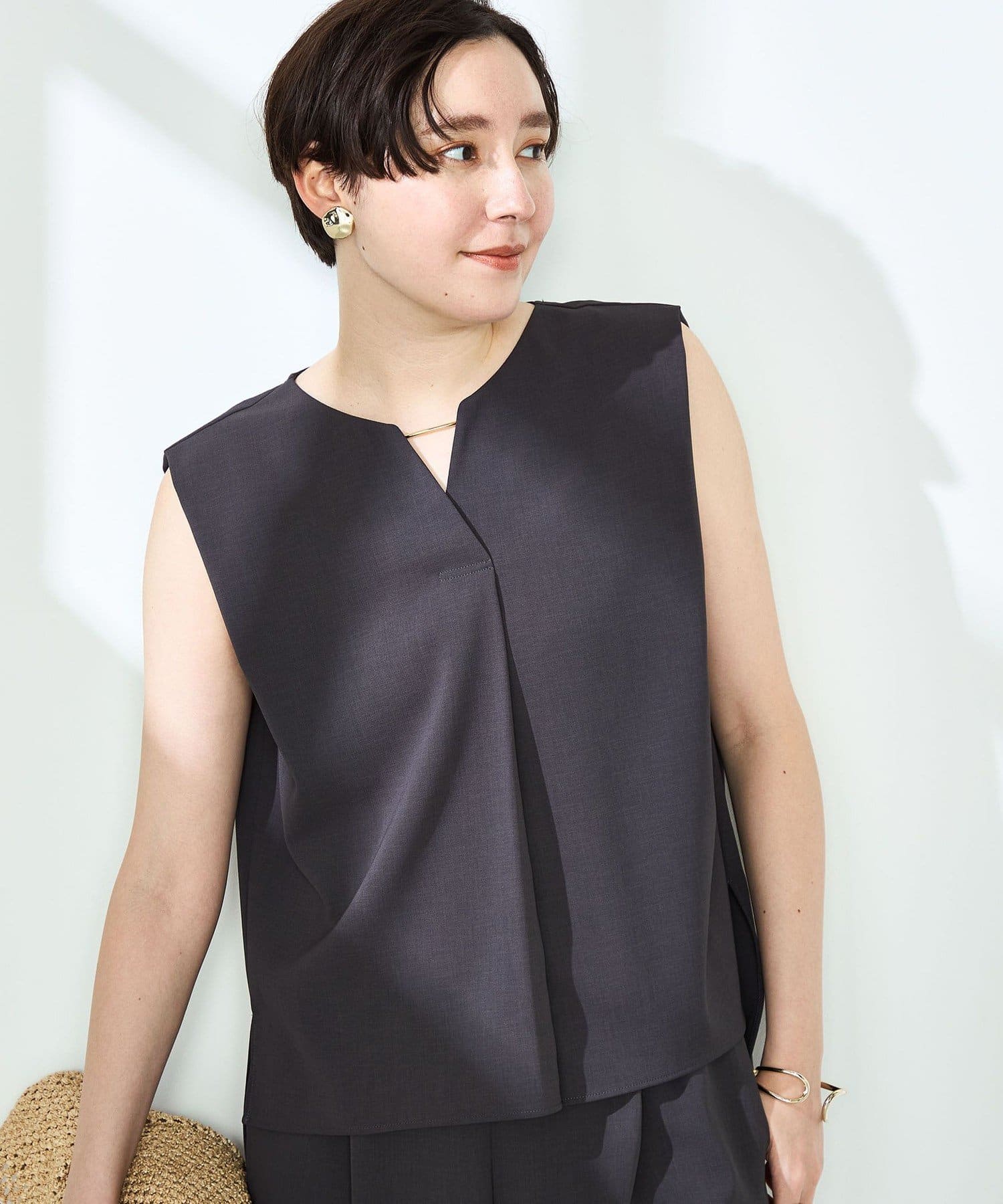 ・梳毛調合繊素材を使用したタック入りキーネックのノースリーブブブラウス