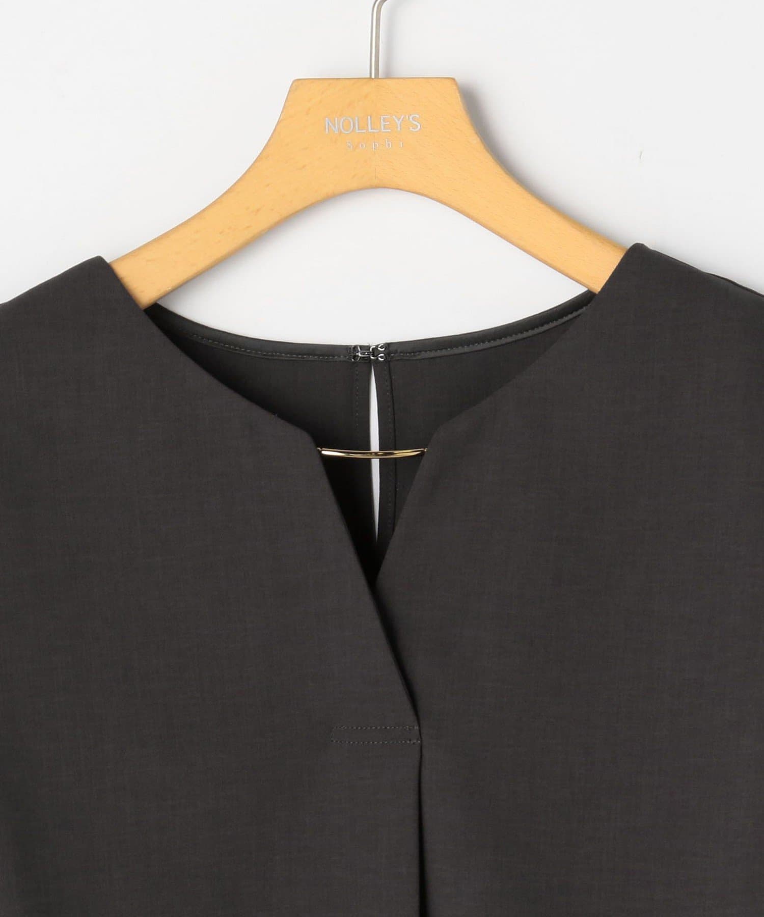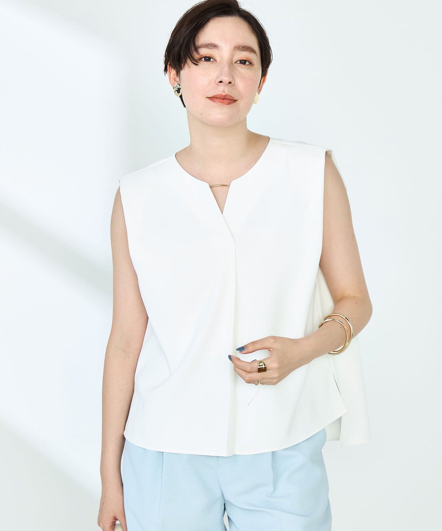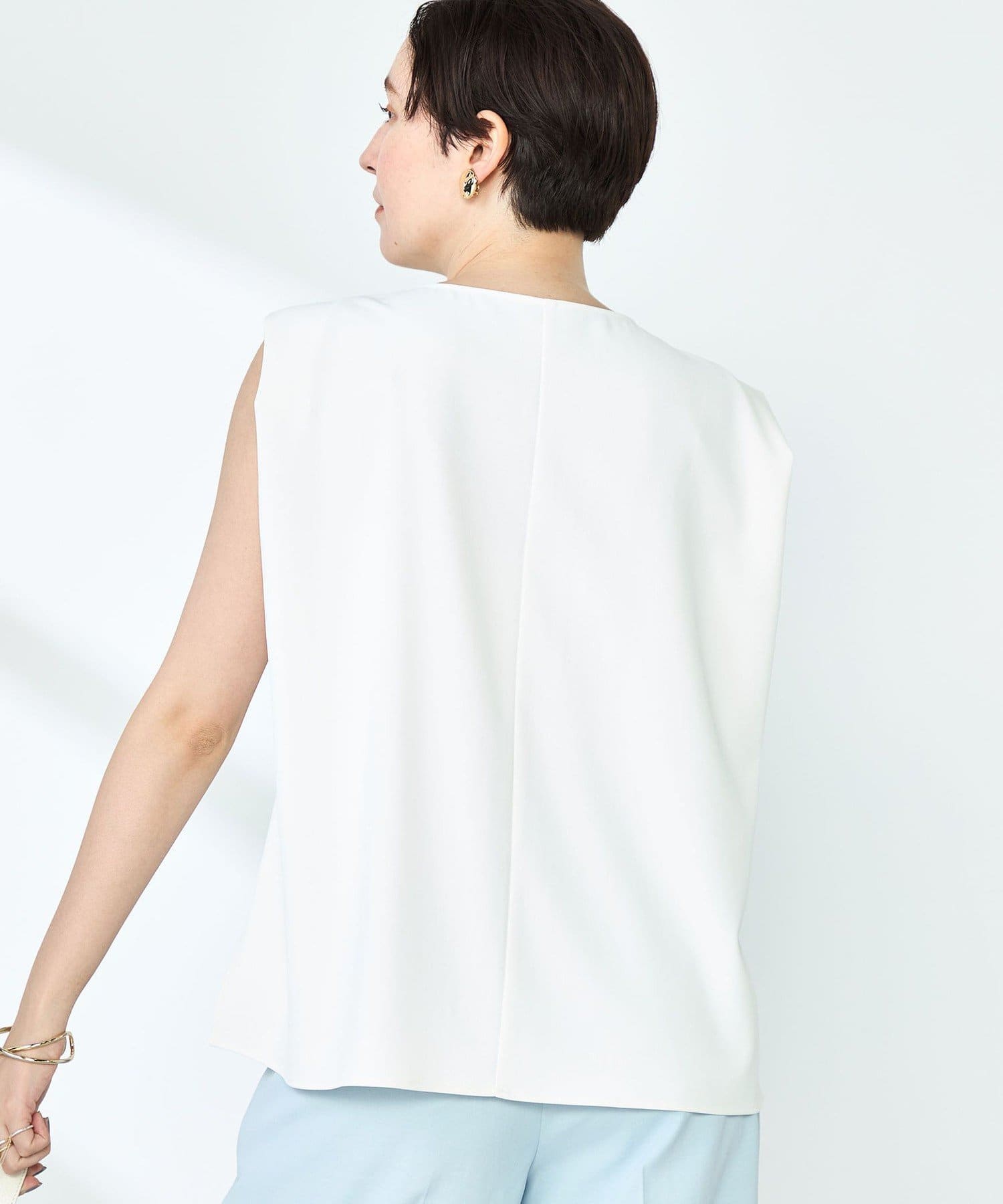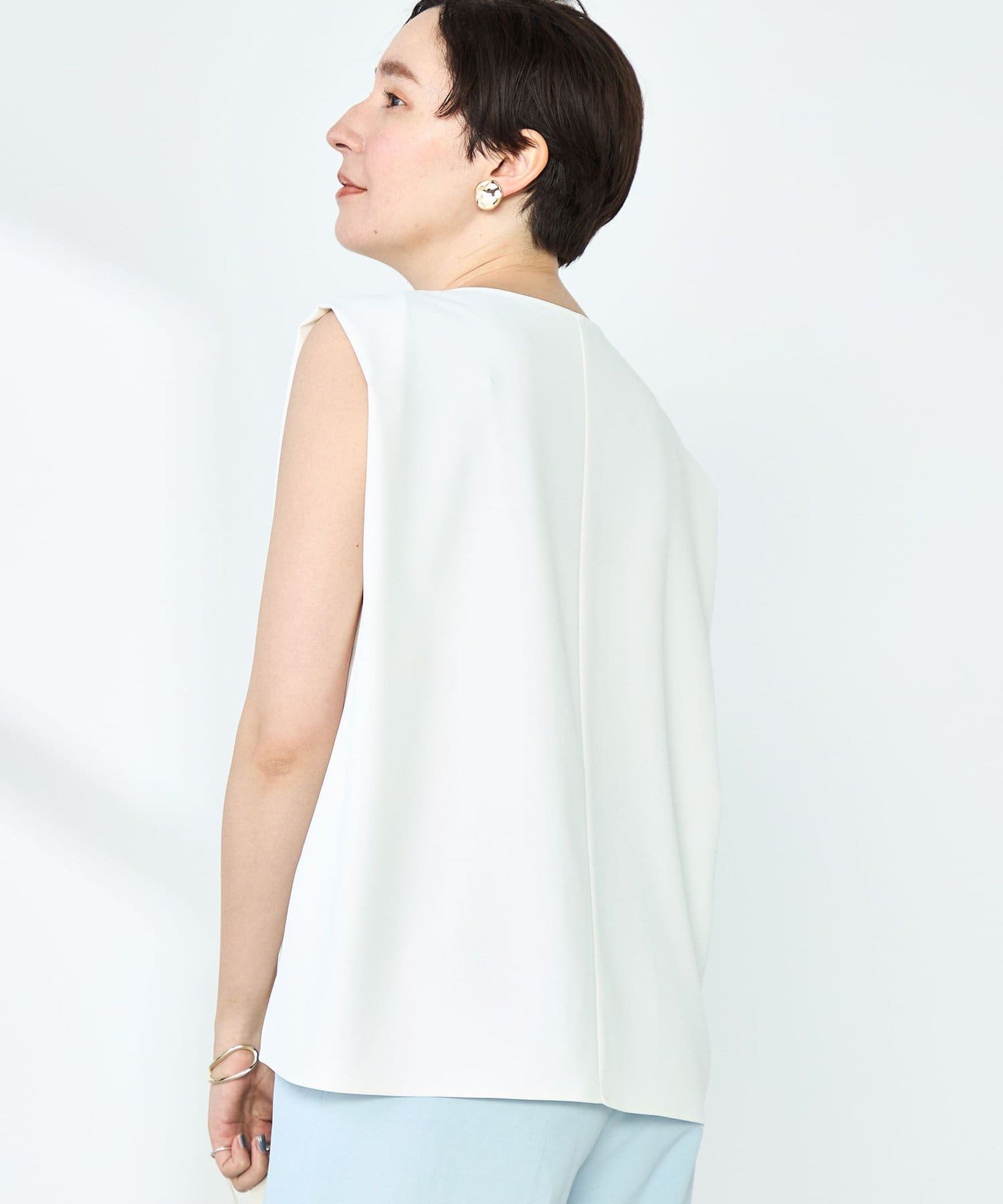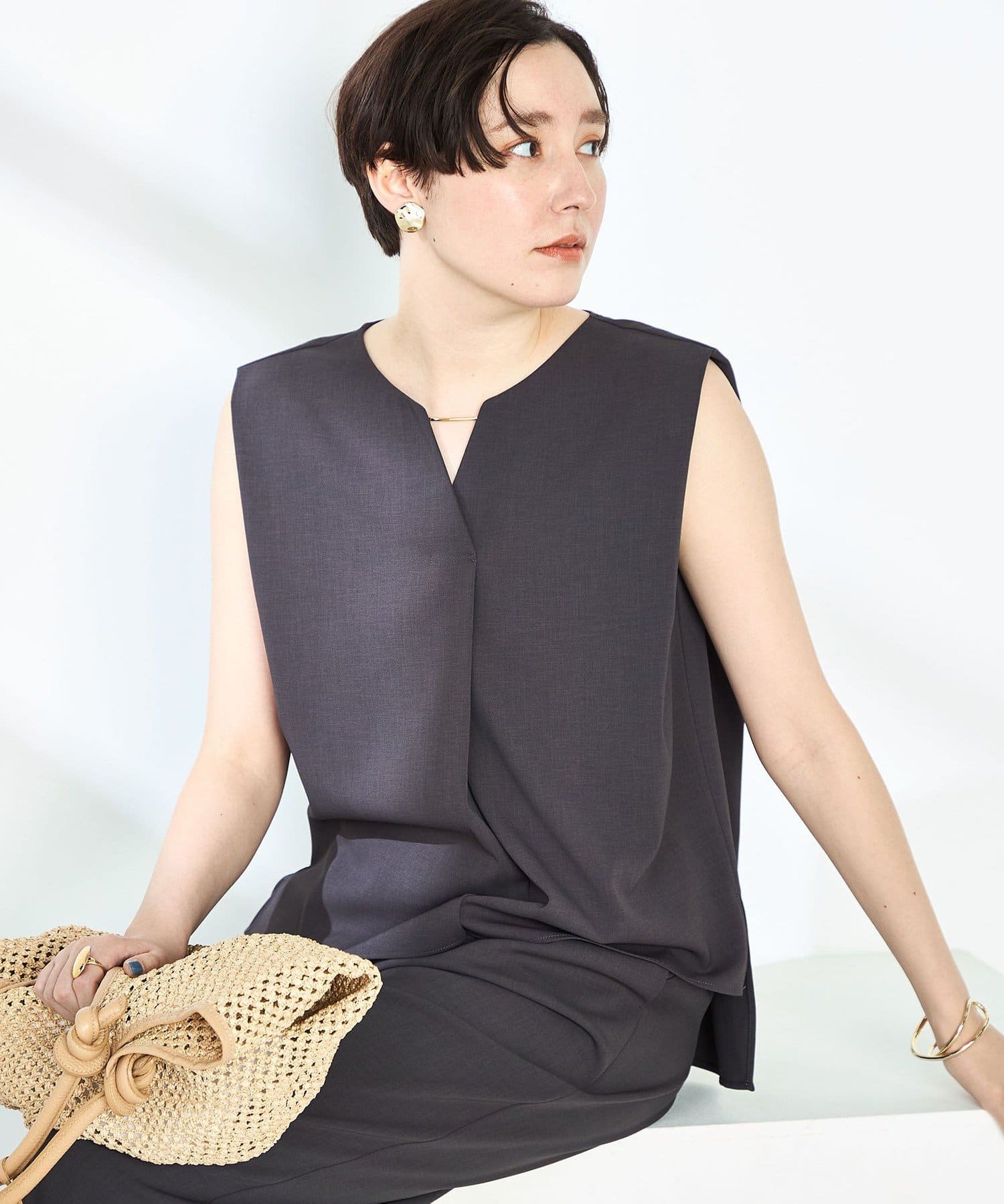・梳毛調合繊素材を使用したタック入りキーネックのノースリーブブブラウス