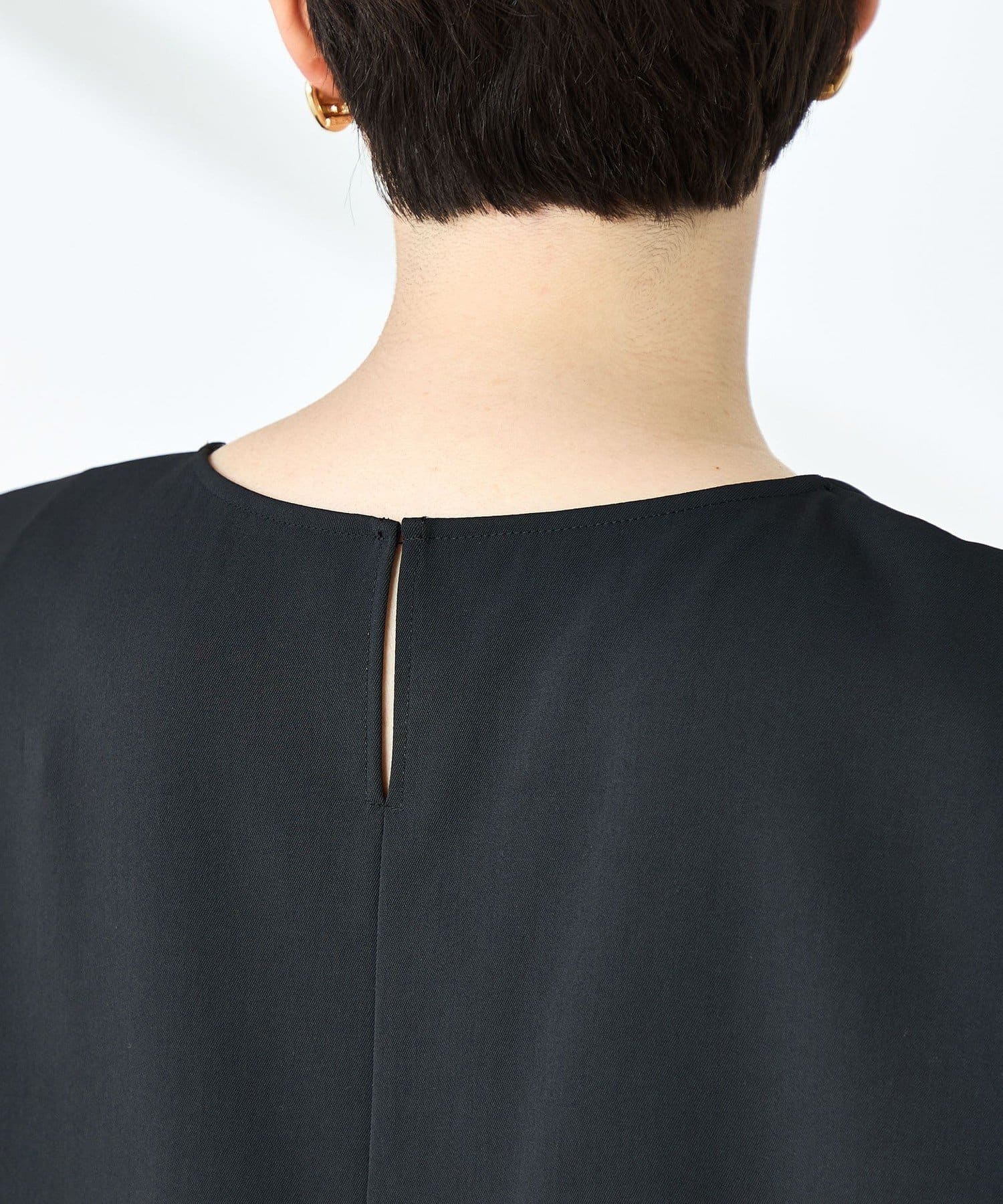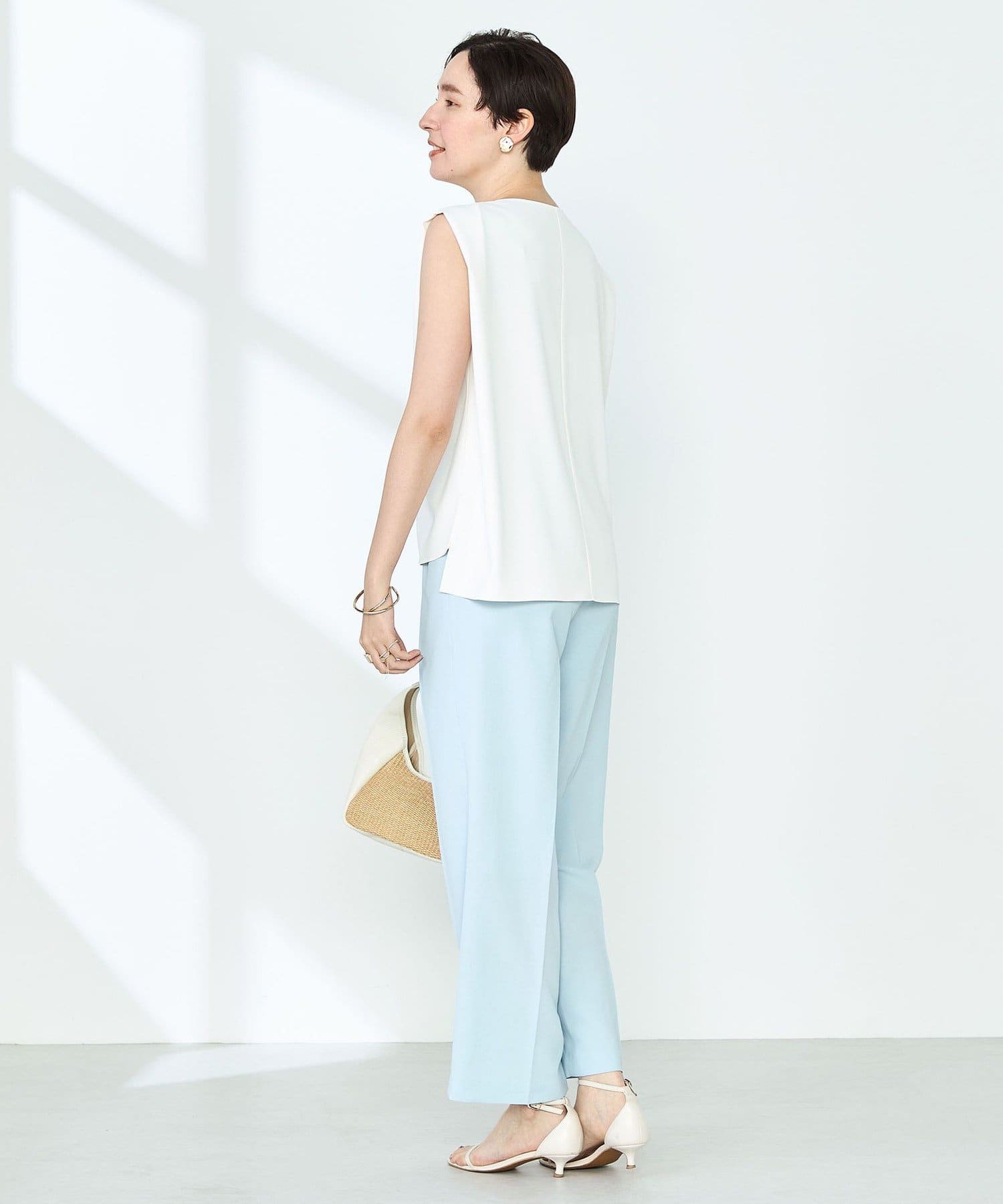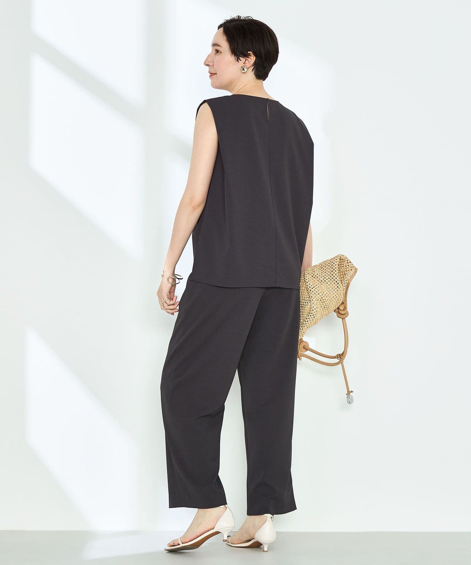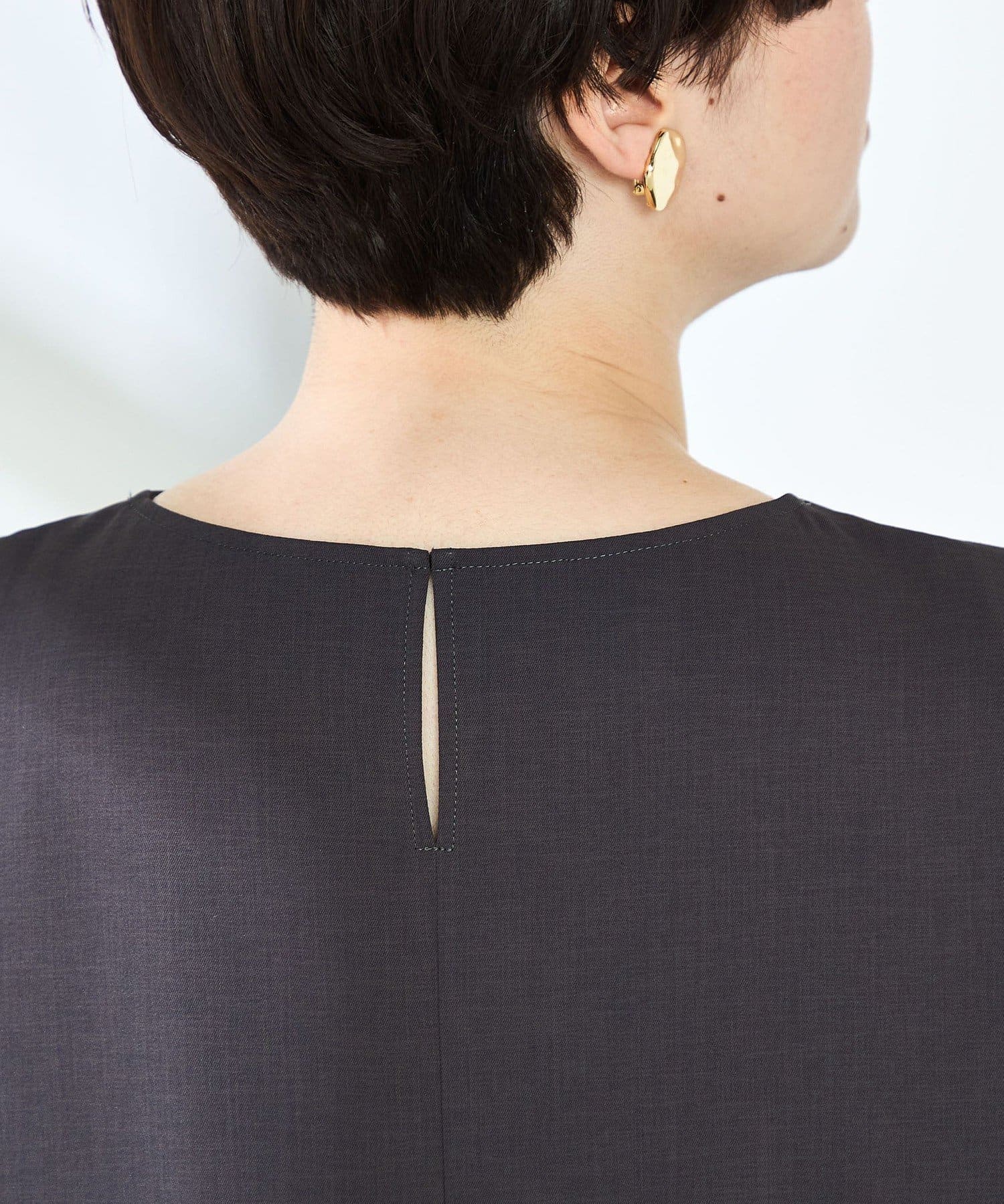 ・梳毛調合繊素材を使用したタック入りキーネックのノースリーブブブラウス