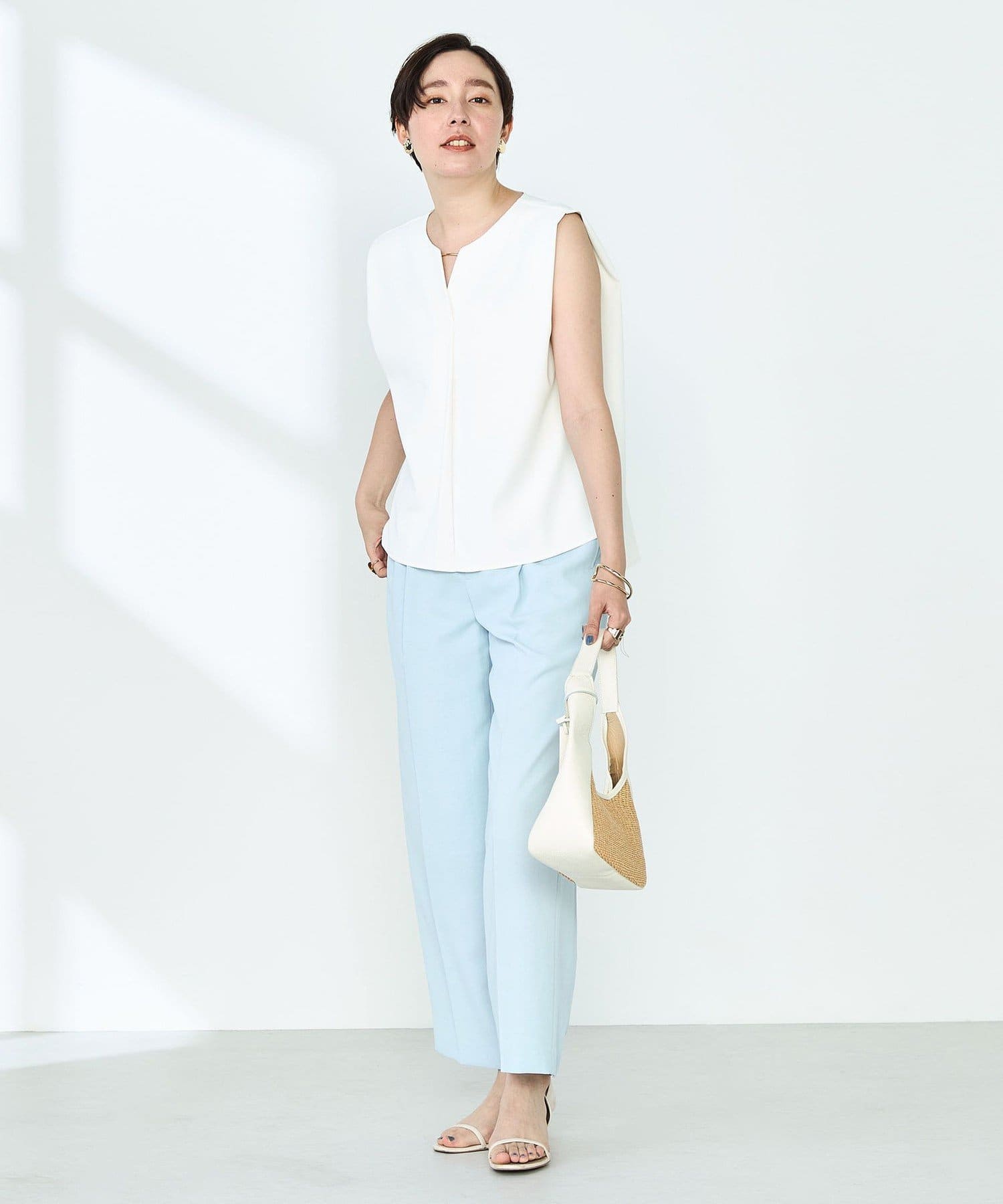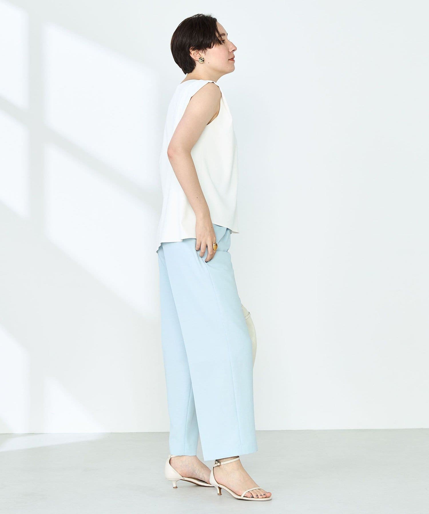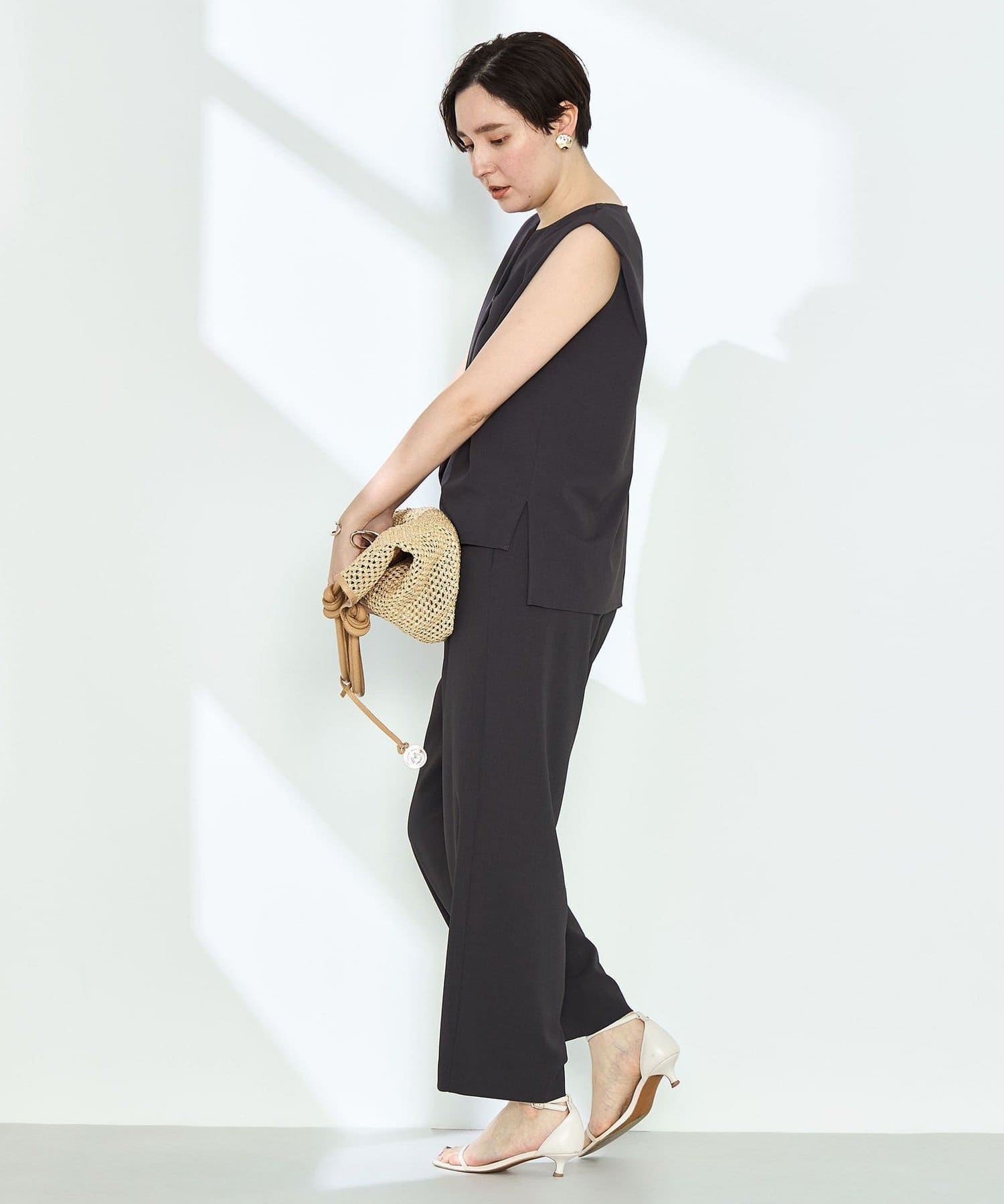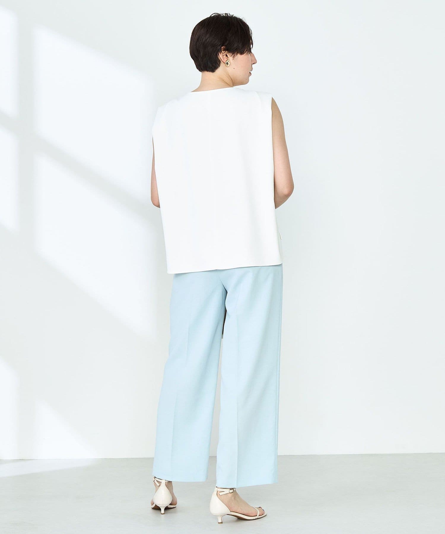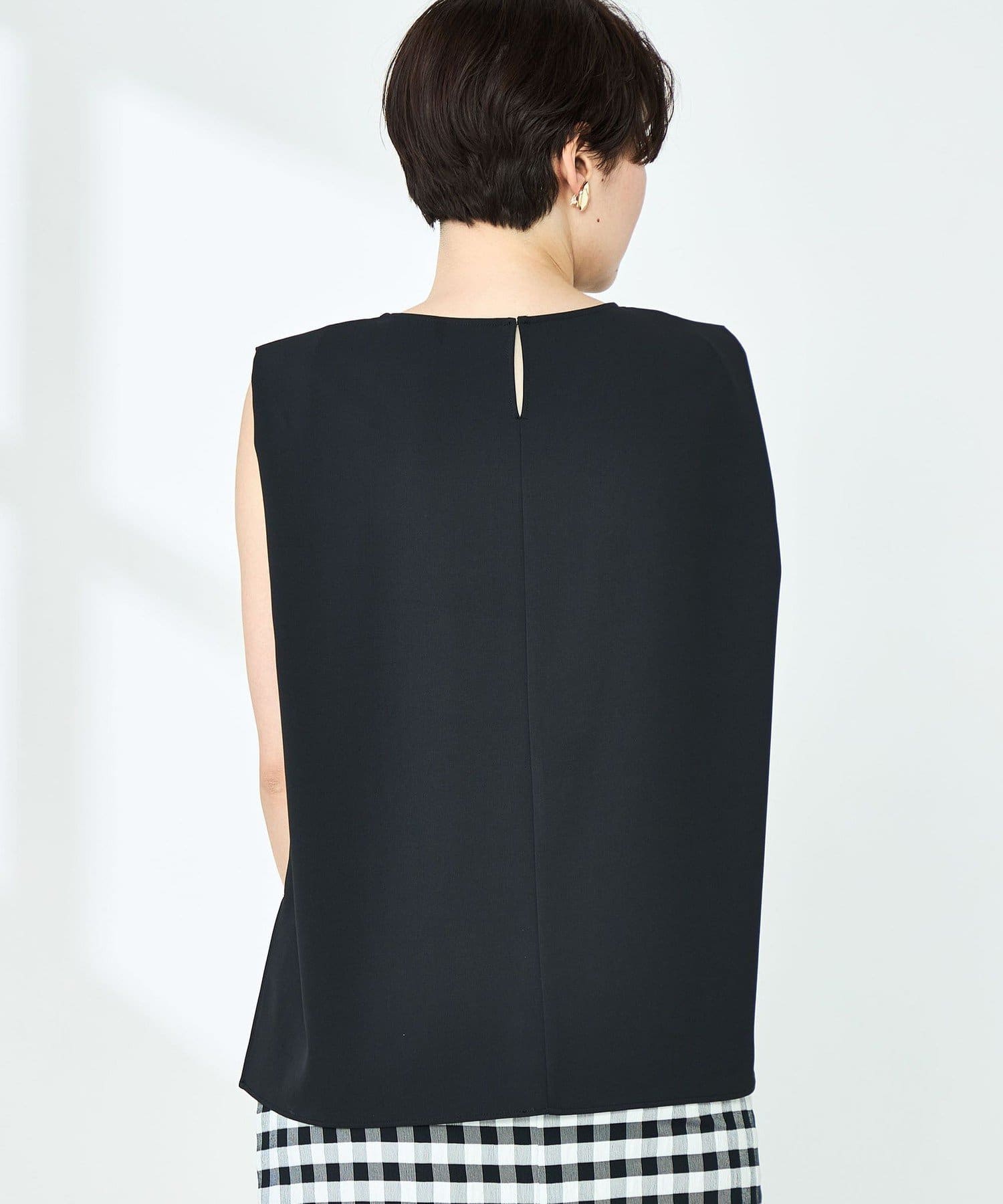 ・梳毛調合繊素材を使用したタック入りキーネックのノースリーブブブラウス