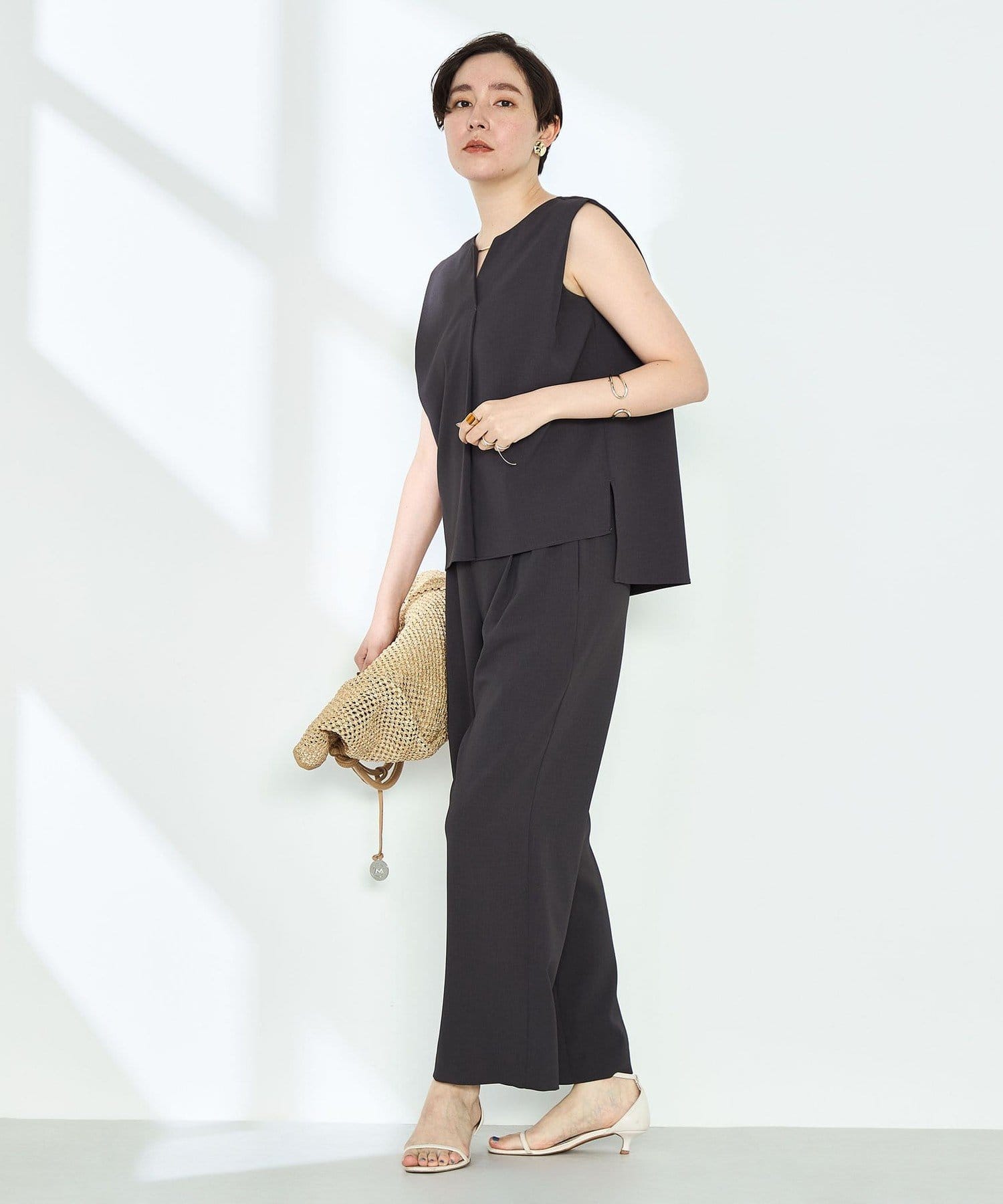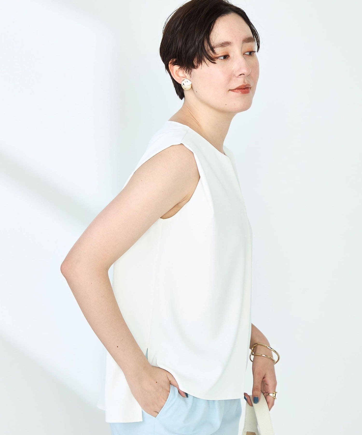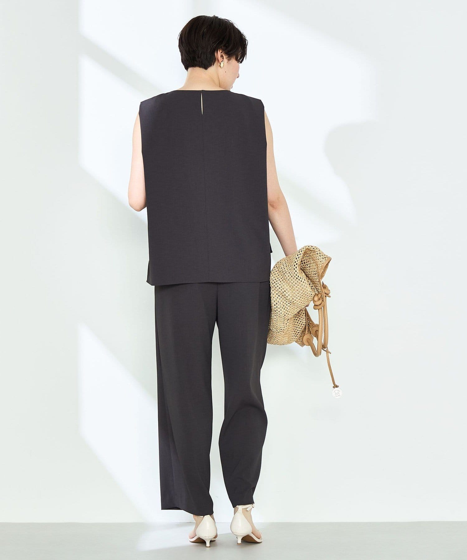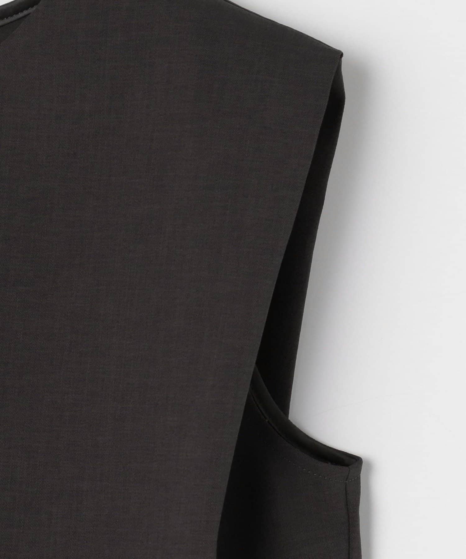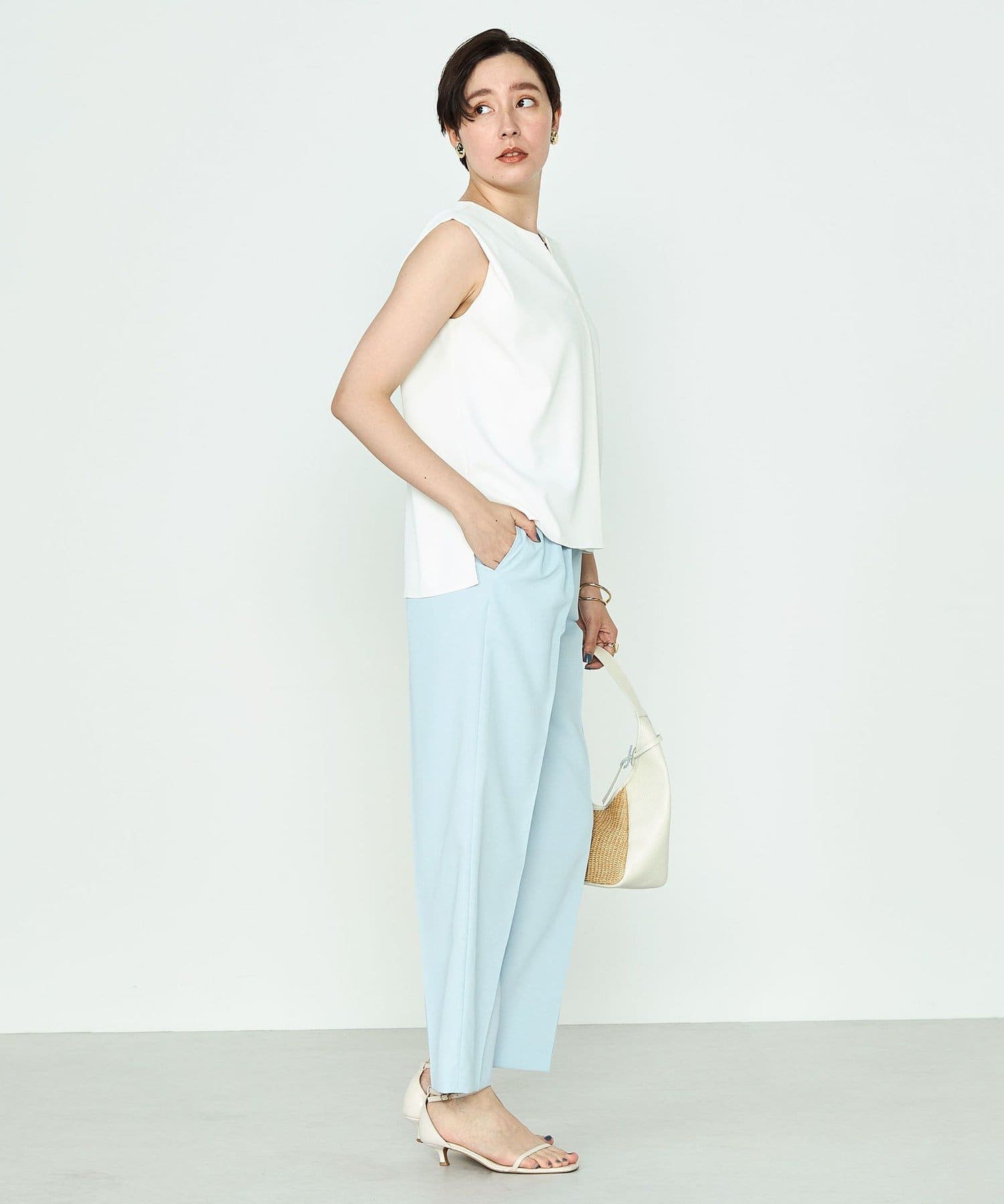 ・梳毛調合繊素材を使用したタック入りキーネックのノースリーブブブラウス