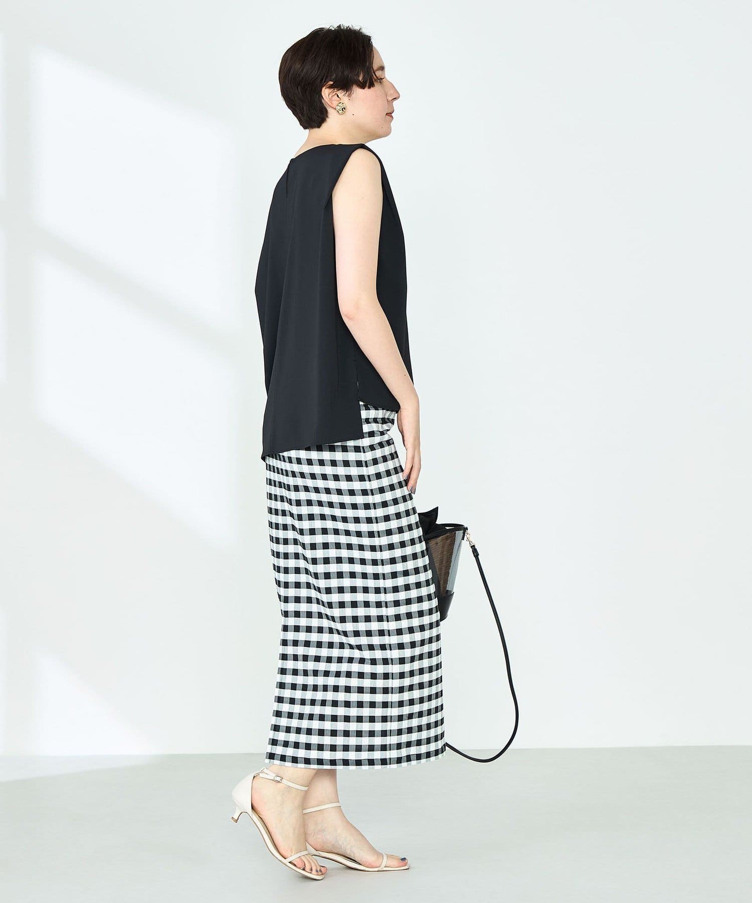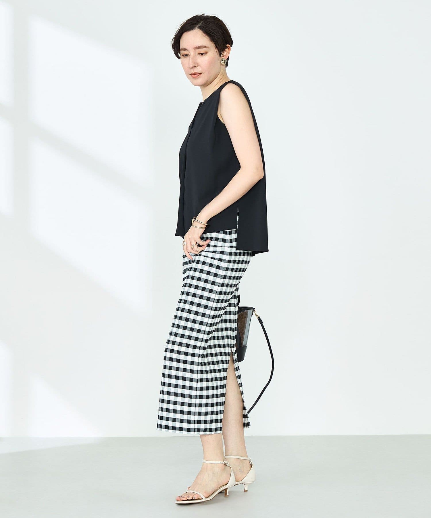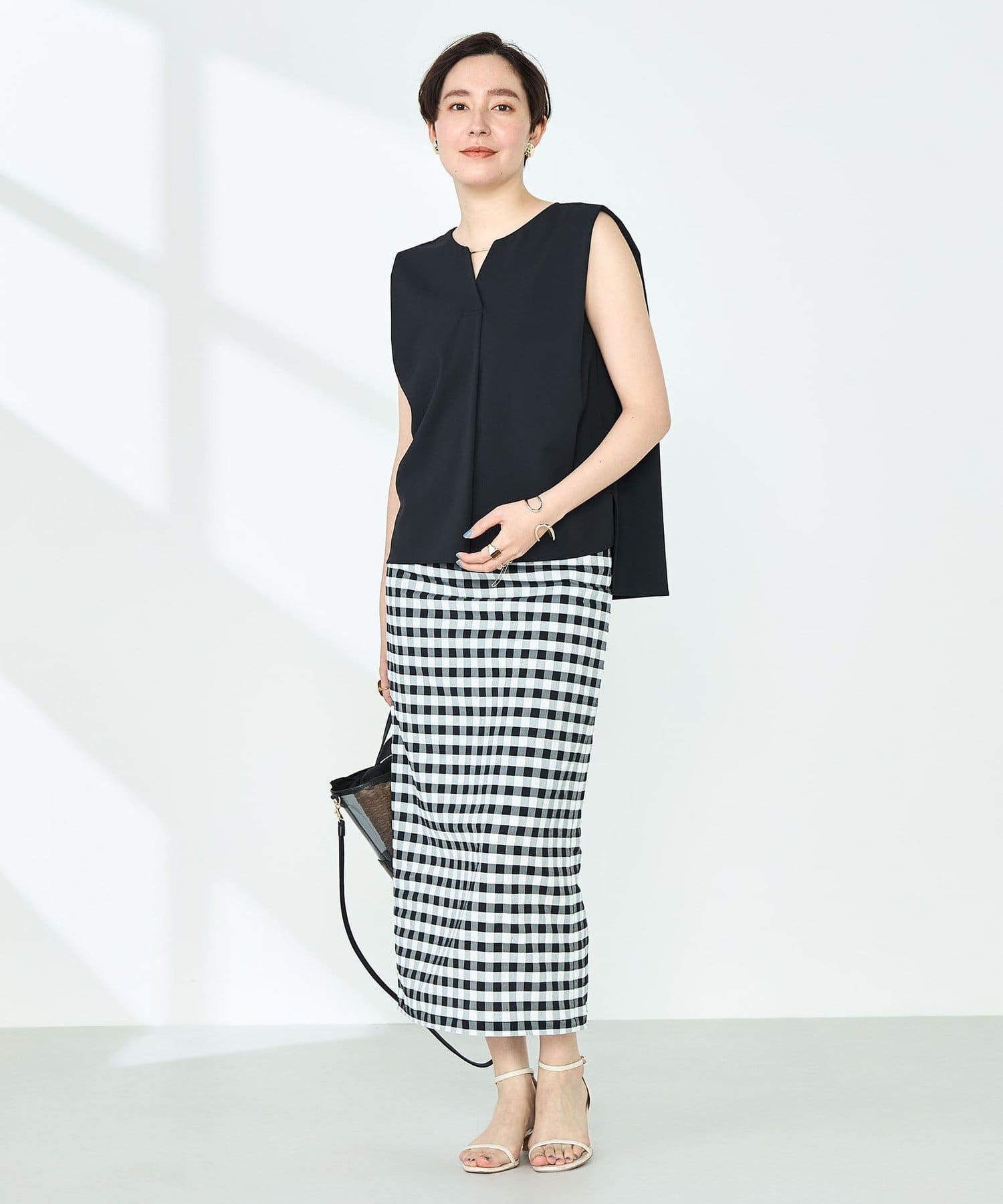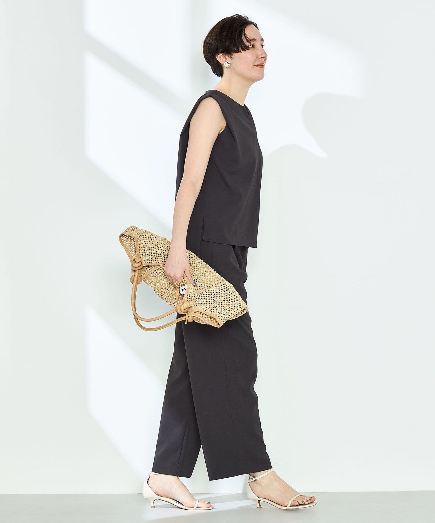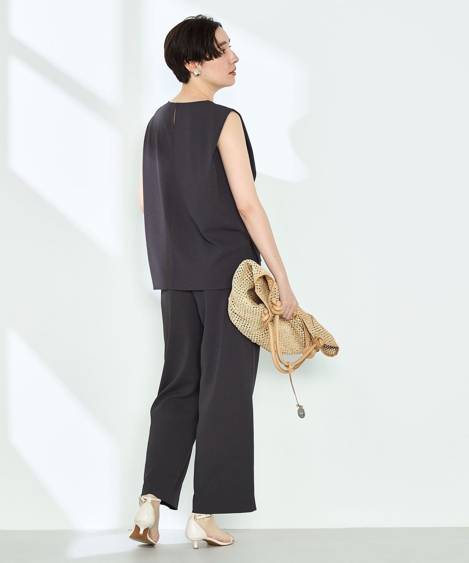 ・梳毛調合繊素材を使用したタック入りキーネックのノースリーブブブラウス